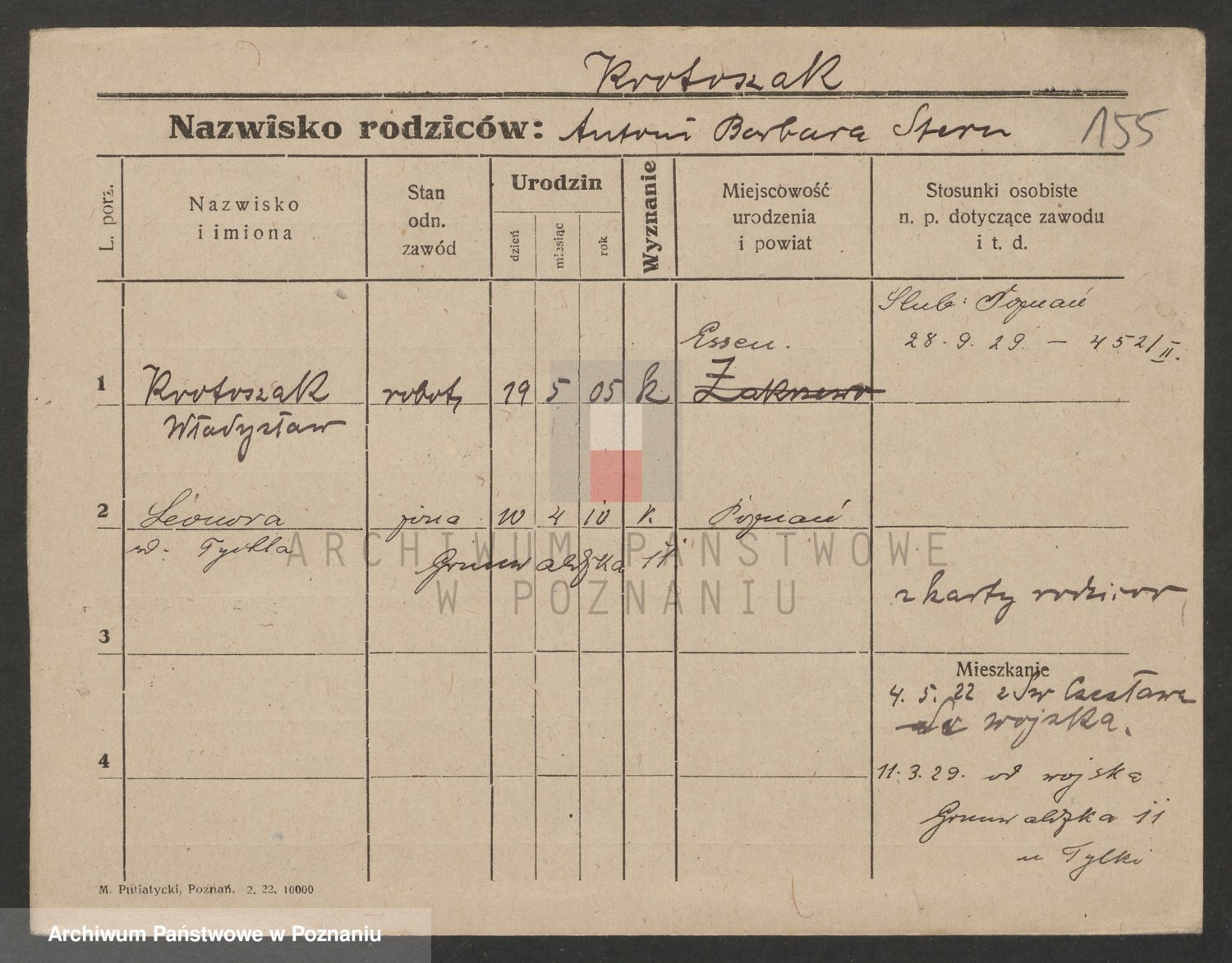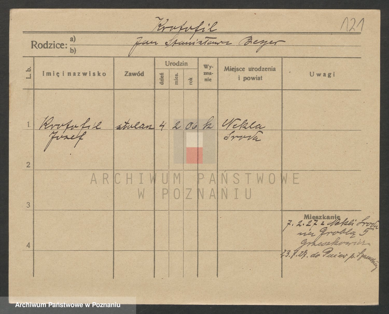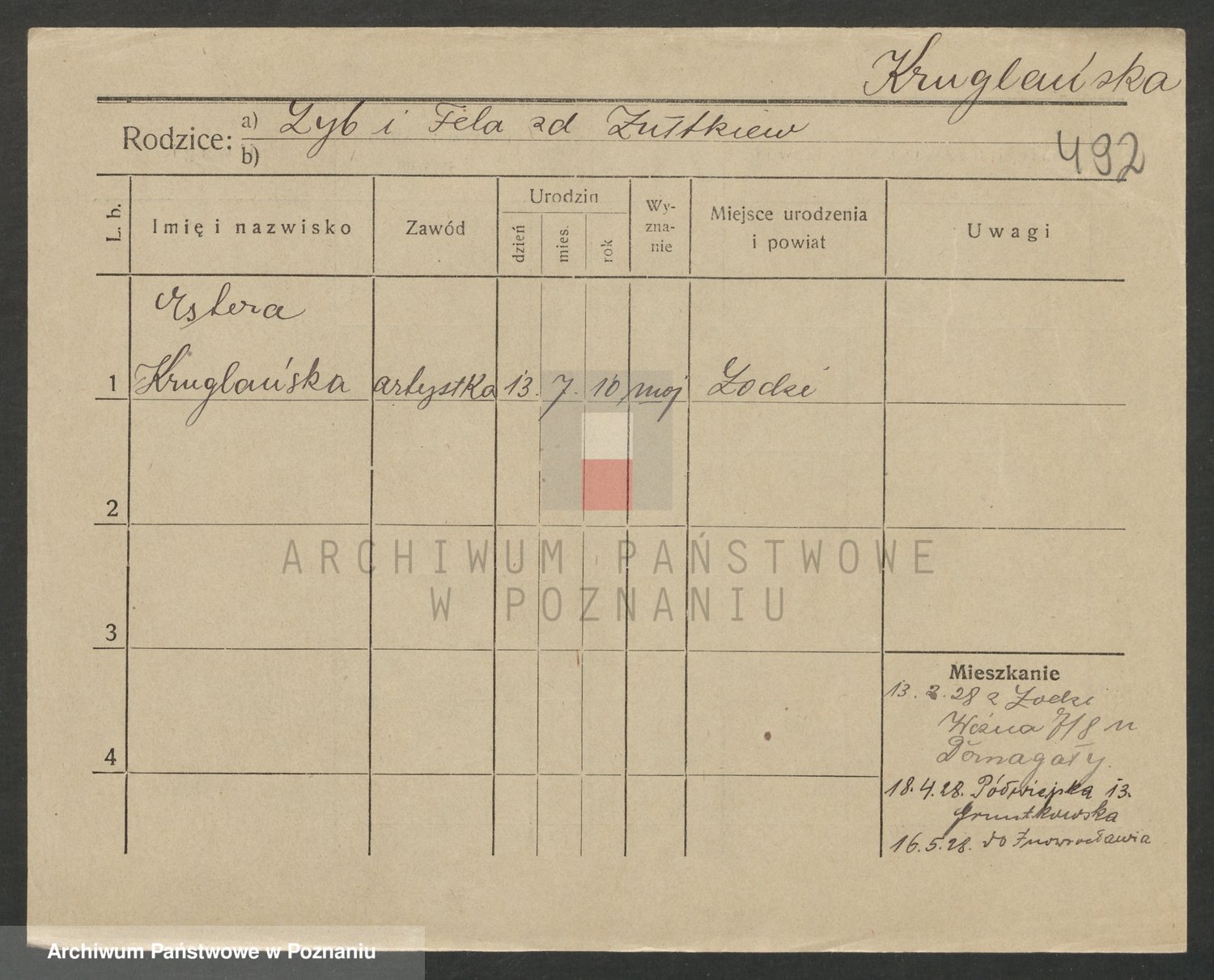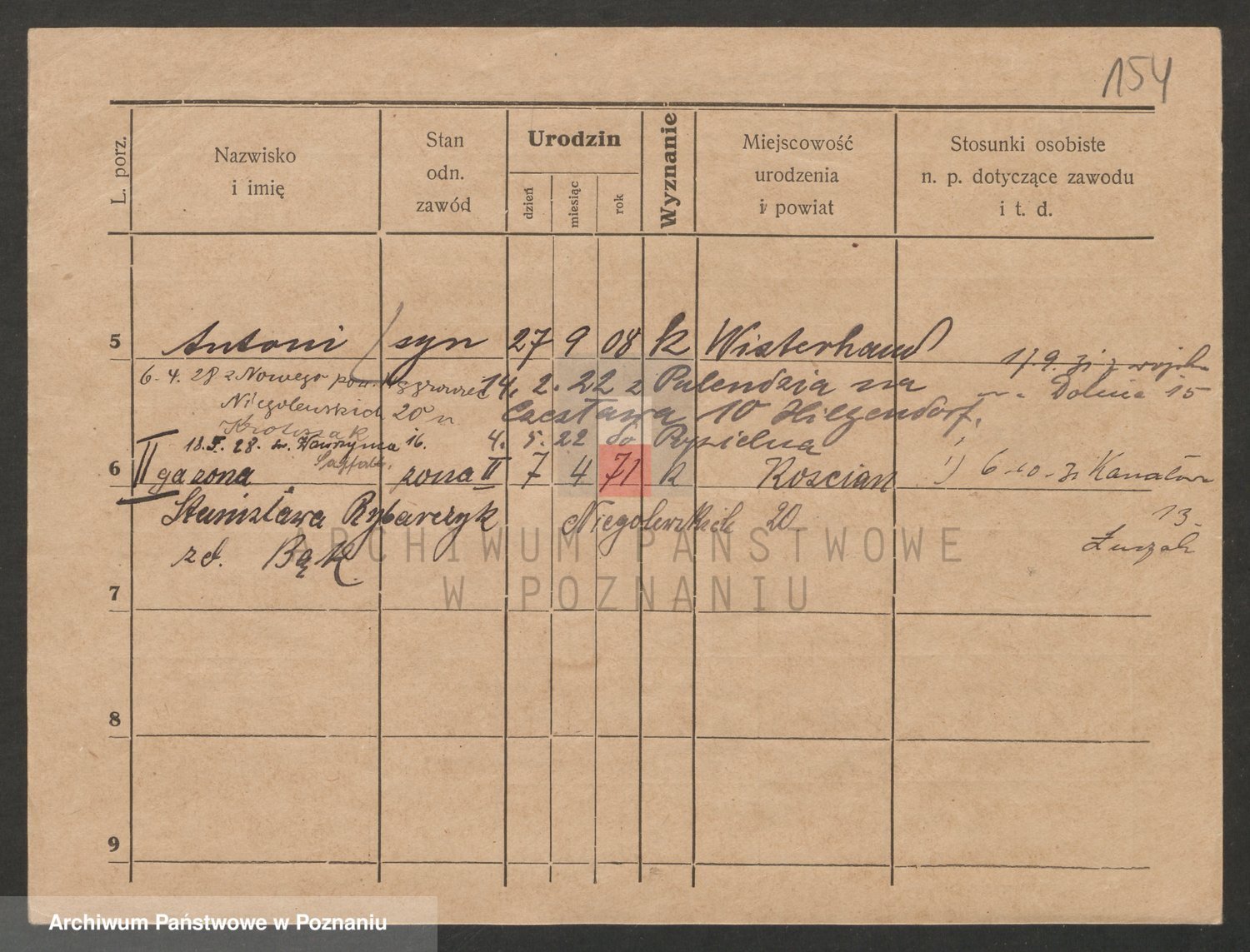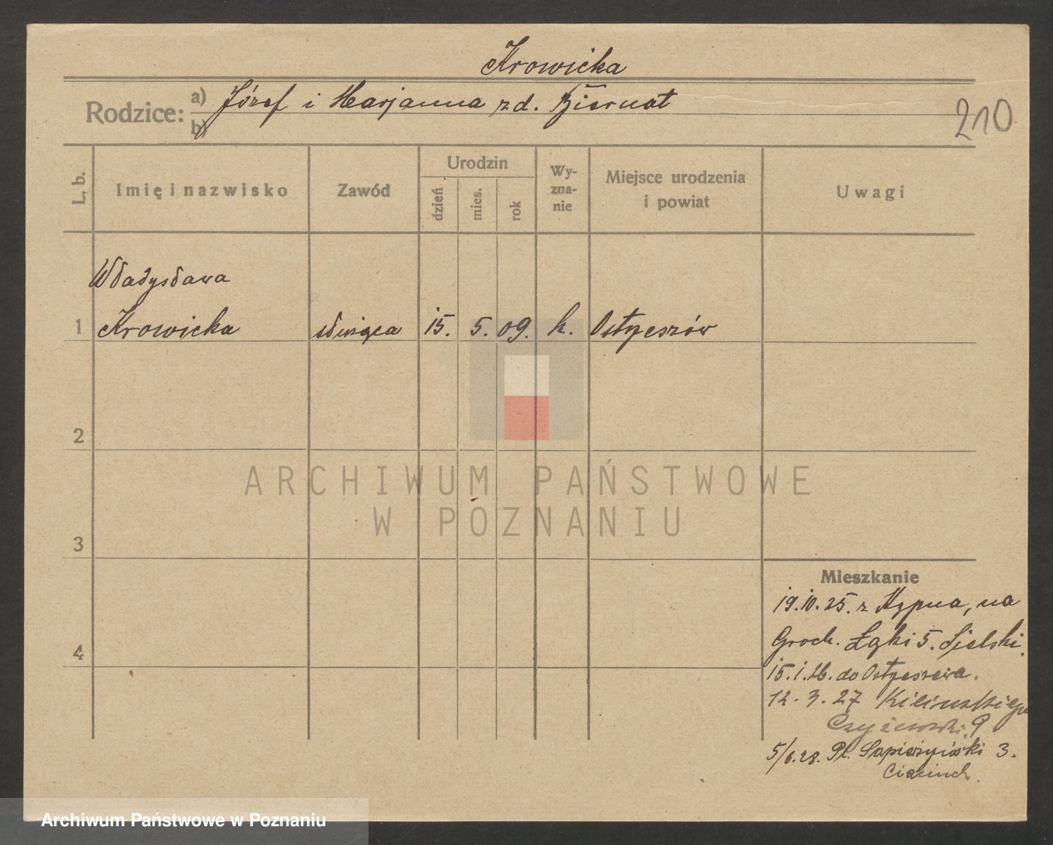 Podgląd karty osobowej dostępny jest po kliknięciu na nazwisko lub ikonkę karty. Można dokonywać powiększenia (ikony na górze) lub przechodzić między kolejnymi skanami (strzałki po bokach).