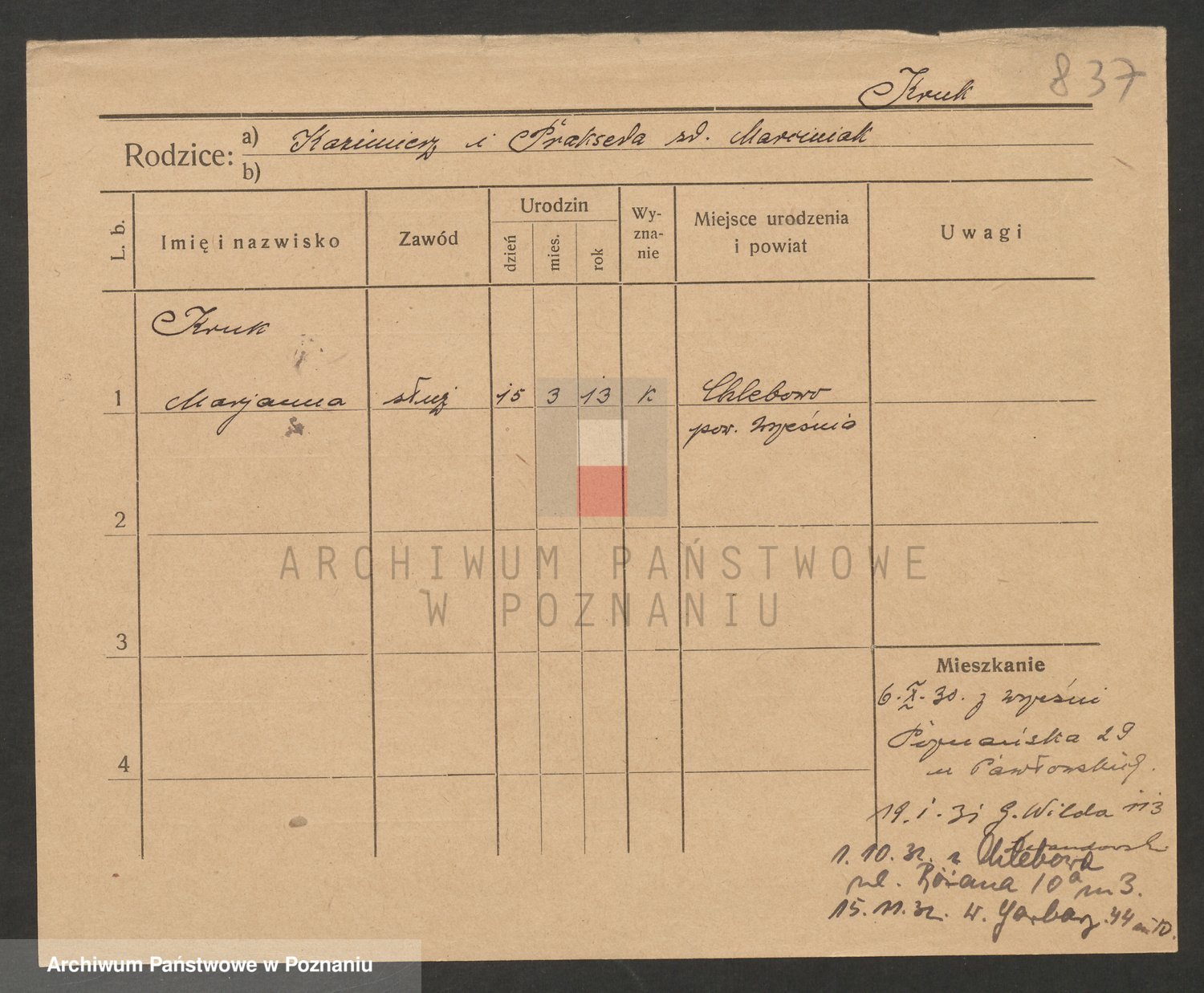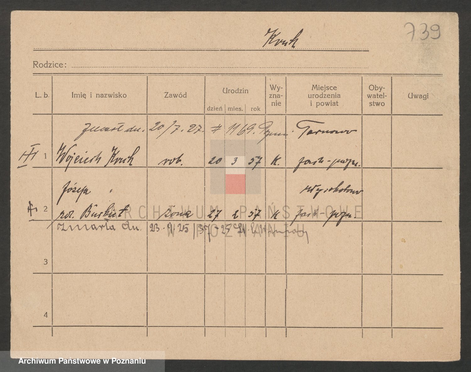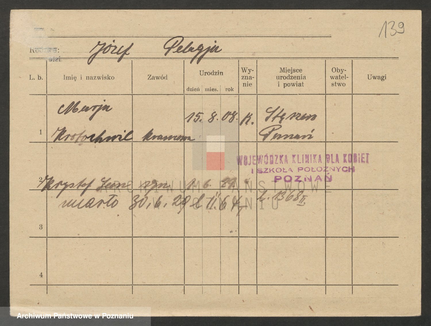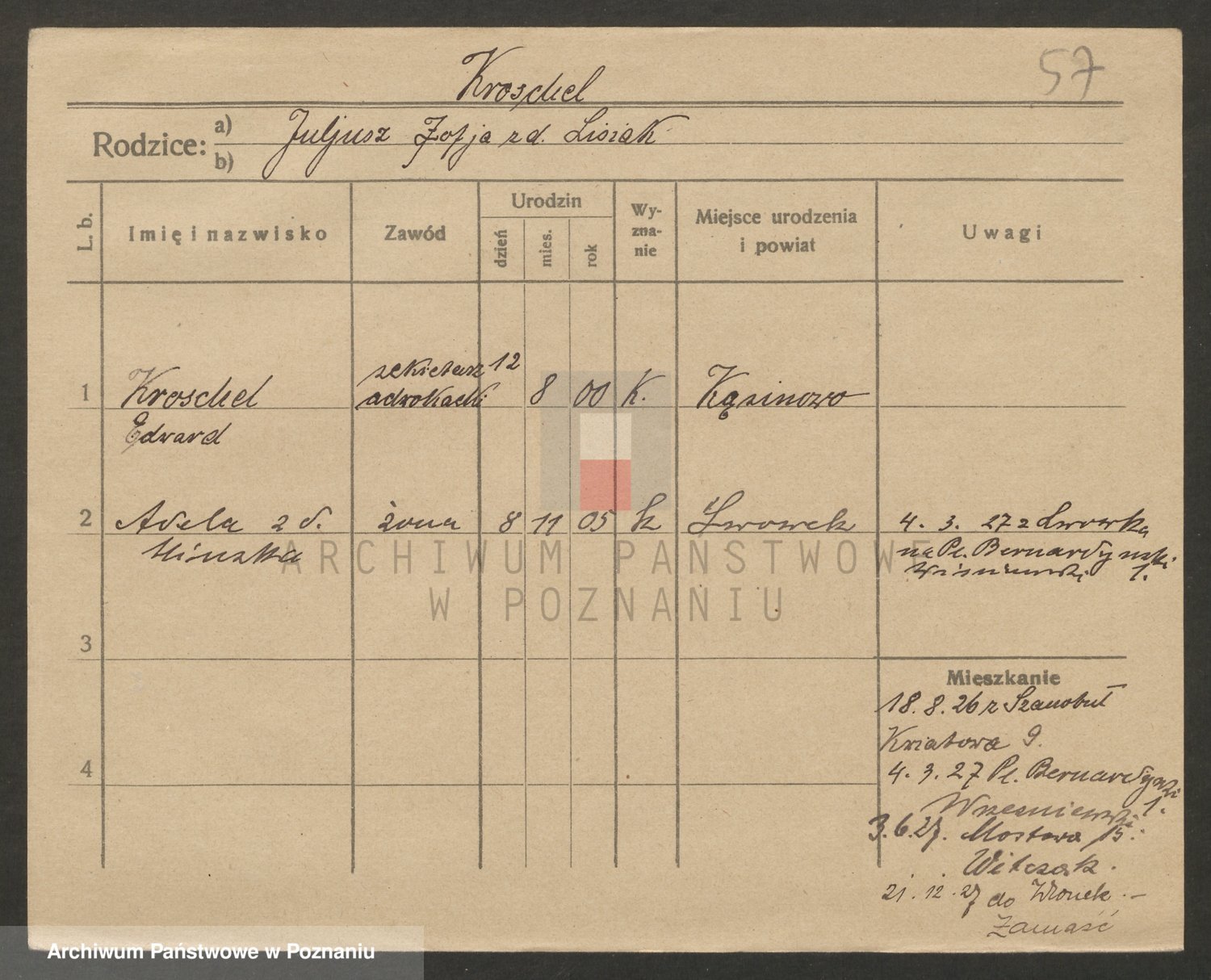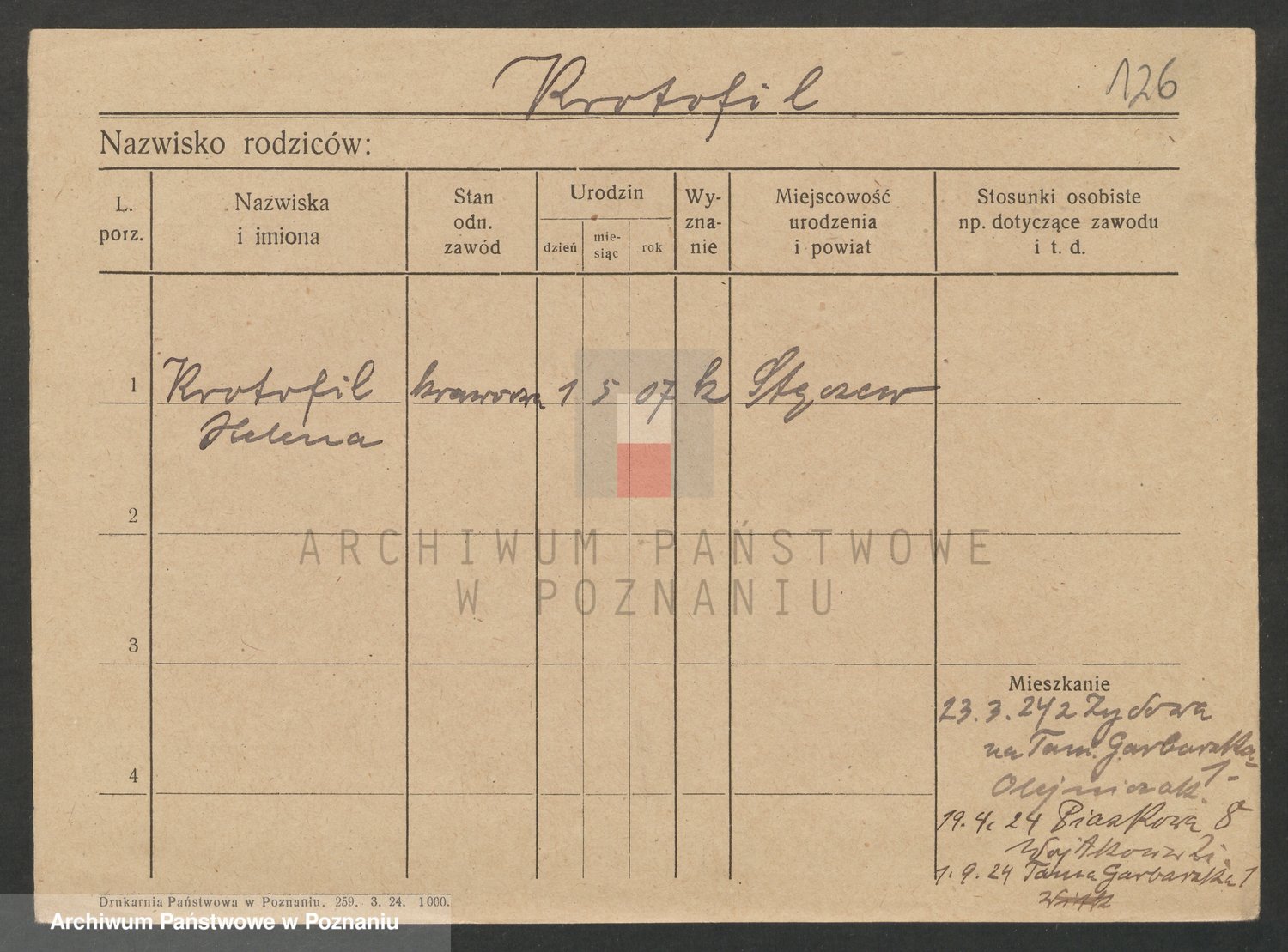 Podgląd karty osobowej dostępny jest po kliknięciu na nazwisko lub ikonkę karty. Można dokonywać powiększenia (ikony na górze) lub przechodzić między kolejnymi skanami (strzałki po bokach).
