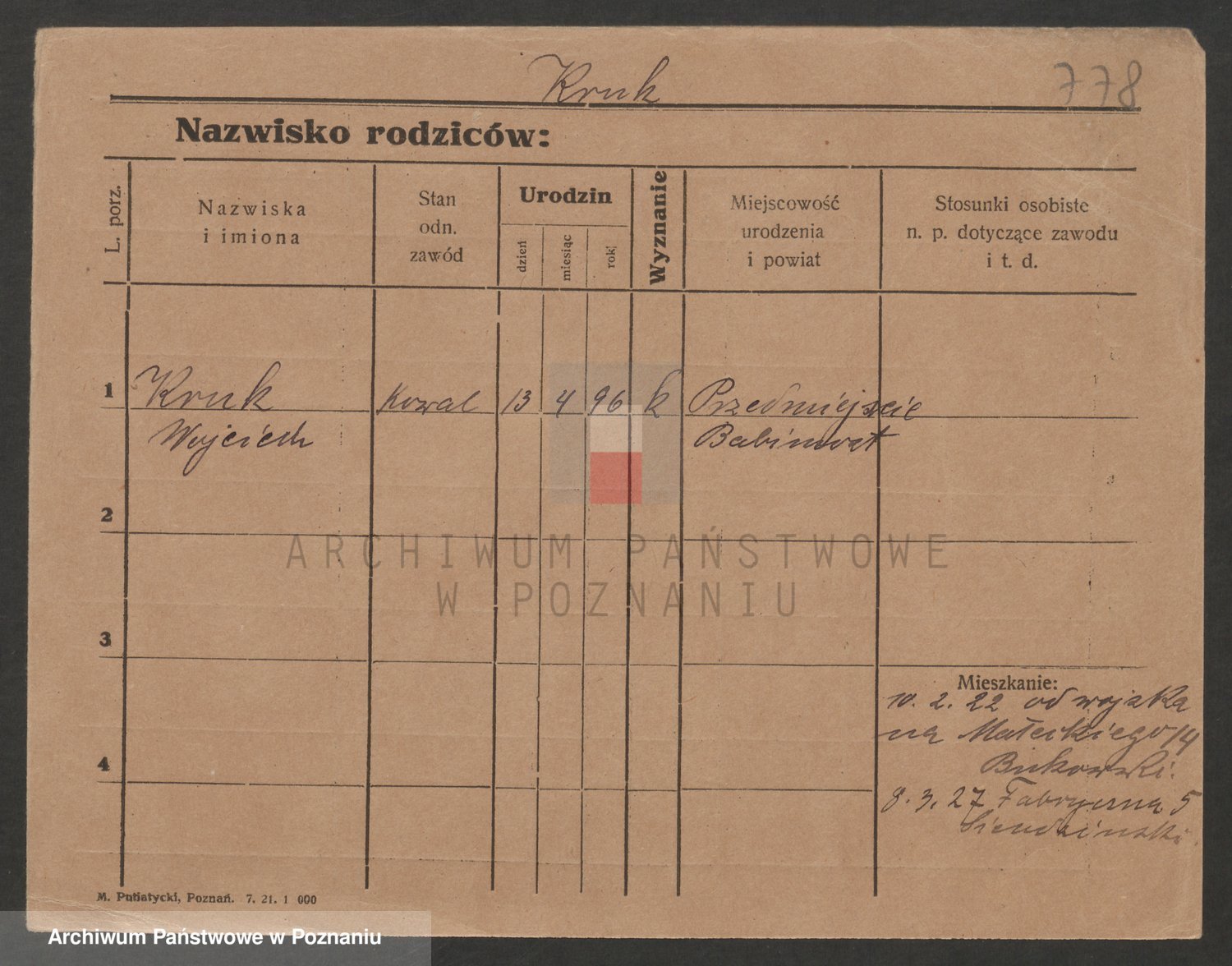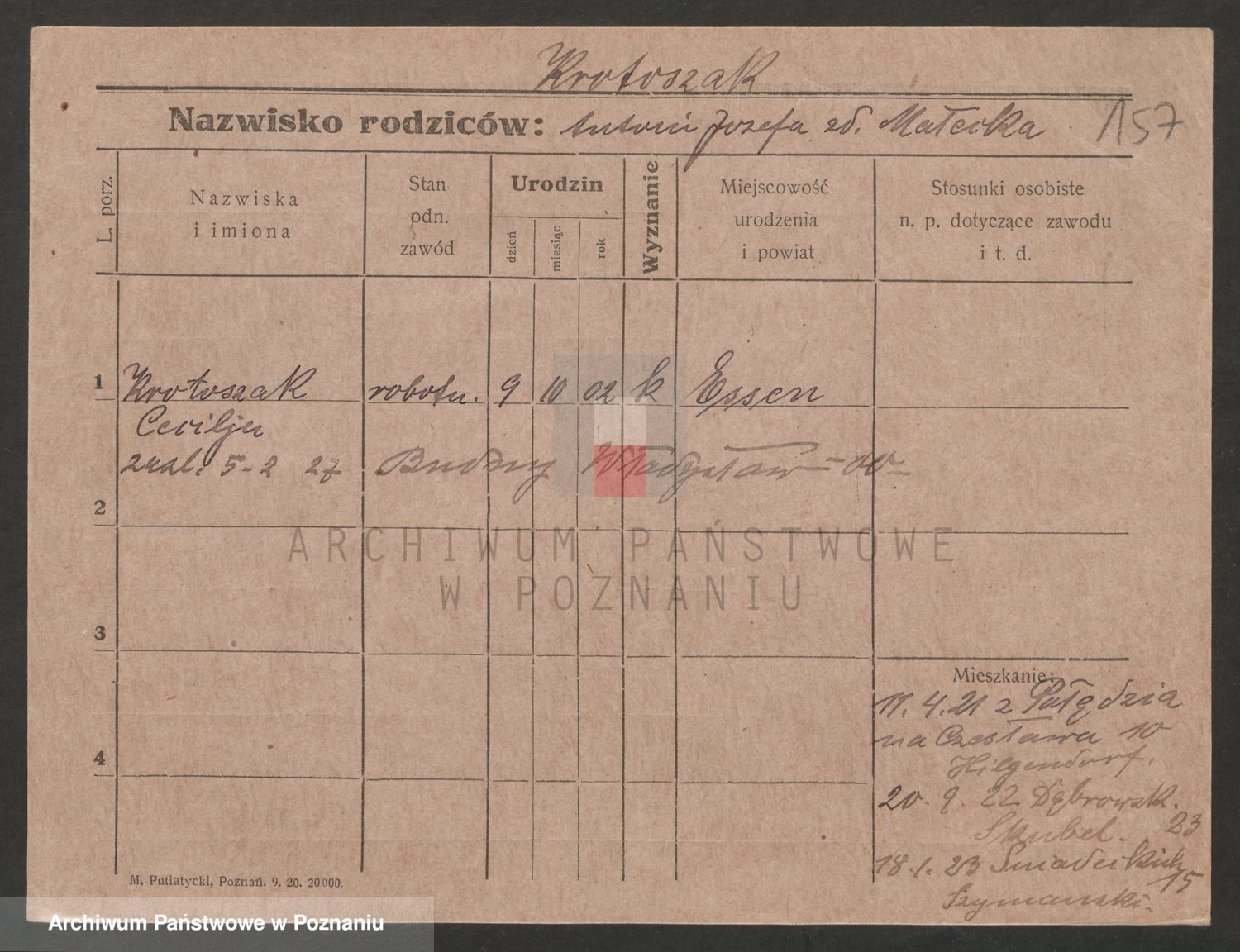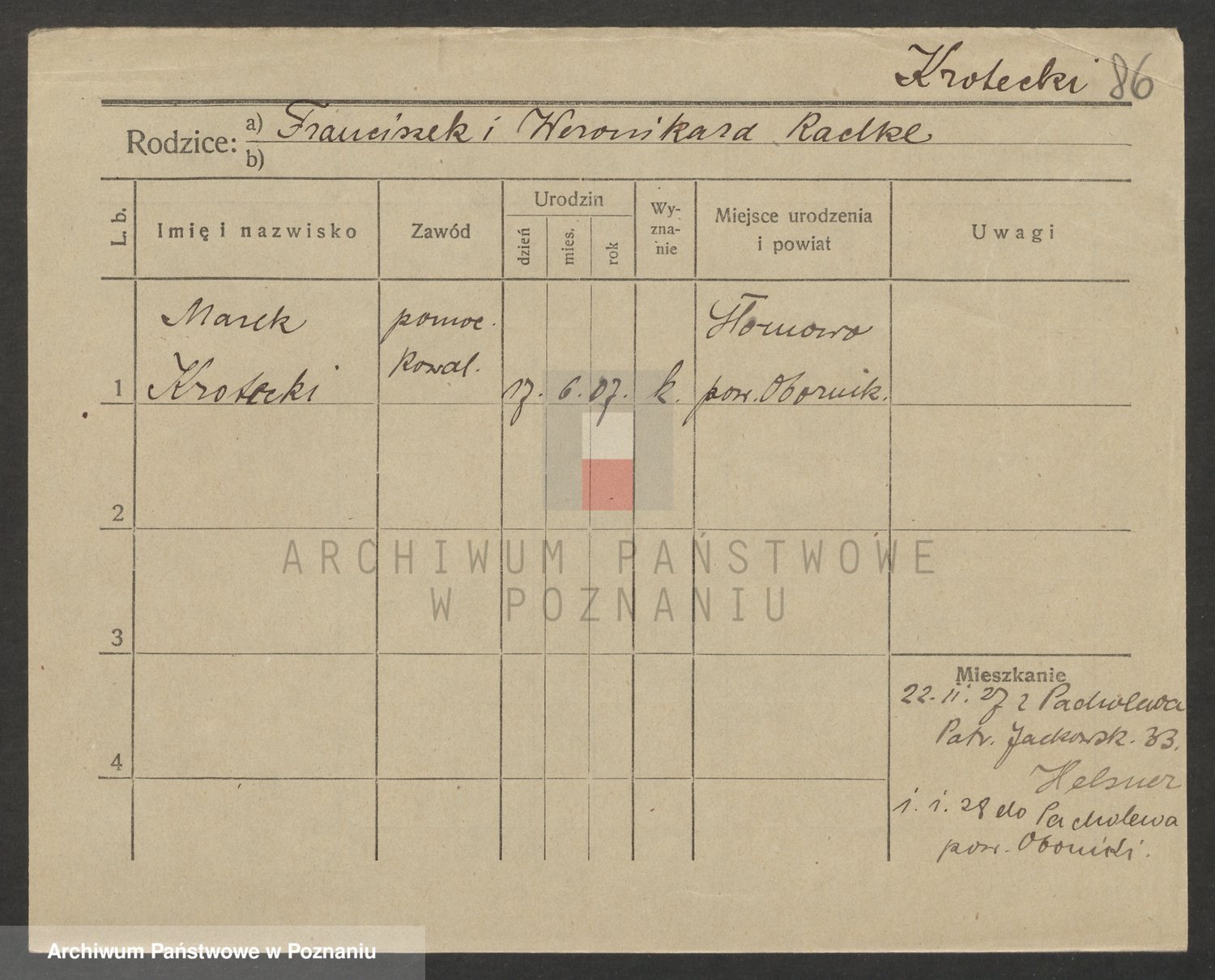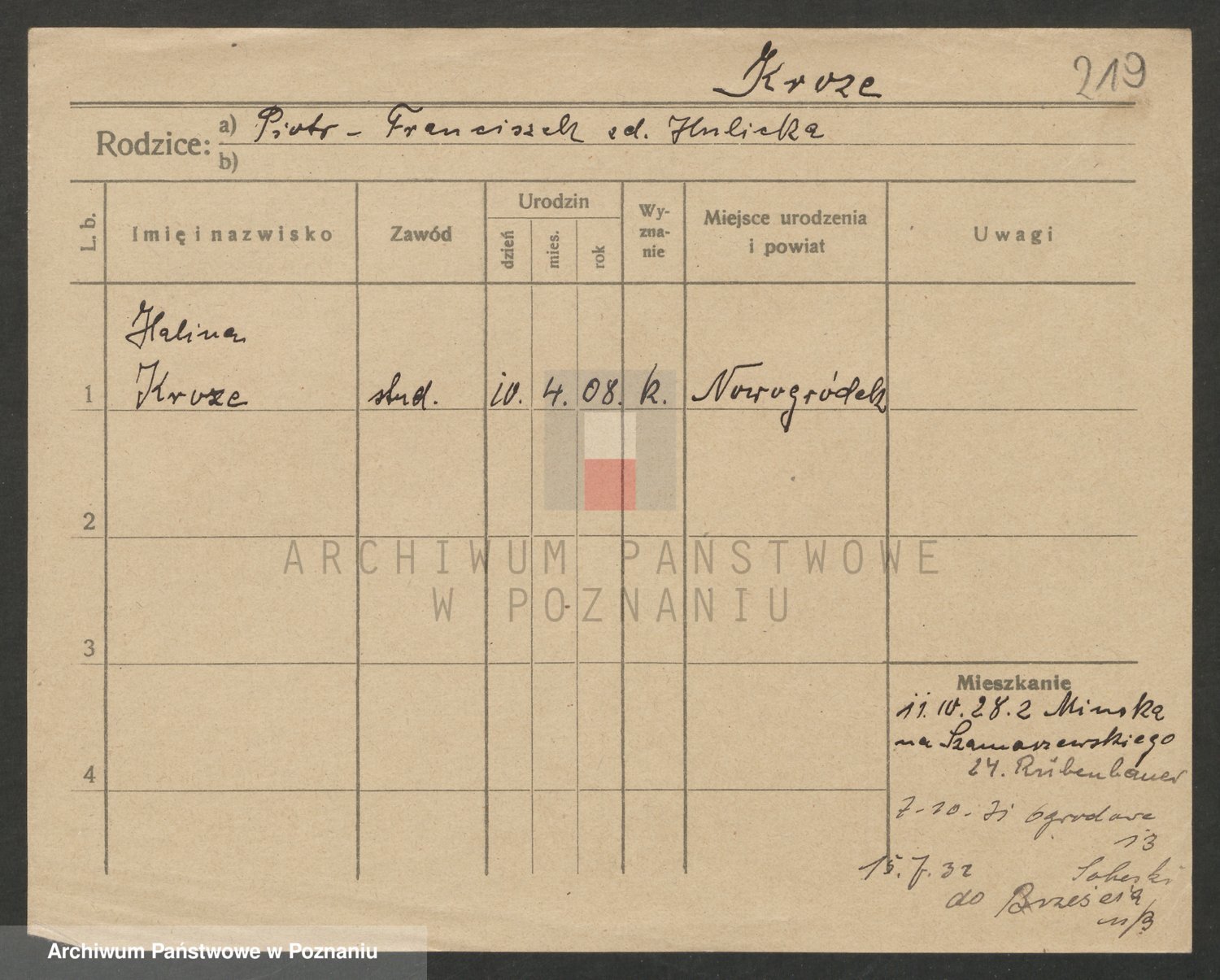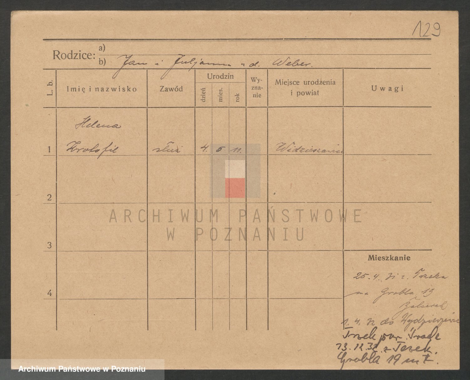 Podgląd karty osobowej dostępny jest po kliknięciu na nazwisko lub ikonkę karty. Można dokonywać powiększenia (ikony na górze) lub przechodzić między kolejnymi skanami (strzałki po bokach).