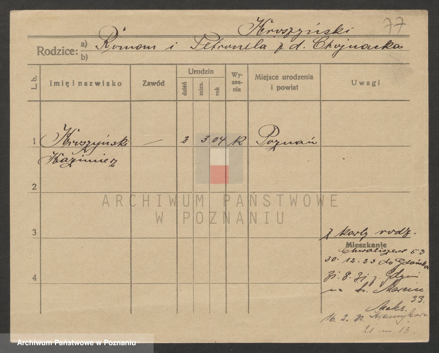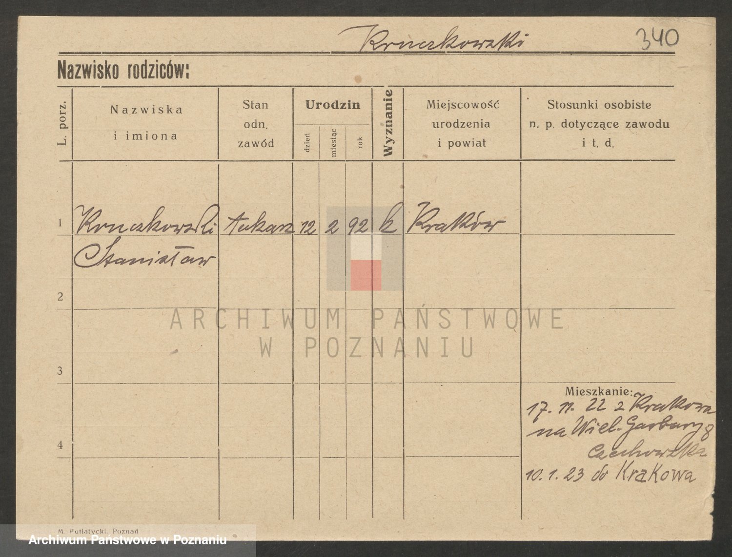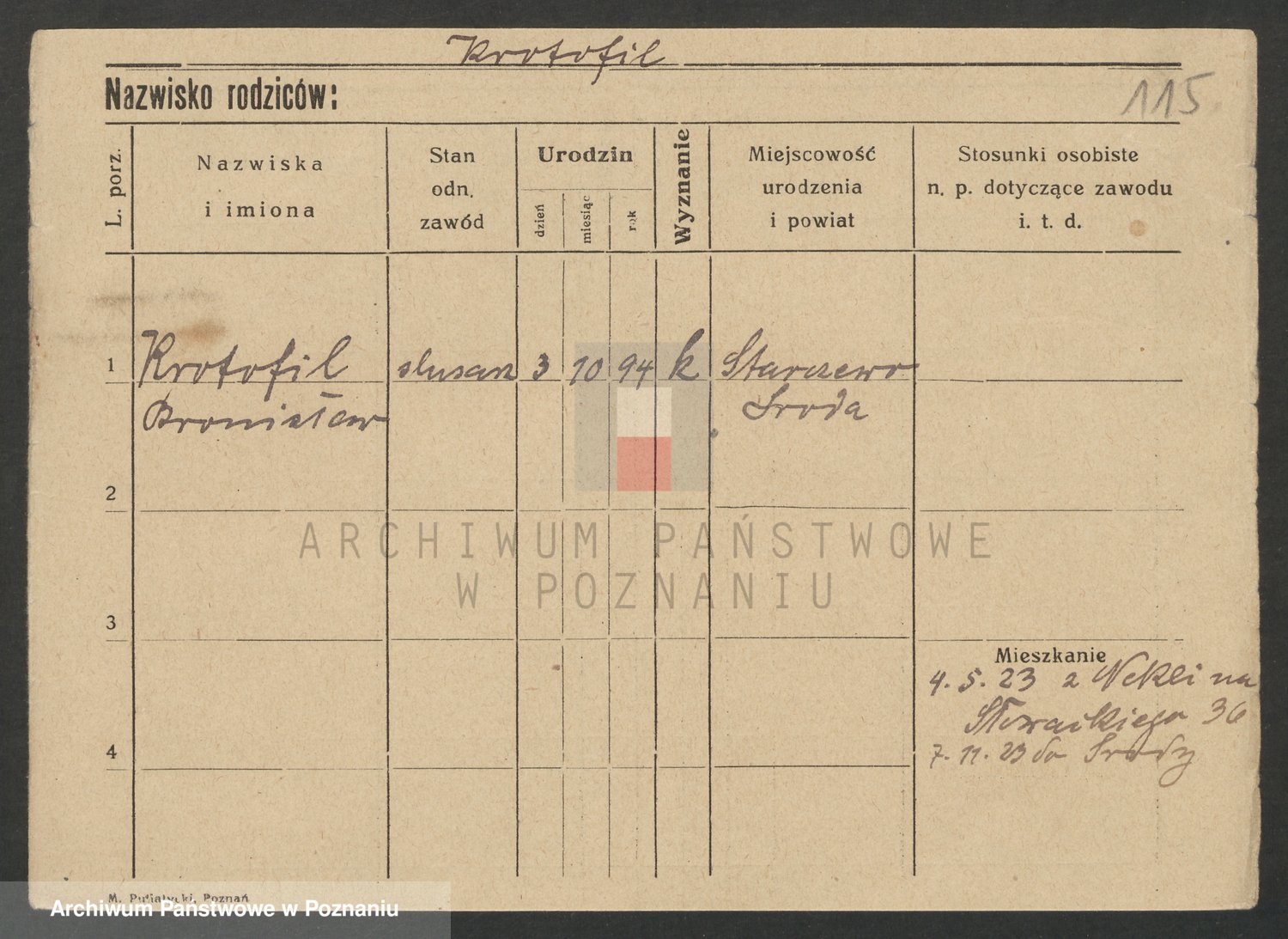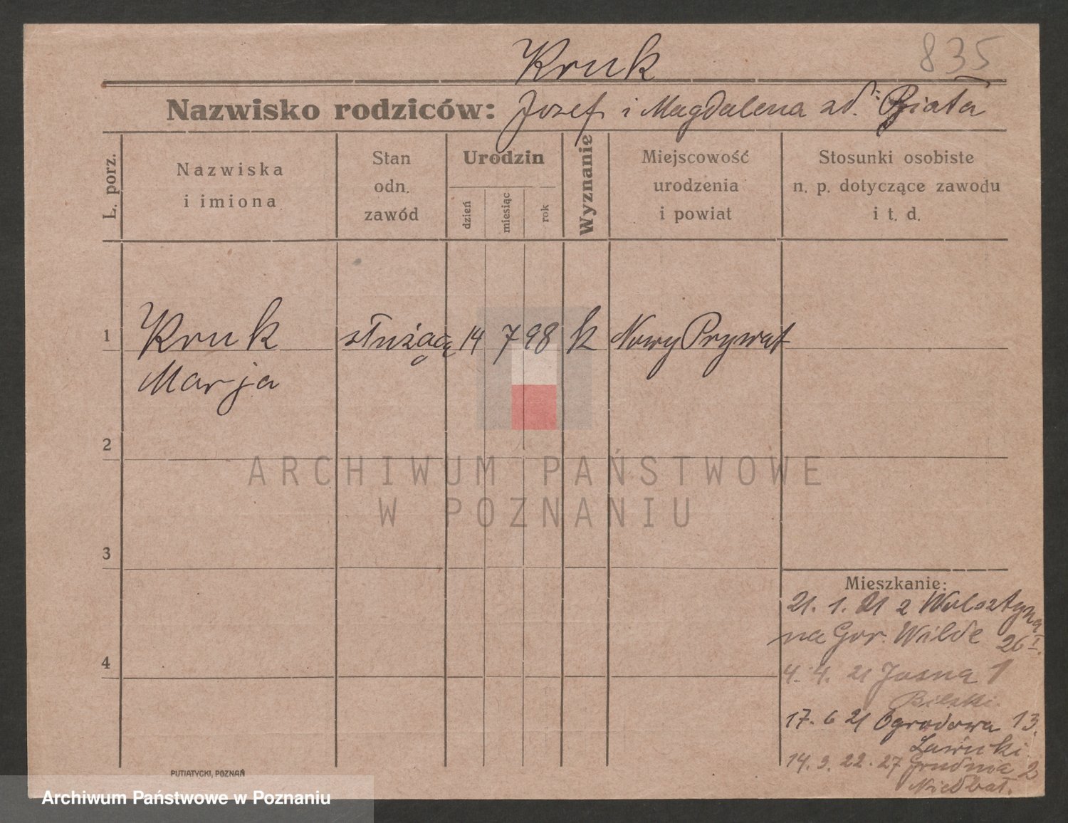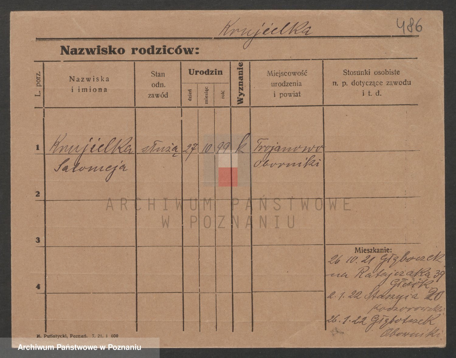 Podgląd karty osobowej dostępny jest po kliknięciu na nazwisko lub ikonkę karty. Można dokonywać powiększenia (ikony na górze) lub przechodzić między kolejnymi skanami (strzałki po bokach).