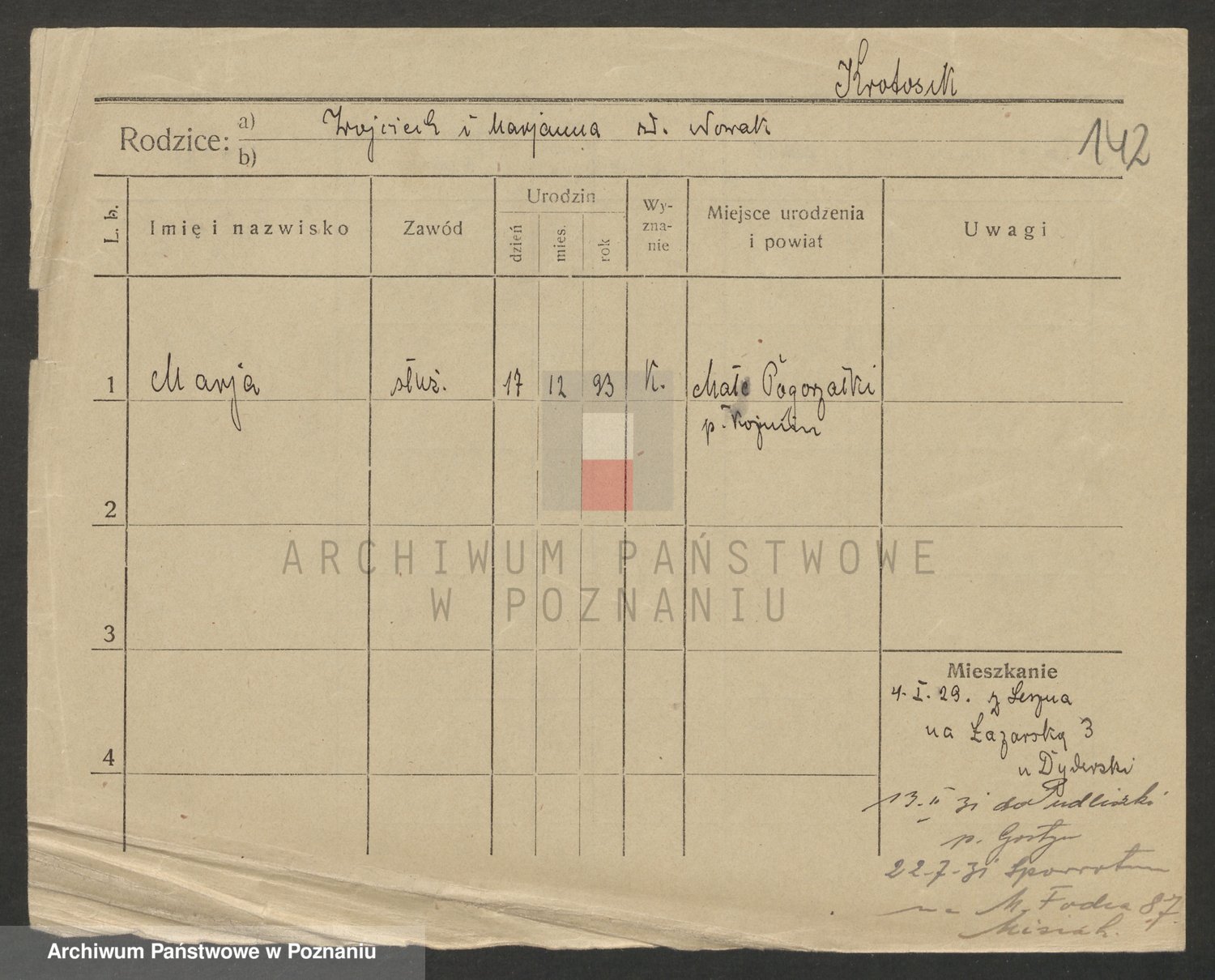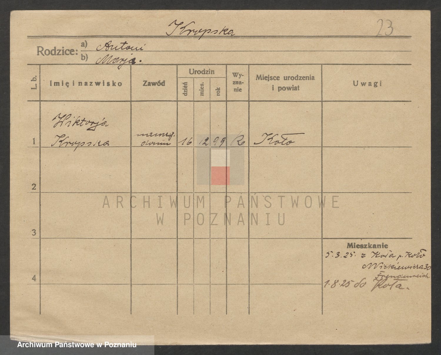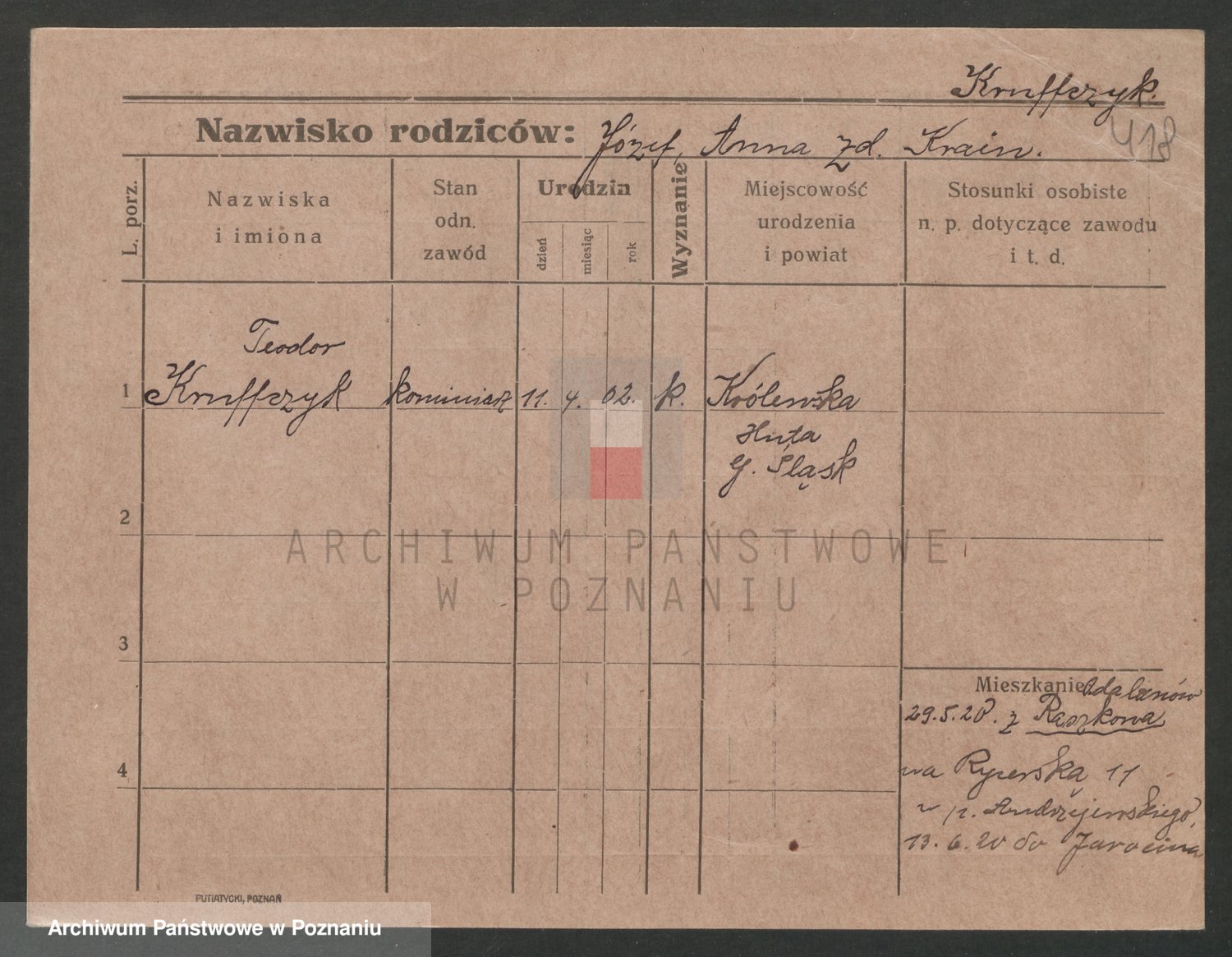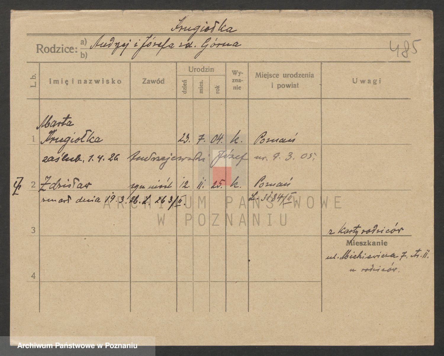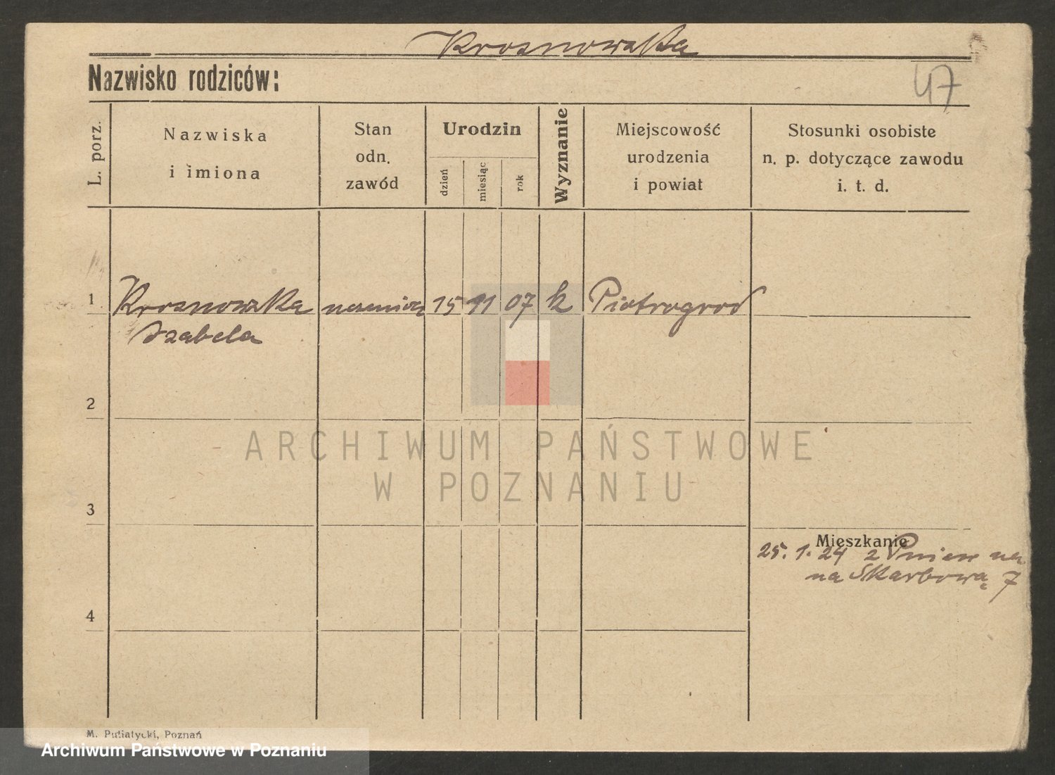 Podgląd karty osobowej dostępny jest po kliknięciu na nazwisko lub ikonkę karty. Można dokonywać powiększenia (ikony na górze) lub przechodzić między kolejnymi skanami (strzałki po bokach).