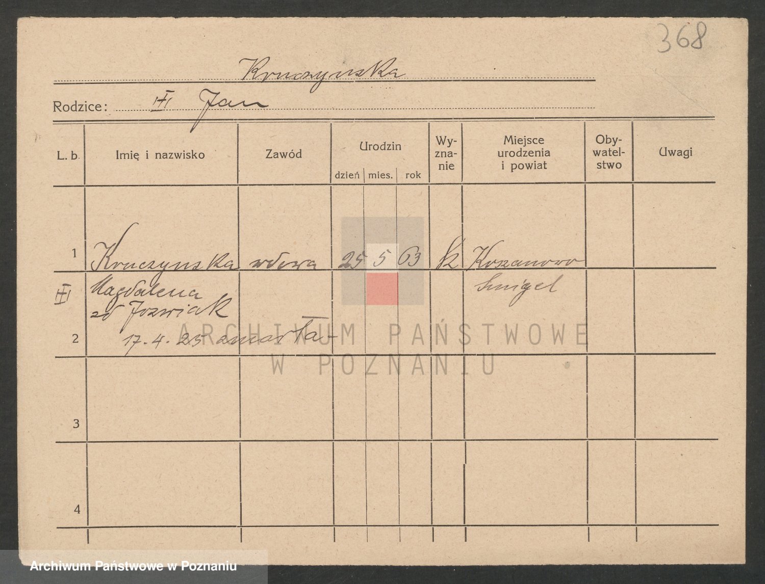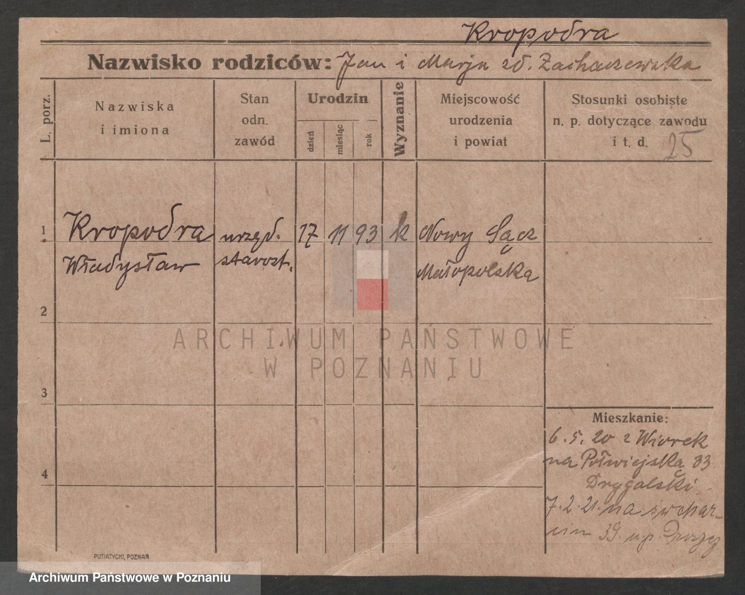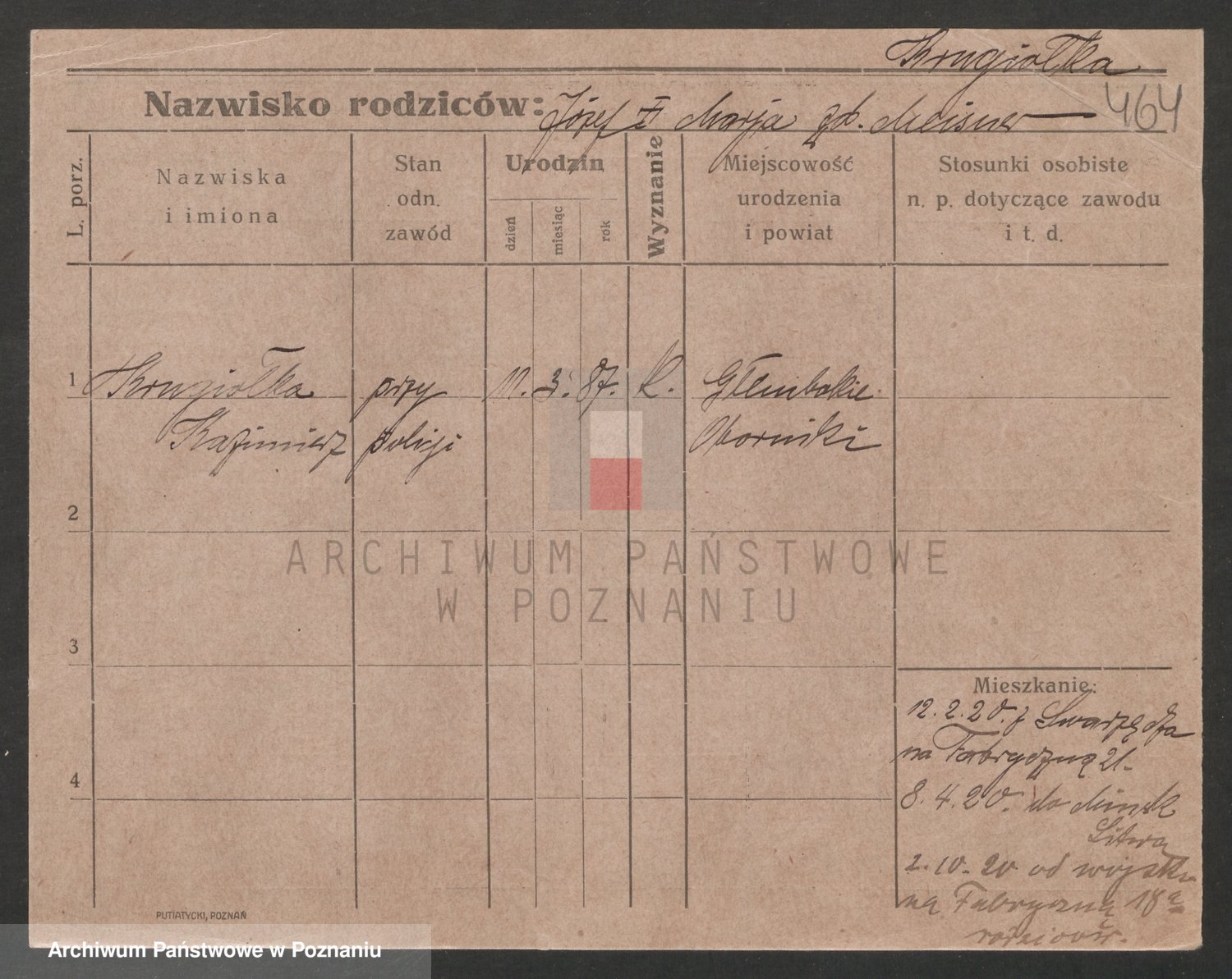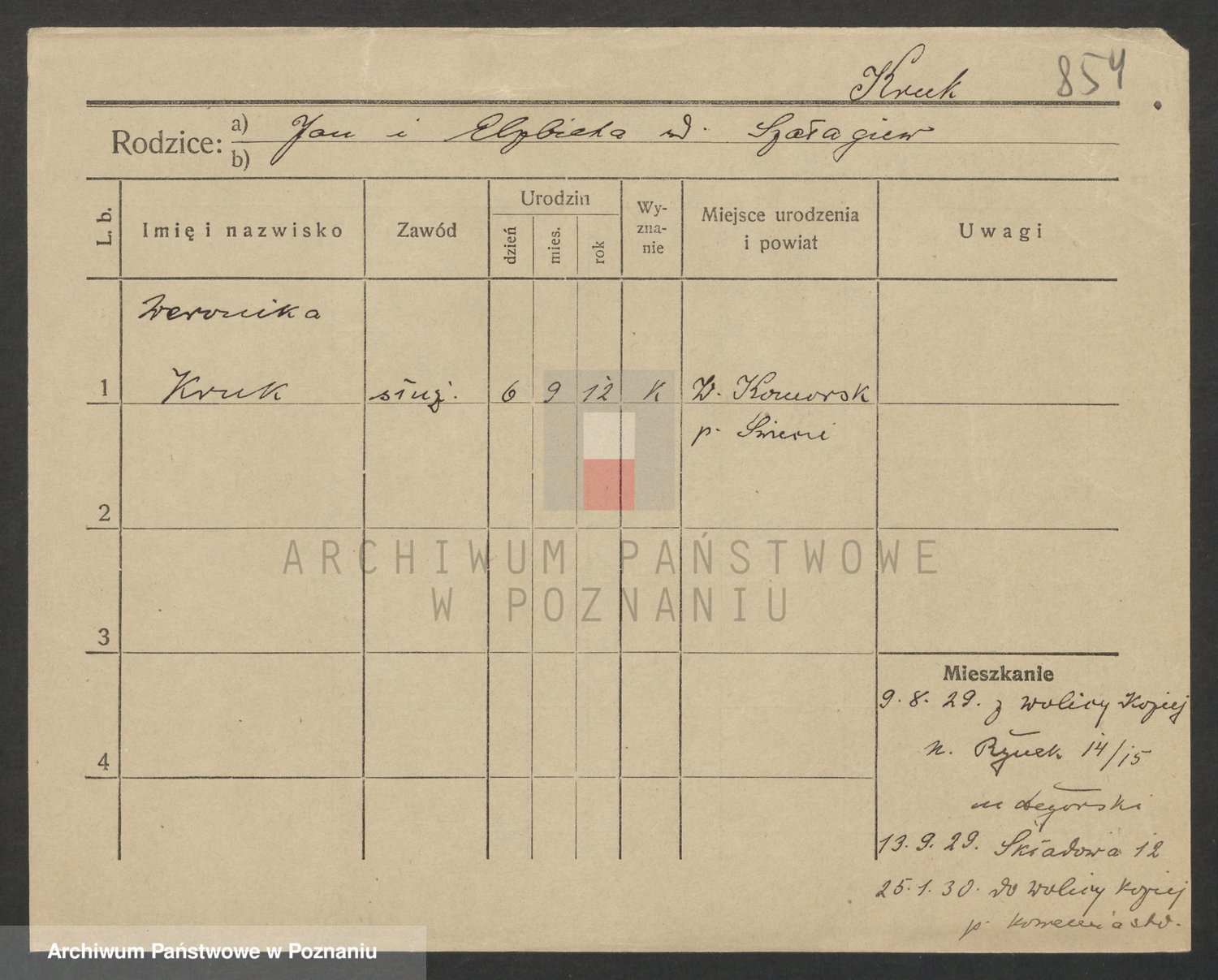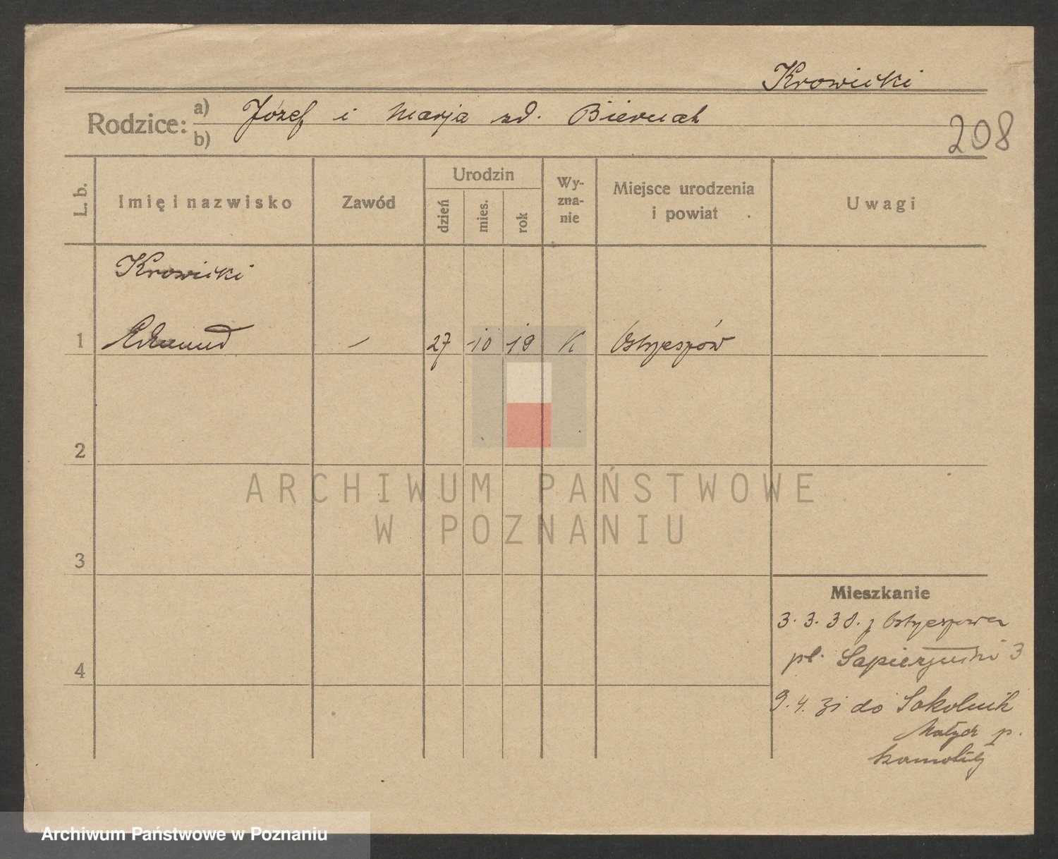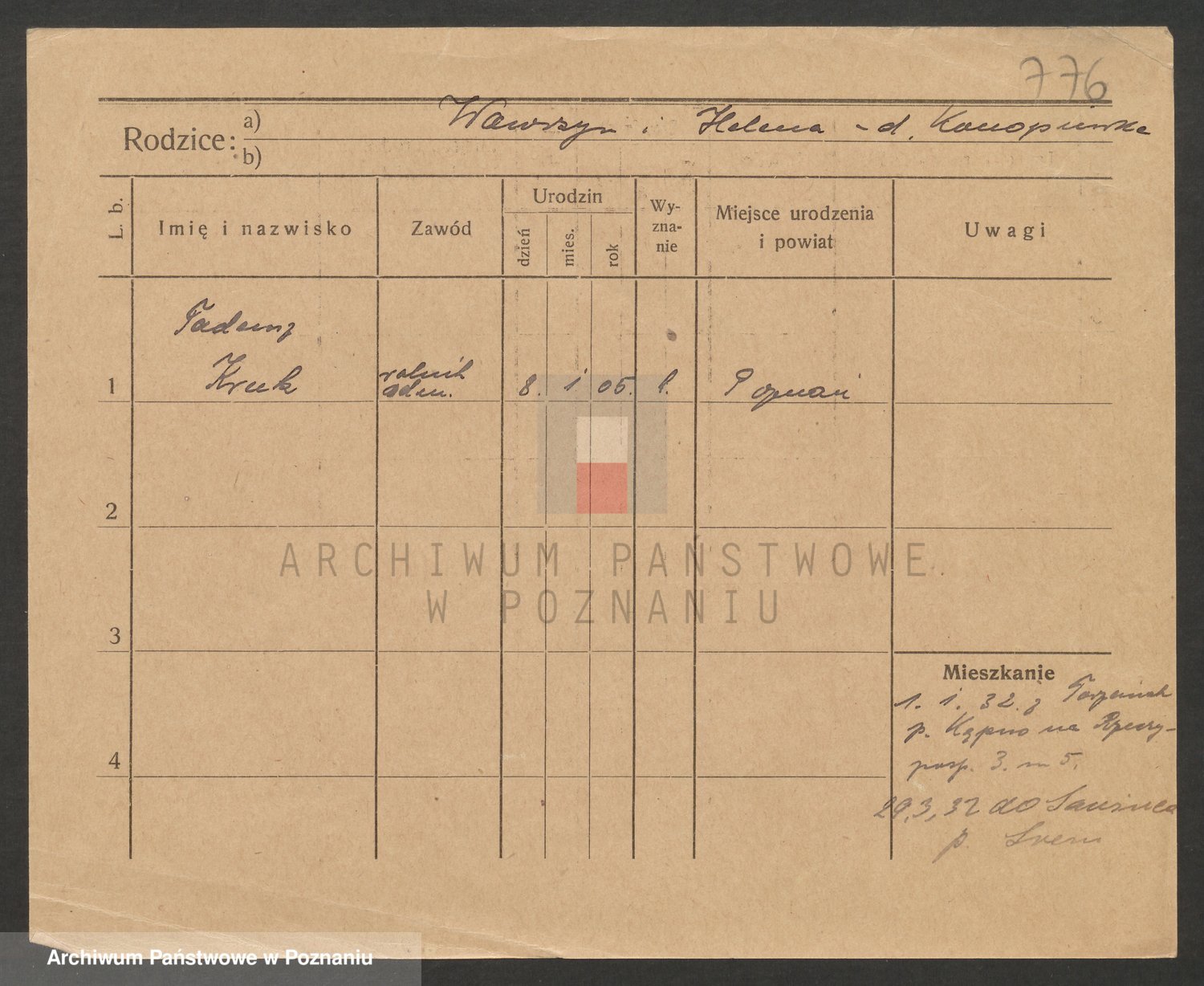 Podgląd karty osobowej dostępny jest po kliknięciu na nazwisko lub ikonkę karty. Można dokonywać powiększenia (ikony na górze) lub przechodzić między kolejnymi skanami (strzałki po bokach).