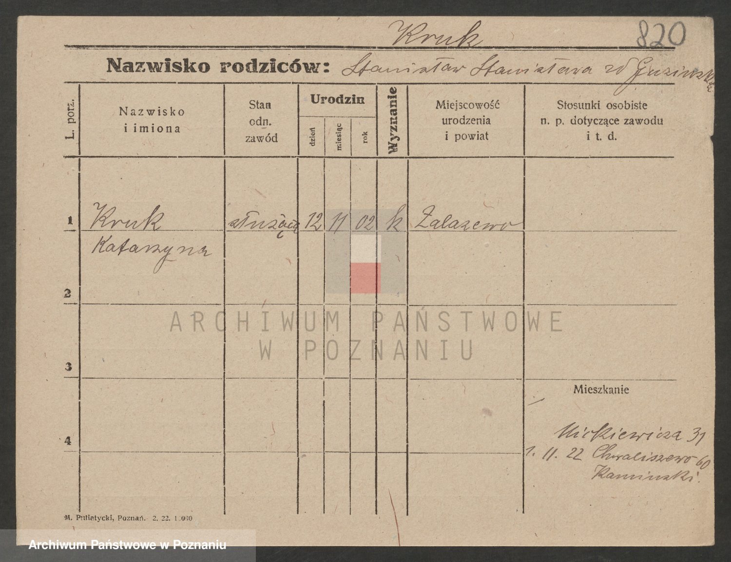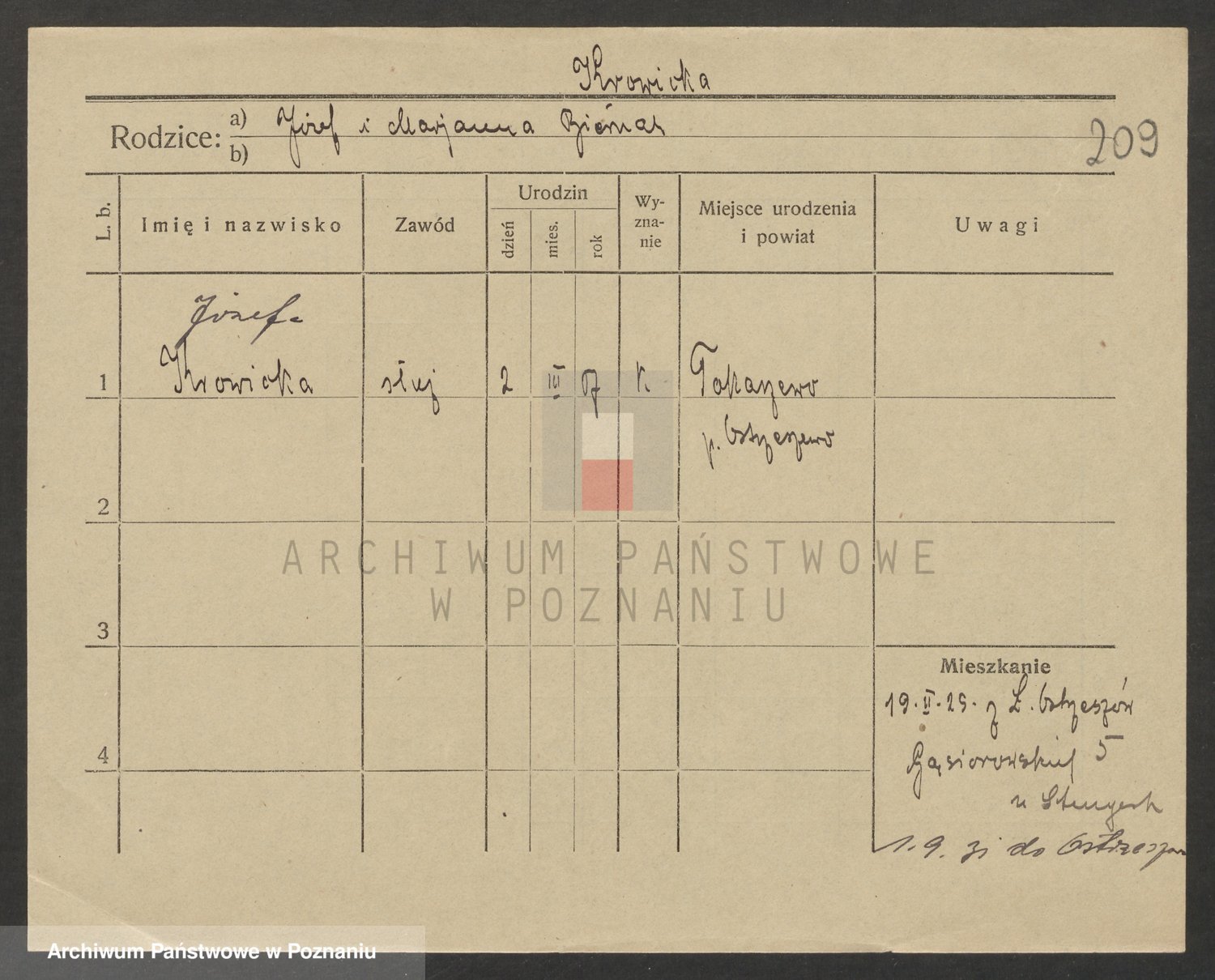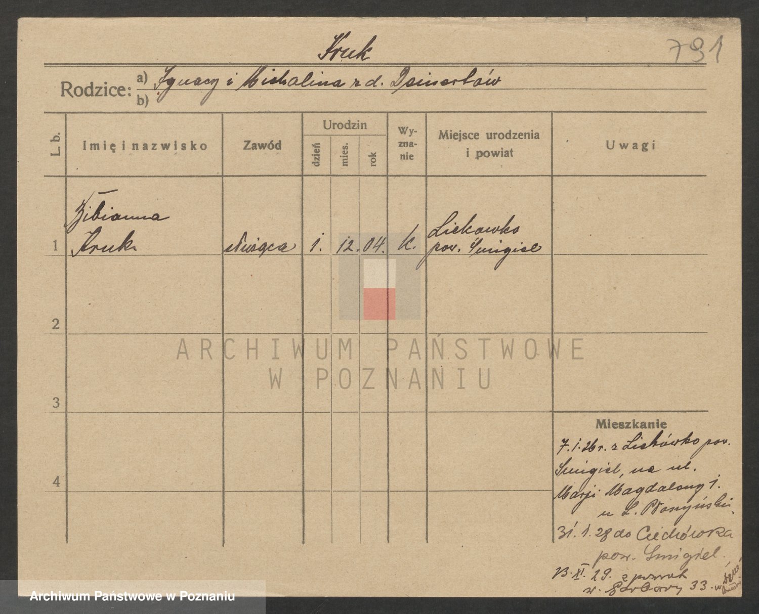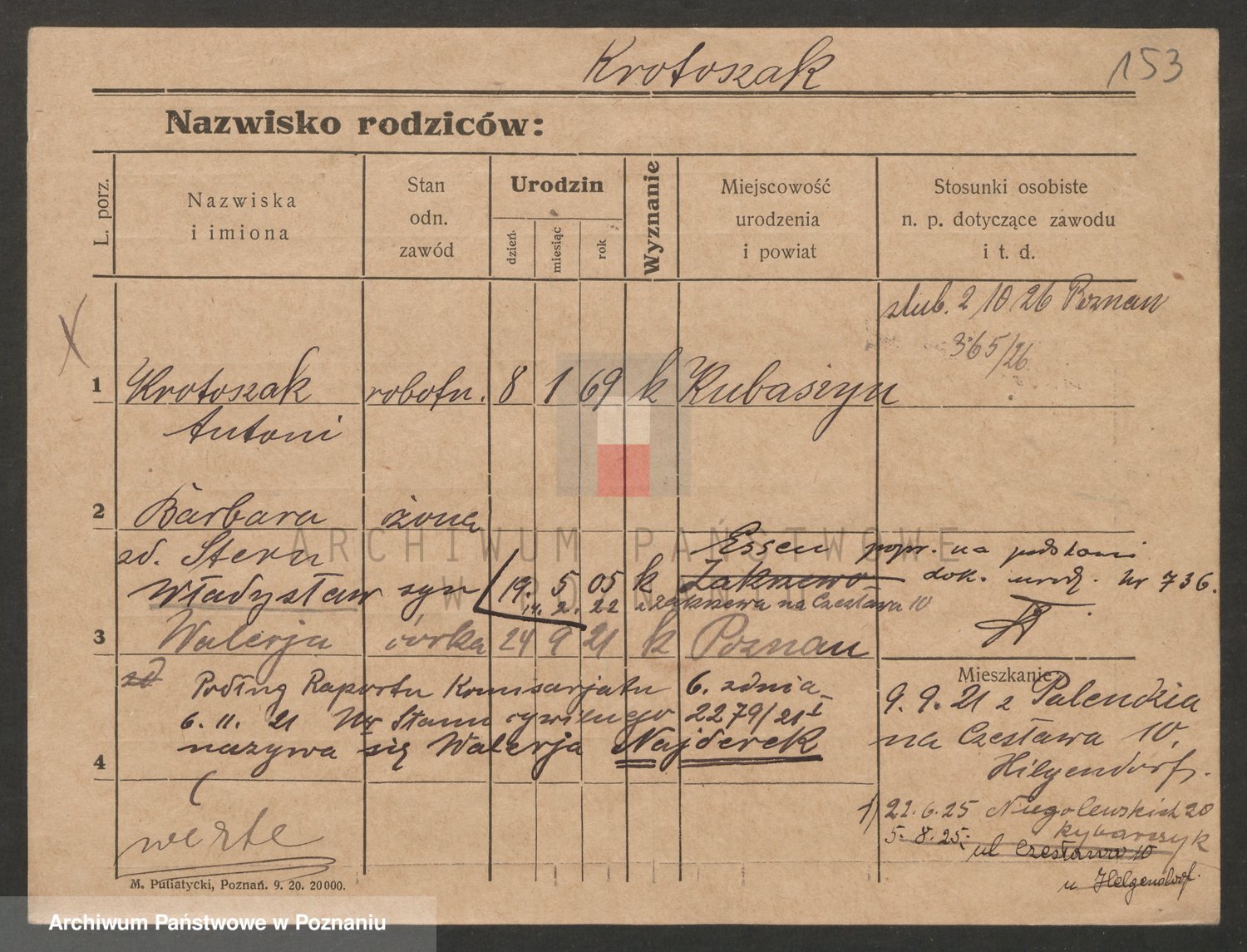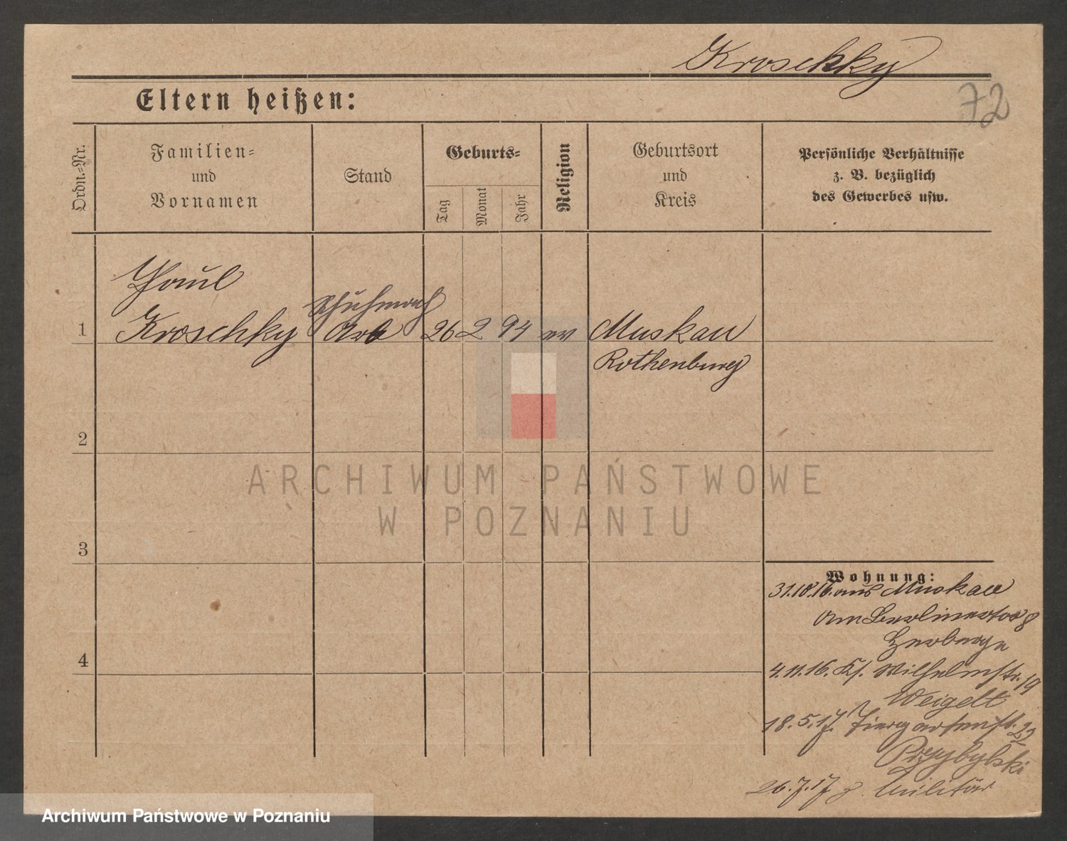 Podgląd karty osobowej dostępny jest po kliknięciu na nazwisko lub ikonkę karty. Można dokonywać powiększenia (ikony na górze) lub przechodzić między kolejnymi skanami (strzałki po bokach).