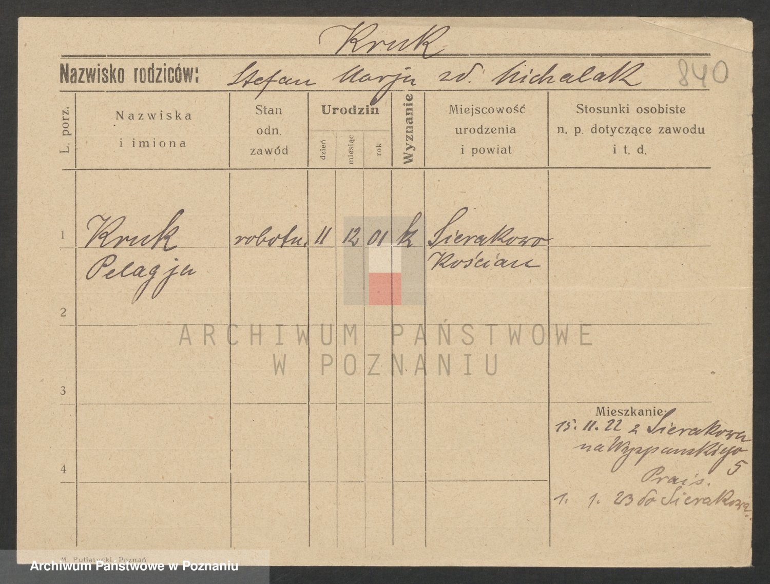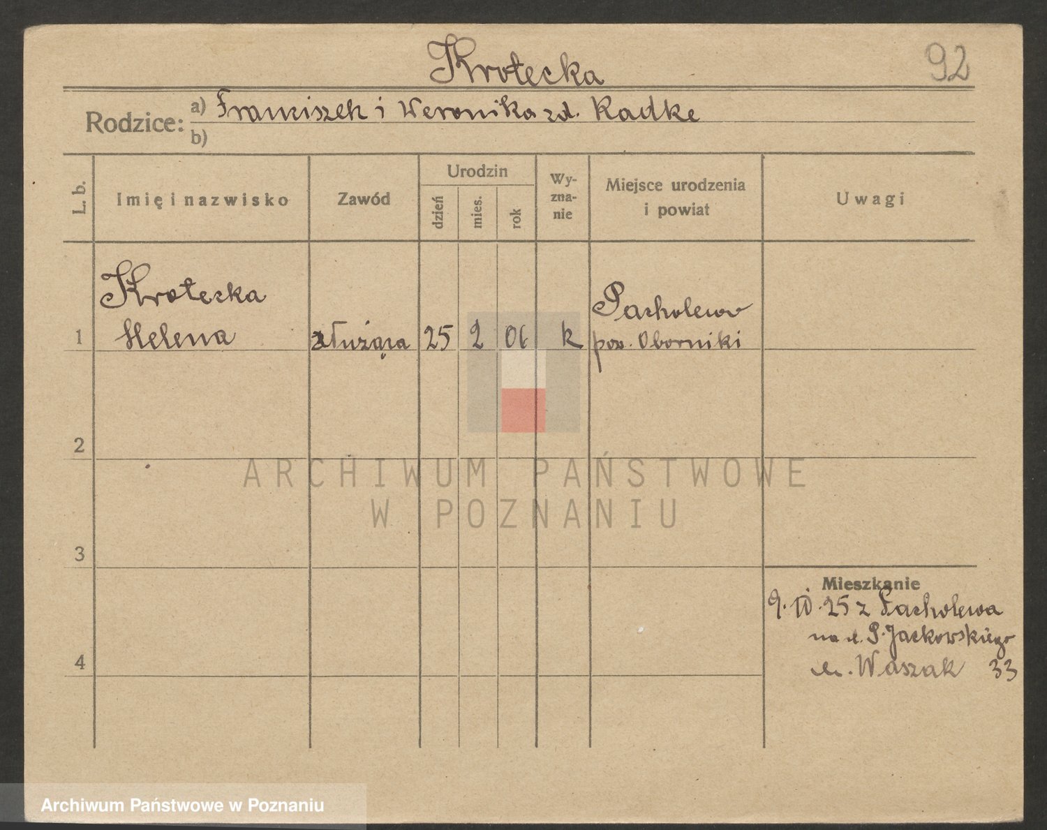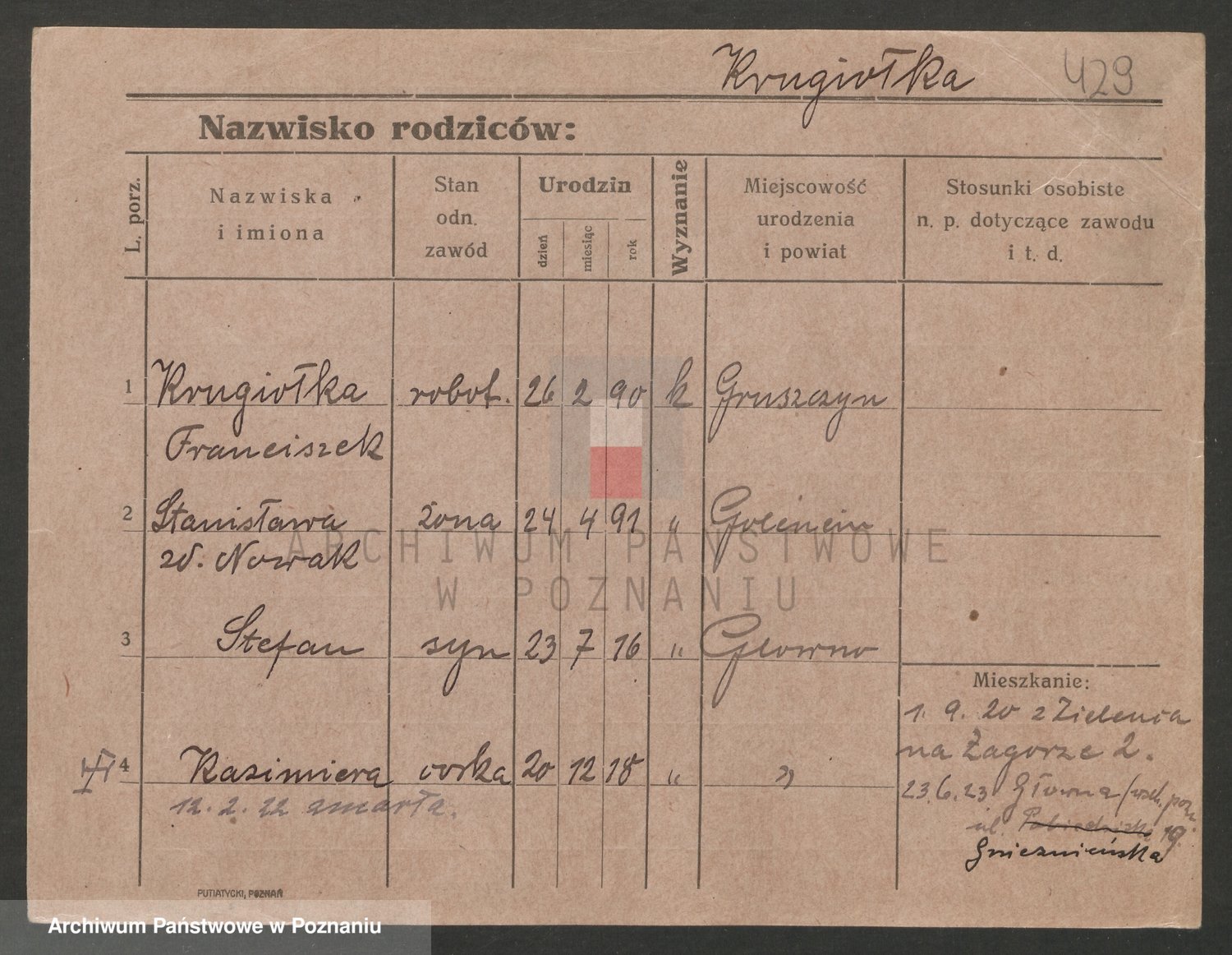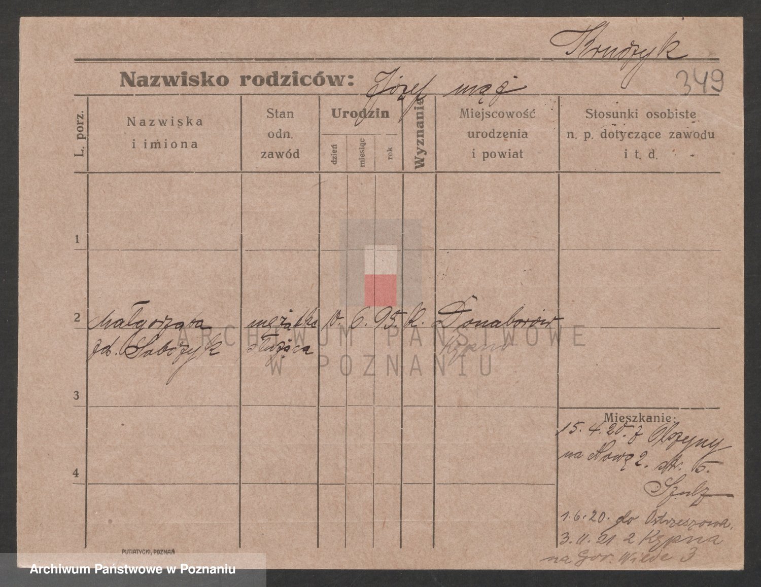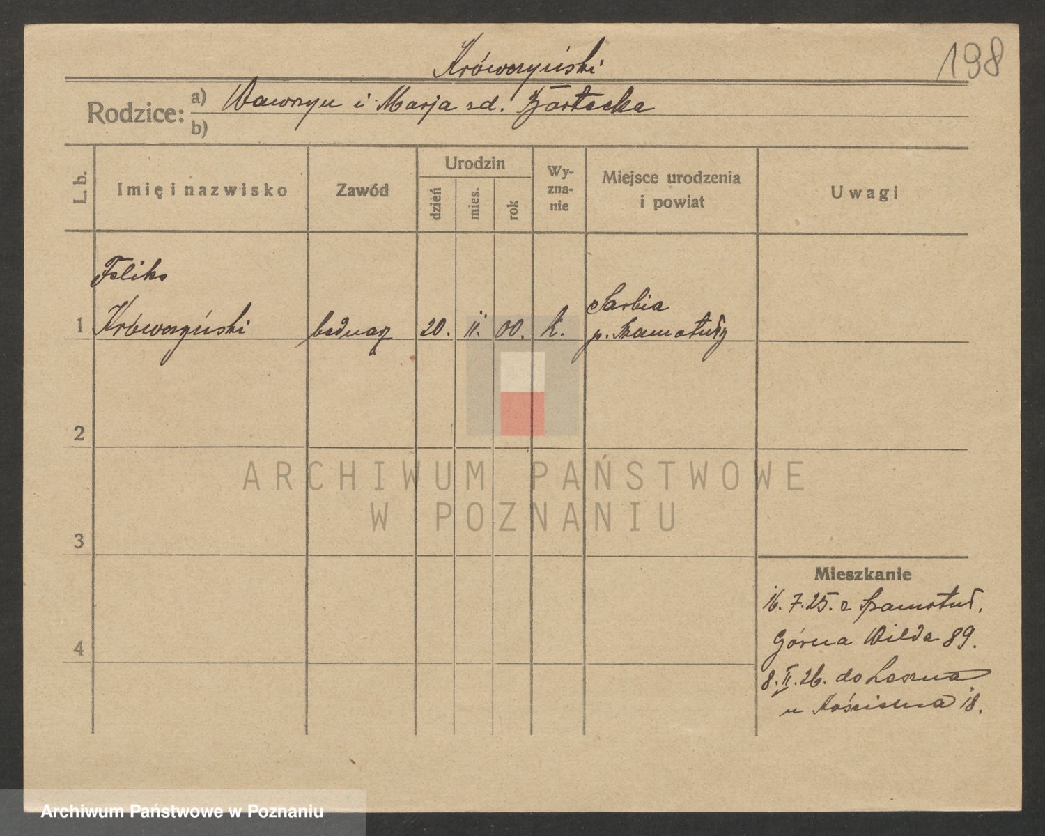 Podgląd karty osobowej dostępny jest po kliknięciu na nazwisko lub ikonkę karty. Można dokonywać powiększenia (ikony na górze) lub przechodzić między kolejnymi skanami (strzałki po bokach).