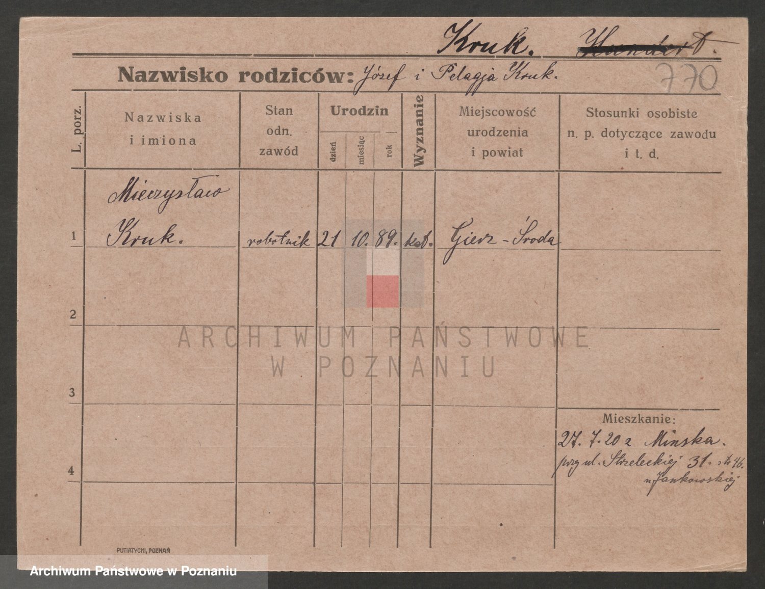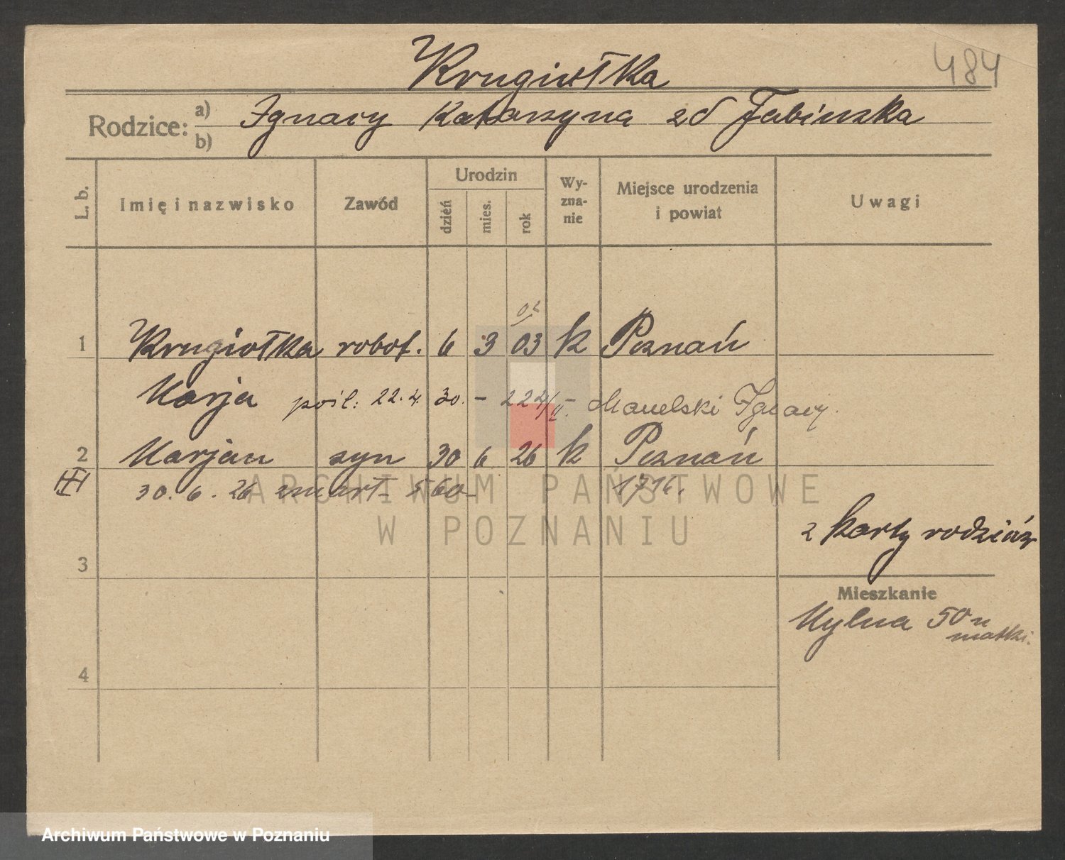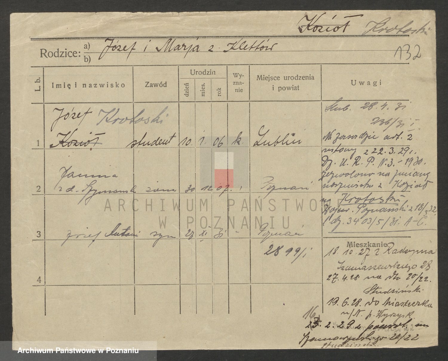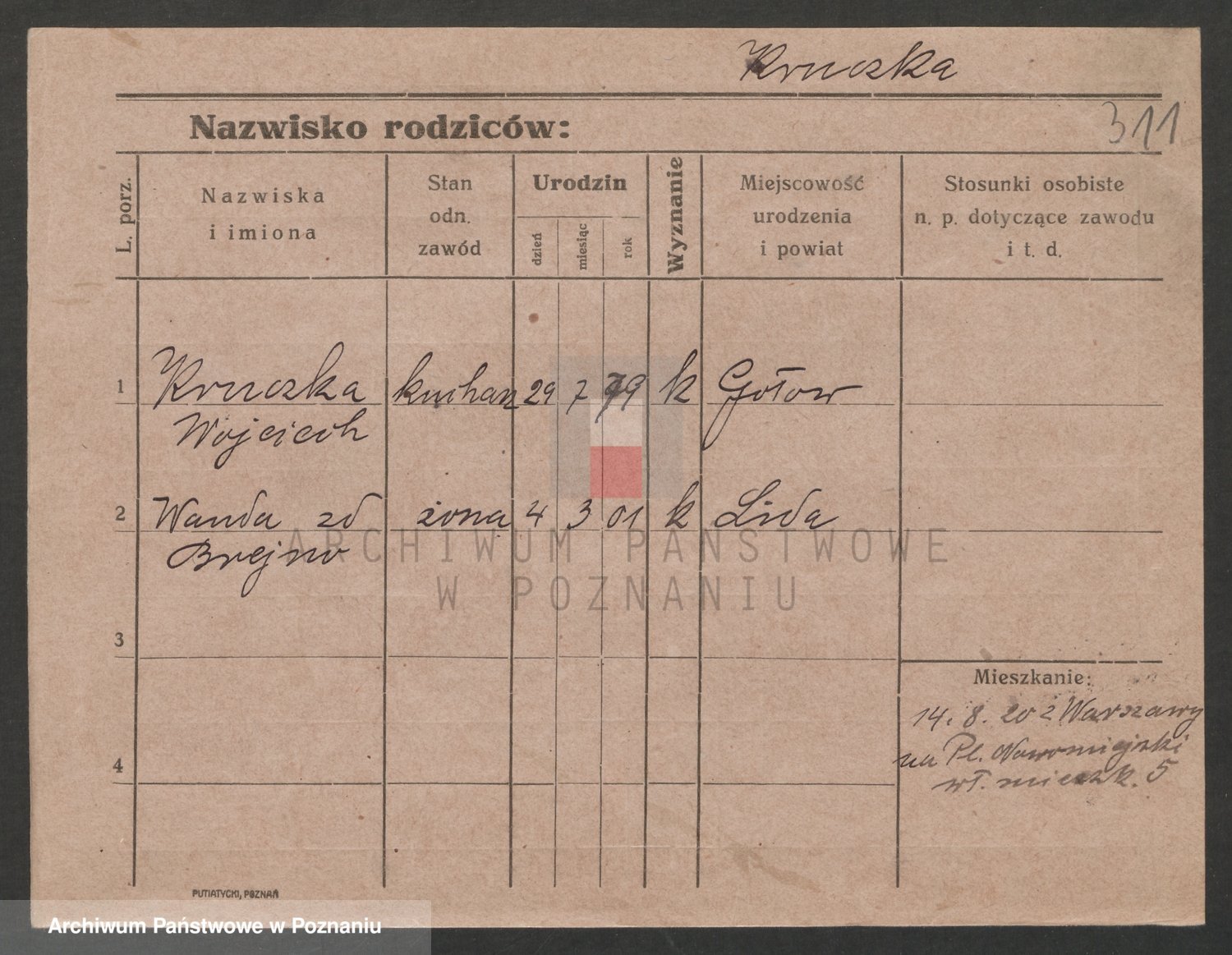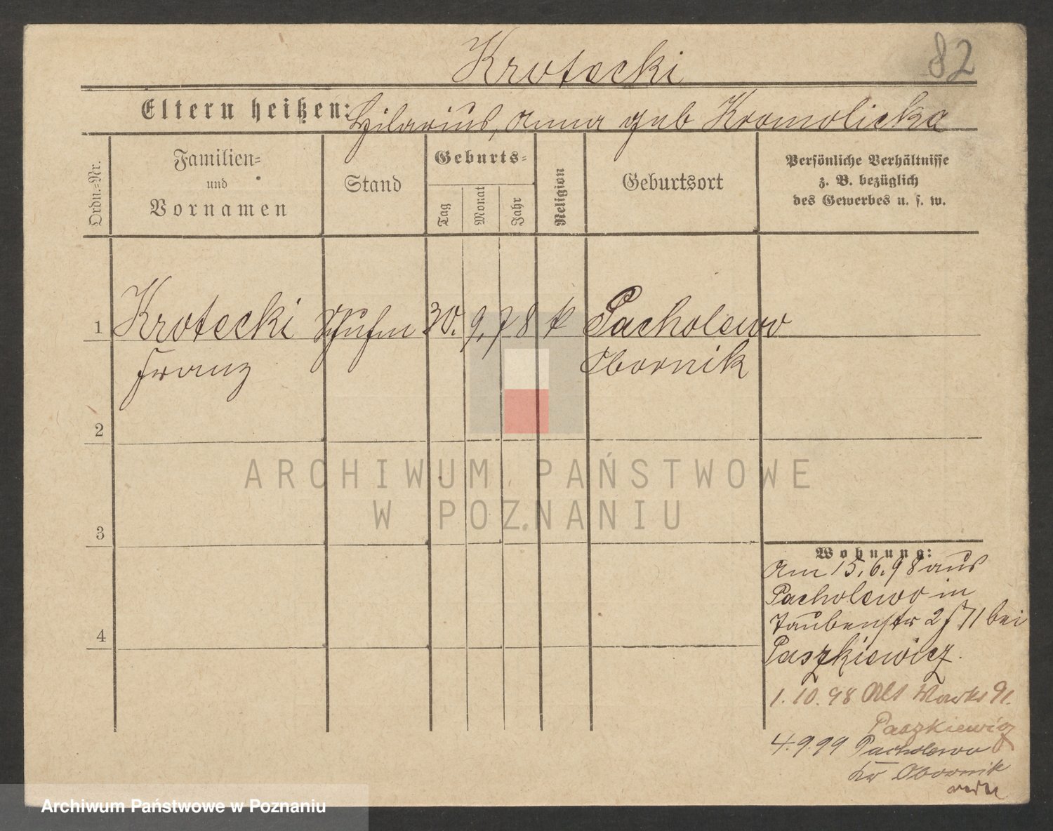 Podgląd karty osobowej dostępny jest po kliknięciu na nazwisko lub ikonkę karty. Można dokonywać powiększenia (ikony na górze) lub przechodzić między kolejnymi skanami (strzałki po bokach).