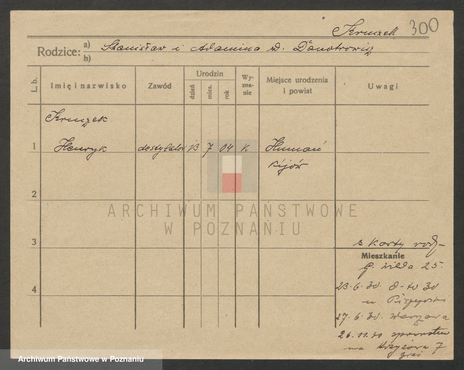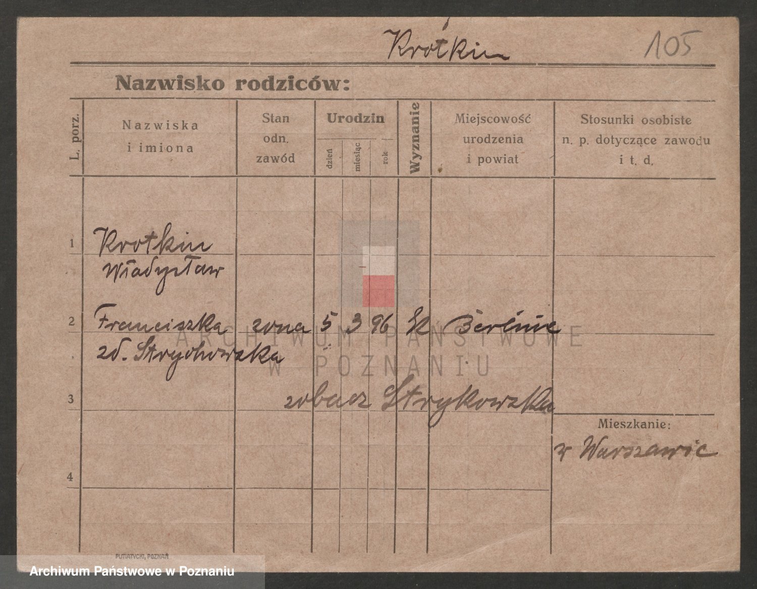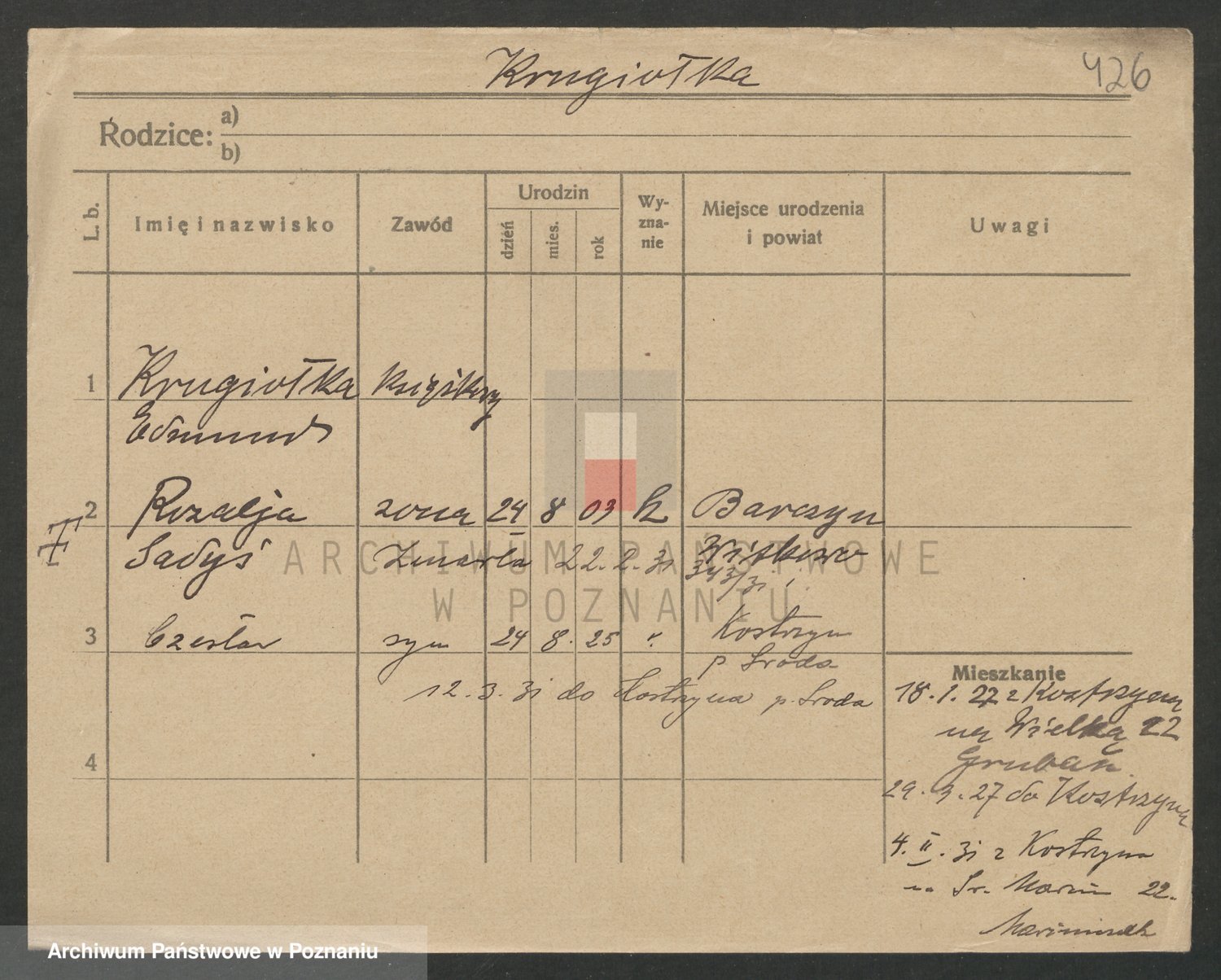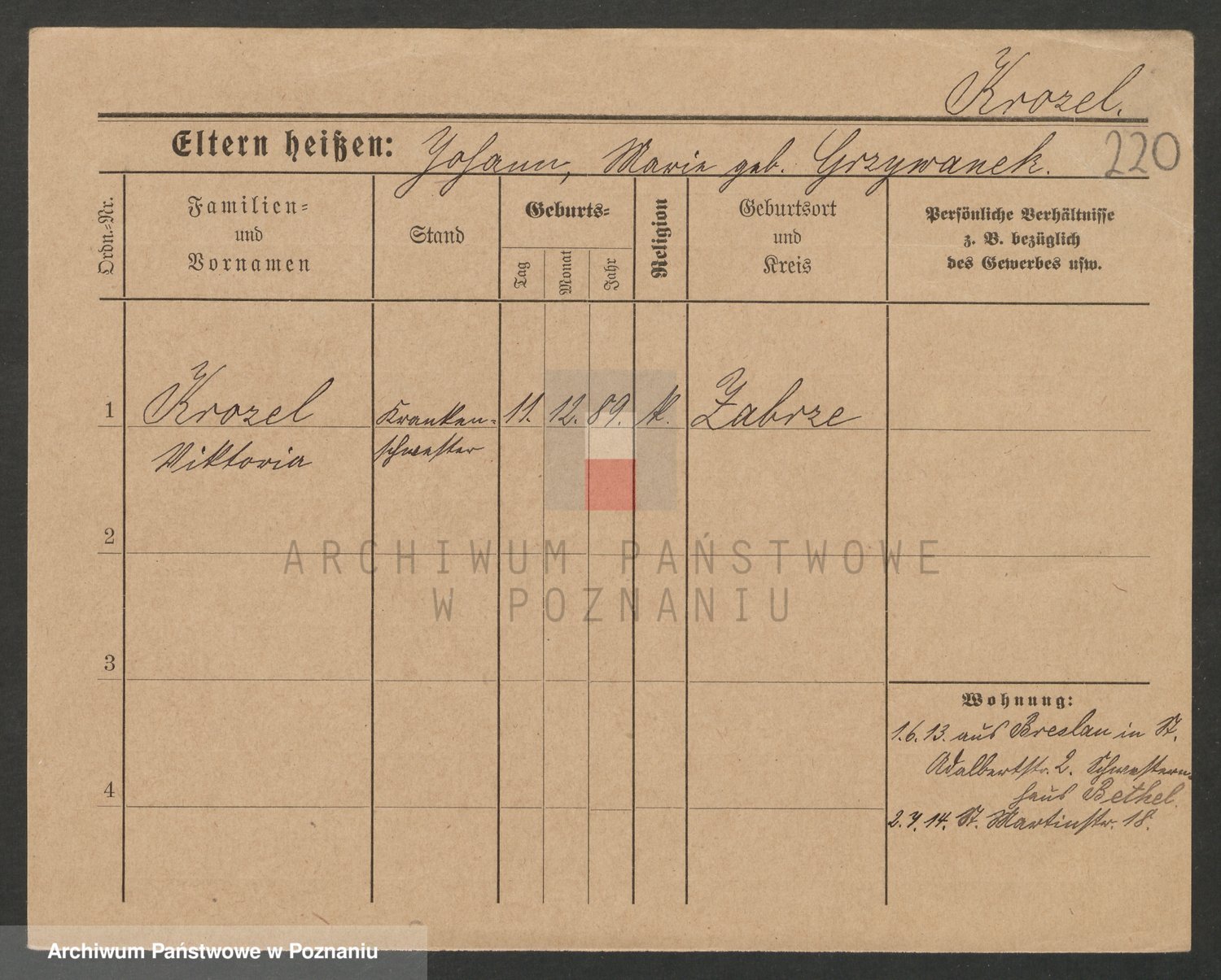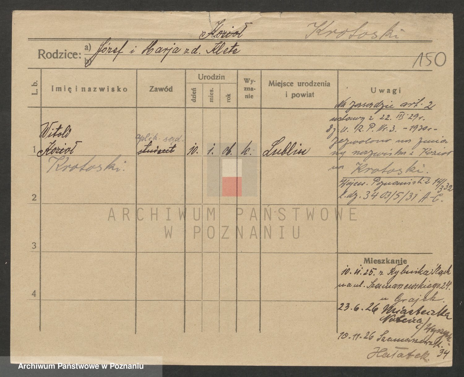 Podgląd karty osobowej dostępny jest po kliknięciu na nazwisko lub ikonkę karty. Można dokonywać powiększenia (ikony na górze) lub przechodzić między kolejnymi skanami (strzałki po bokach).