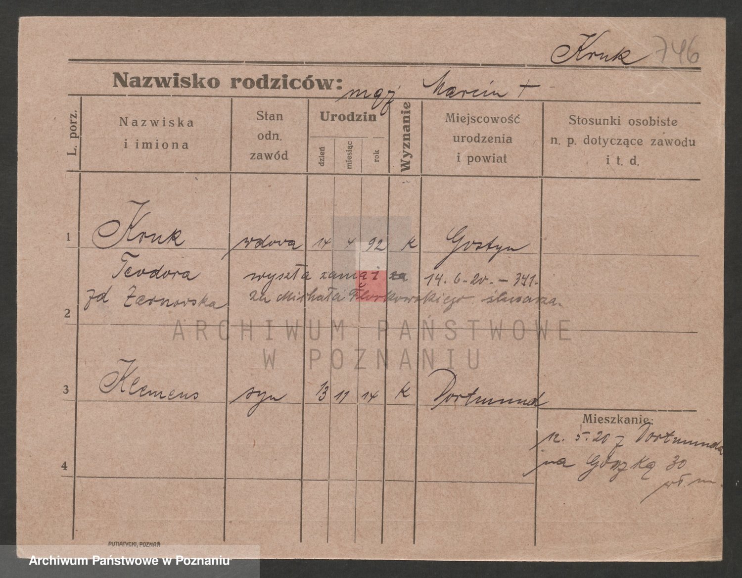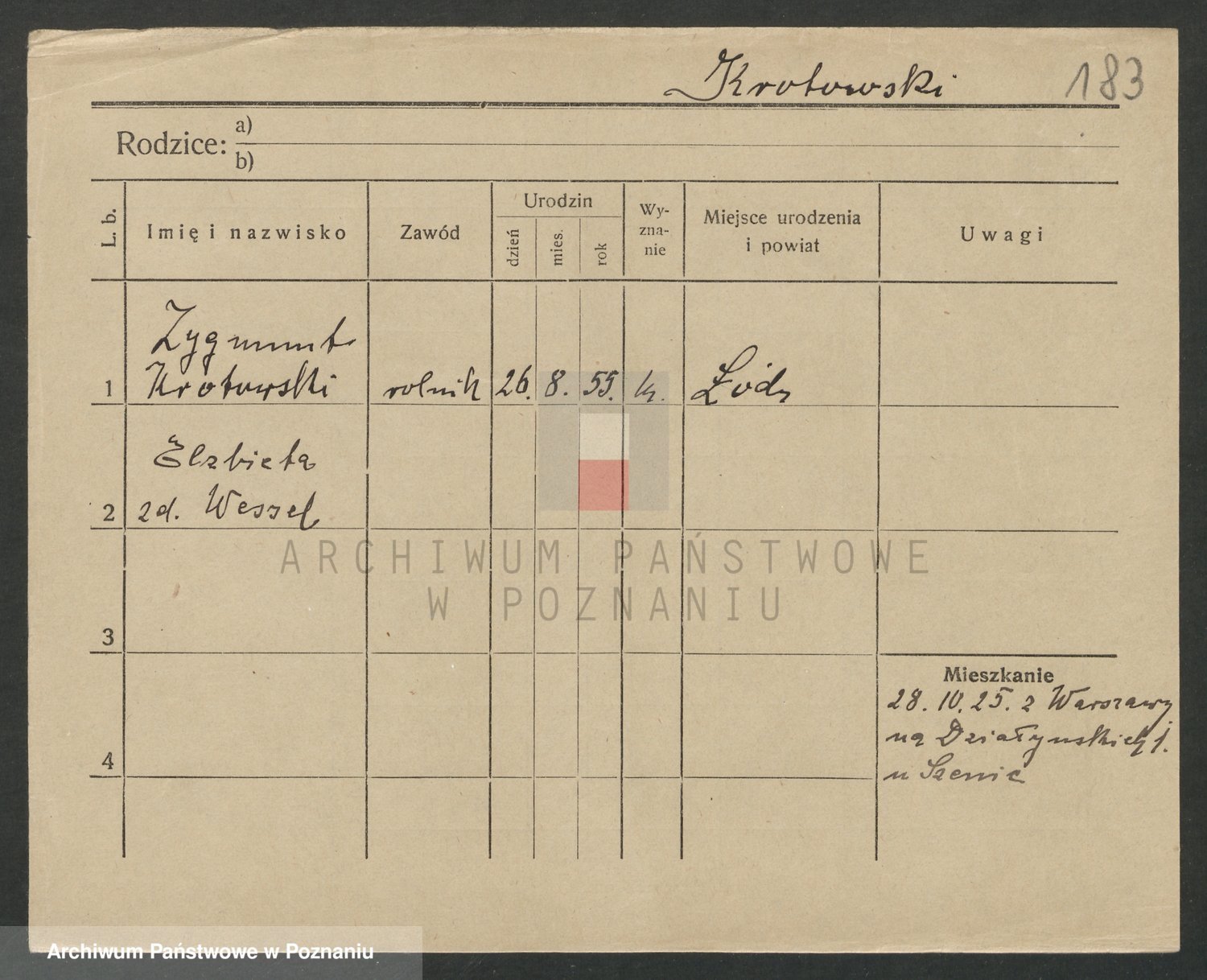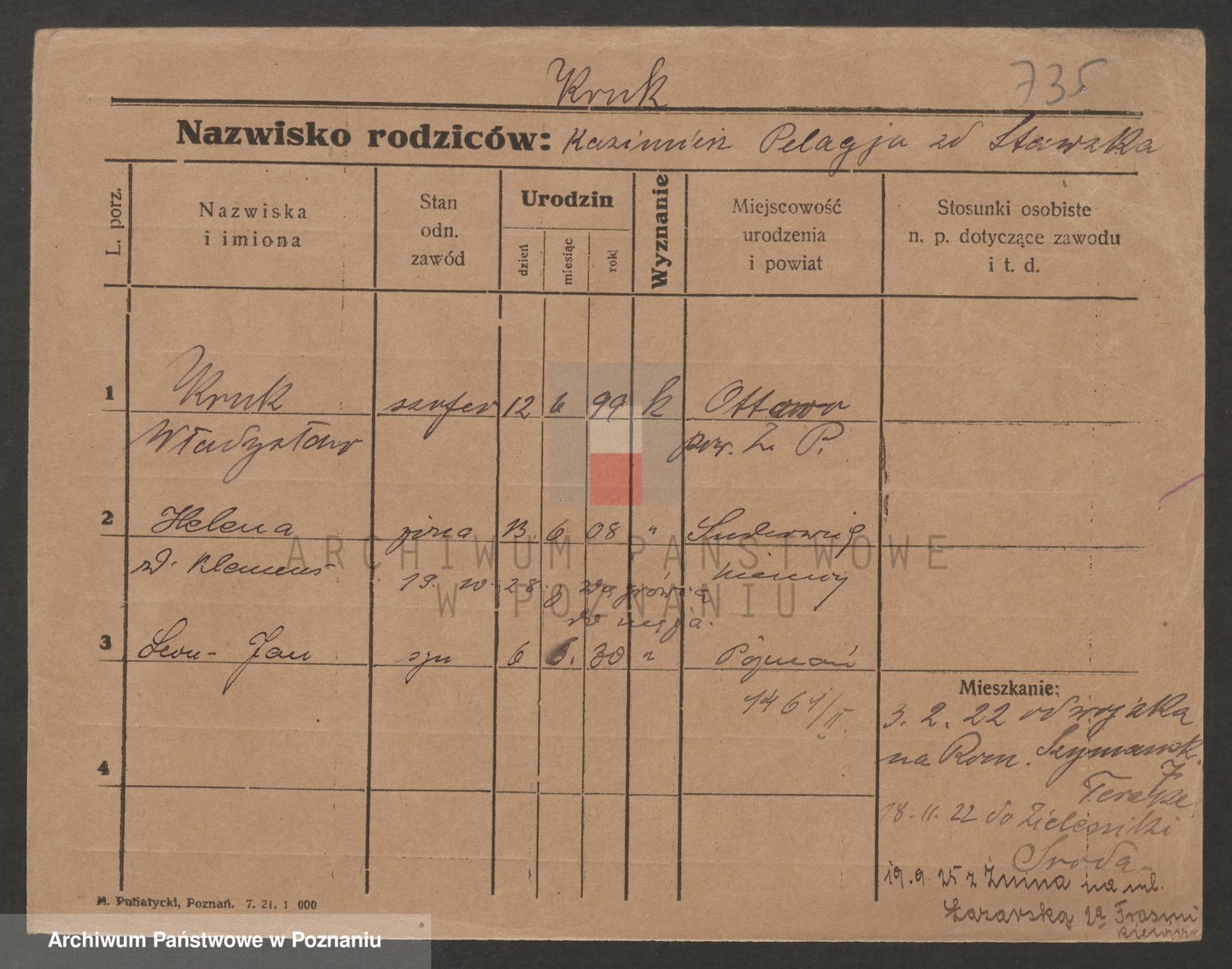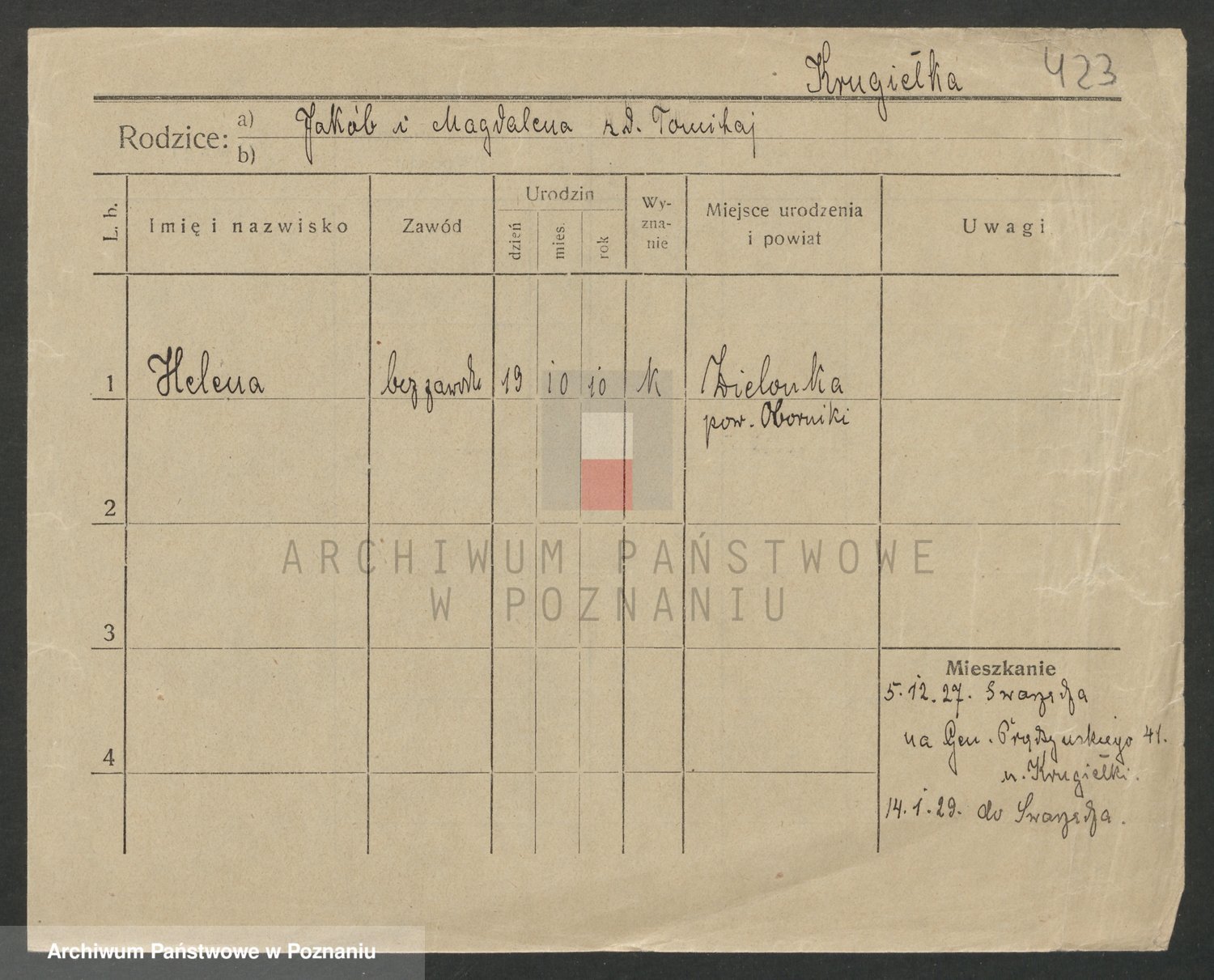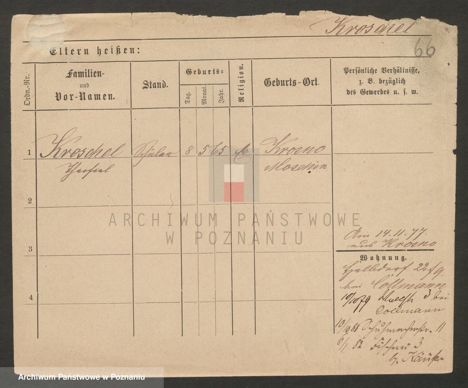 Podgląd karty osobowej dostępny jest po kliknięciu na nazwisko lub ikonkę karty. Można dokonywać powiększenia (ikony na górze) lub przechodzić między kolejnymi skanami (strzałki po bokach).