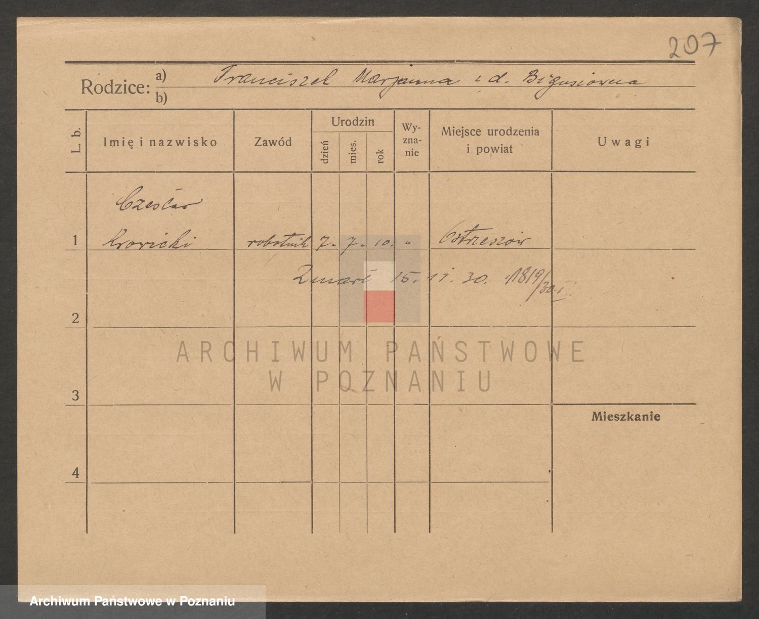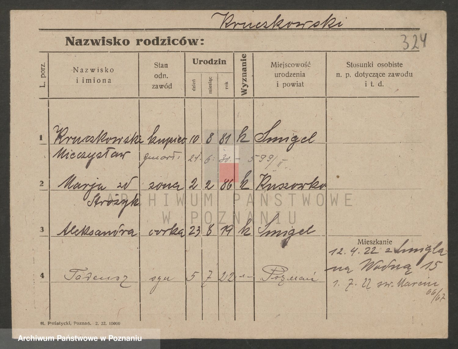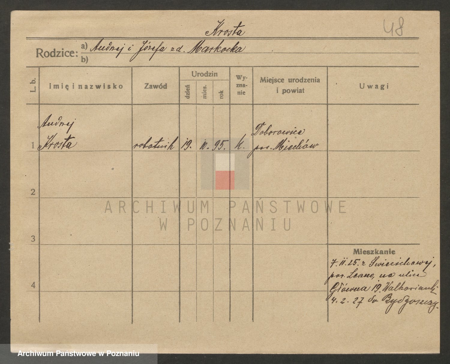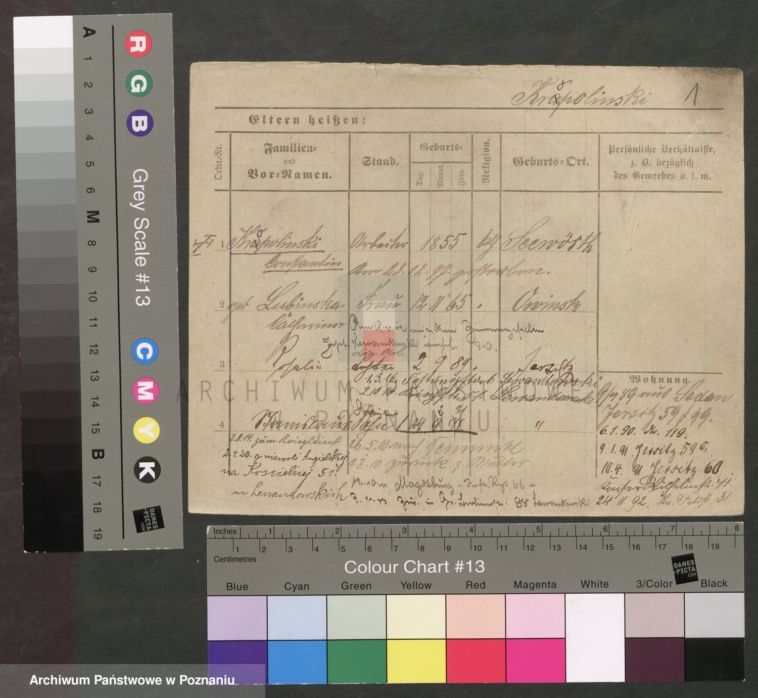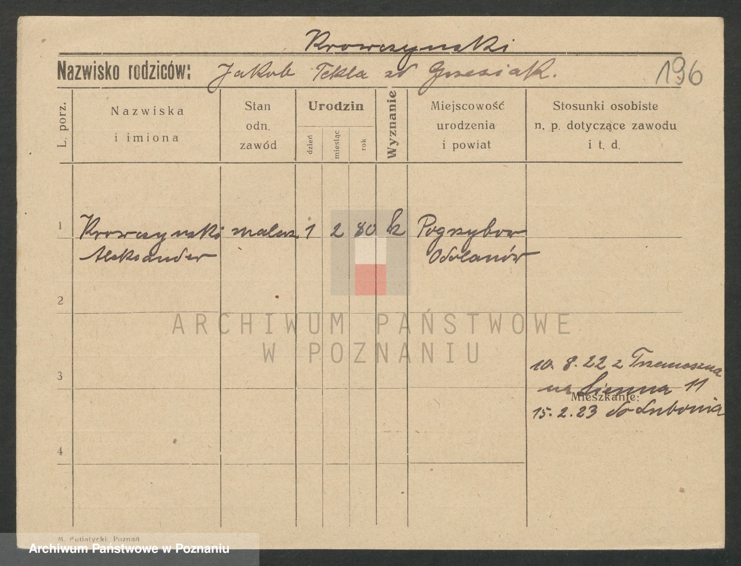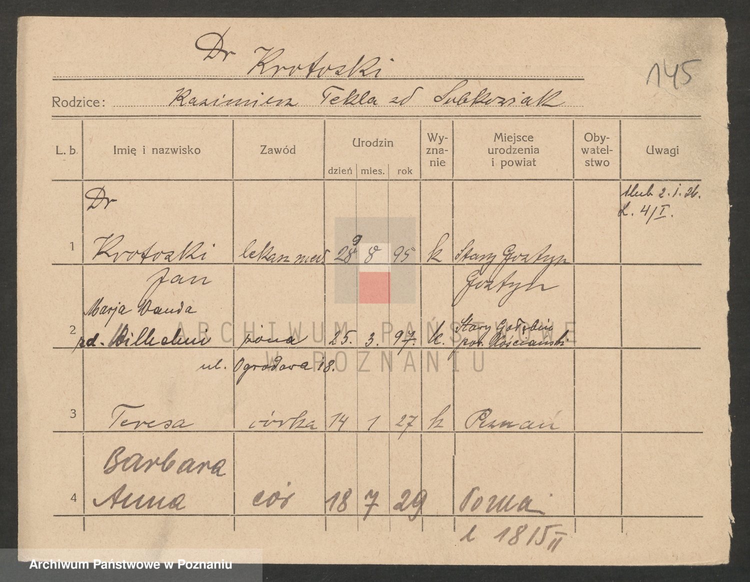 Podgląd karty osobowej dostępny jest po kliknięciu na nazwisko lub ikonkę karty. Można dokonywać powiększenia (ikony na górze) lub przechodzić między kolejnymi skanami (strzałki po bokach).
