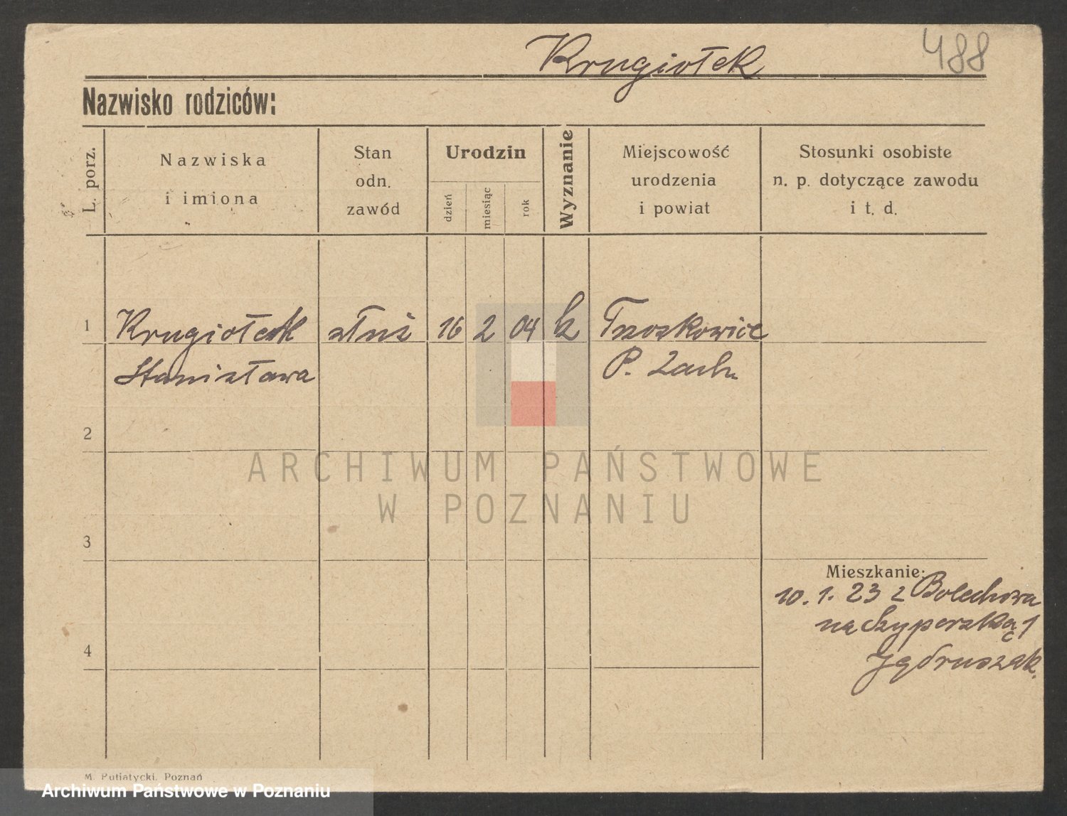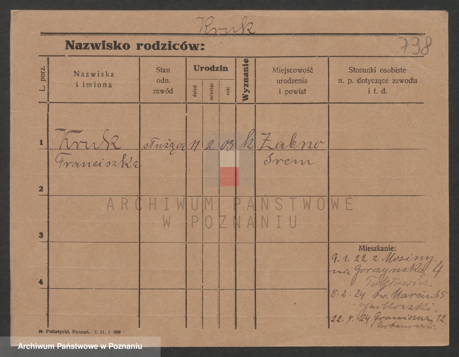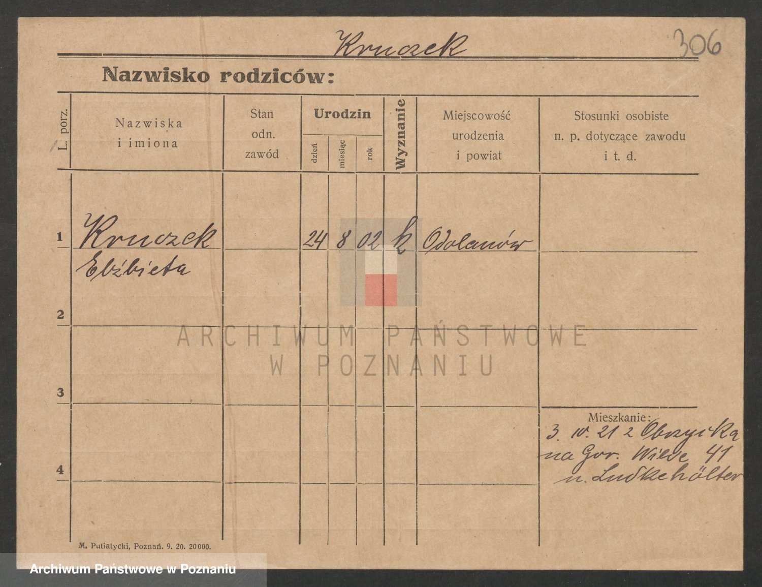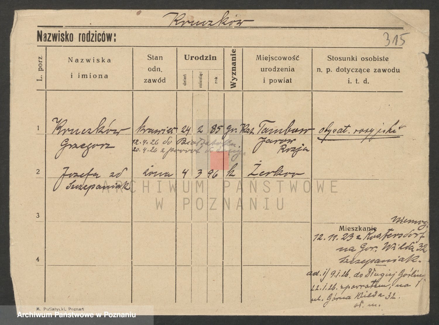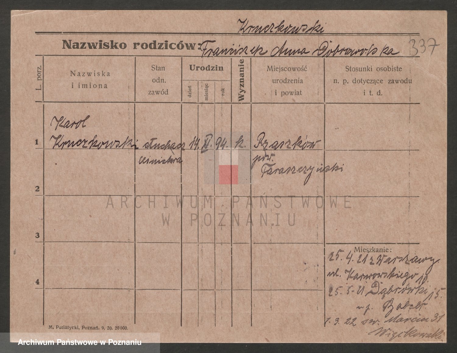Podgląd karty osobowej dostępny jest po kliknięciu na nazwisko lub ikonkę karty. Można dokonywać powiększenia (ikony na górze) lub przechodzić między kolejnymi skanami (strzałki po bokach).