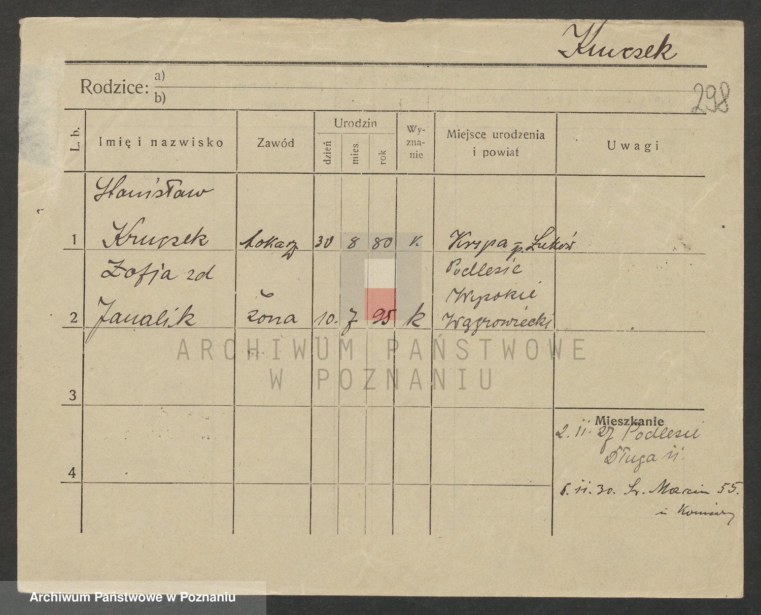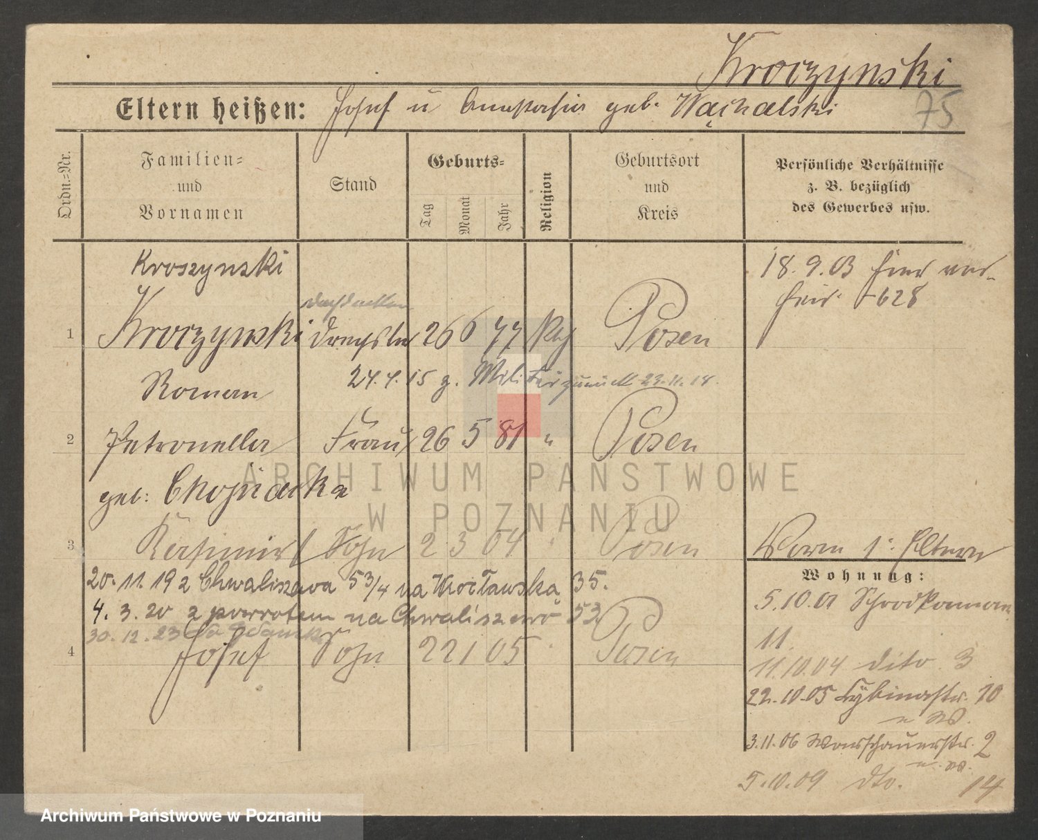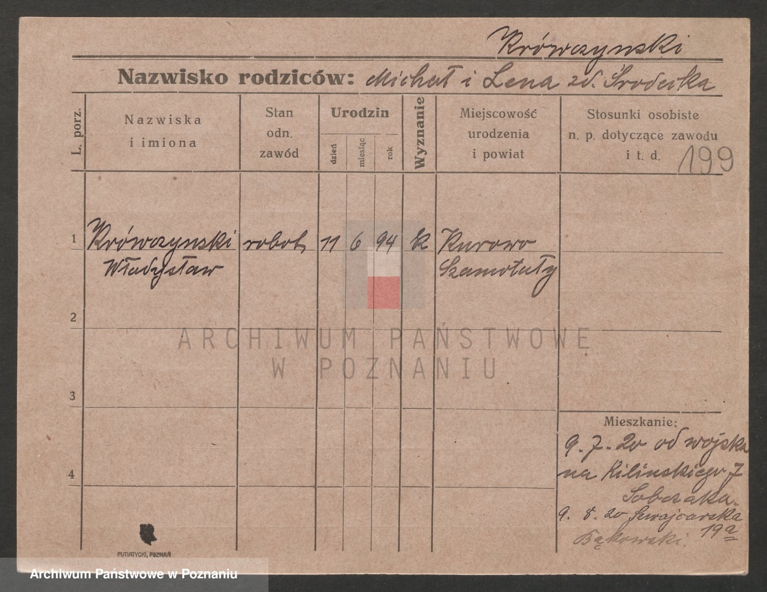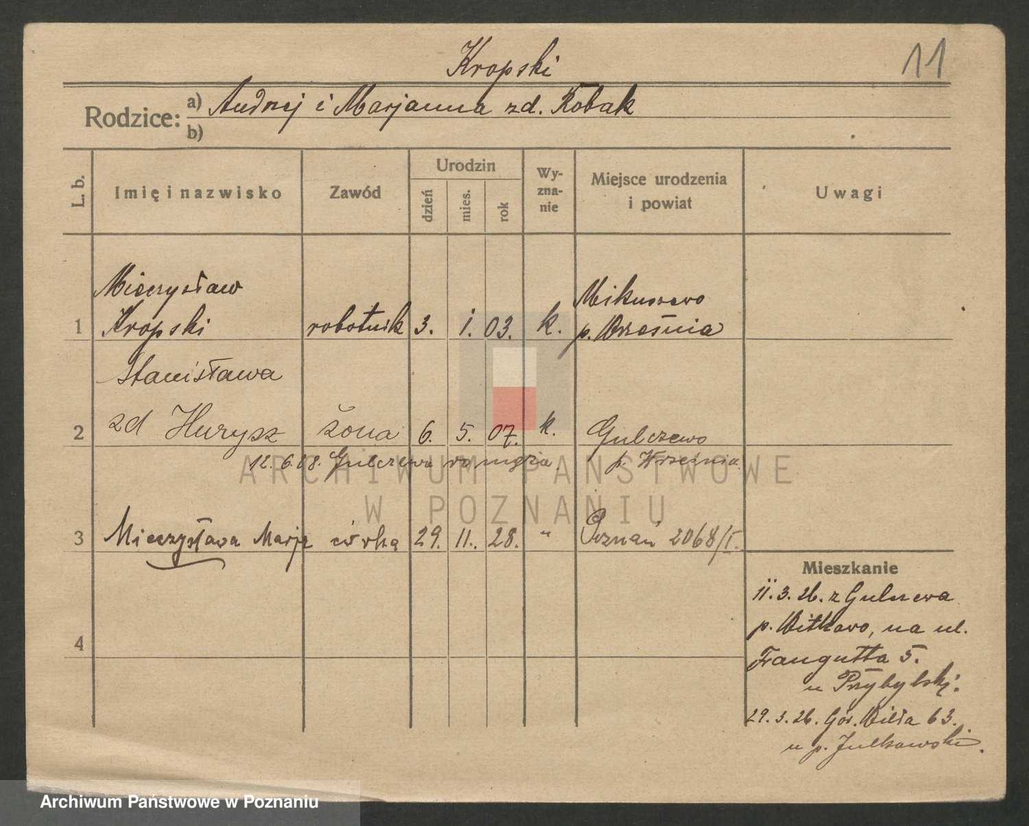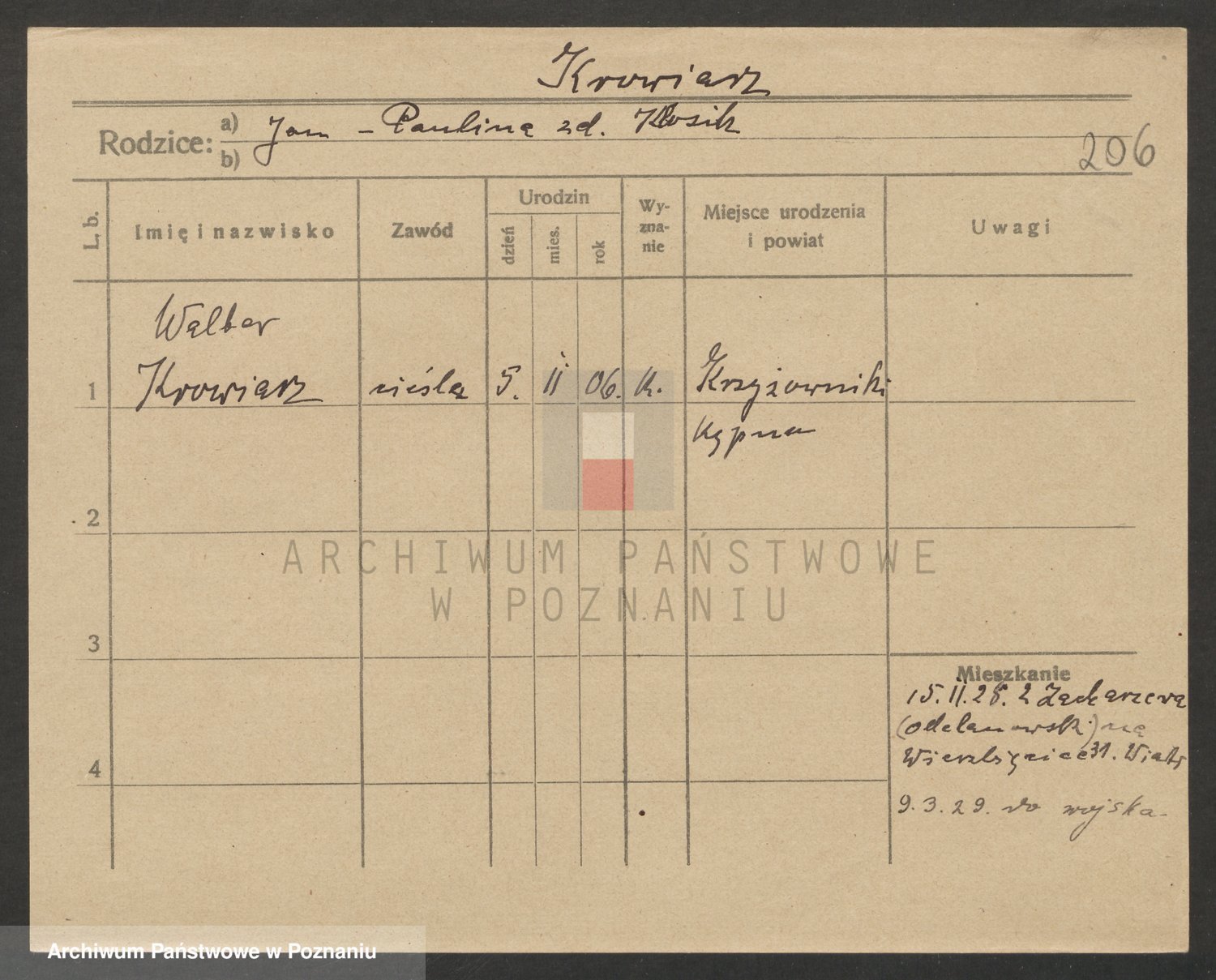Podgląd karty osobowej dostępny jest po kliknięciu na nazwisko lub ikonkę karty. Można dokonywać powiększenia (ikony na górze) lub przechodzić między kolejnymi skanami (strzałki po bokach).