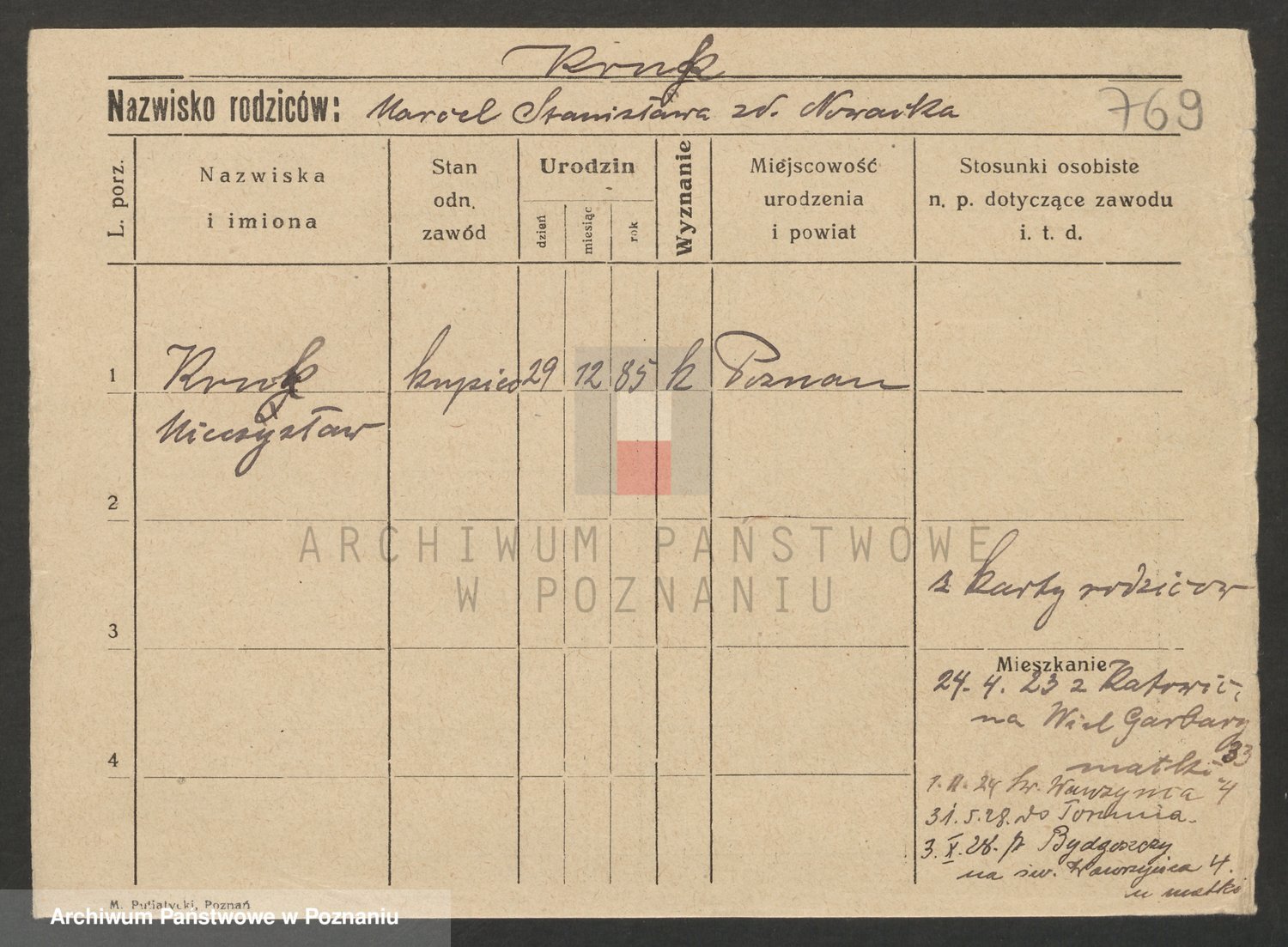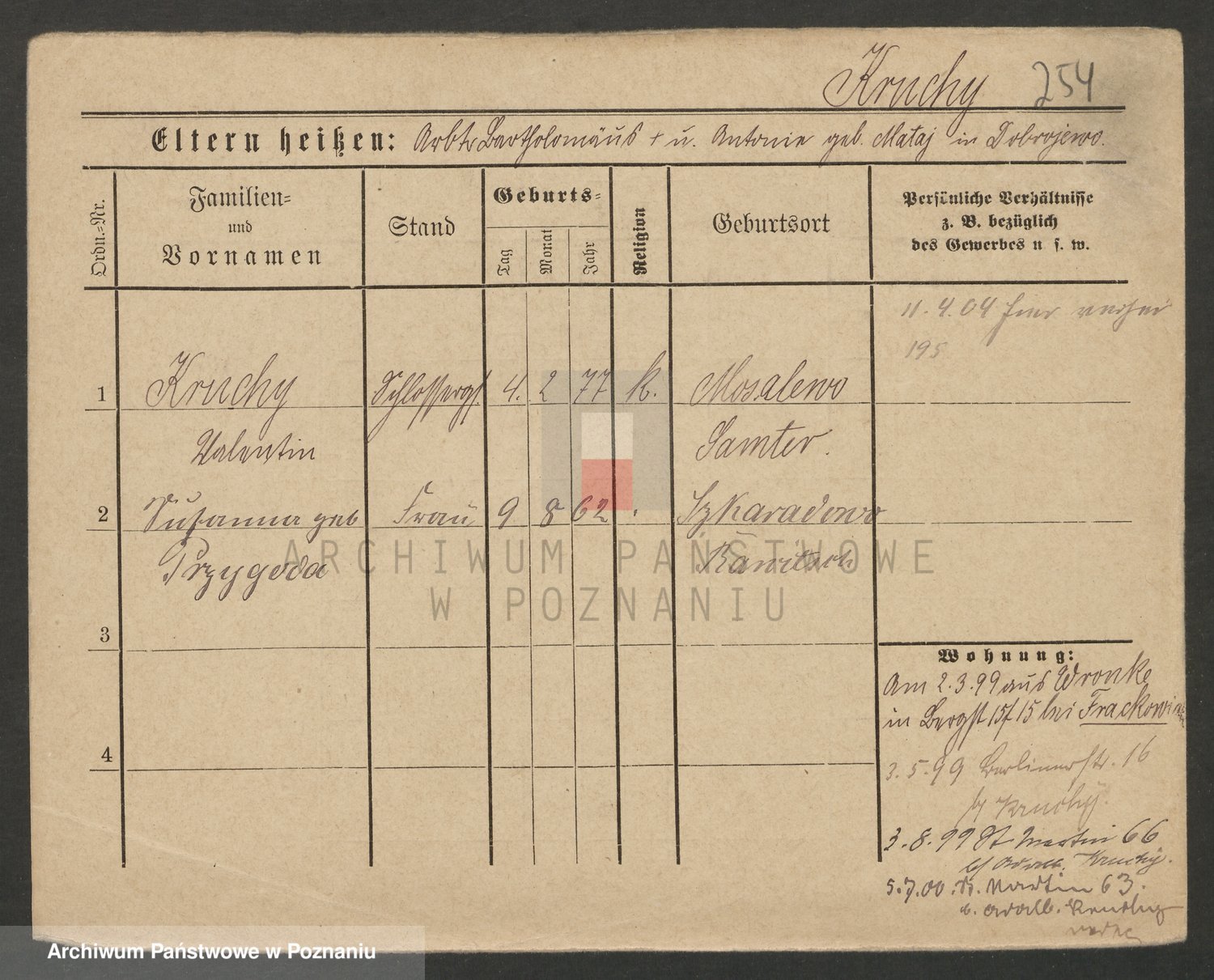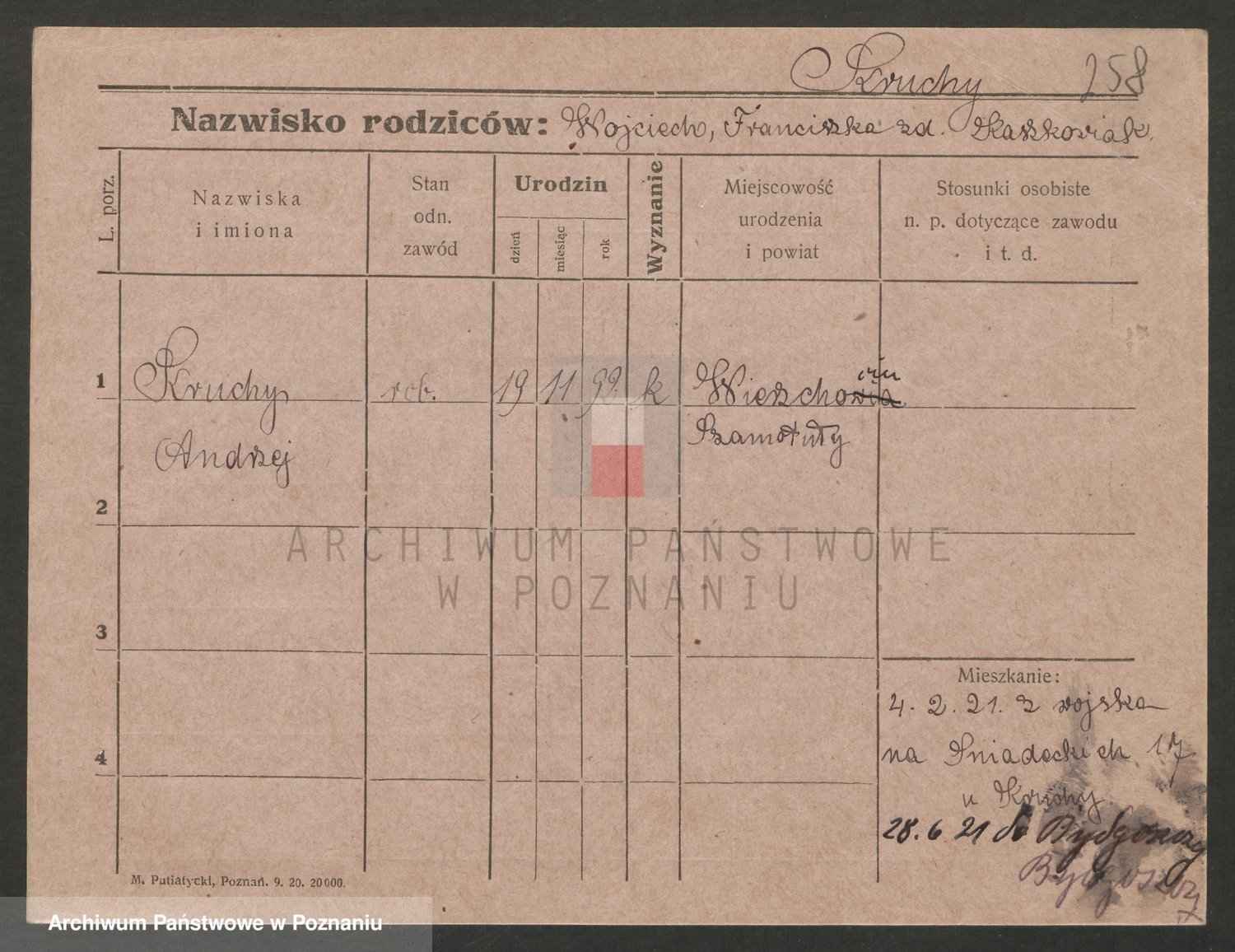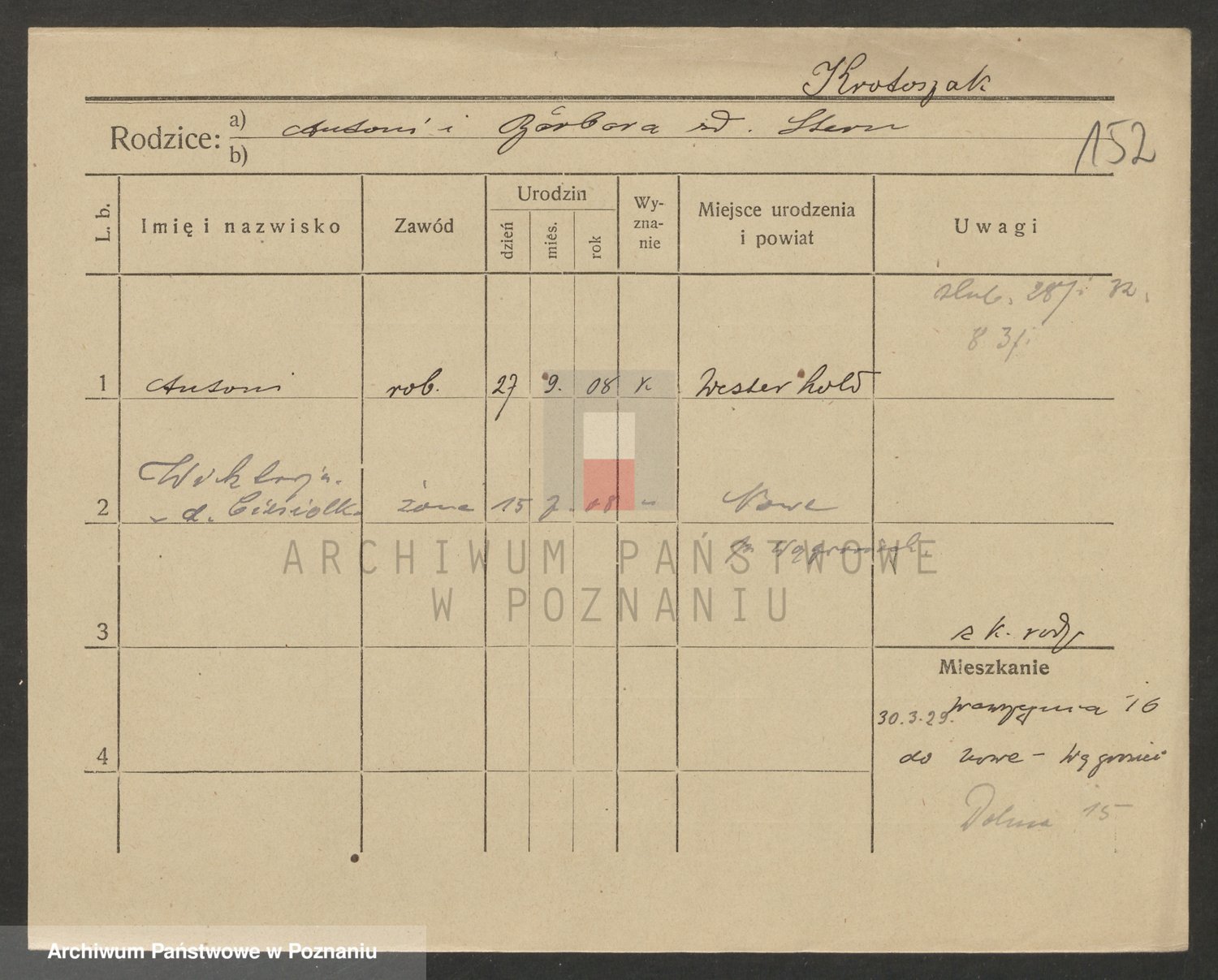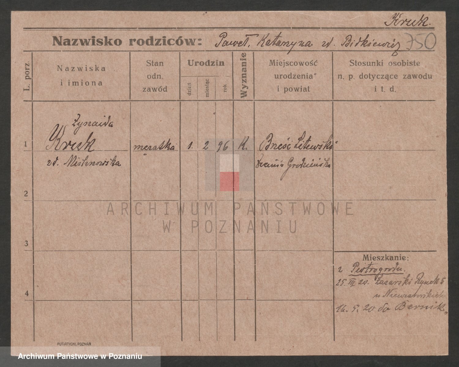Podgląd karty osobowej dostępny jest po kliknięciu na nazwisko lub ikonkę karty. Można dokonywać powiększenia (ikony na górze) lub przechodzić między kolejnymi skanami (strzałki po bokach).