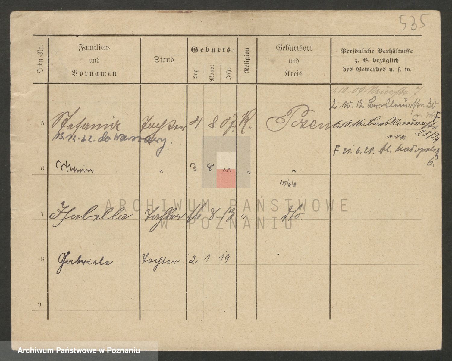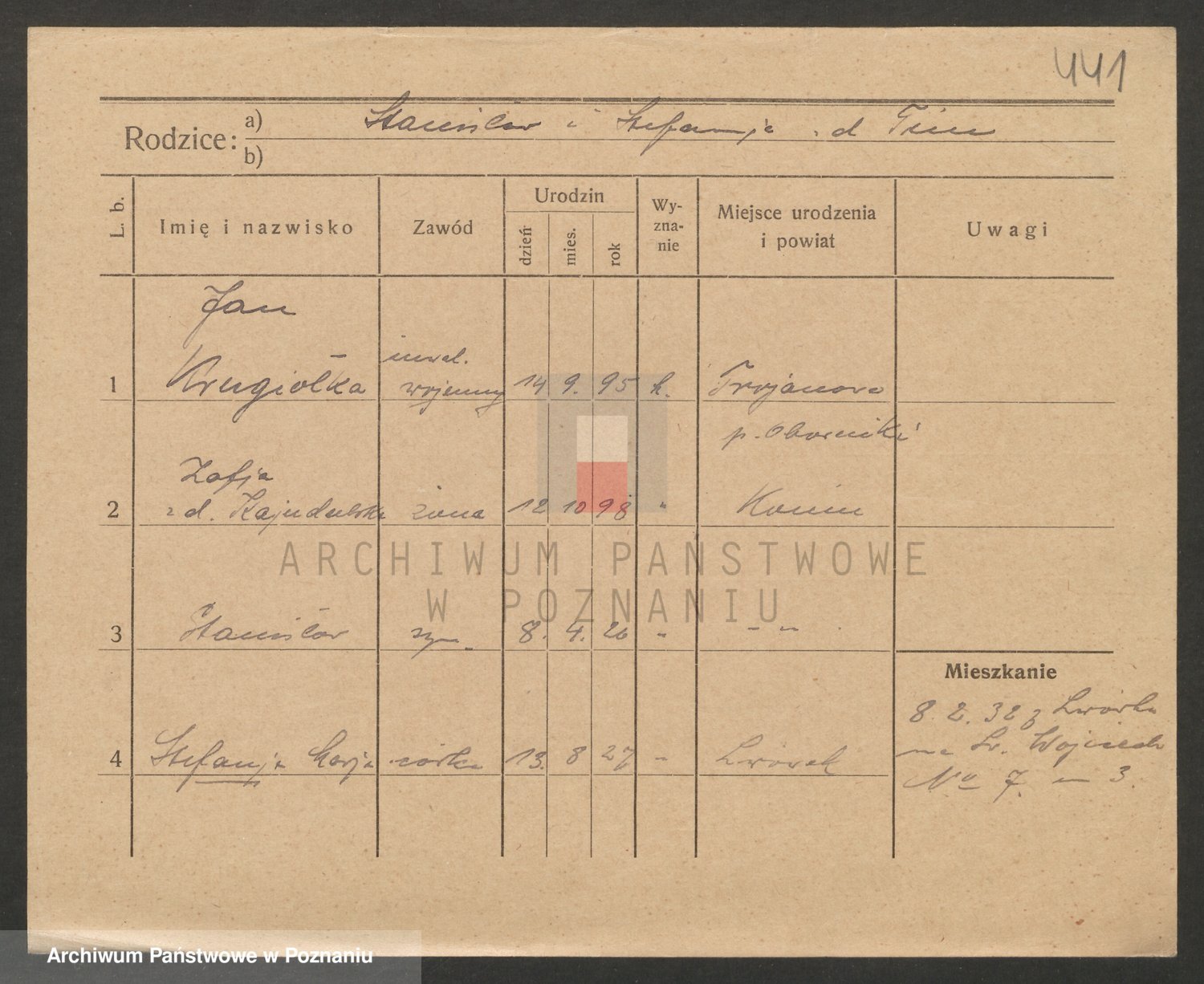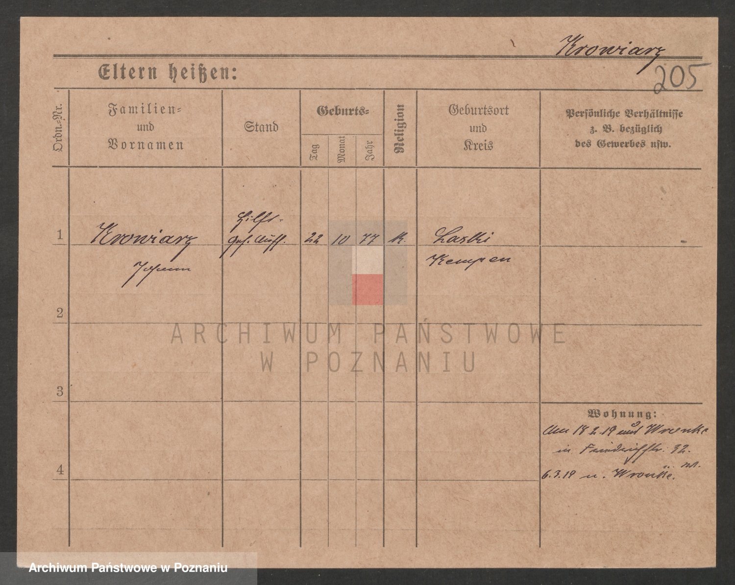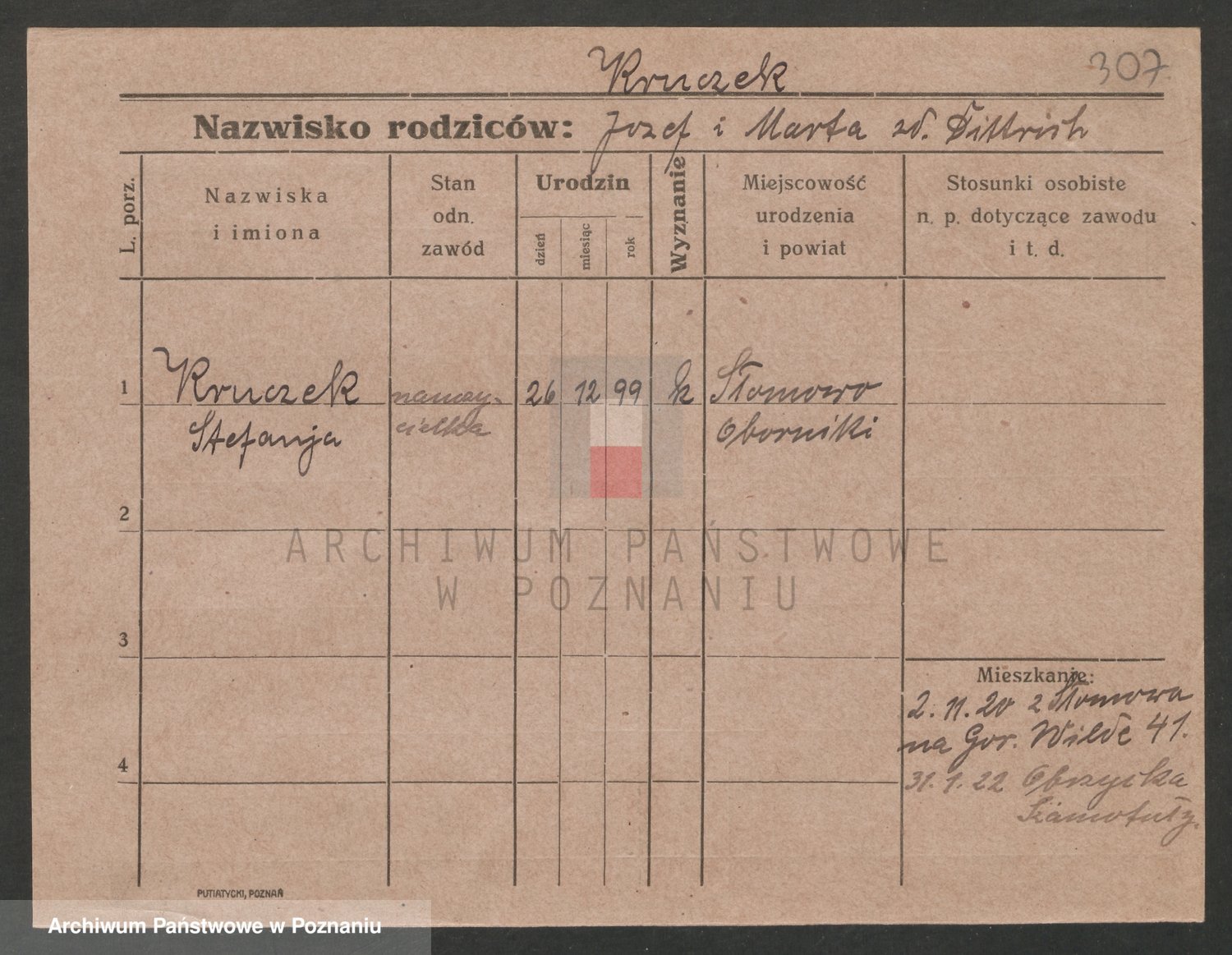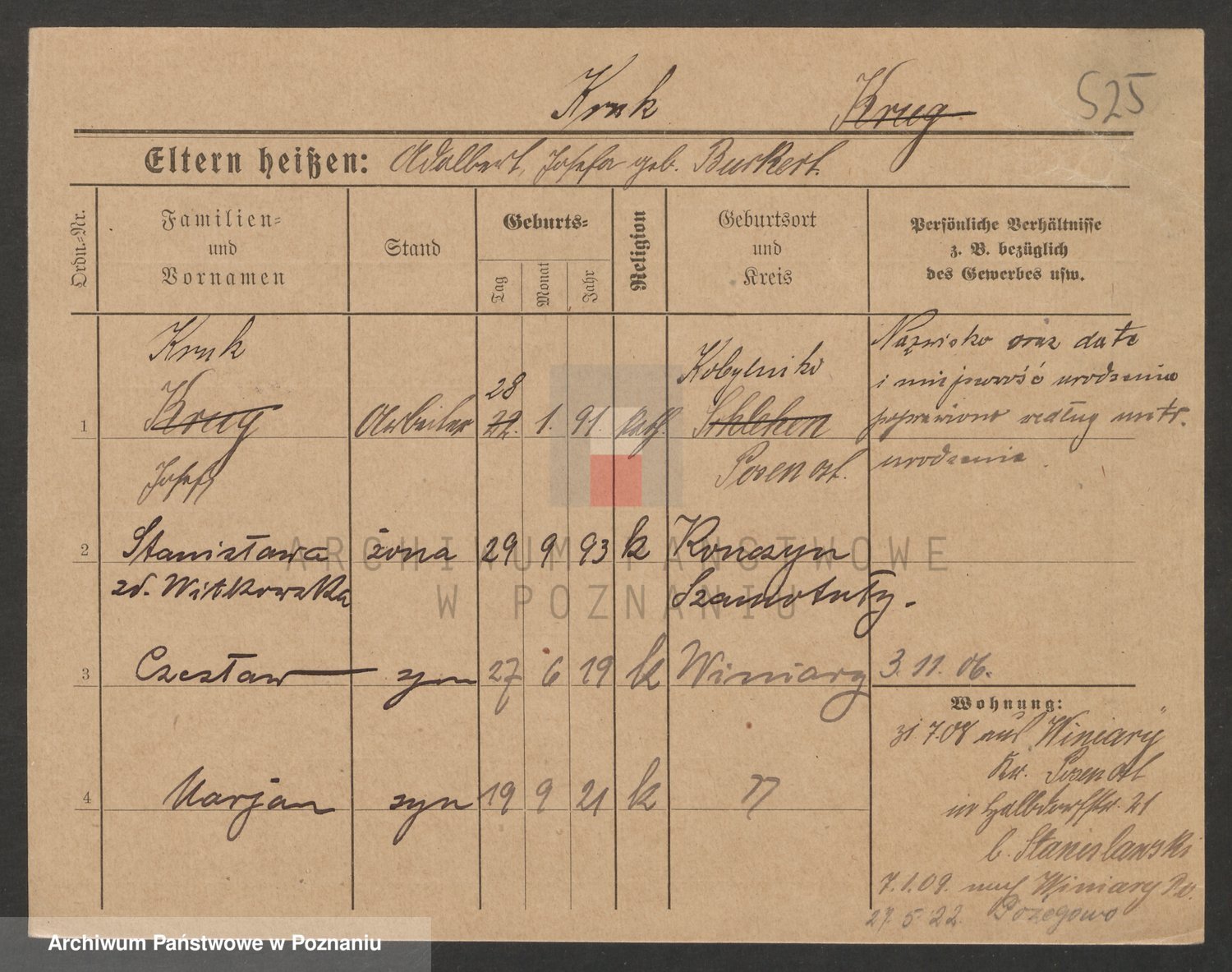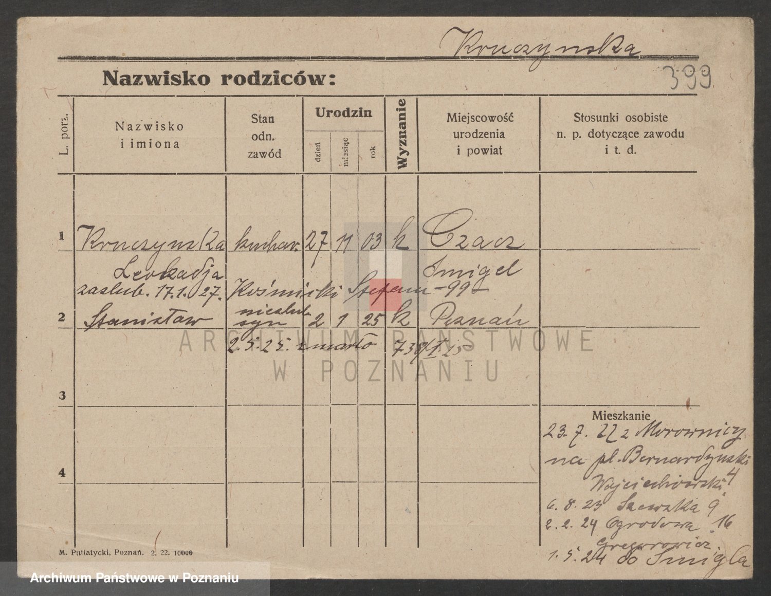 Podgląd karty osobowej dostępny jest po kliknięciu na nazwisko lub ikonkę karty. Można dokonywać powiększenia (ikony na górze) lub przechodzić między kolejnymi skanami (strzałki po bokach).