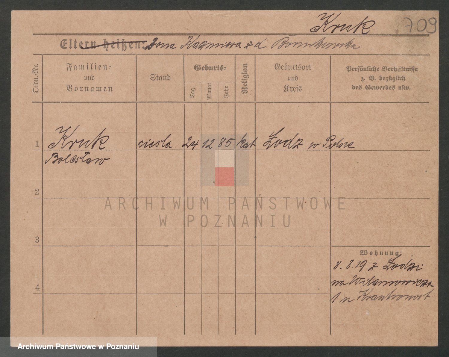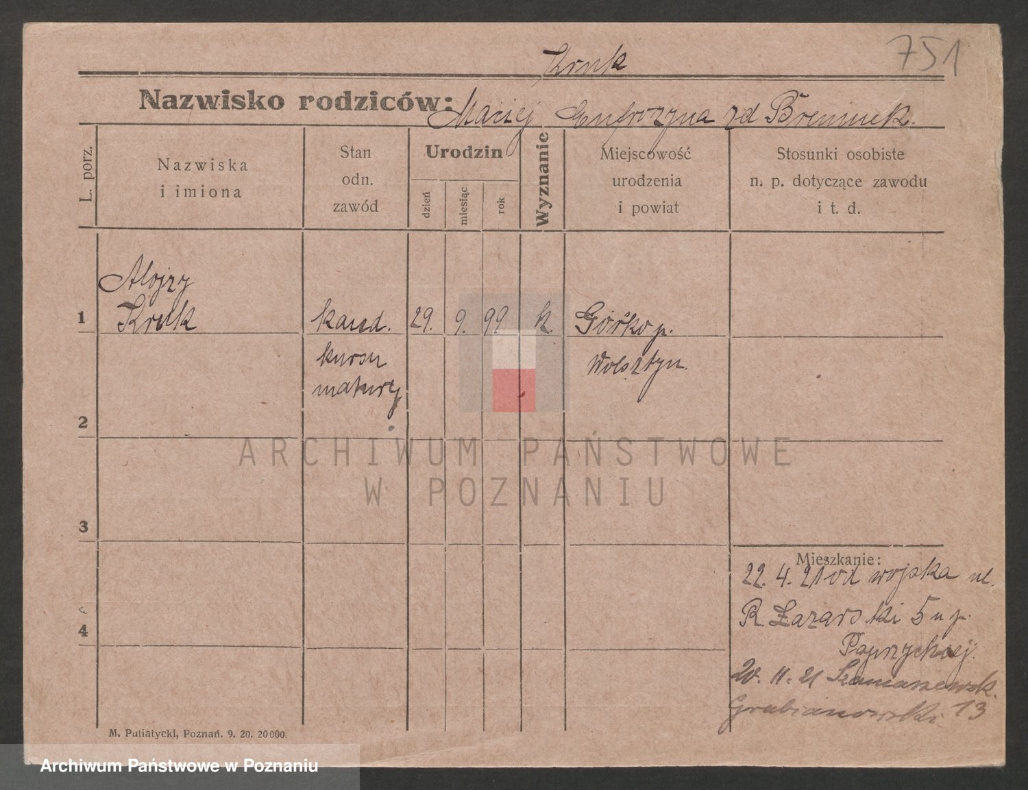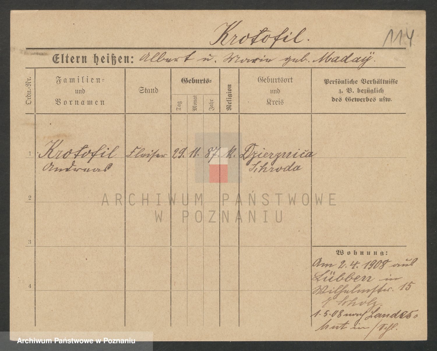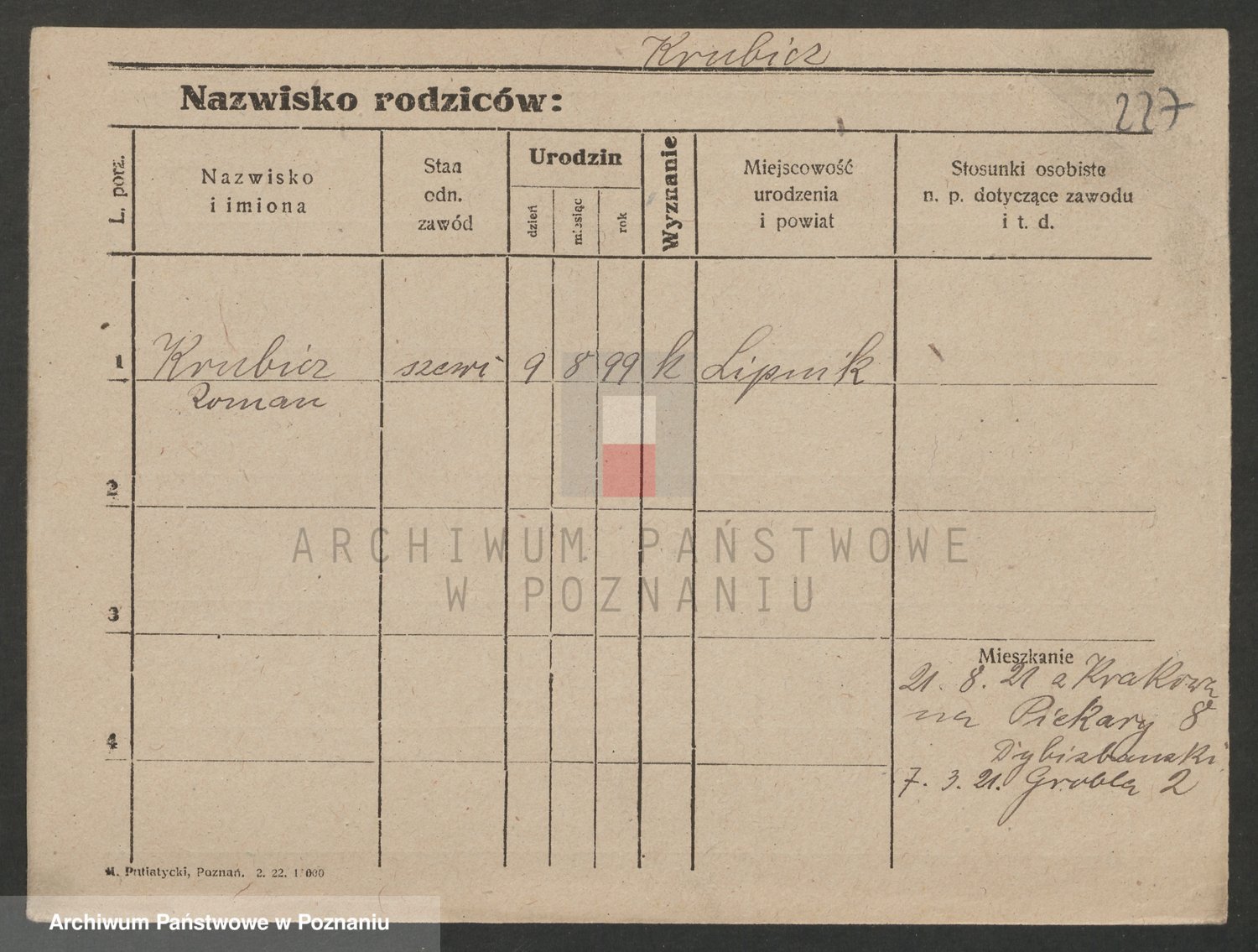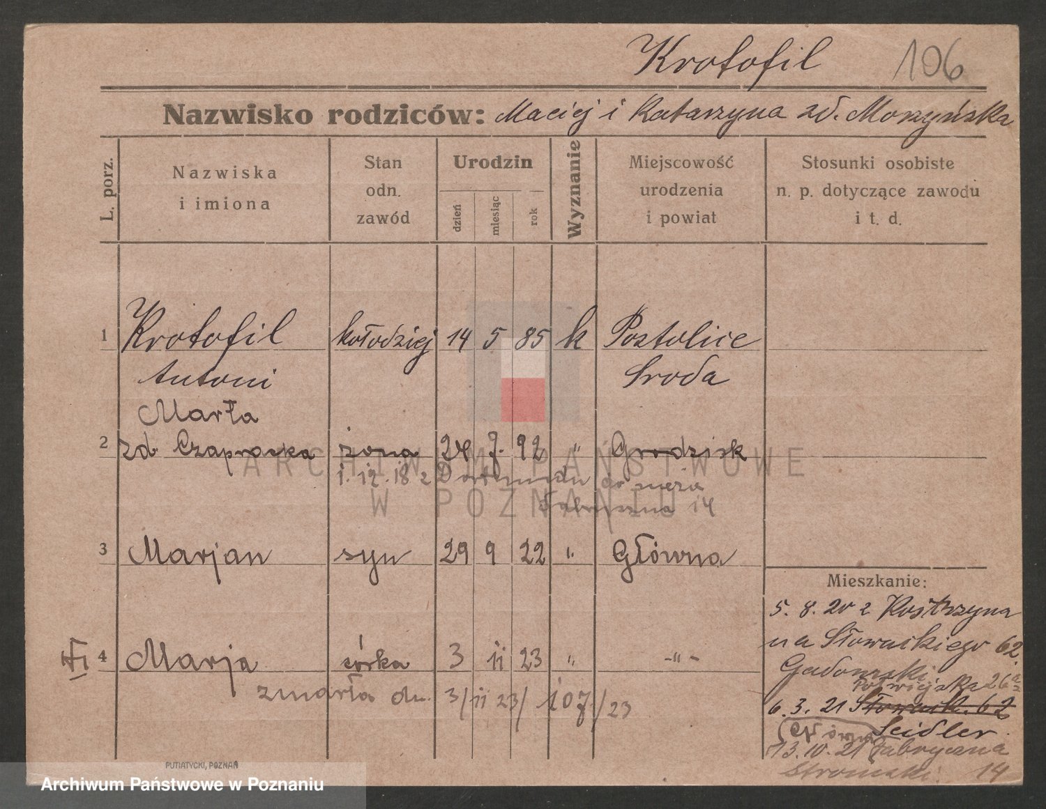 Podgląd karty osobowej dostępny jest po kliknięciu na nazwisko lub ikonkę karty. Można dokonywać powiększenia (ikony na górze) lub przechodzić między kolejnymi skanami (strzałki po bokach).