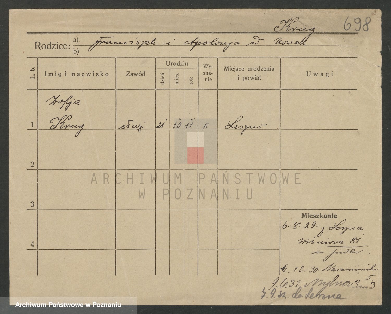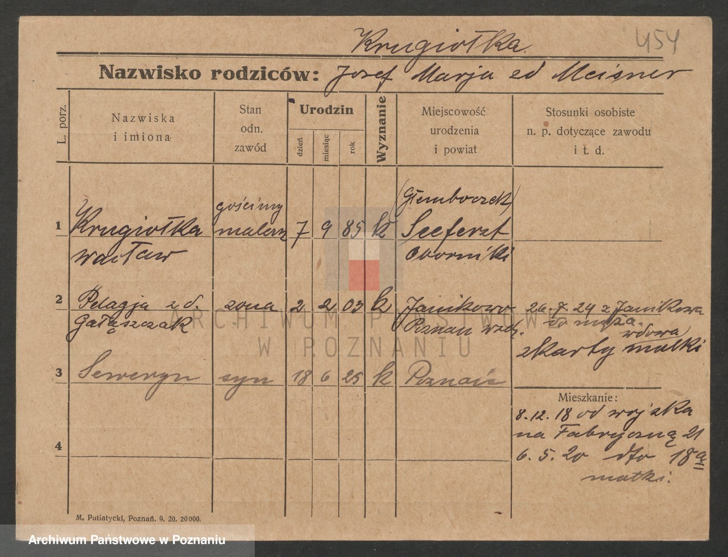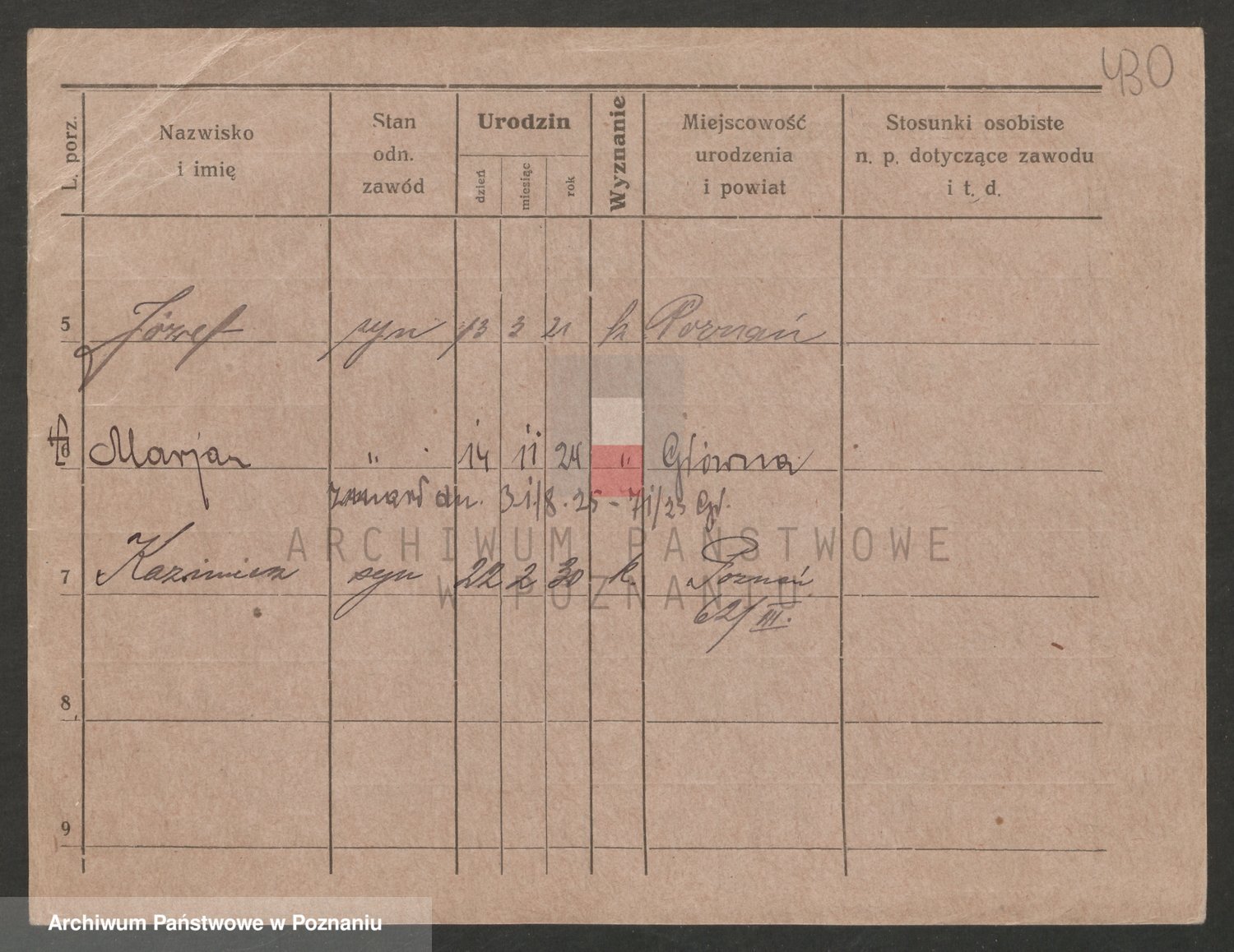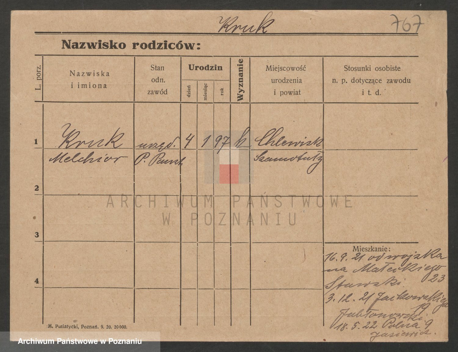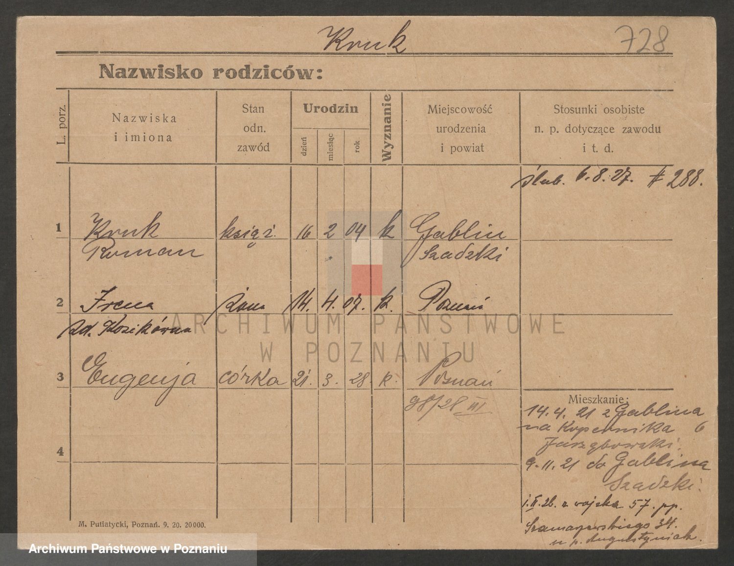 Podgląd karty osobowej dostępny jest po kliknięciu na nazwisko lub ikonkę karty. Można dokonywać powiększenia (ikony na górze) lub przechodzić między kolejnymi skanami (strzałki po bokach).