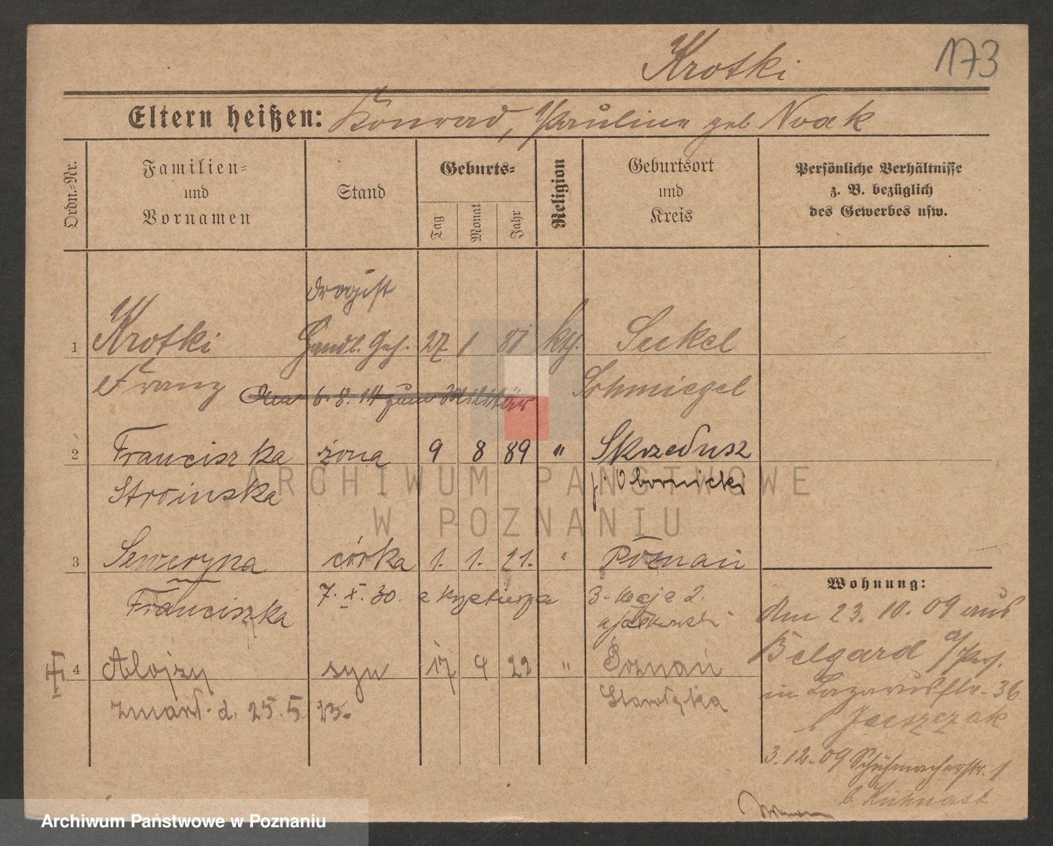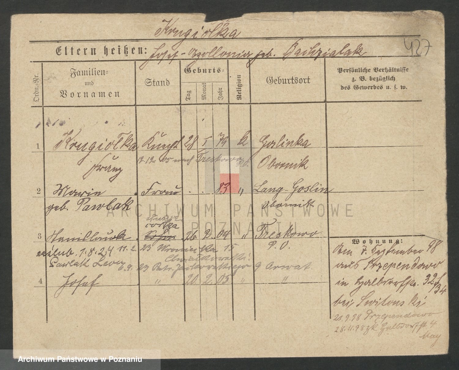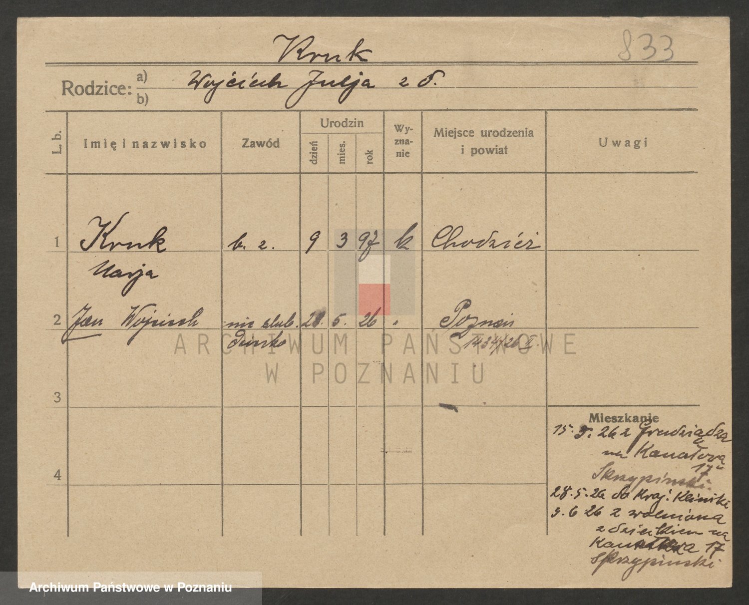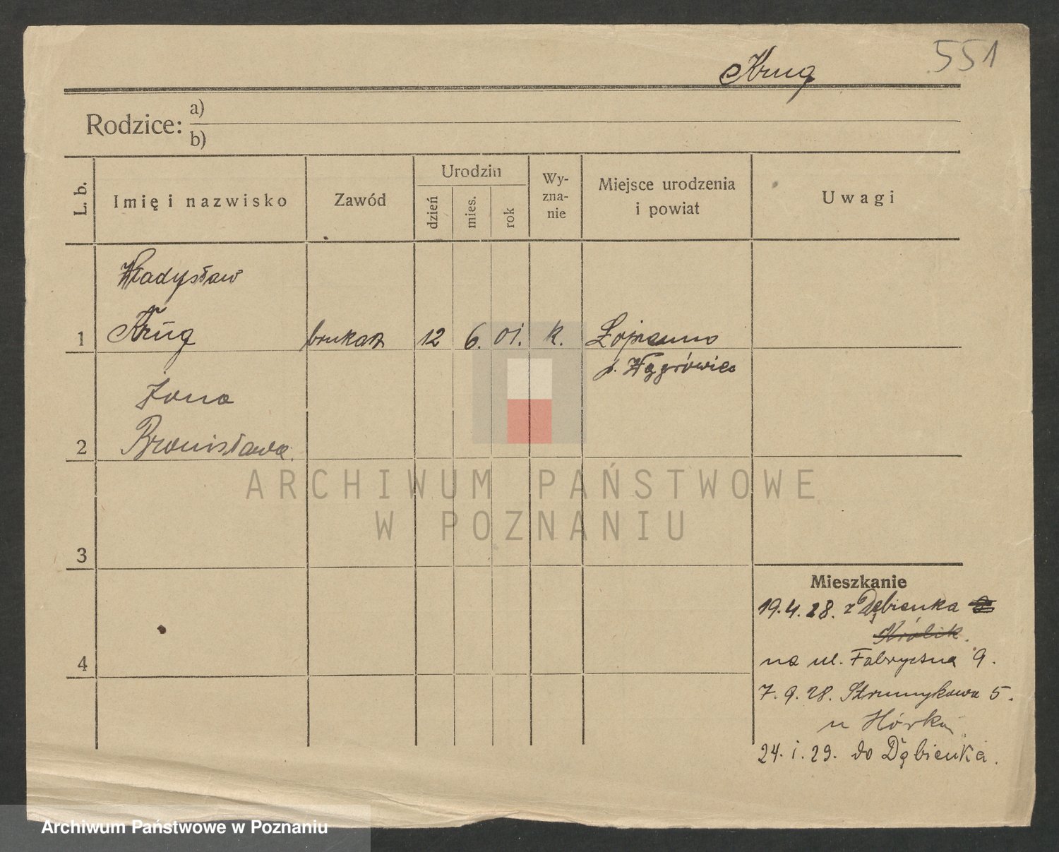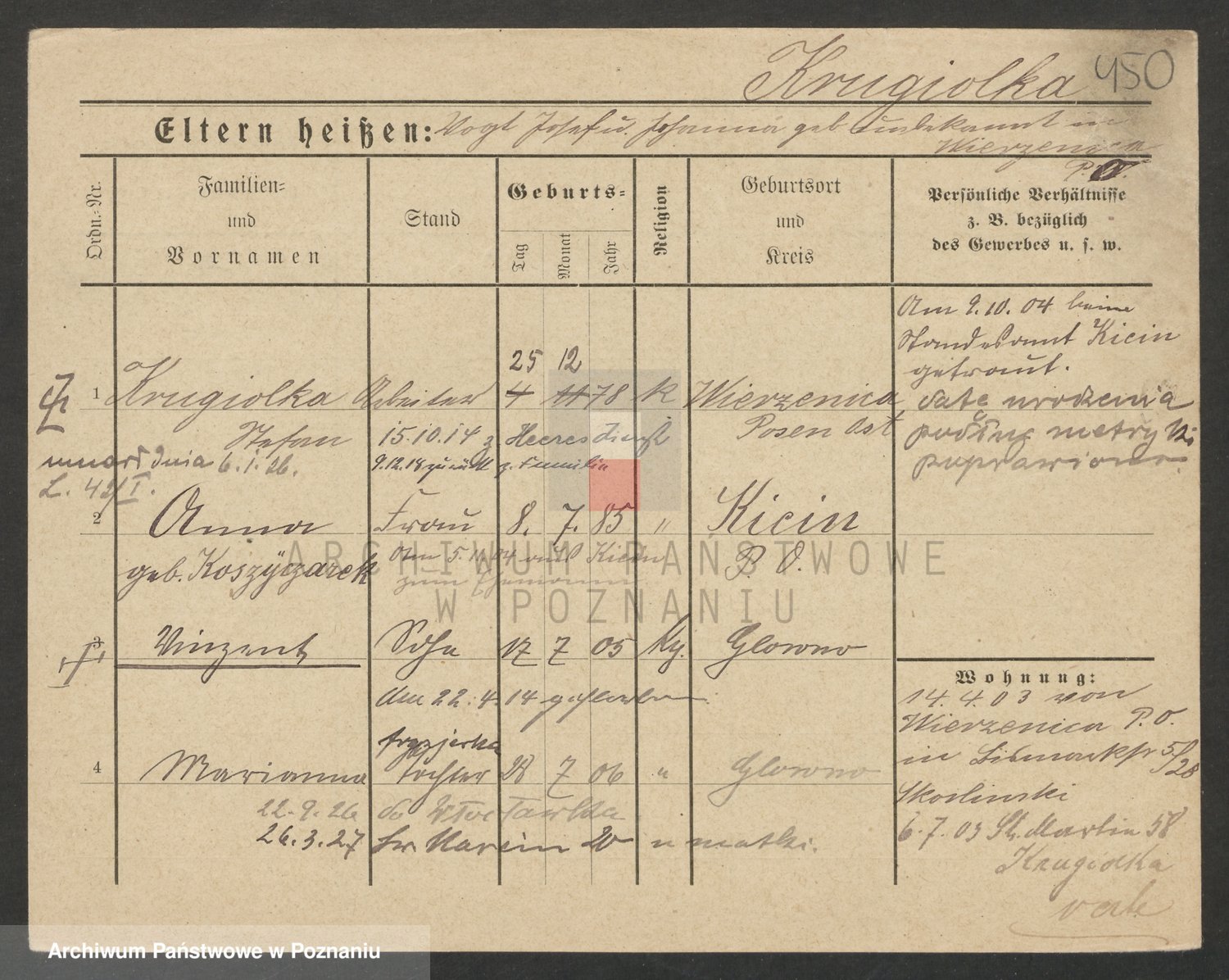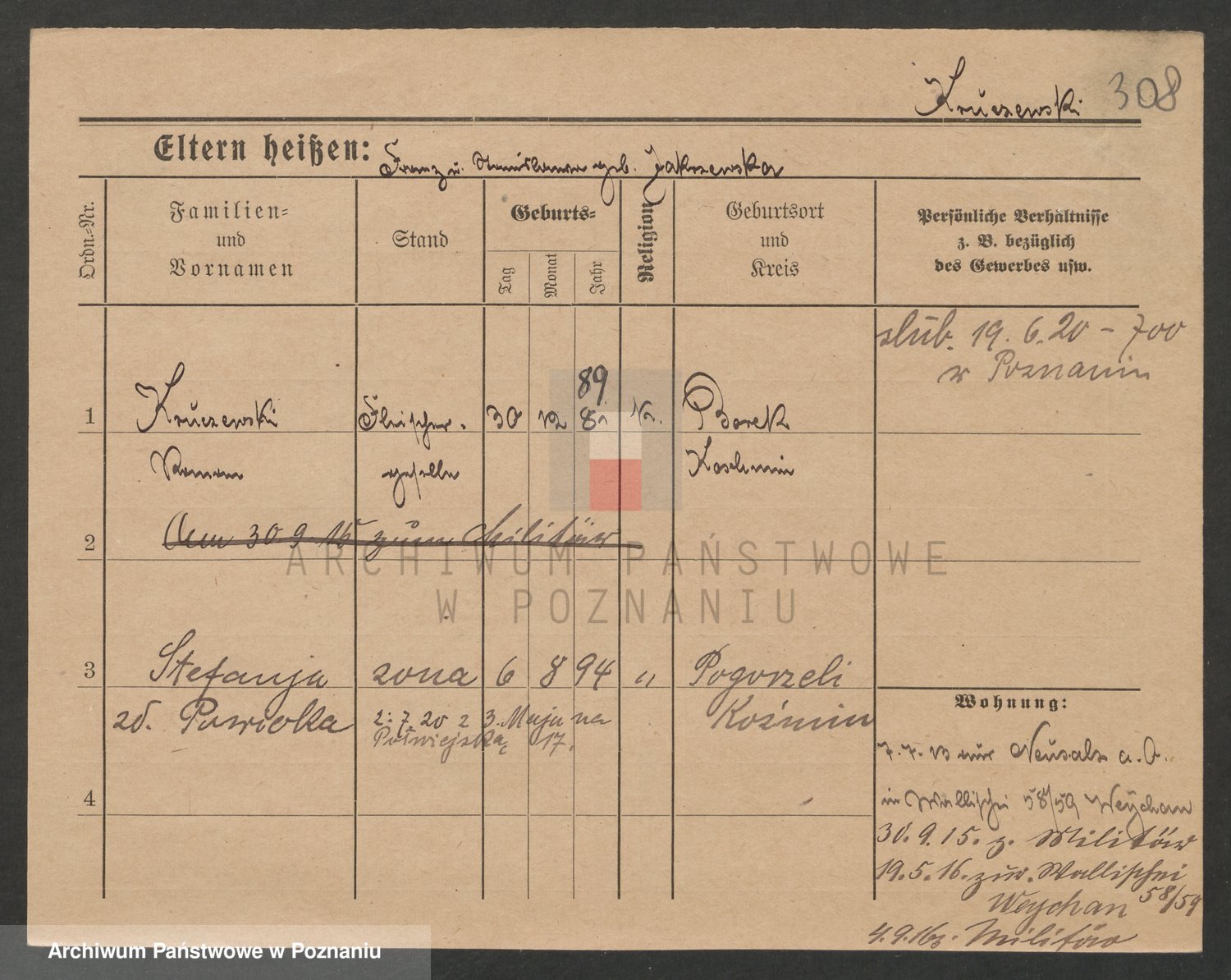 Podgląd karty osobowej dostępny jest po kliknięciu na nazwisko lub ikonkę karty. Można dokonywać powiększenia (ikony na górze) lub przechodzić między kolejnymi skanami (strzałki po bokach).