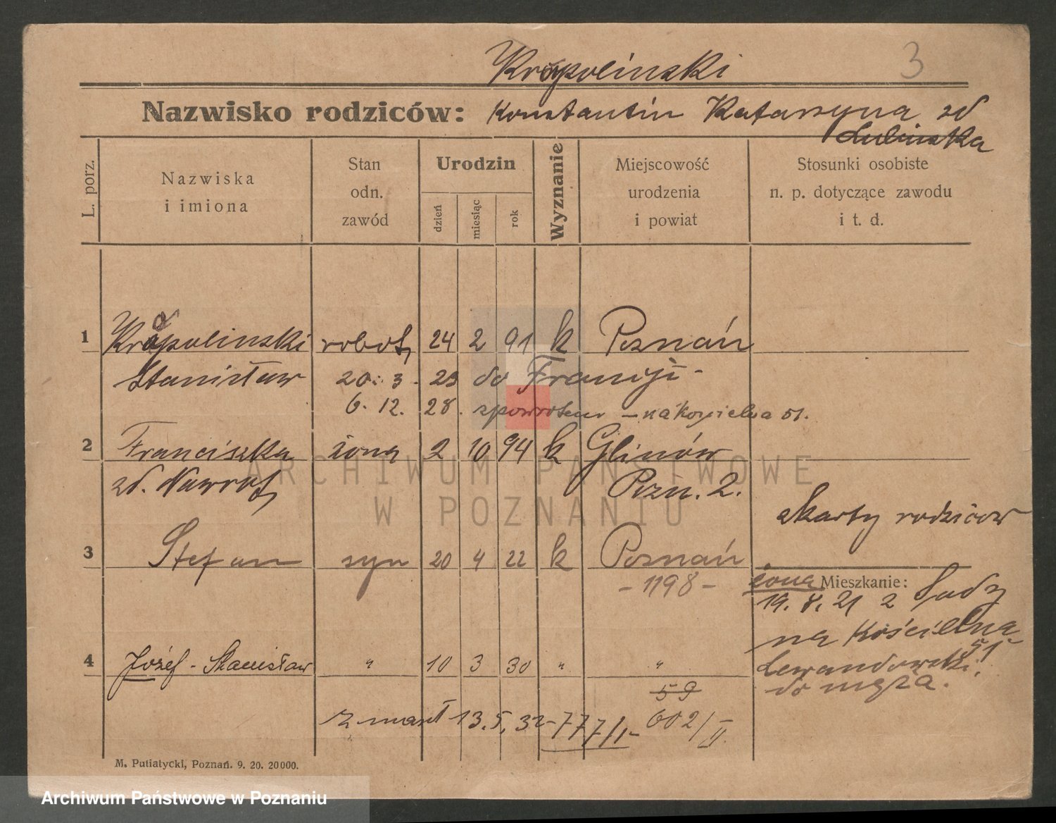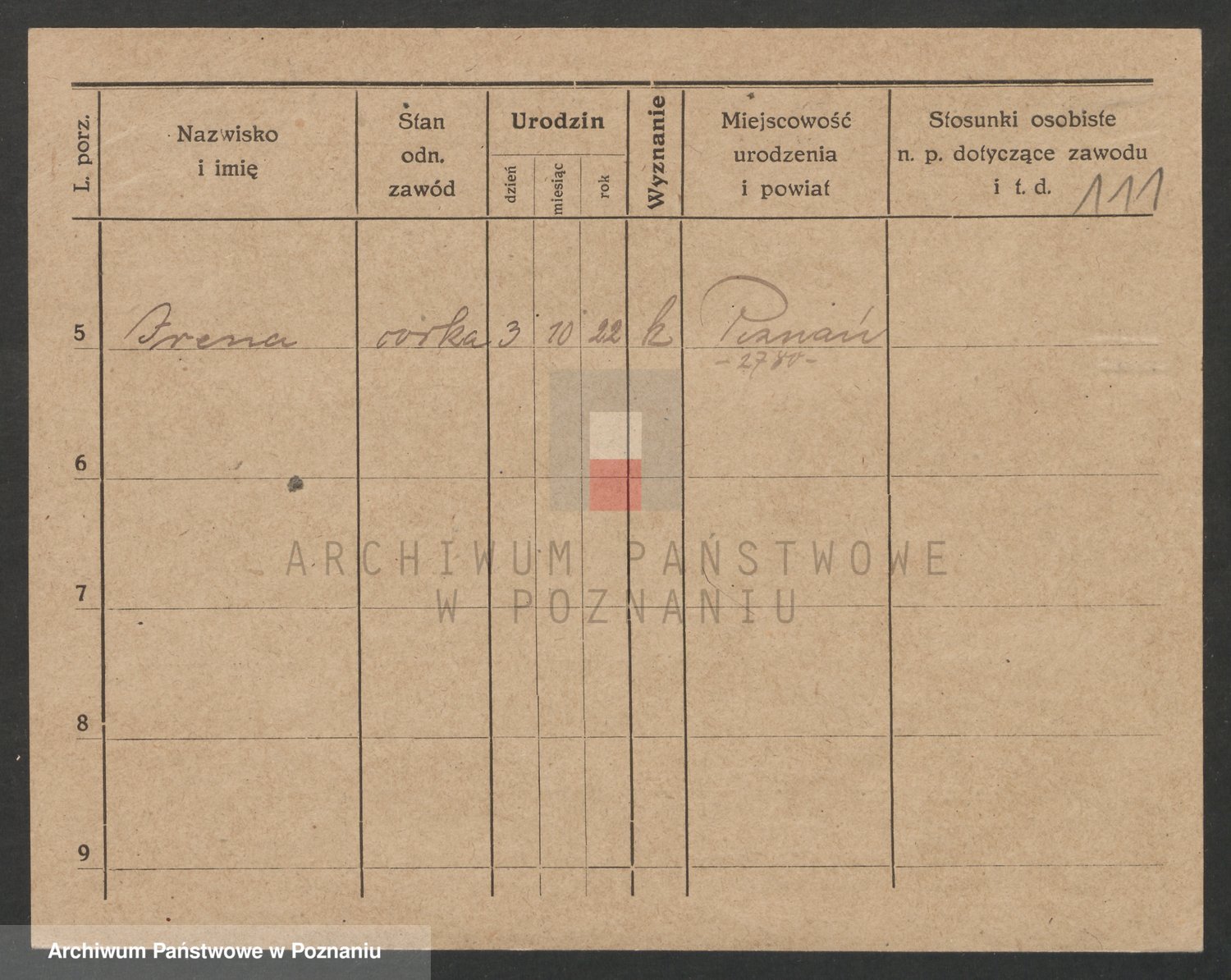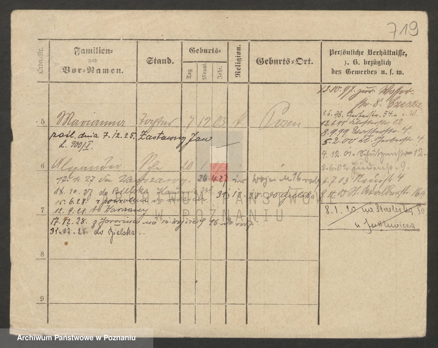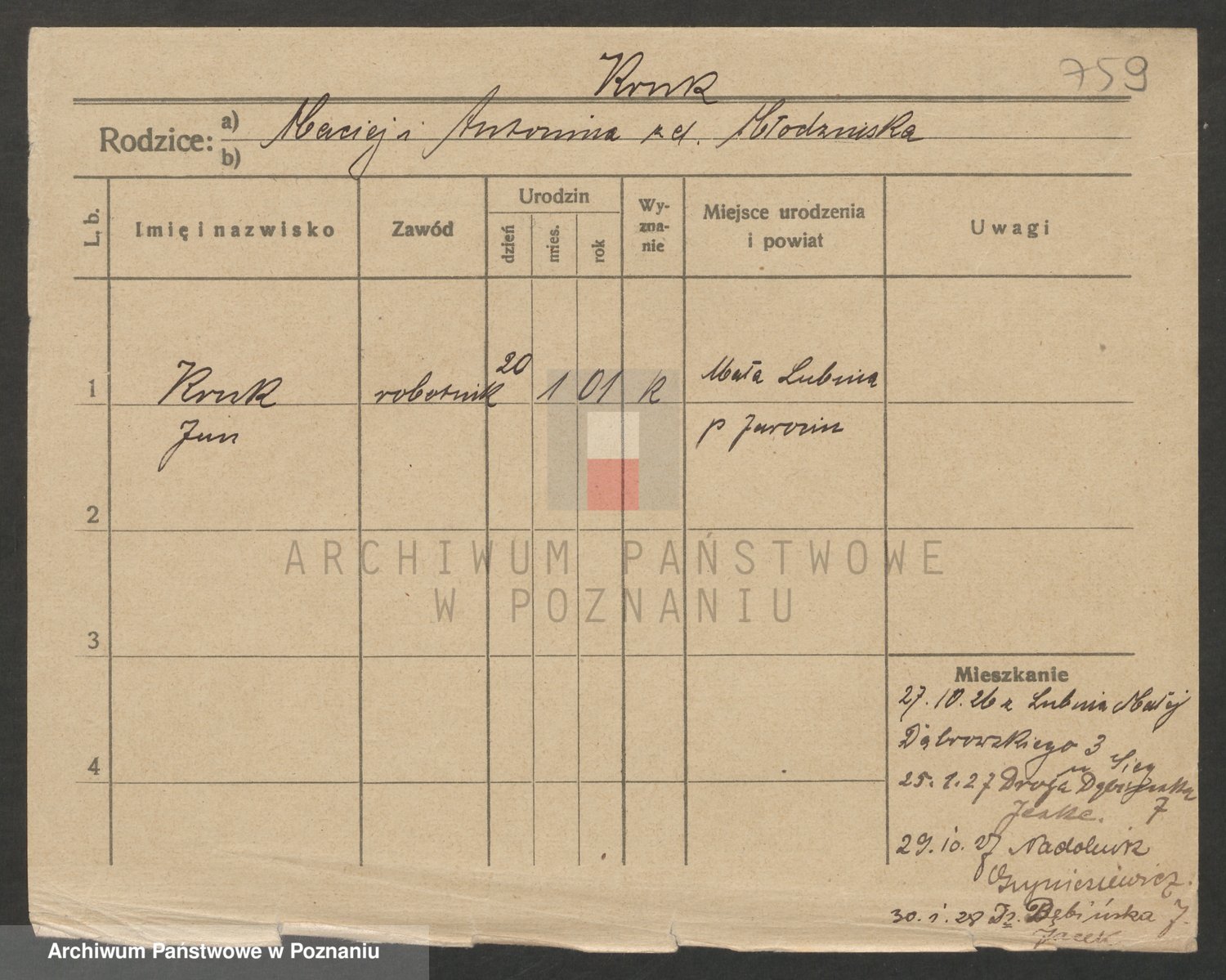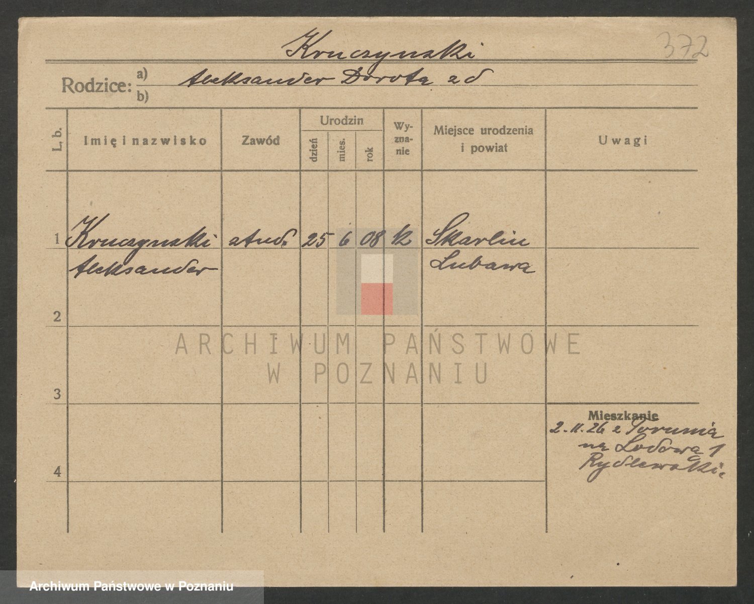 Podgląd karty osobowej dostępny jest po kliknięciu na nazwisko lub ikonkę karty. Można dokonywać powiększenia (ikony na górze) lub przechodzić między kolejnymi skanami (strzałki po bokach).