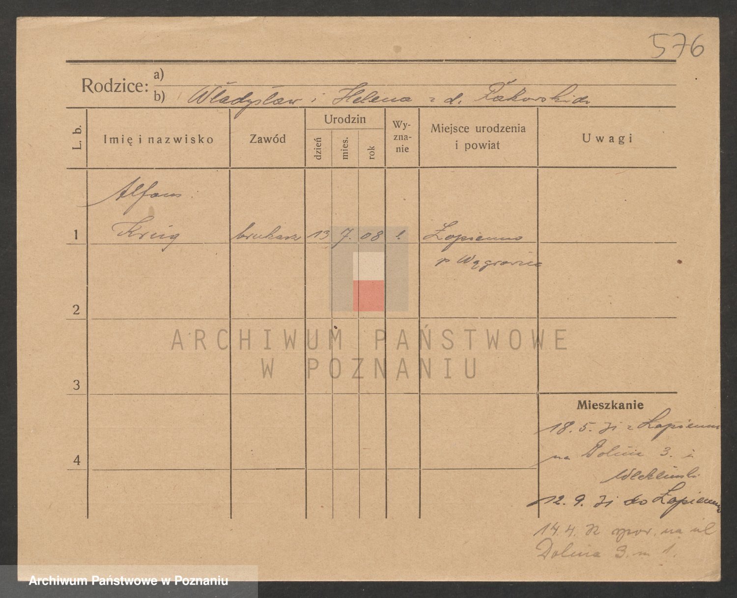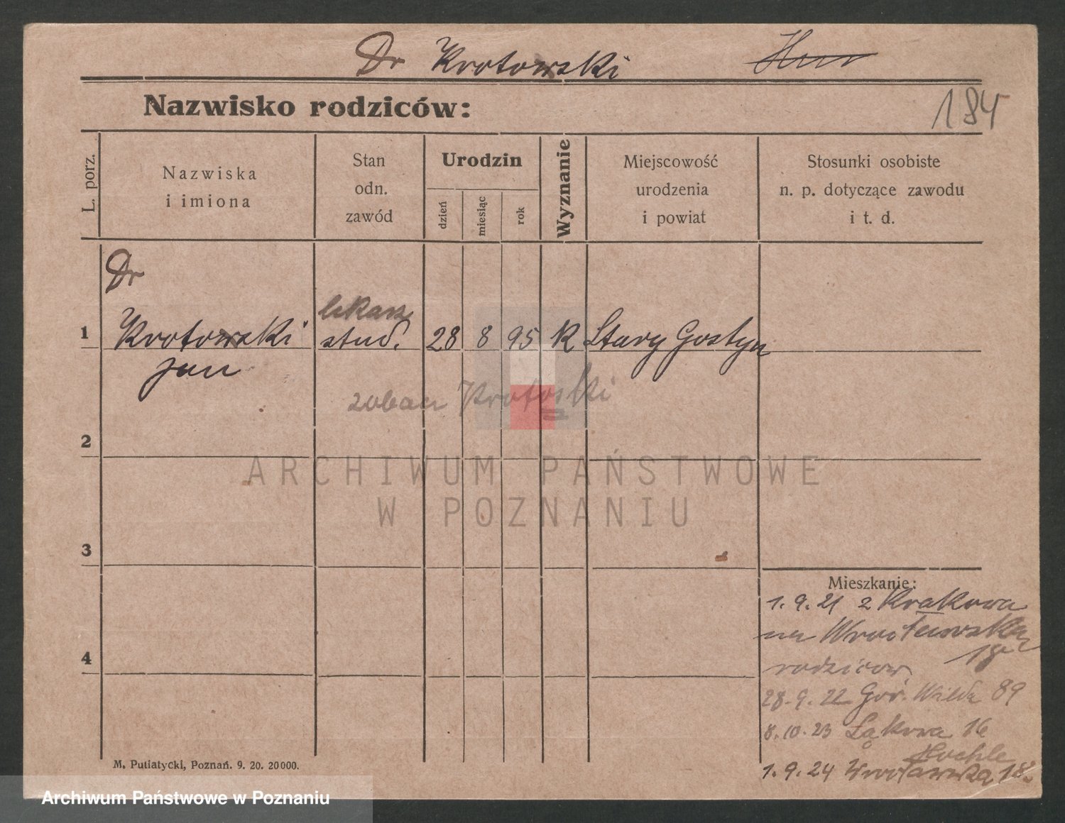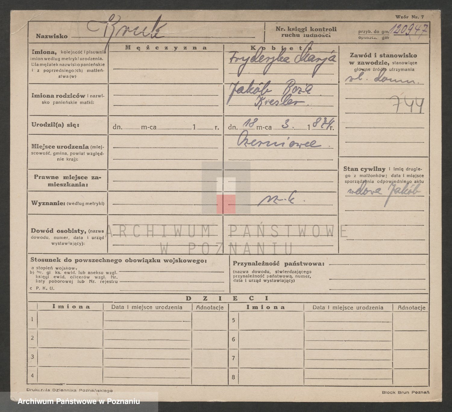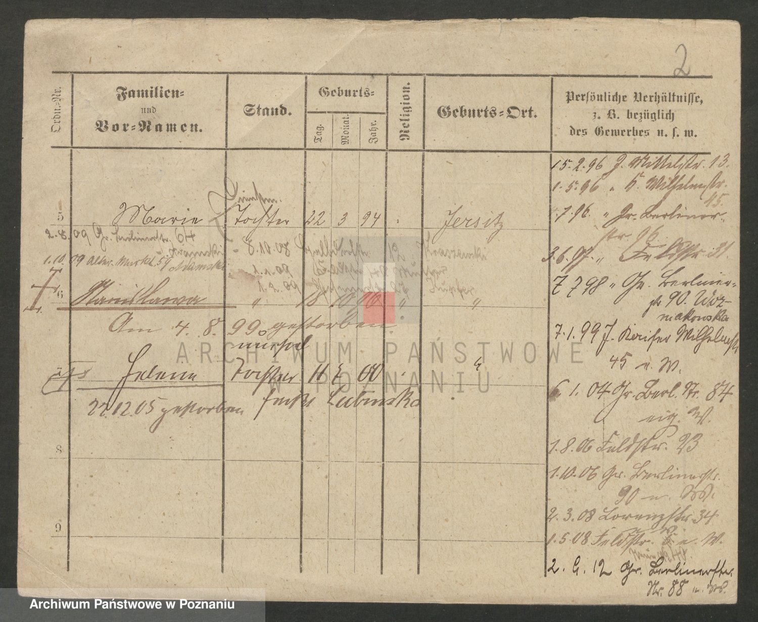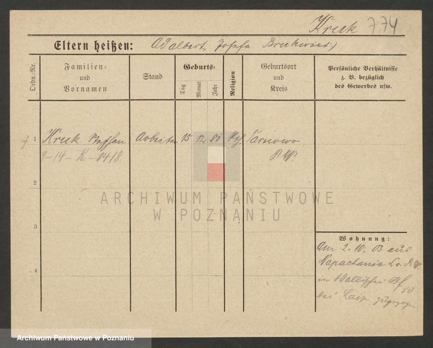 Podgląd karty osobowej dostępny jest po kliknięciu na nazwisko lub ikonkę karty. Można dokonywać powiększenia (ikony na górze) lub przechodzić między kolejnymi skanami (strzałki po bokach).