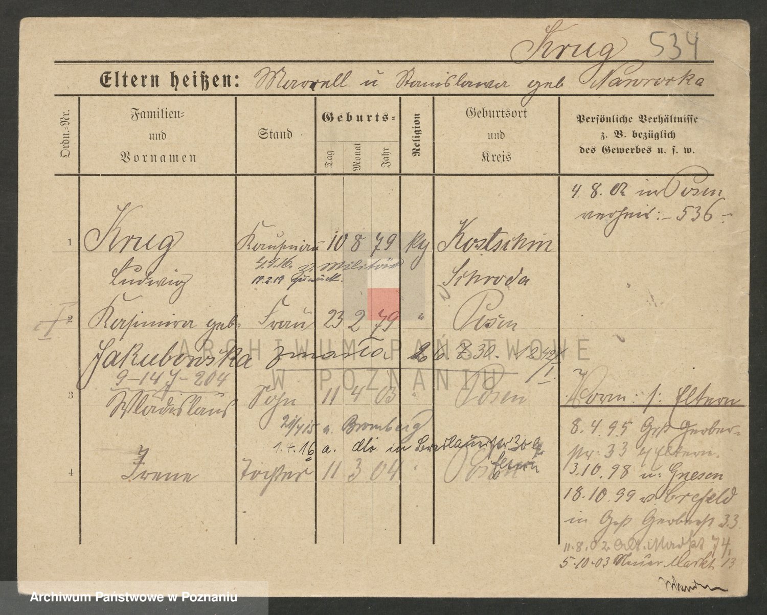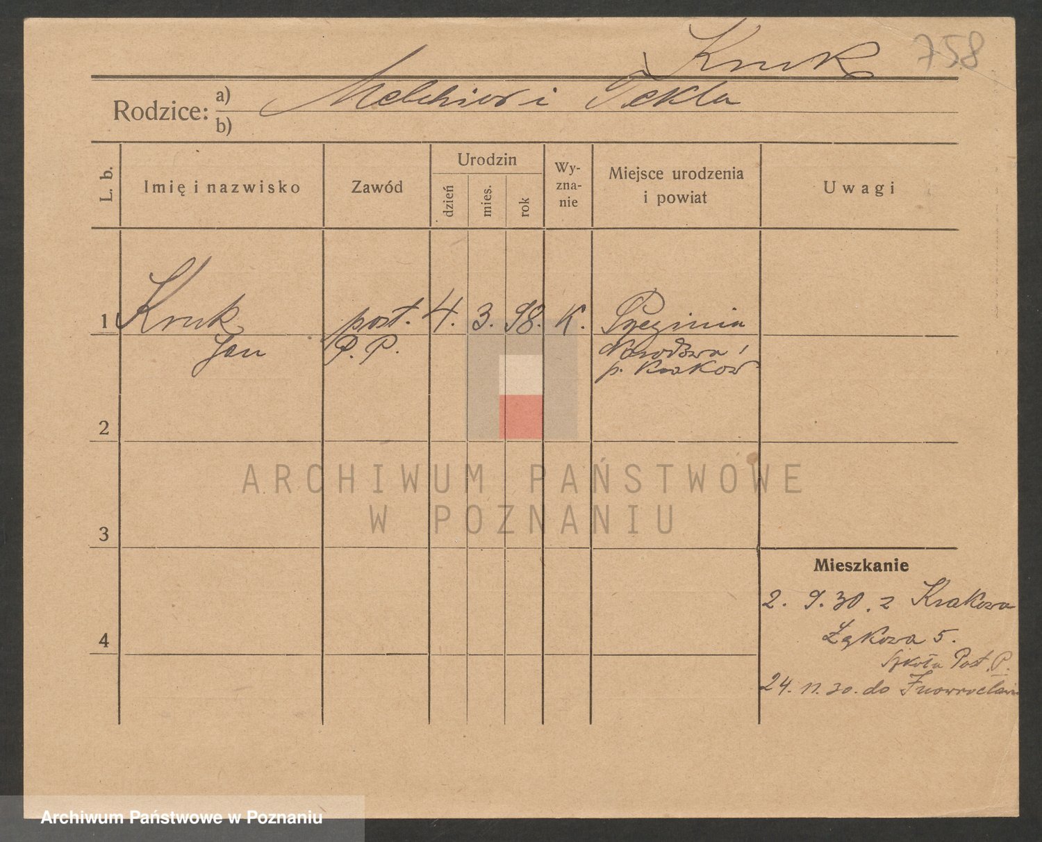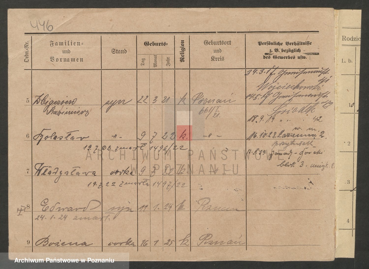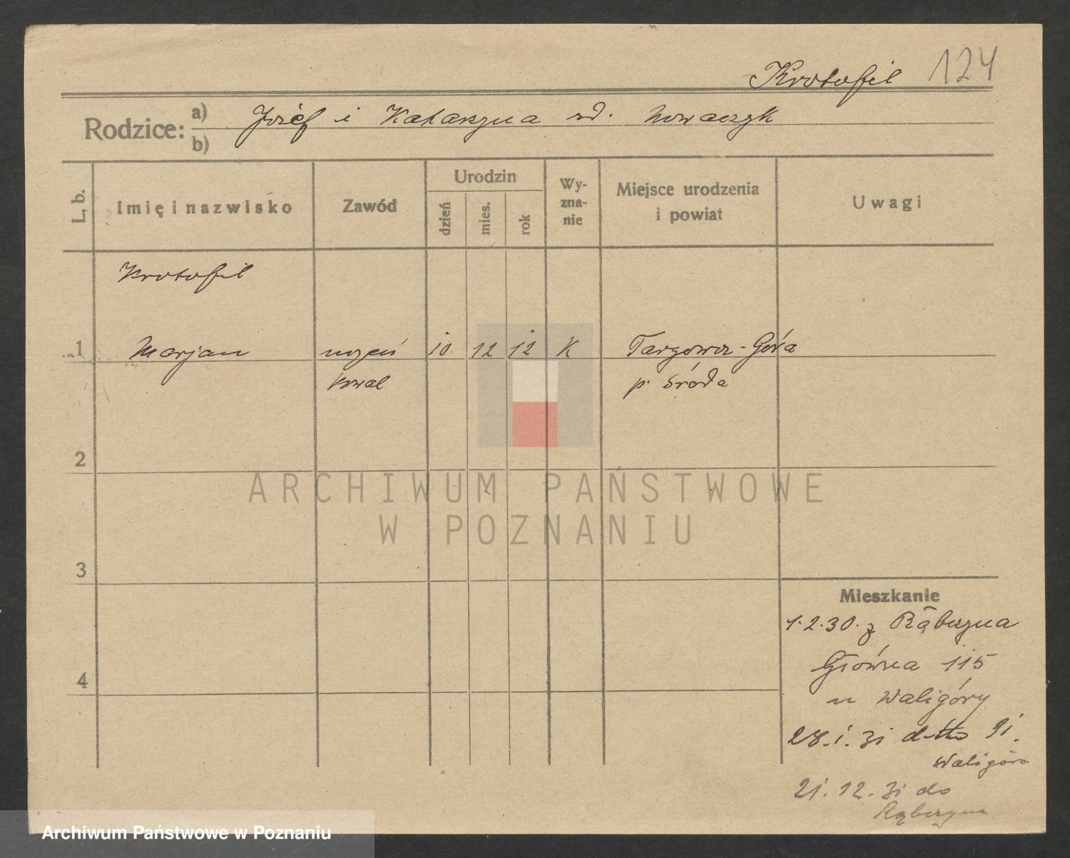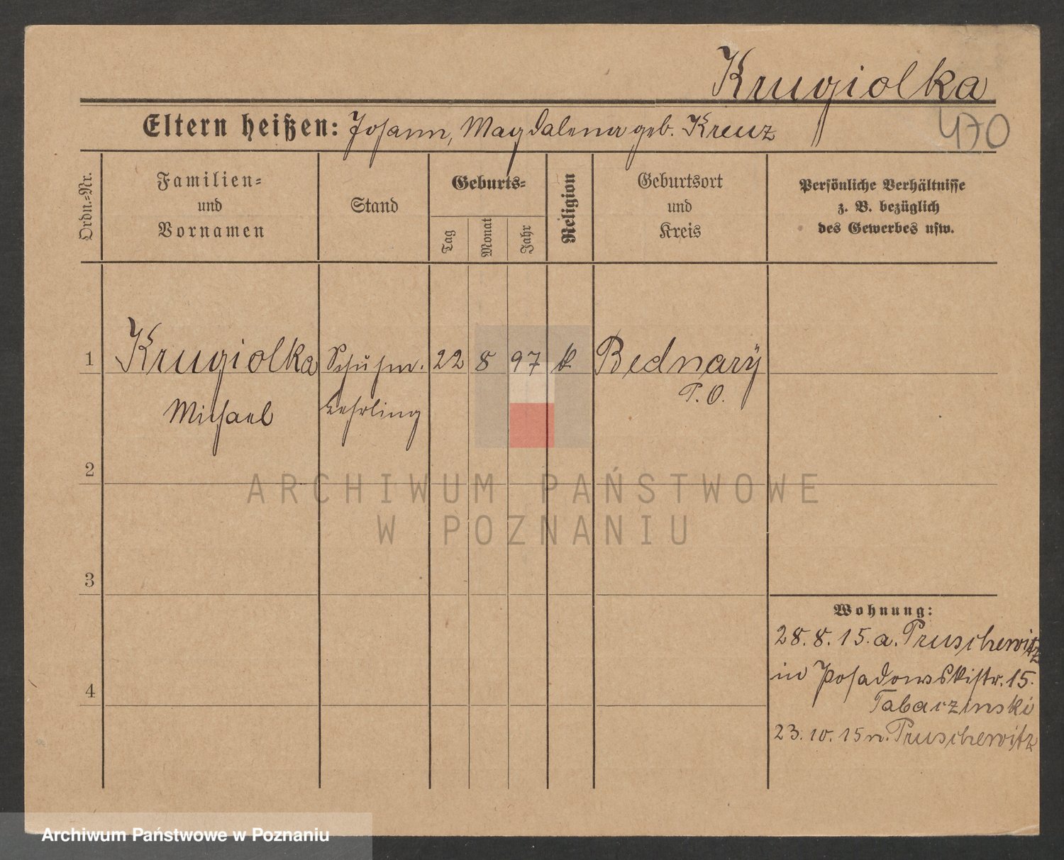 Podgląd karty osobowej dostępny jest po kliknięciu na nazwisko lub ikonkę karty. Można dokonywać powiększenia (ikony na górze) lub przechodzić między kolejnymi skanami (strzałki po bokach).