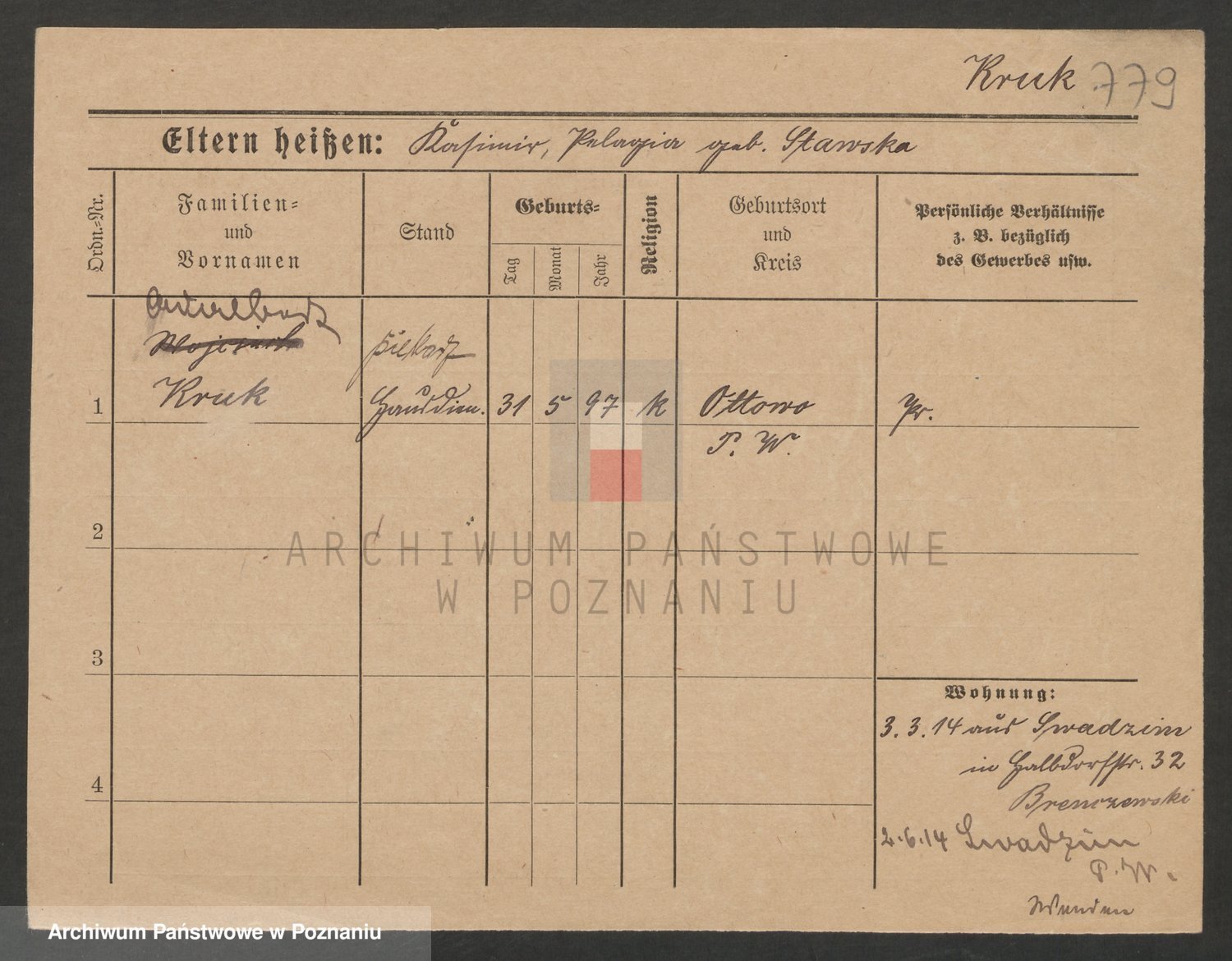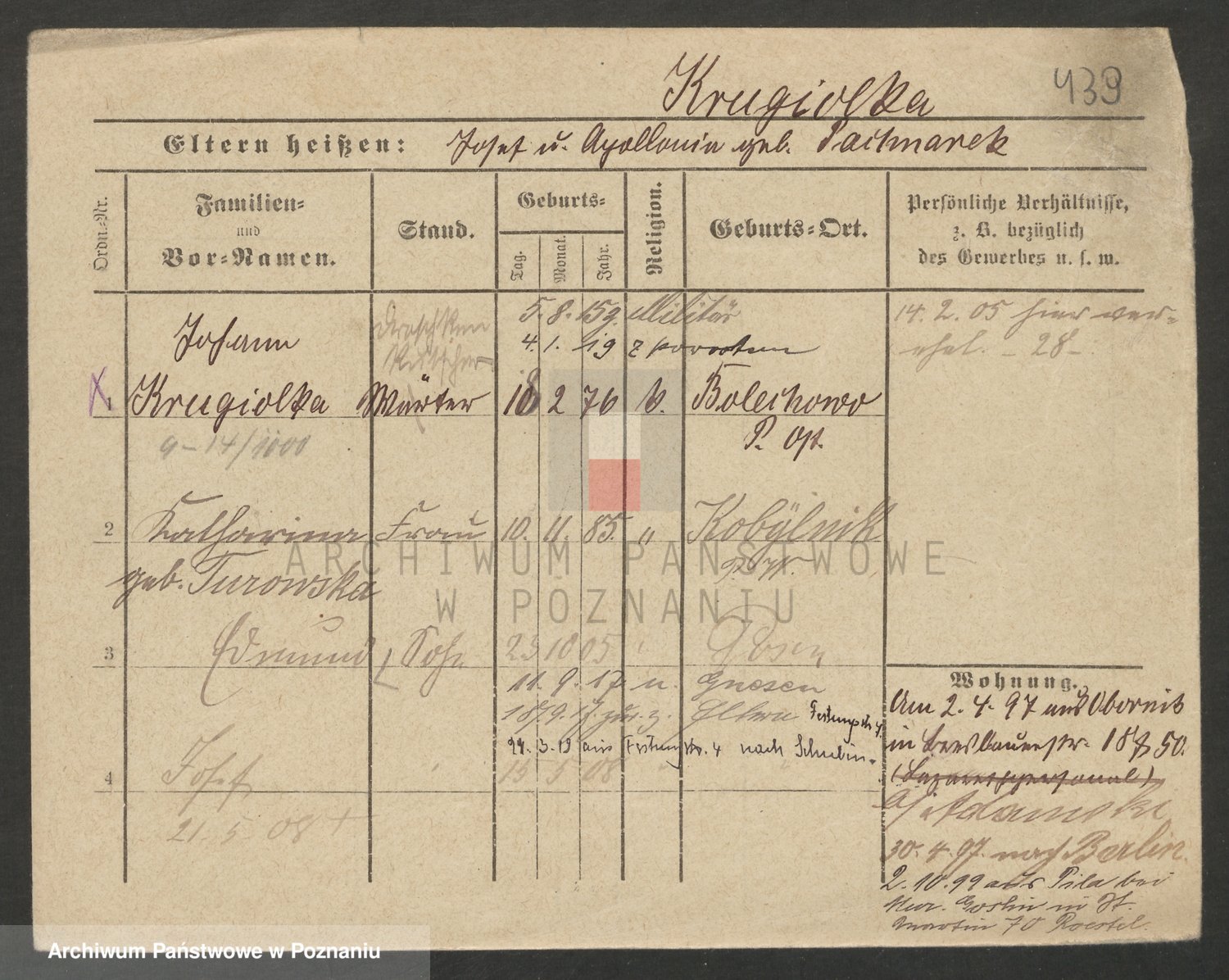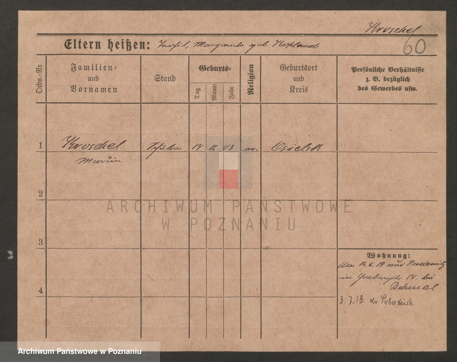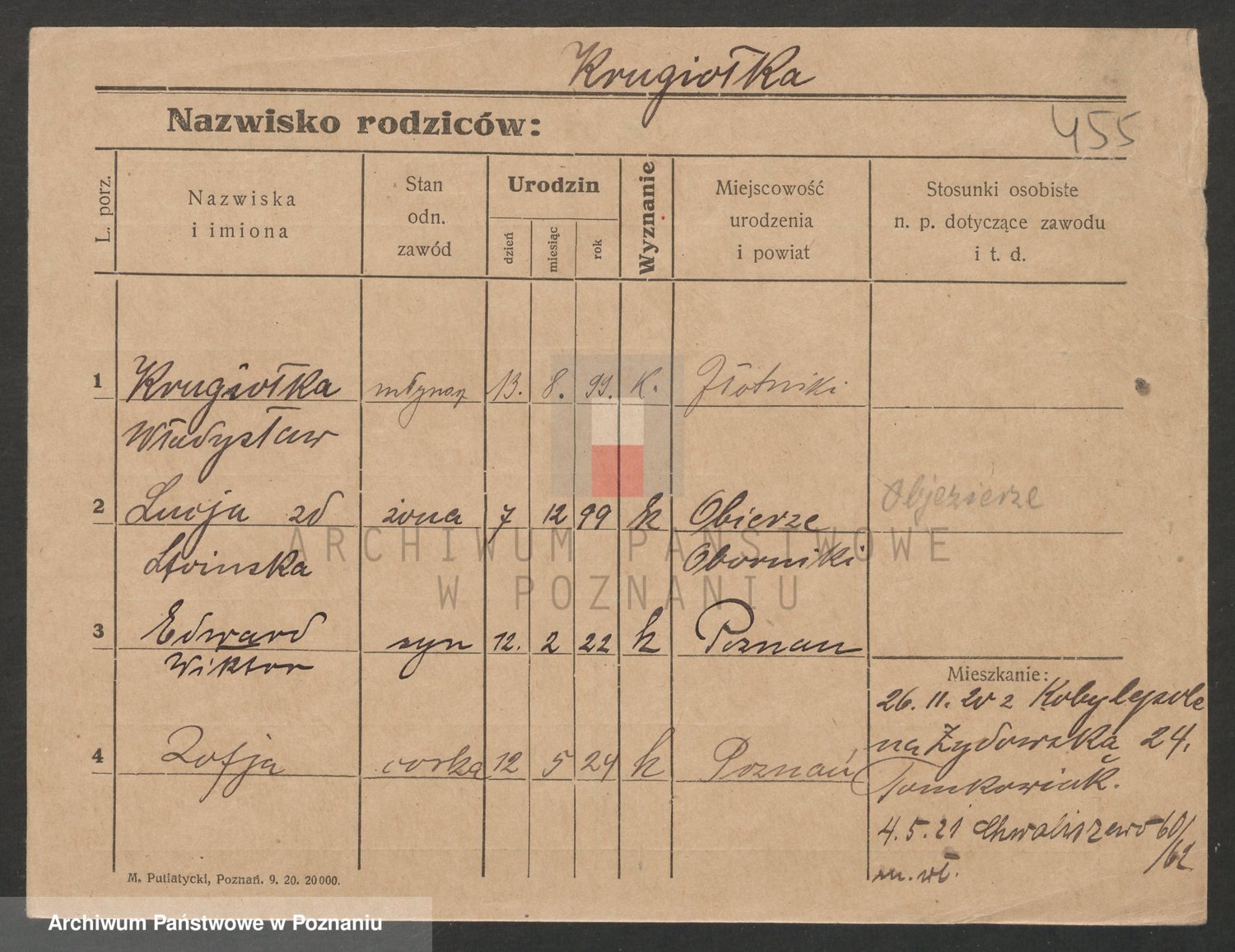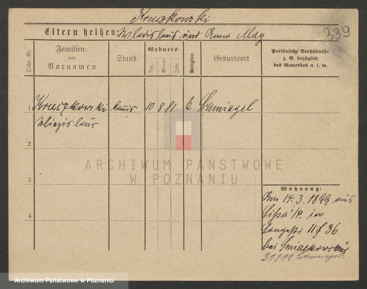 Podgląd karty osobowej dostępny jest po kliknięciu na nazwisko lub ikonkę karty. Można dokonywać powiększenia (ikony na górze) lub przechodzić między kolejnymi skanami (strzałki po bokach).