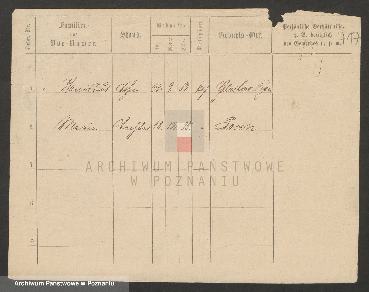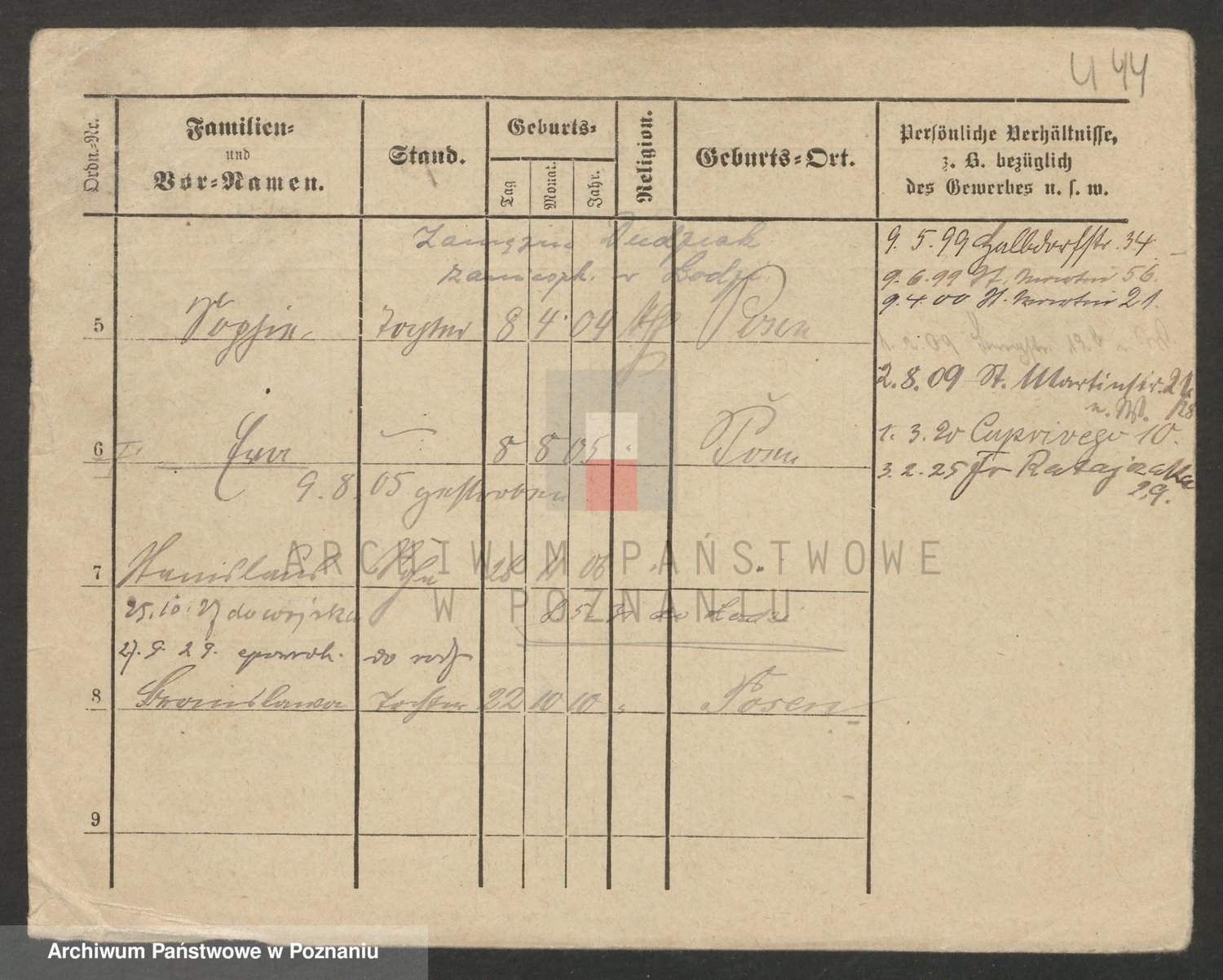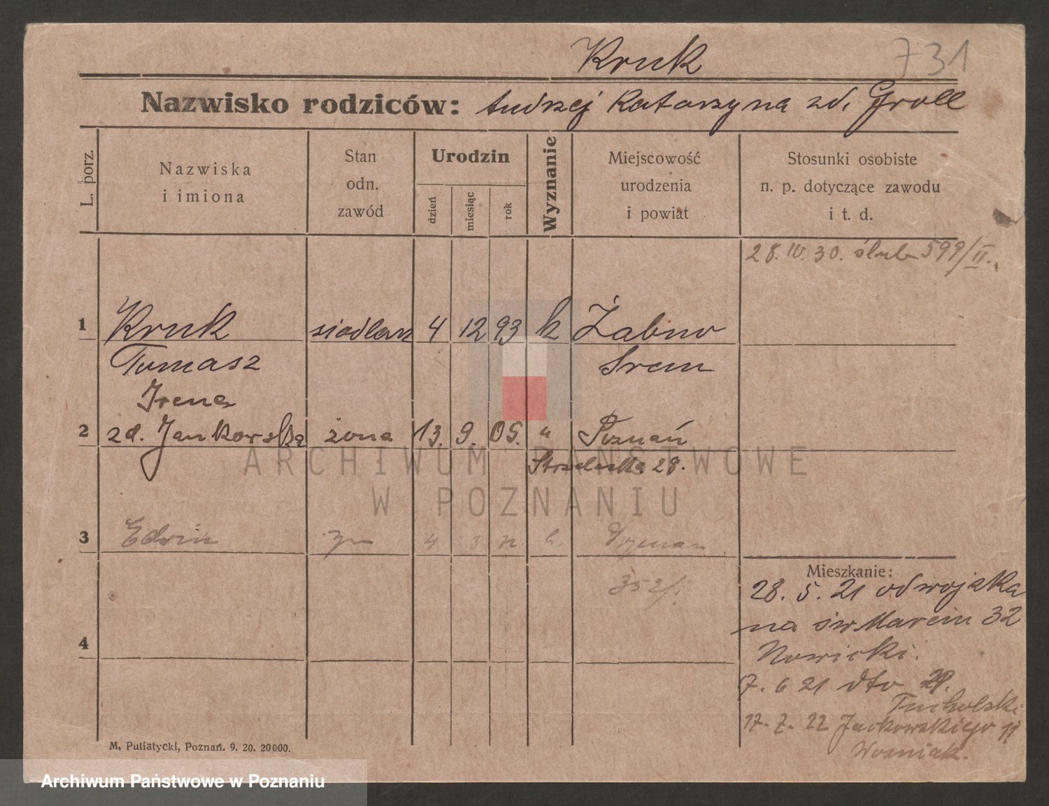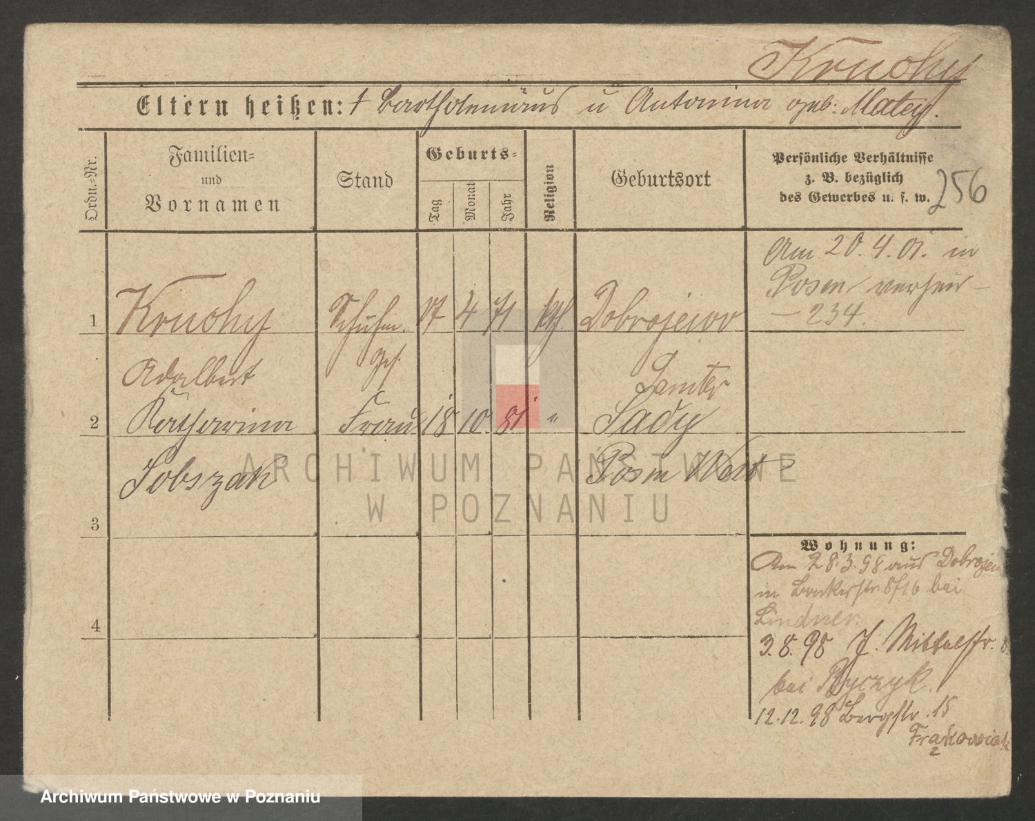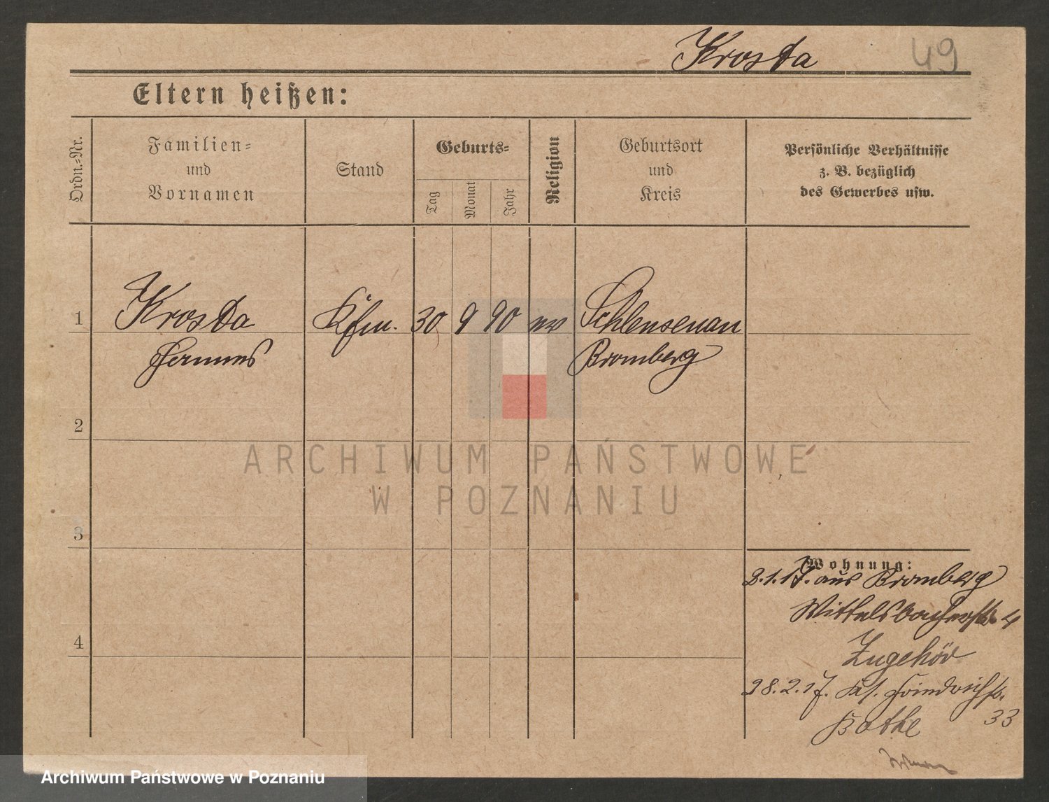 Podgląd karty osobowej dostępny jest po kliknięciu na nazwisko lub ikonkę karty. Można dokonywać powiększenia (ikony na górze) lub przechodzić między kolejnymi skanami (strzałki po bokach).