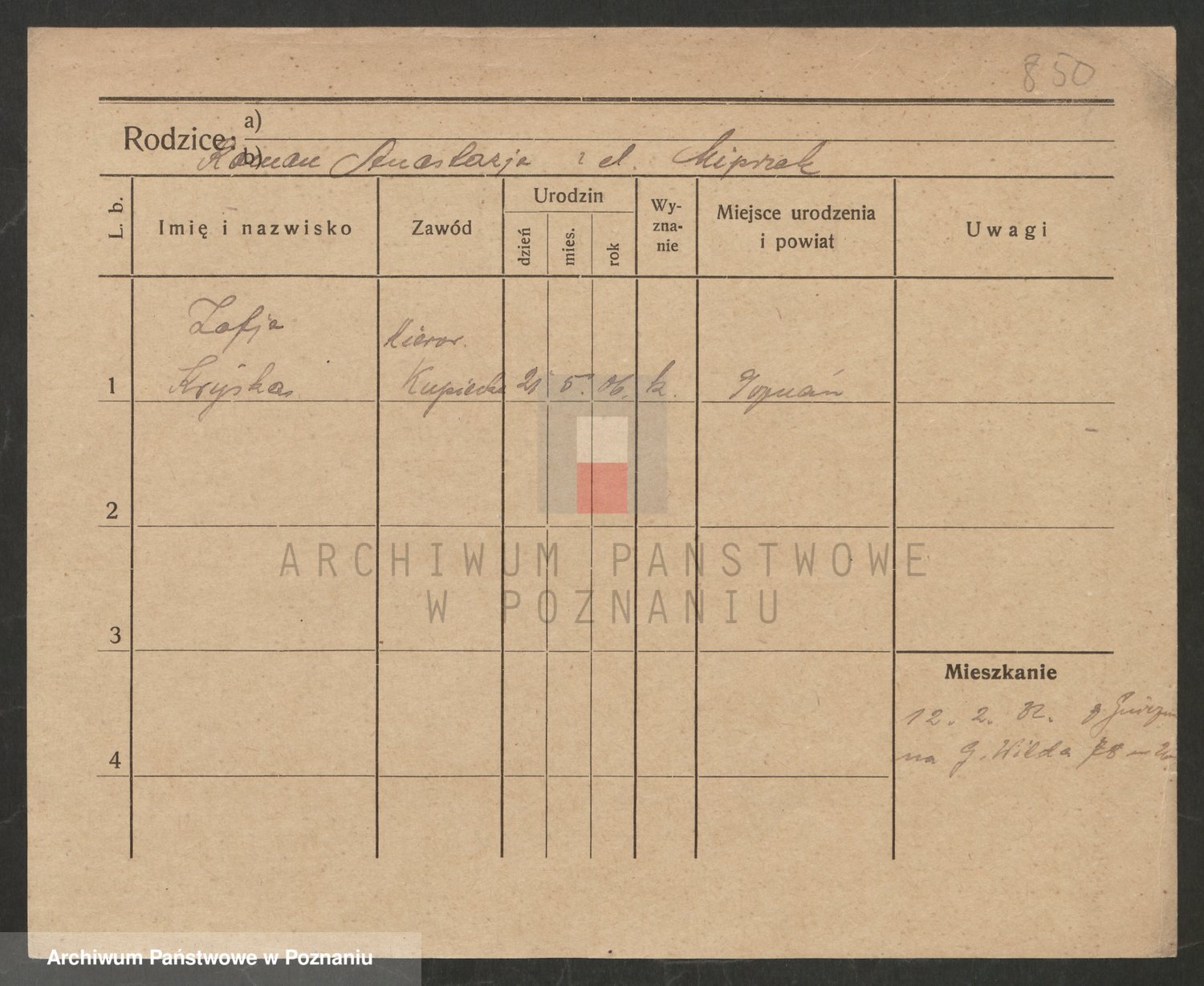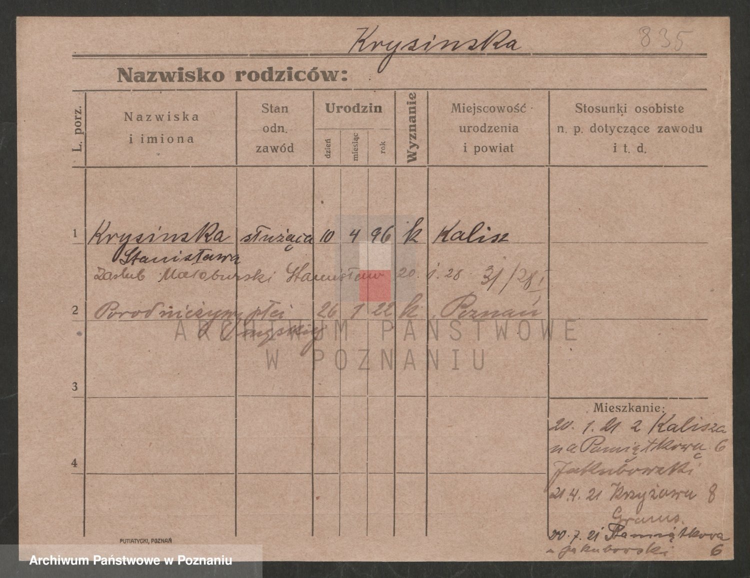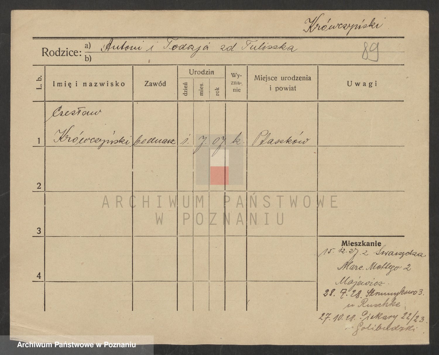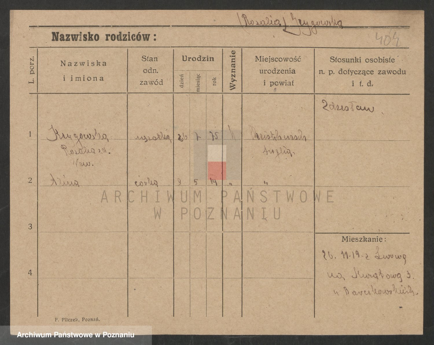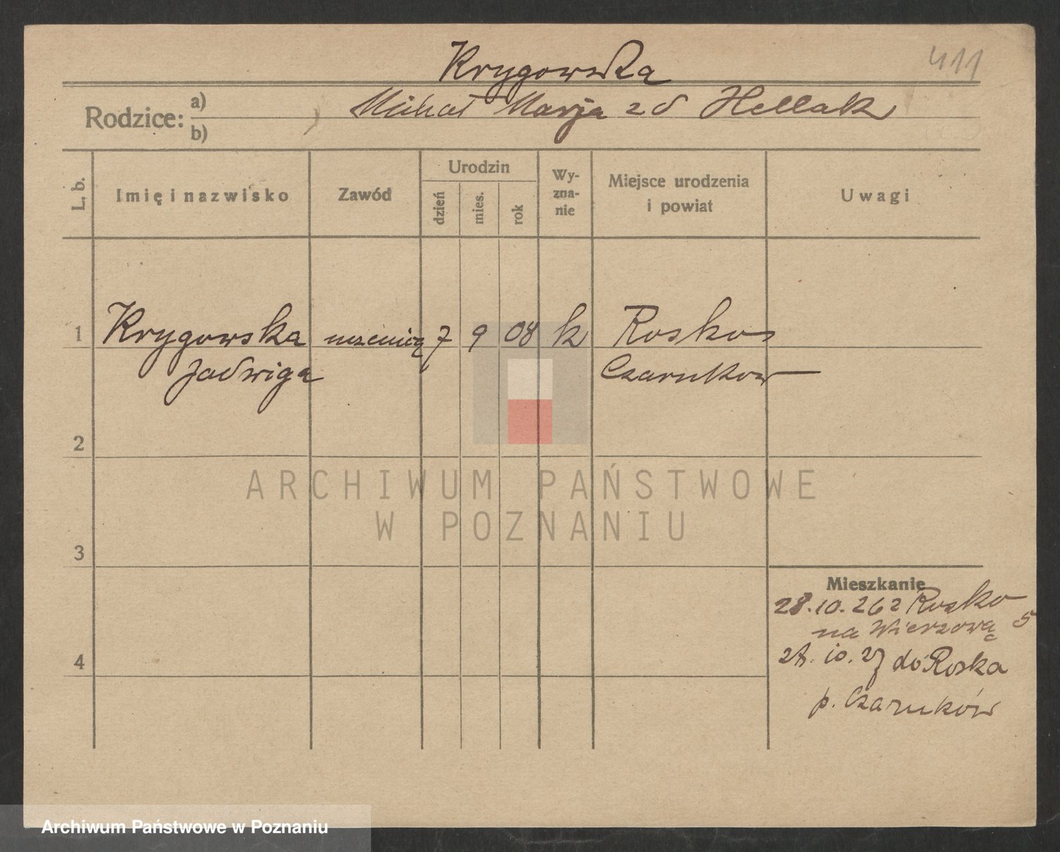 Podgląd karty osobowej dostępny jest po kliknięciu na nazwisko lub ikonkę karty. Można dokonywać powiększenia (ikony na górze) lub przechodzić między kolejnymi skanami (strzałki po bokach).