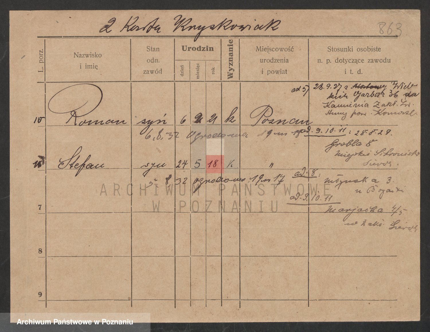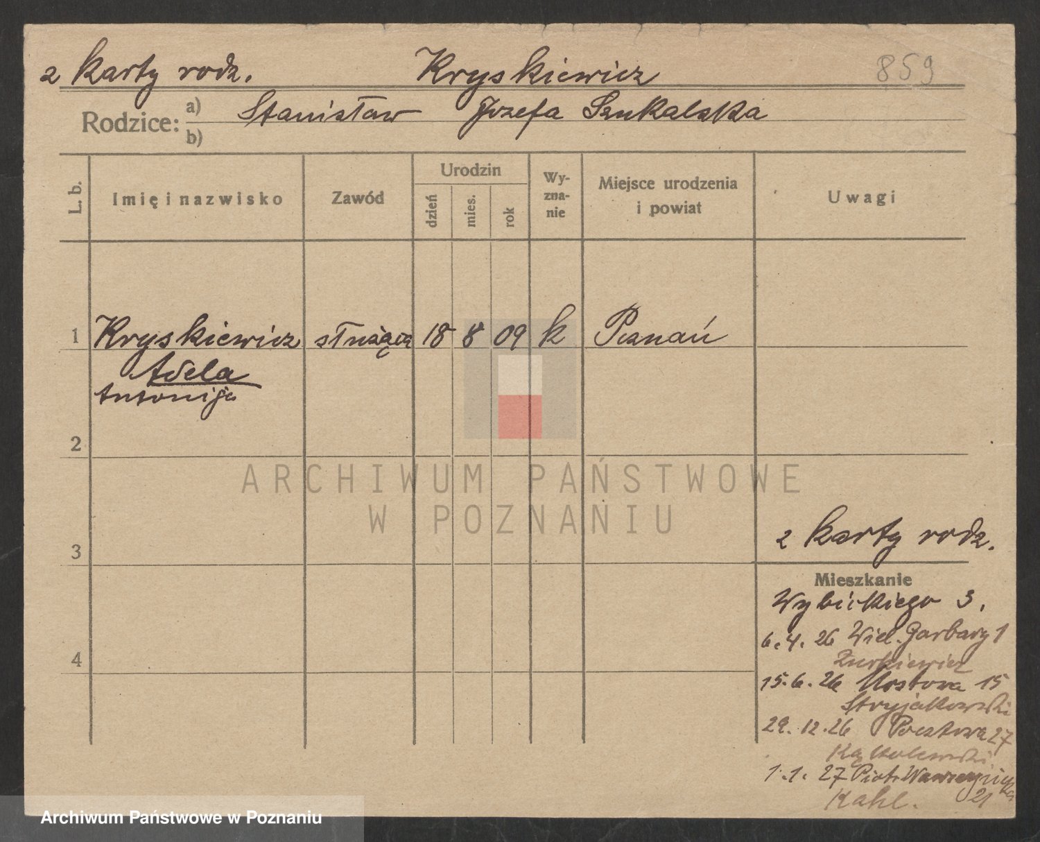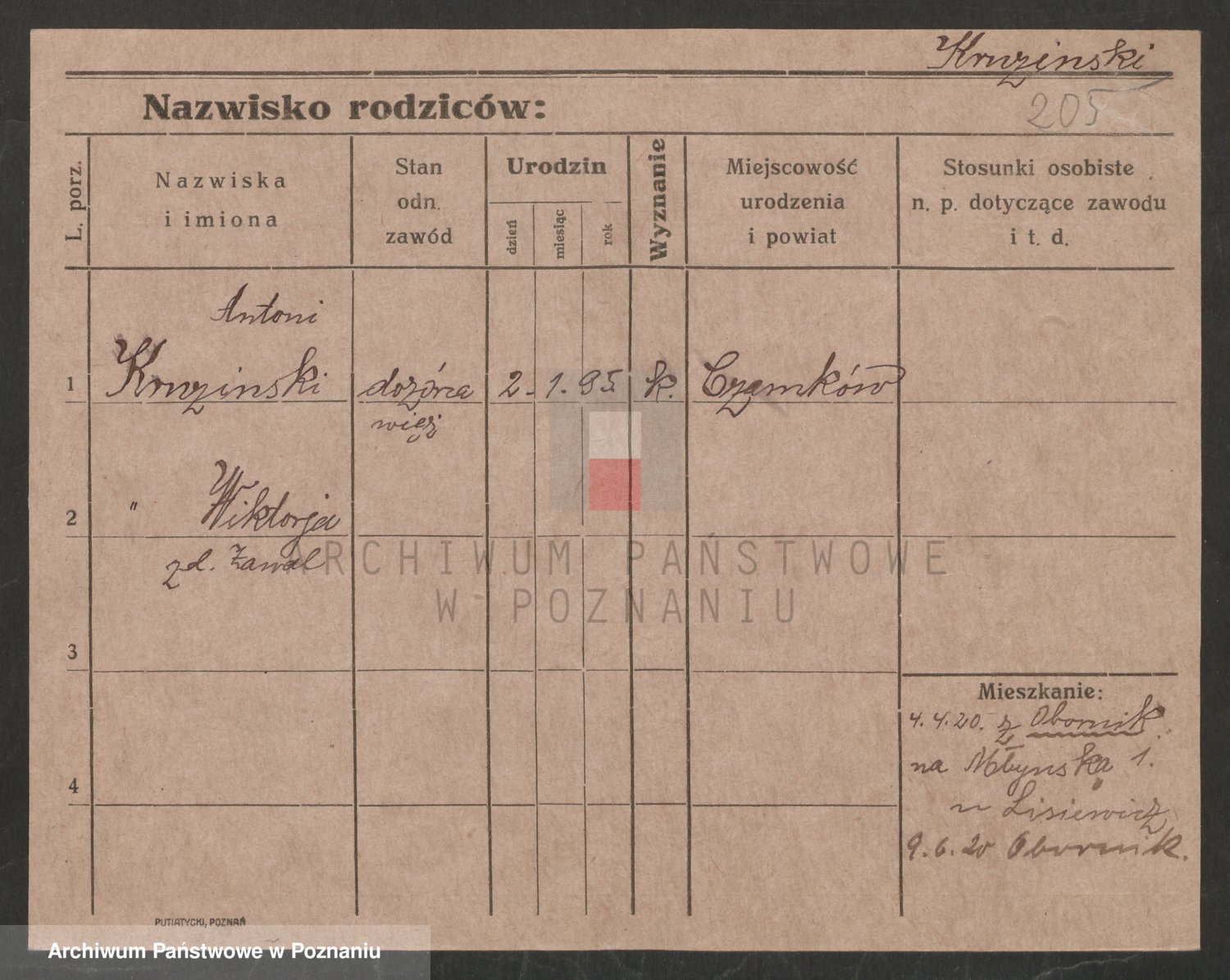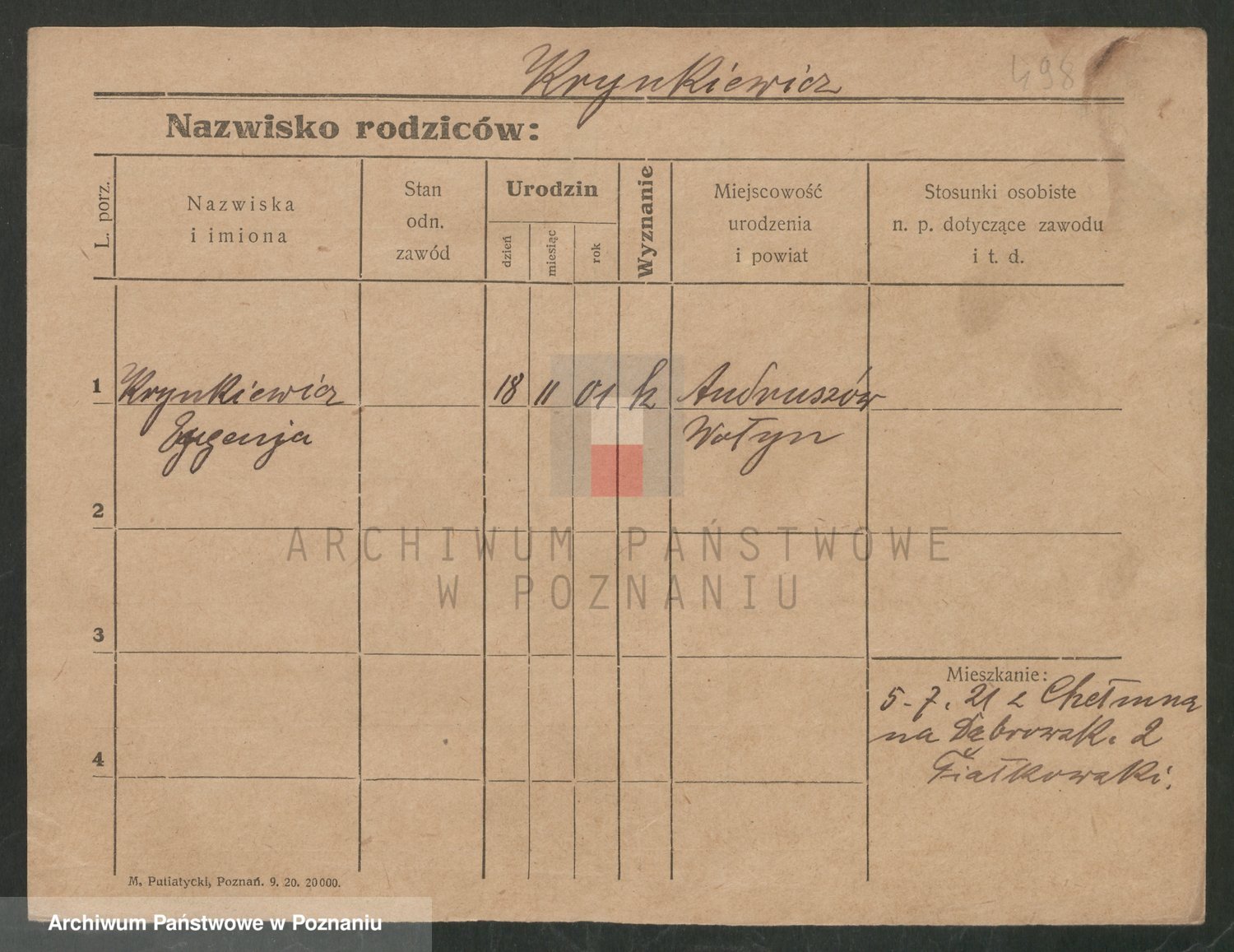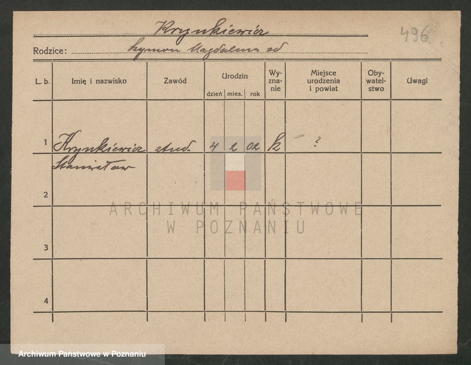 Podgląd karty osobowej dostępny jest po kliknięciu na nazwisko lub ikonkę karty. Można dokonywać powiększenia (ikony na górze) lub przechodzić między kolejnymi skanami (strzałki po bokach).