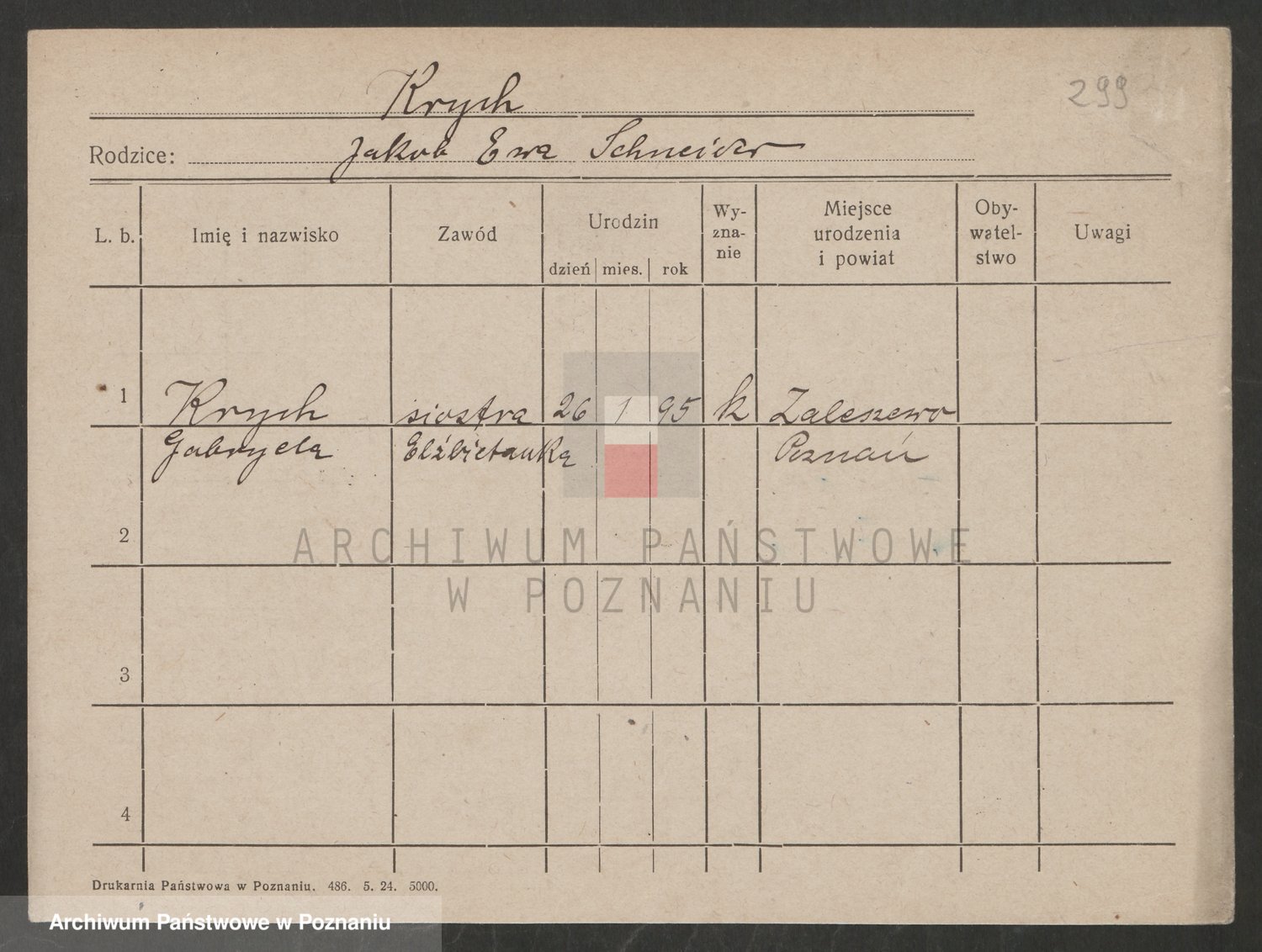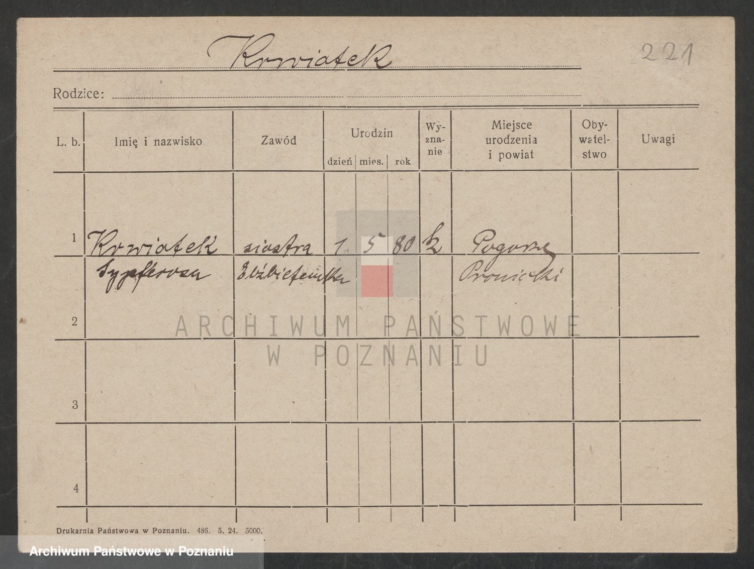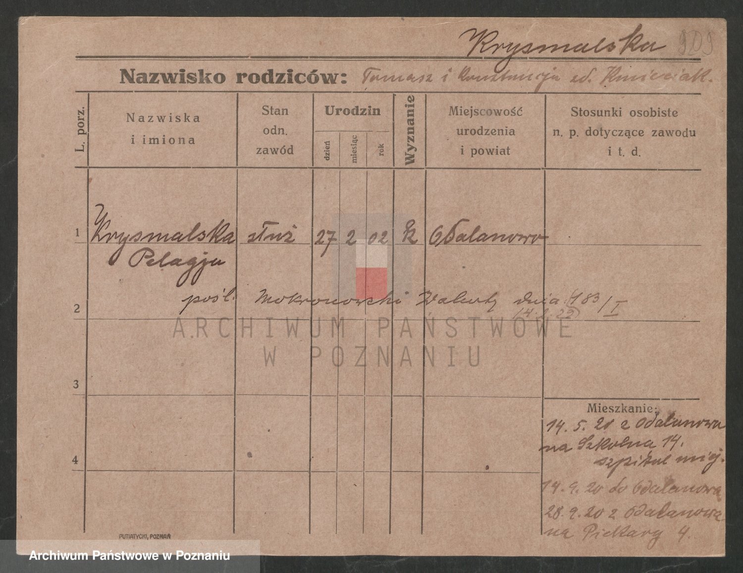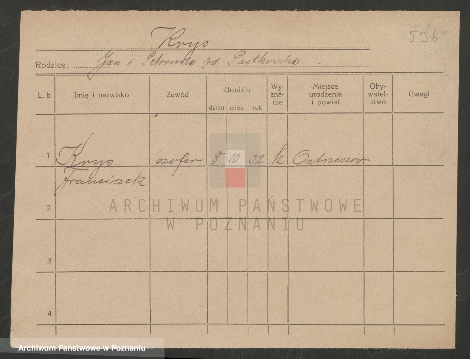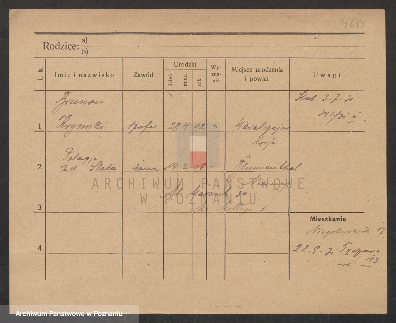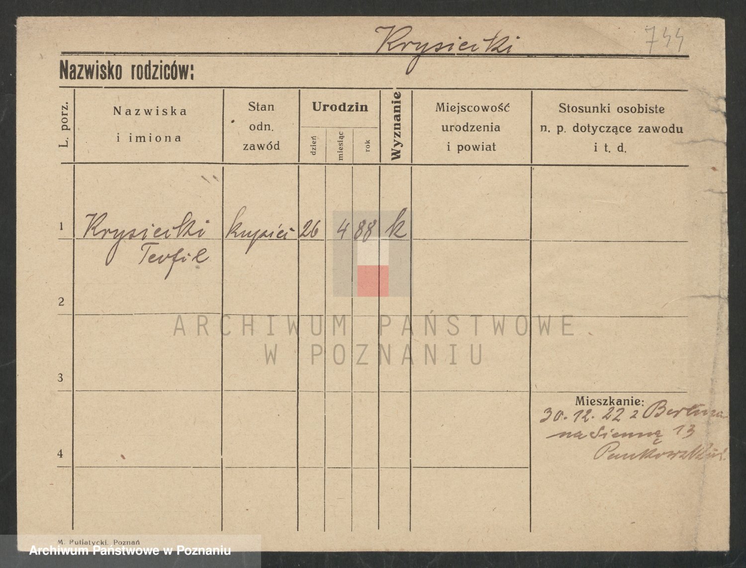 Podgląd karty osobowej dostępny jest po kliknięciu na nazwisko lub ikonkę karty. Można dokonywać powiększenia (ikony na górze) lub przechodzić między kolejnymi skanami (strzałki po bokach).
