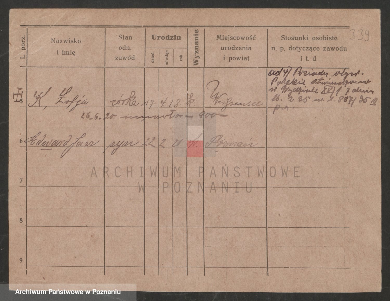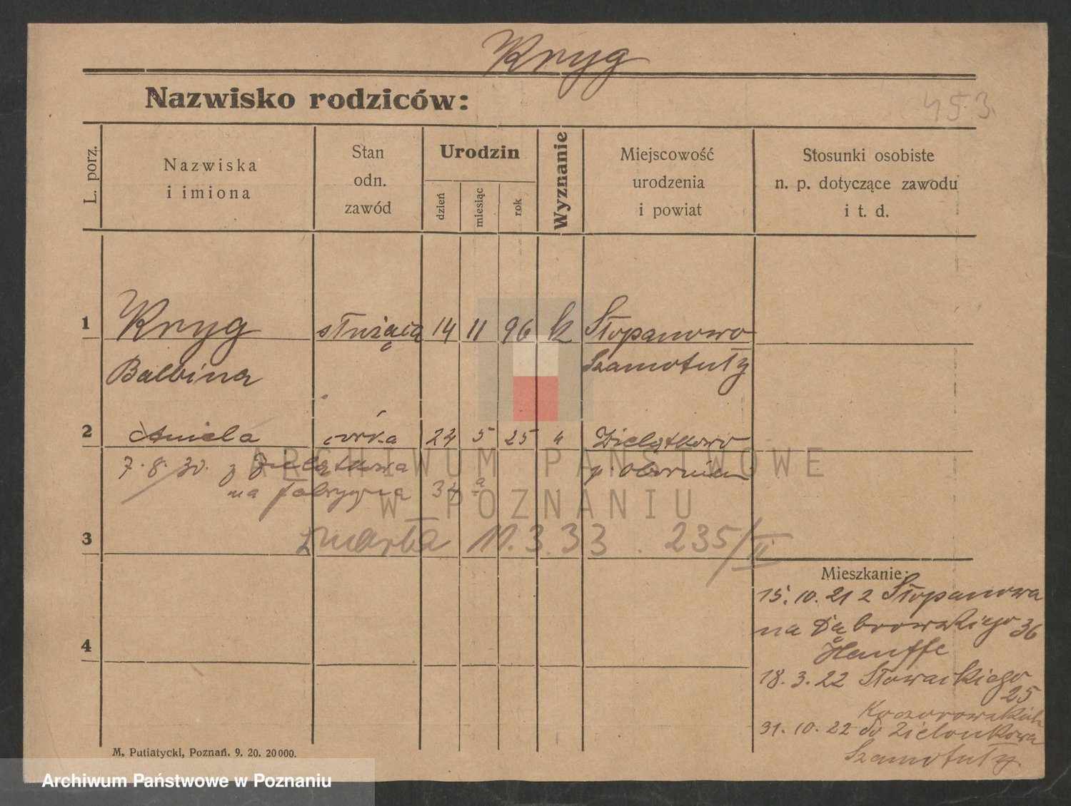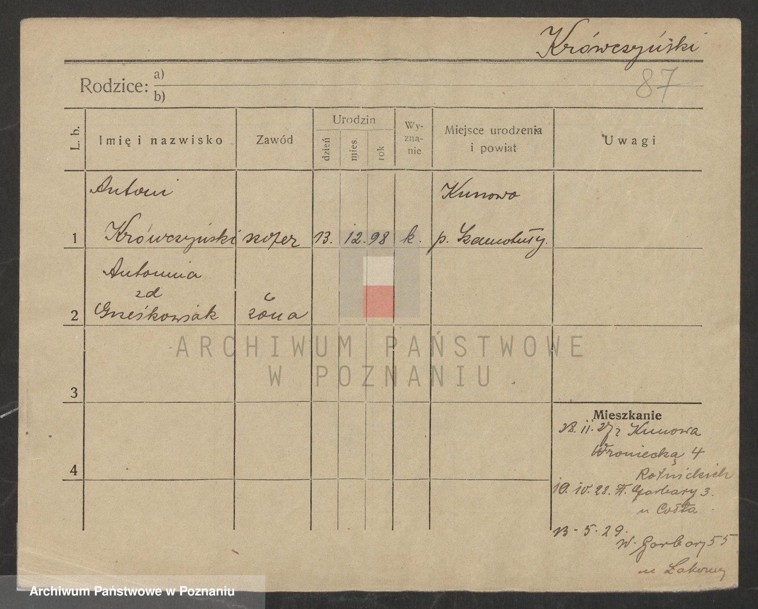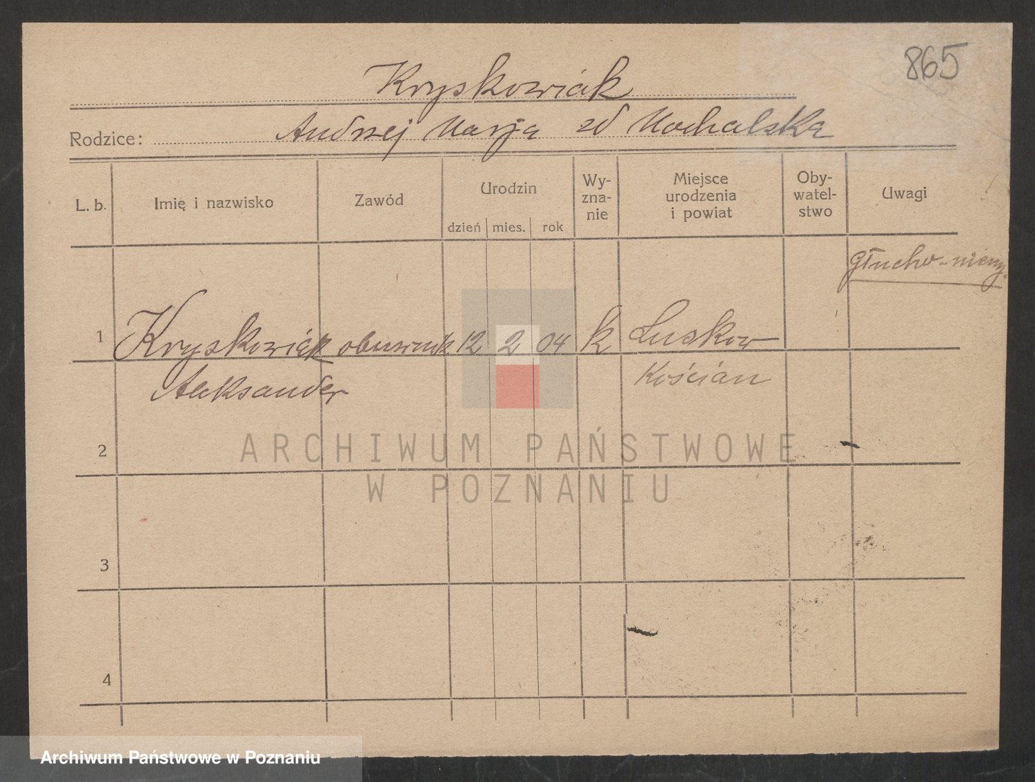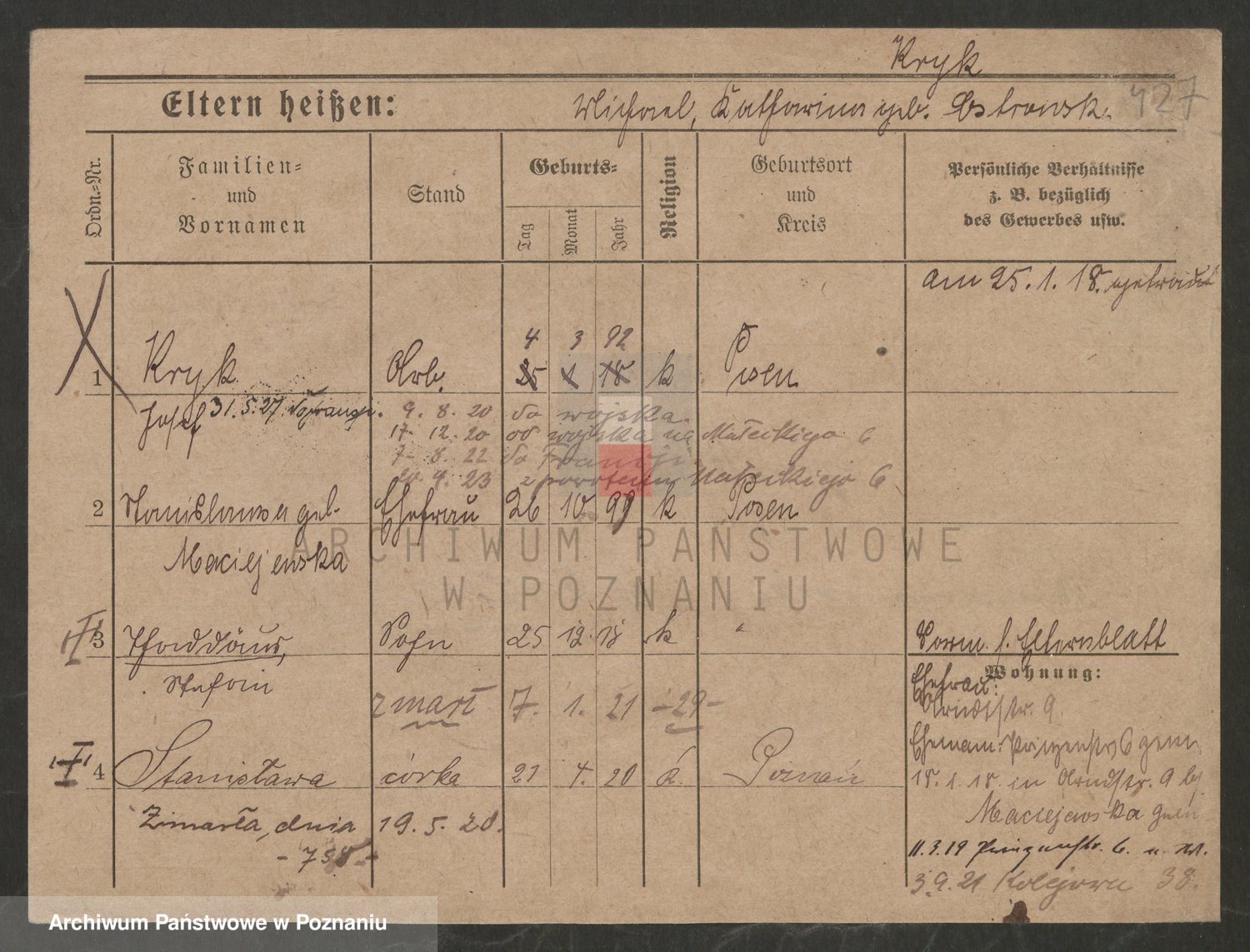 Podgląd karty osobowej dostępny jest po kliknięciu na nazwisko lub ikonkę karty. Można dokonywać powiększenia (ikony na górze) lub przechodzić między kolejnymi skanami (strzałki po bokach).