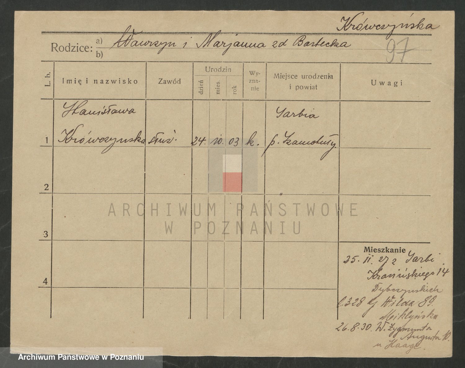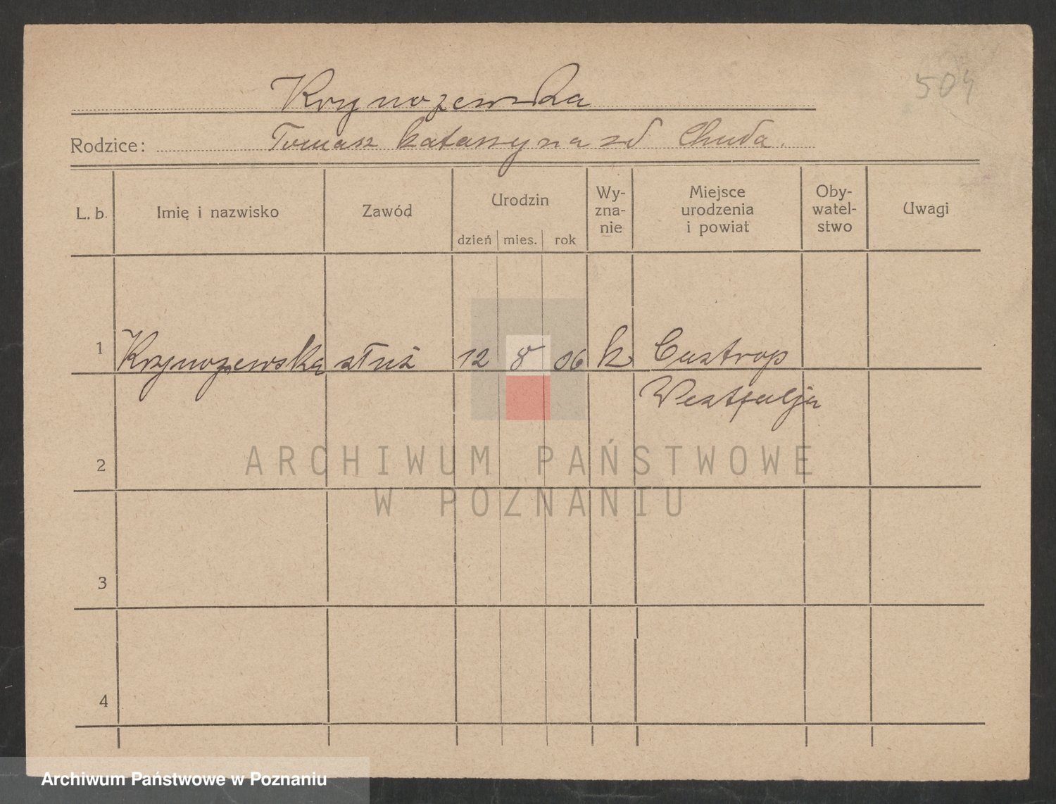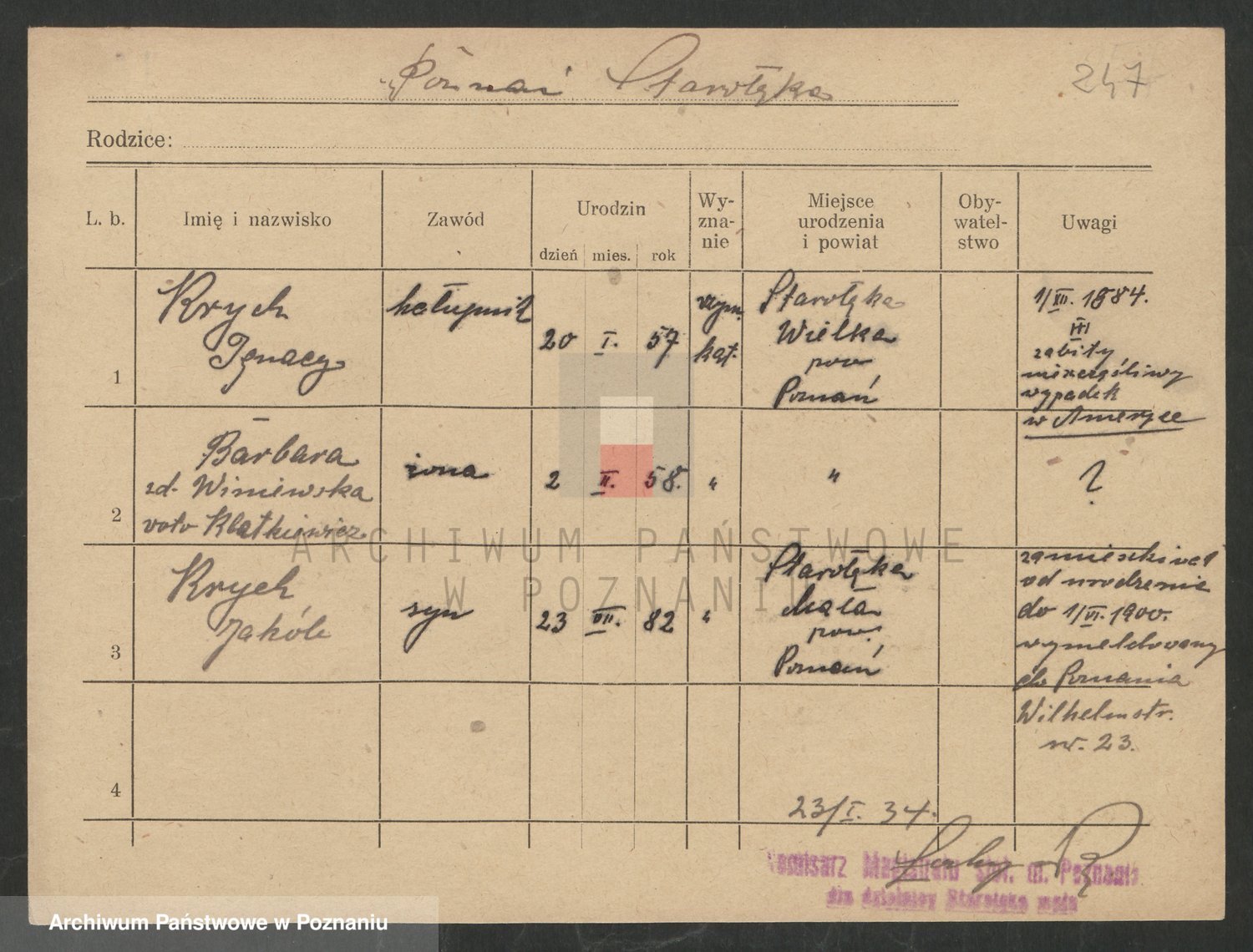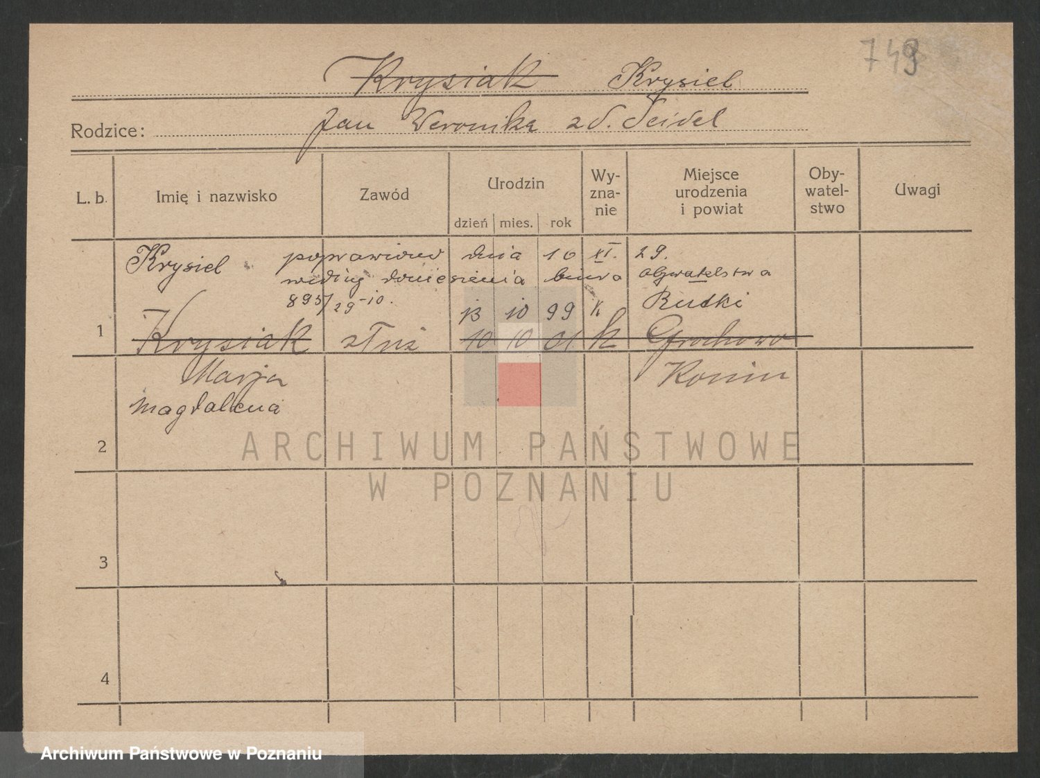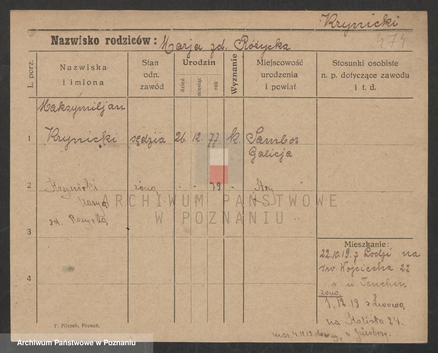 Podgląd karty osobowej dostępny jest po kliknięciu na nazwisko lub ikonkę karty. Można dokonywać powiększenia (ikony na górze) lub przechodzić między kolejnymi skanami (strzałki po bokach).