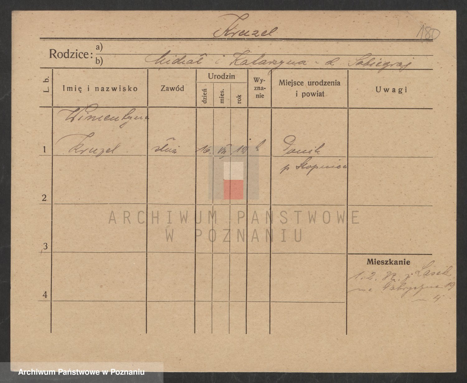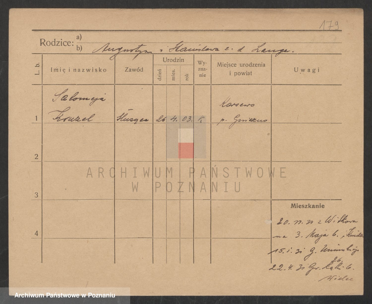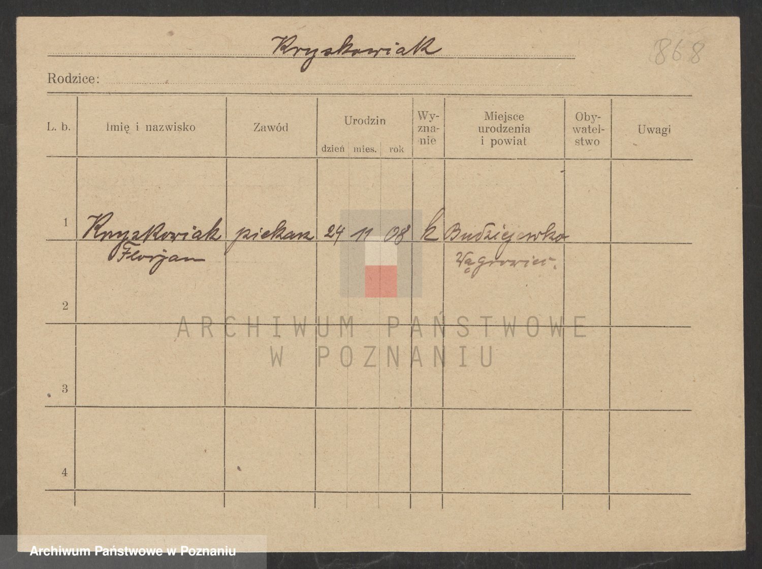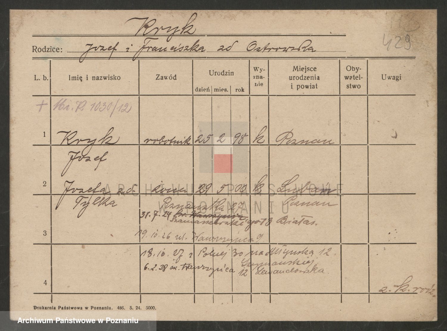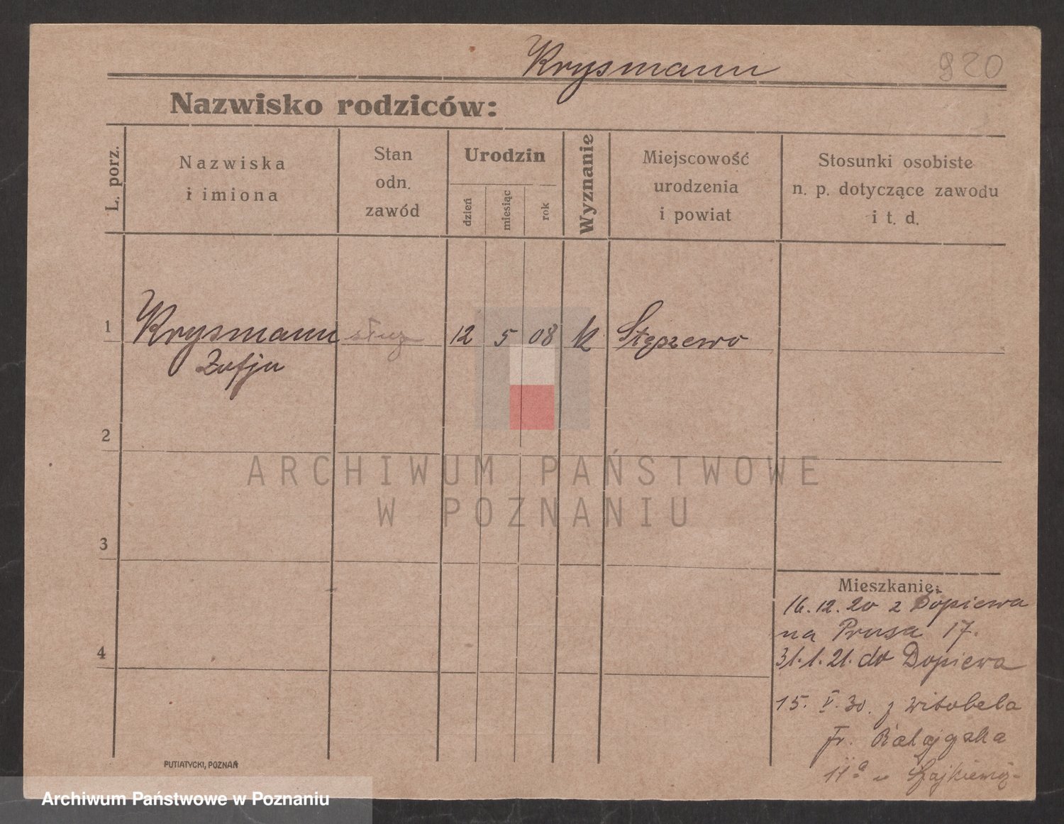 Podgląd karty osobowej dostępny jest po kliknięciu na nazwisko lub ikonkę karty. Można dokonywać powiększenia (ikony na górze) lub przechodzić między kolejnymi skanami (strzałki po bokach).
