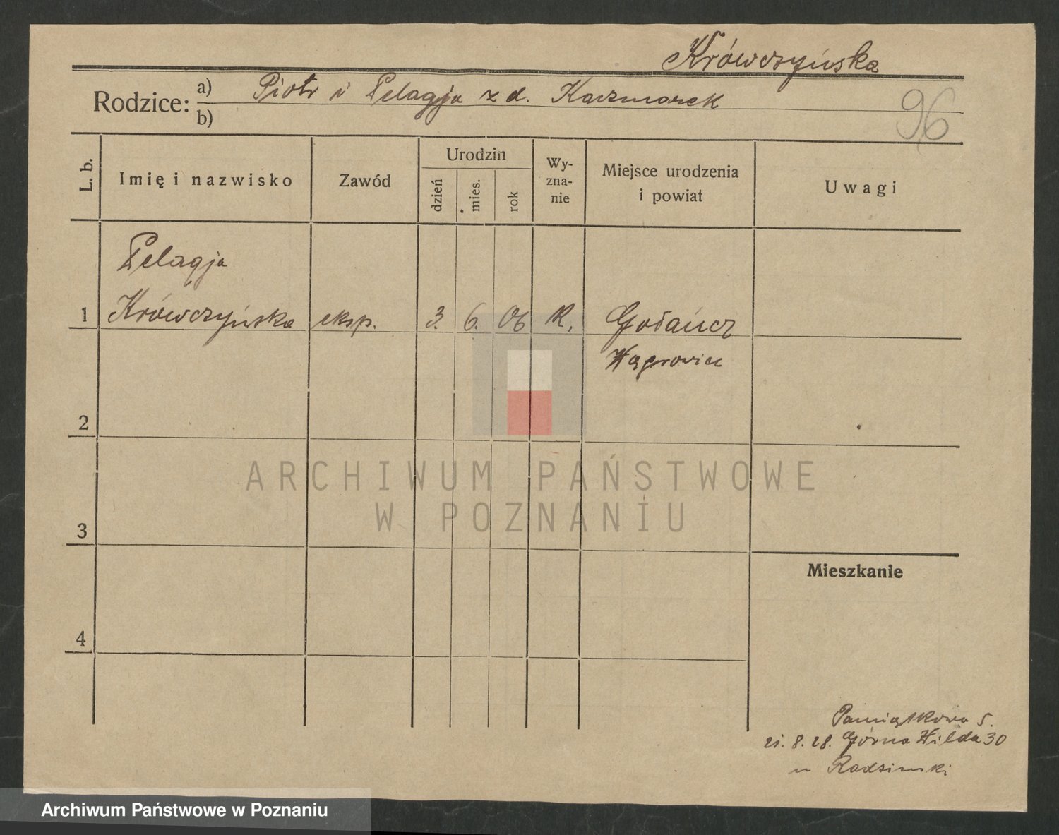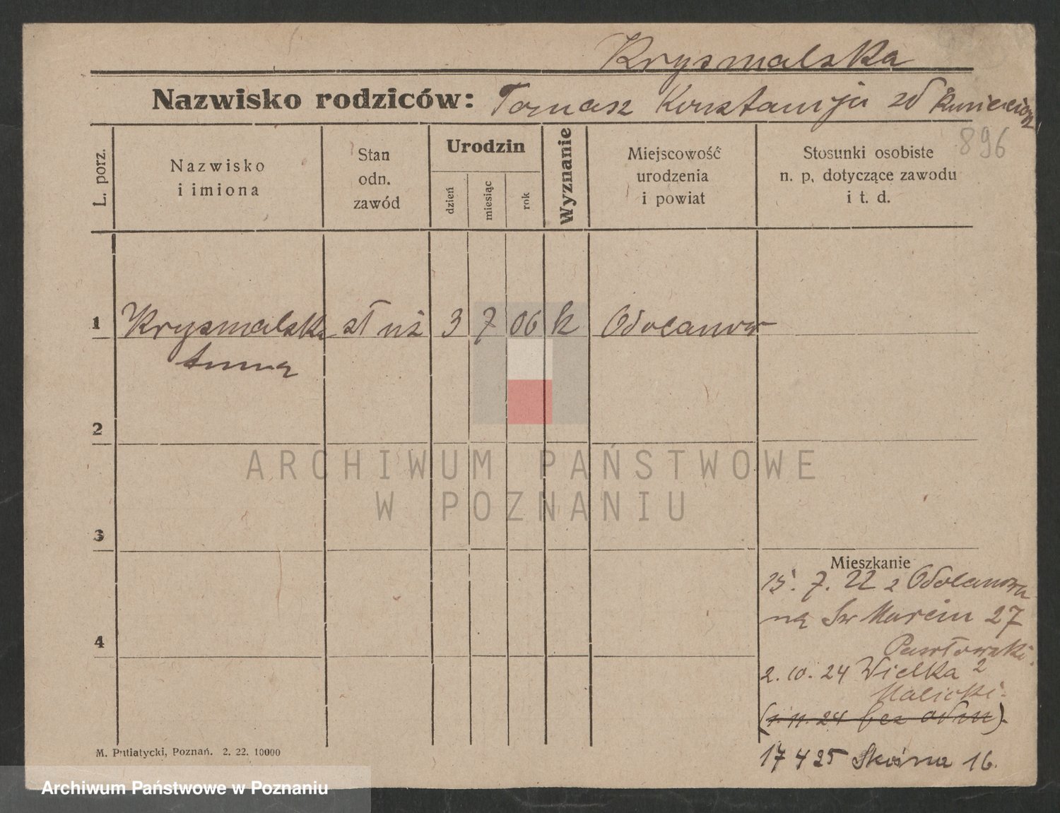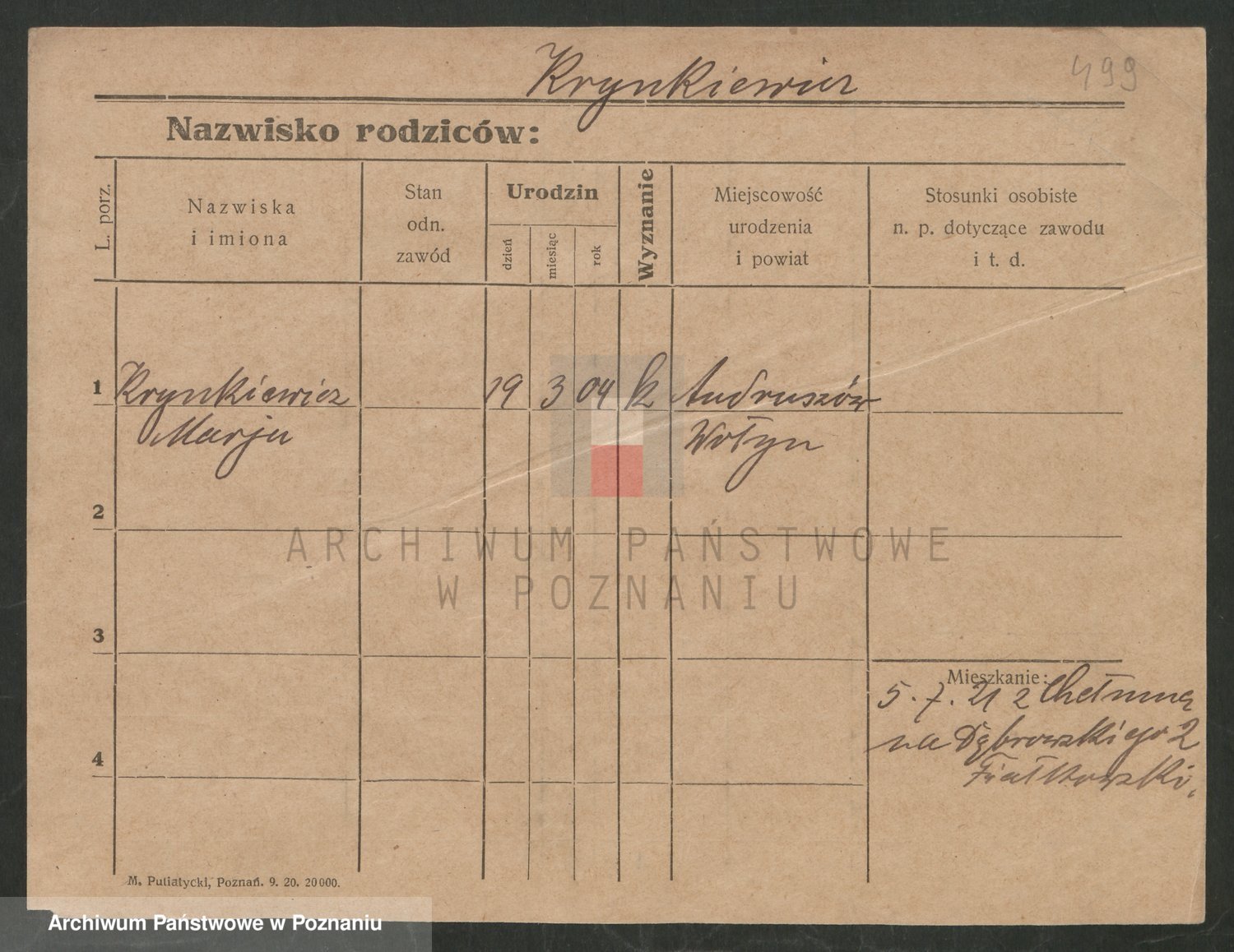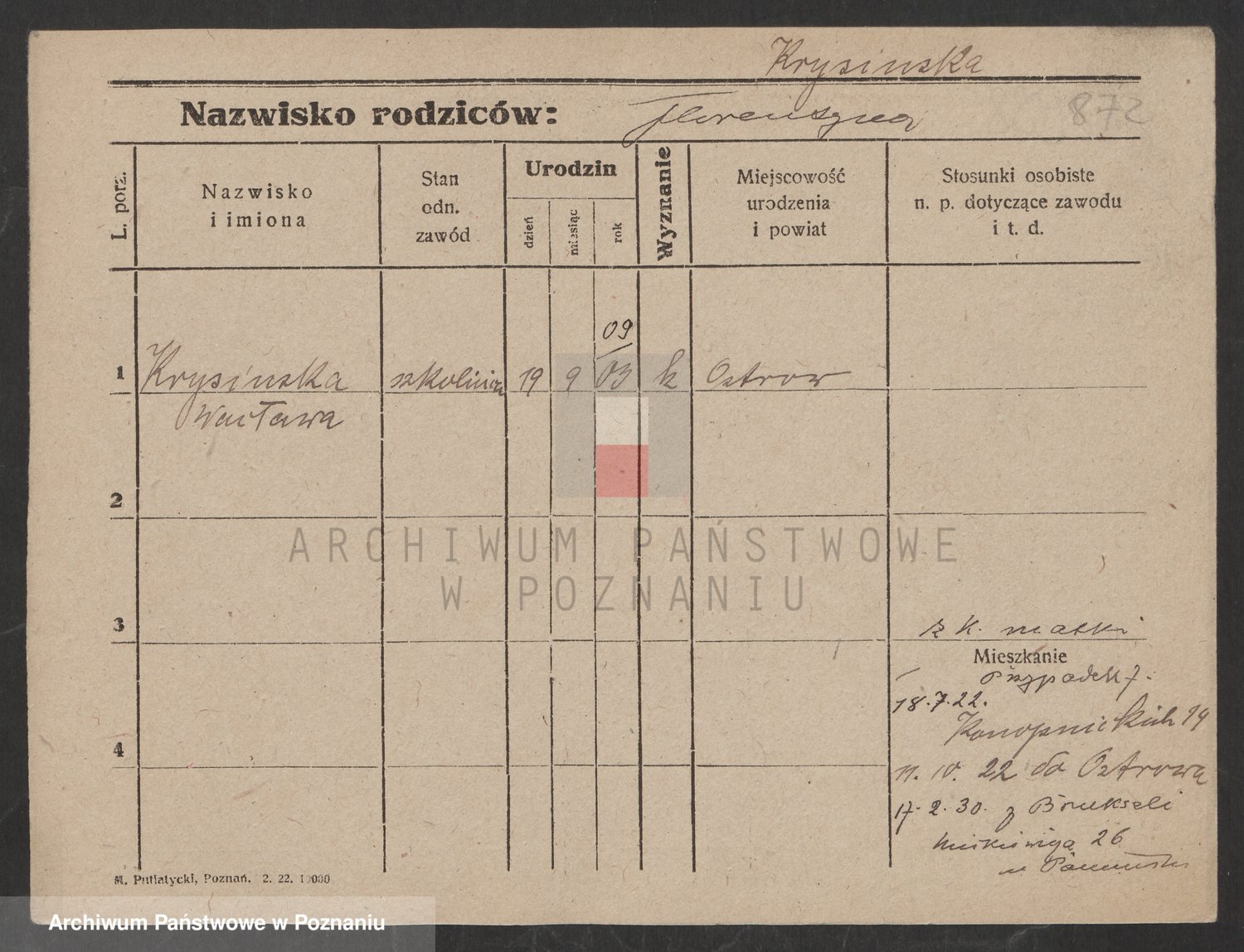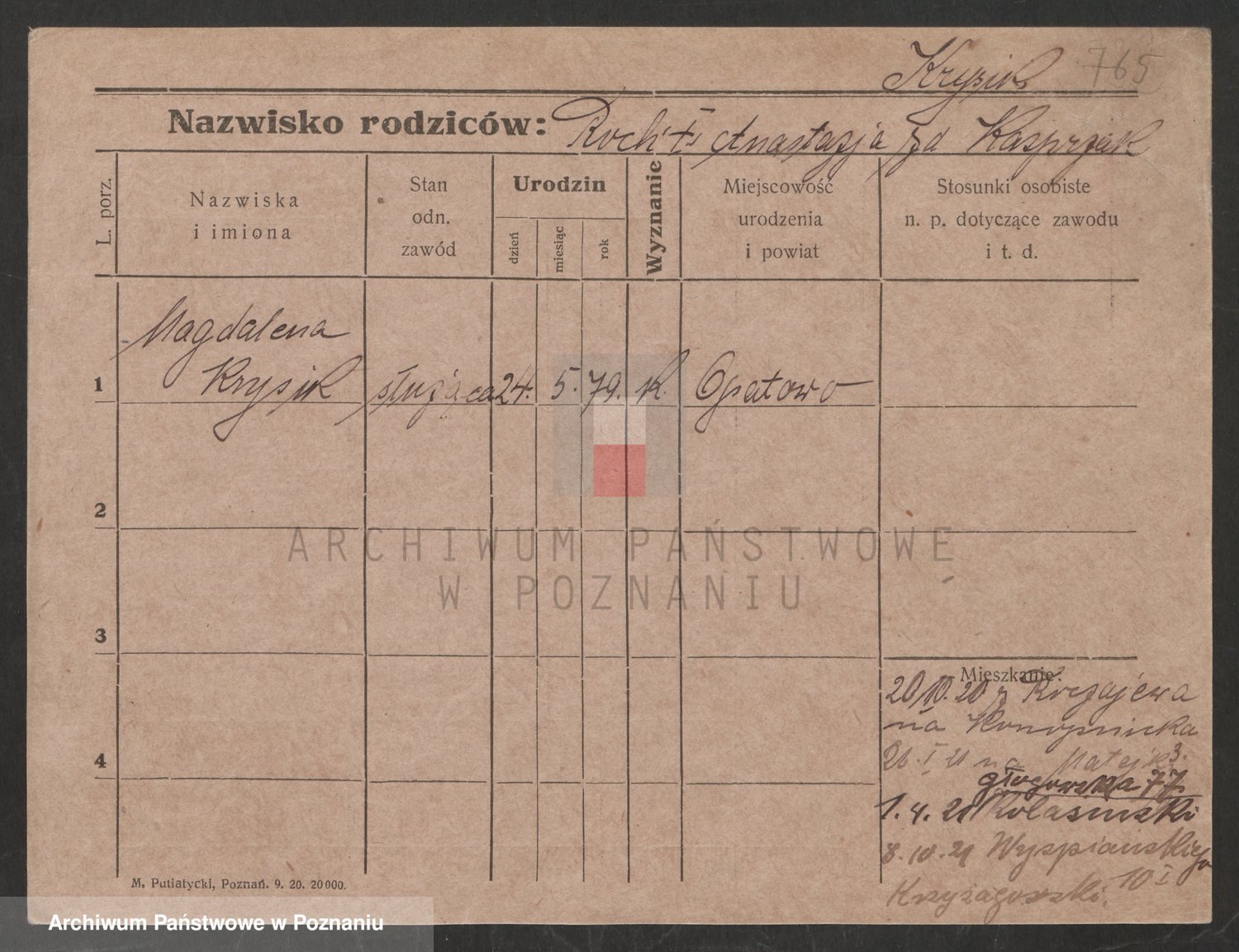 Podgląd karty osobowej dostępny jest po kliknięciu na nazwisko lub ikonkę karty. Można dokonywać powiększenia (ikony na górze) lub przechodzić między kolejnymi skanami (strzałki po bokach).