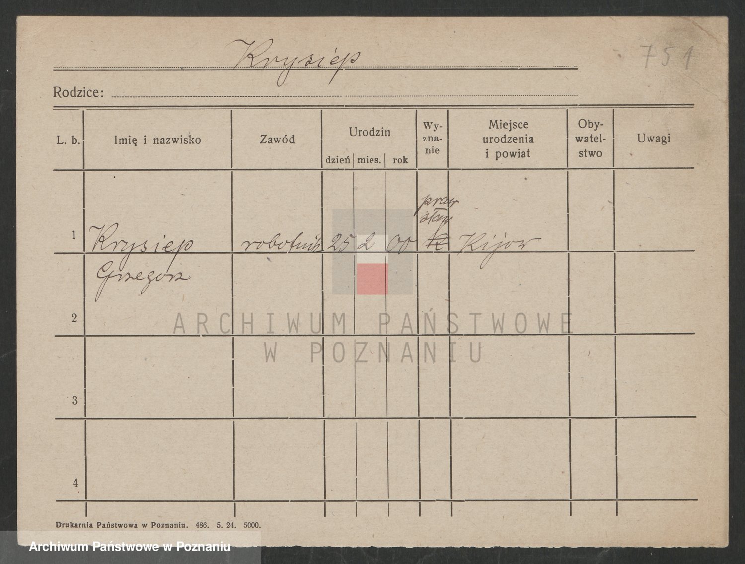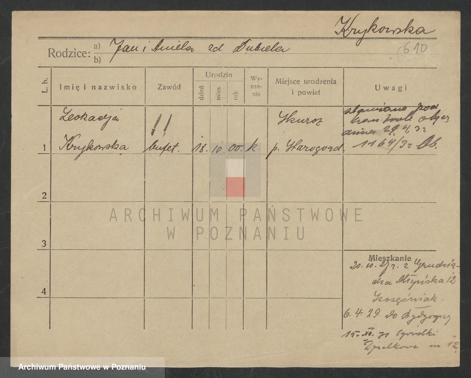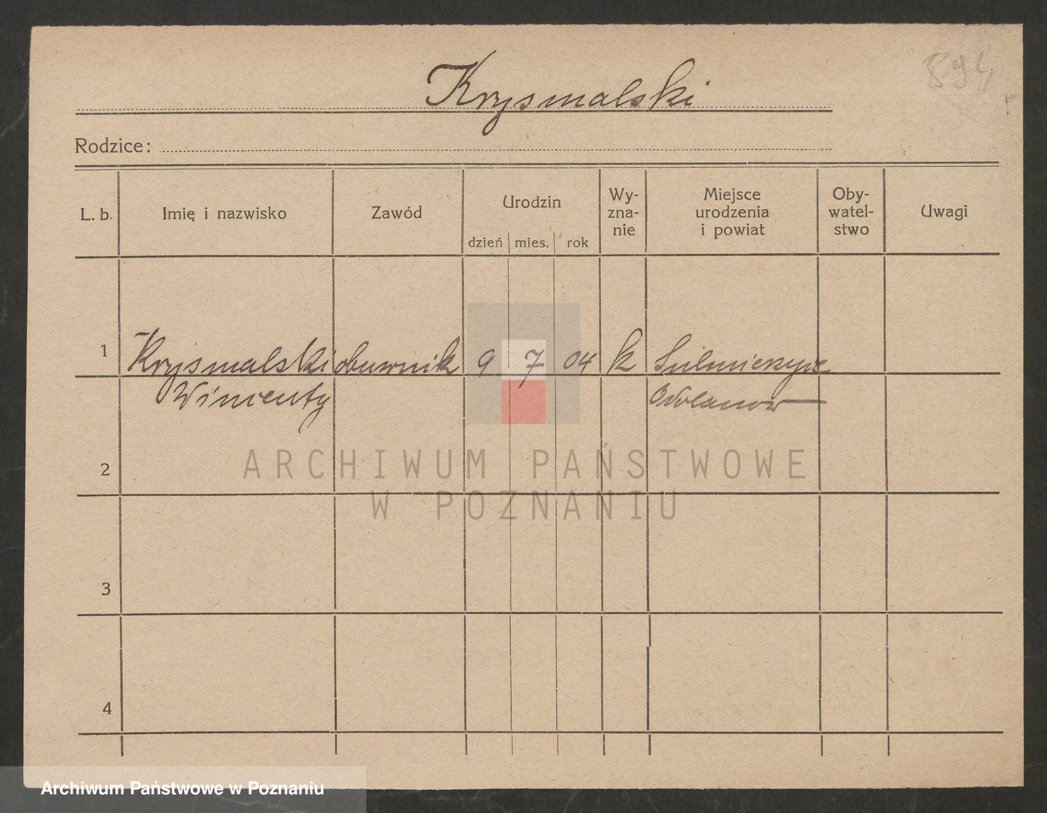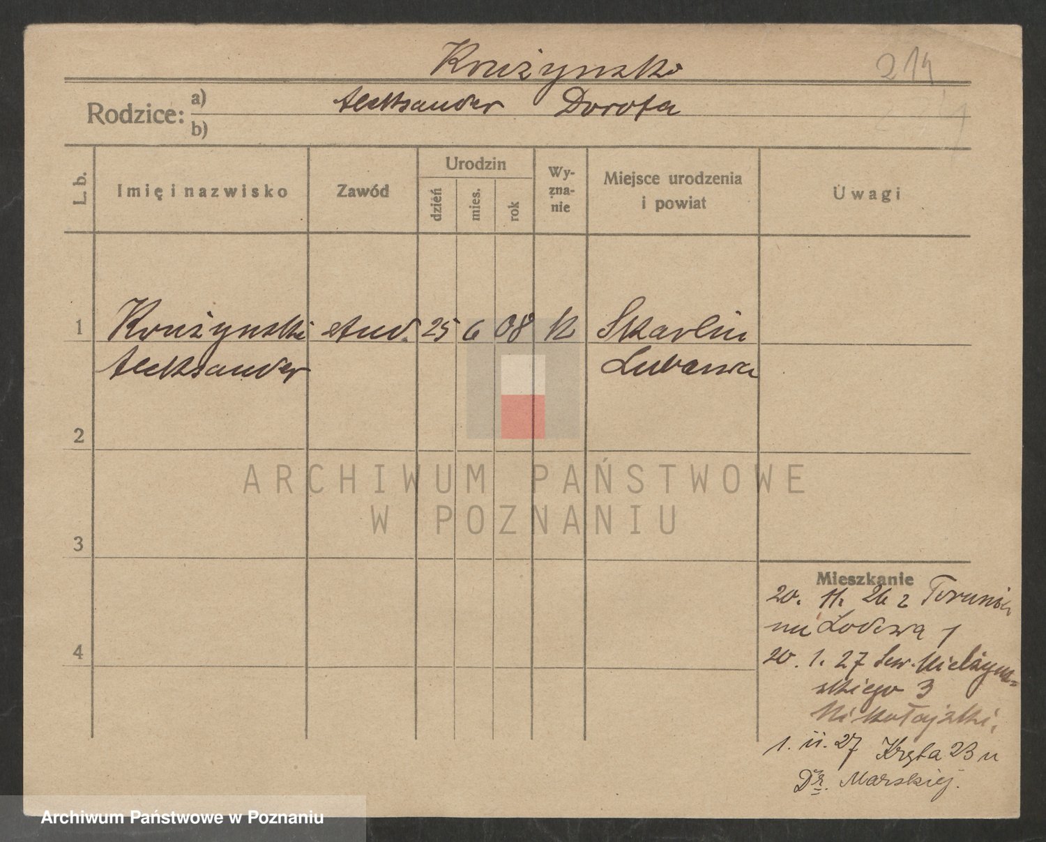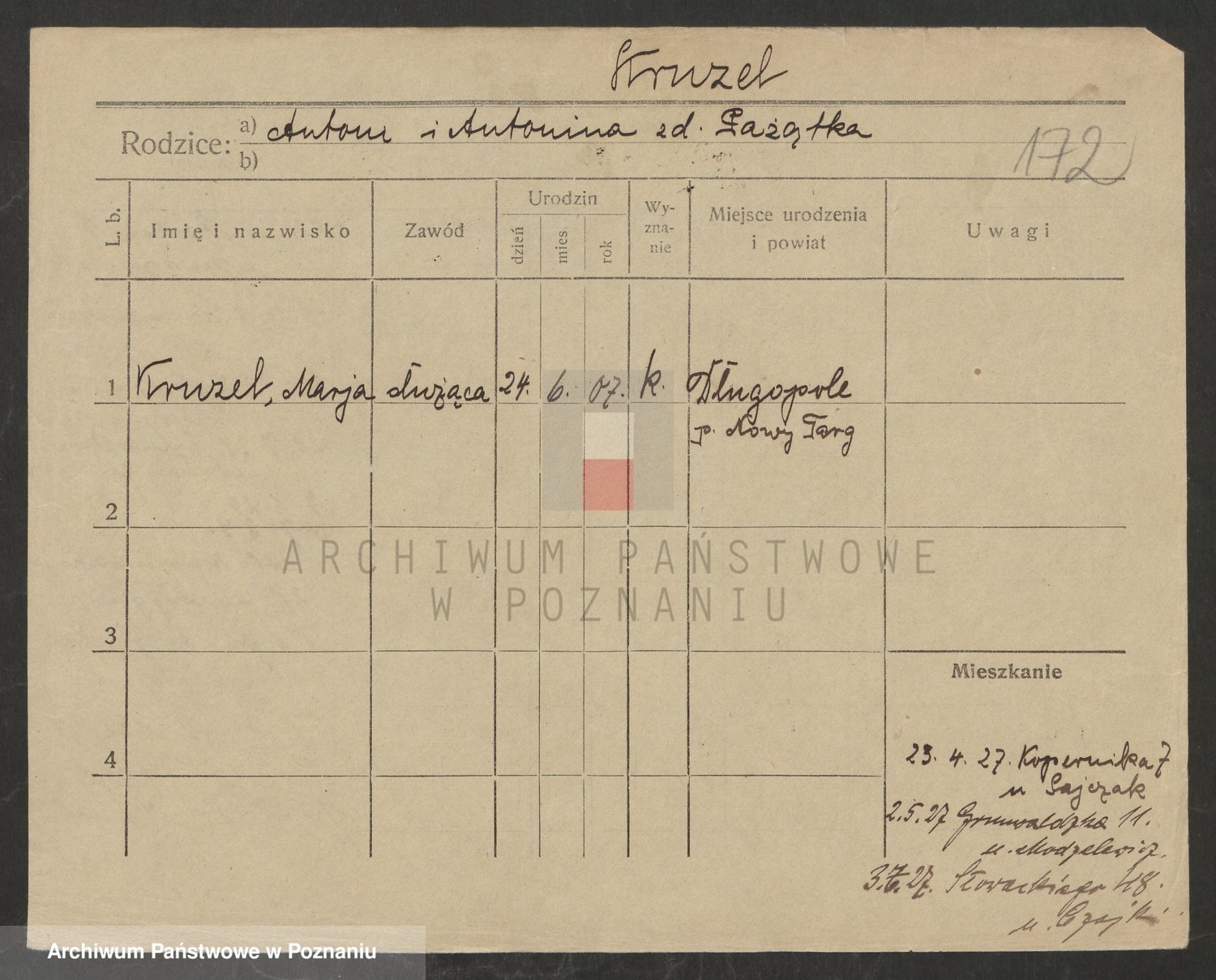 Podgląd karty osobowej dostępny jest po kliknięciu na nazwisko lub ikonkę karty. Można dokonywać powiększenia (ikony na górze) lub przechodzić między kolejnymi skanami (strzałki po bokach).