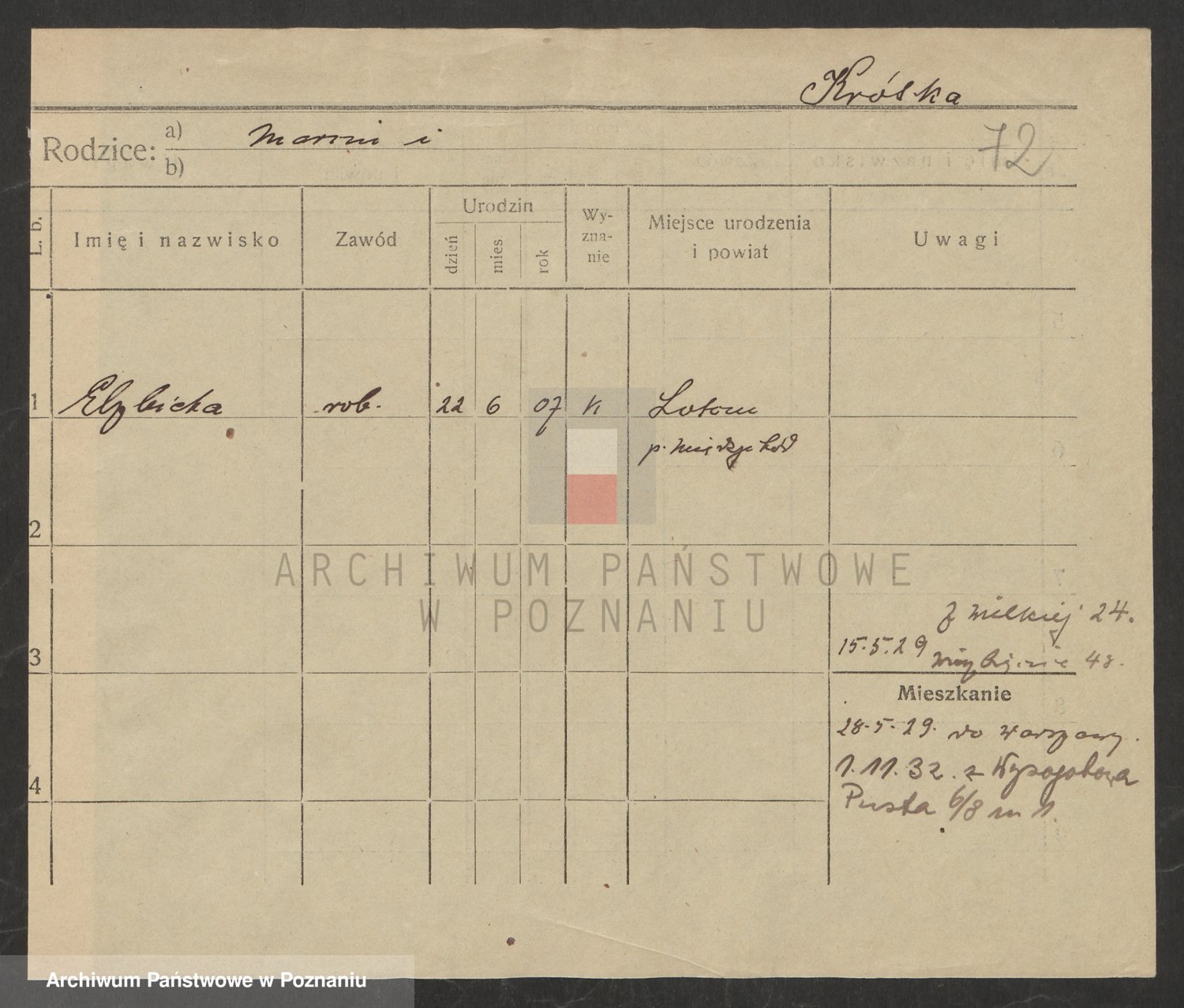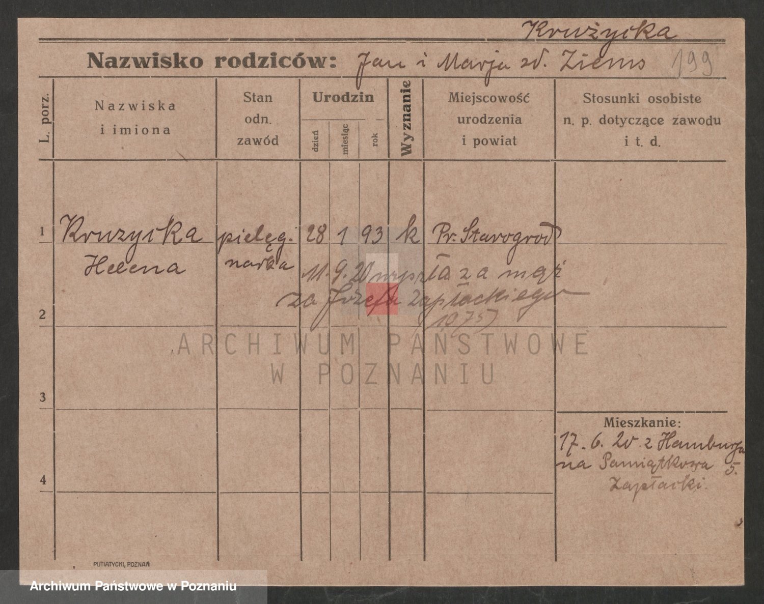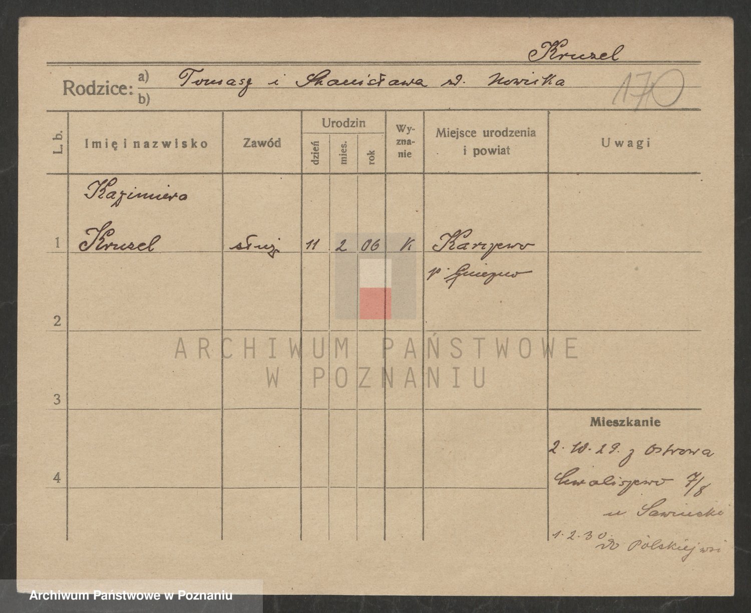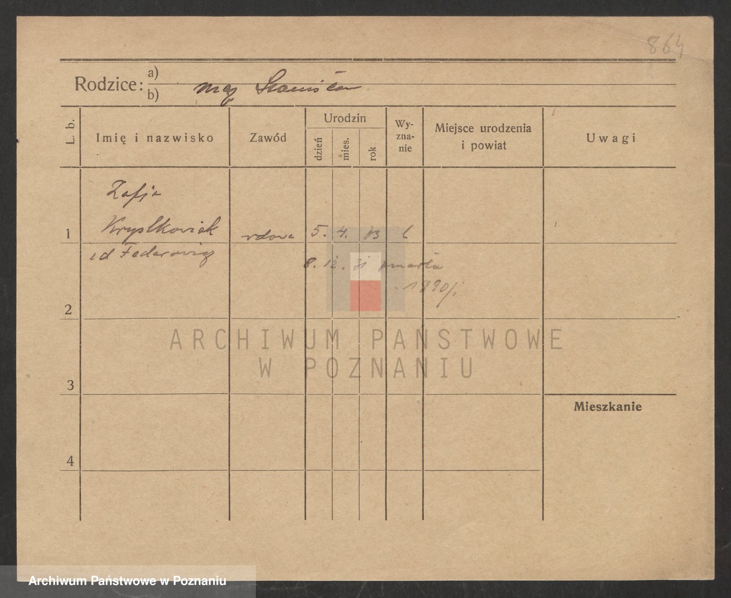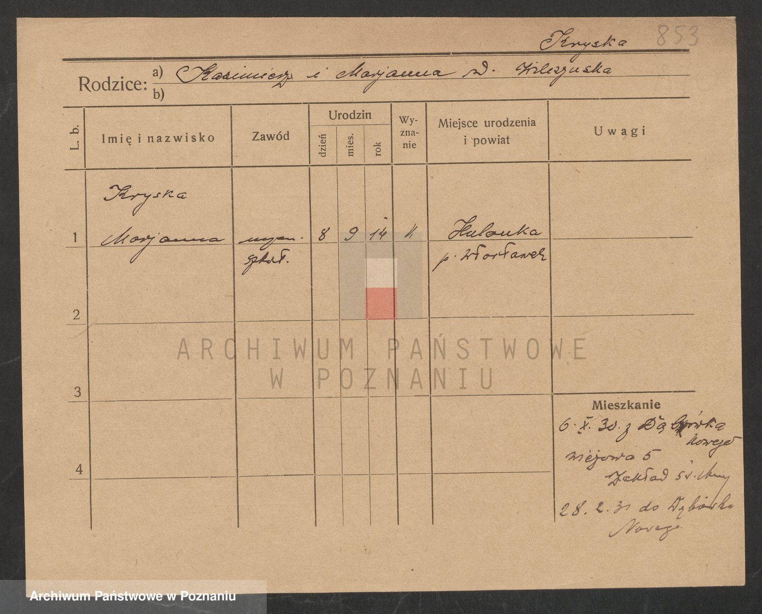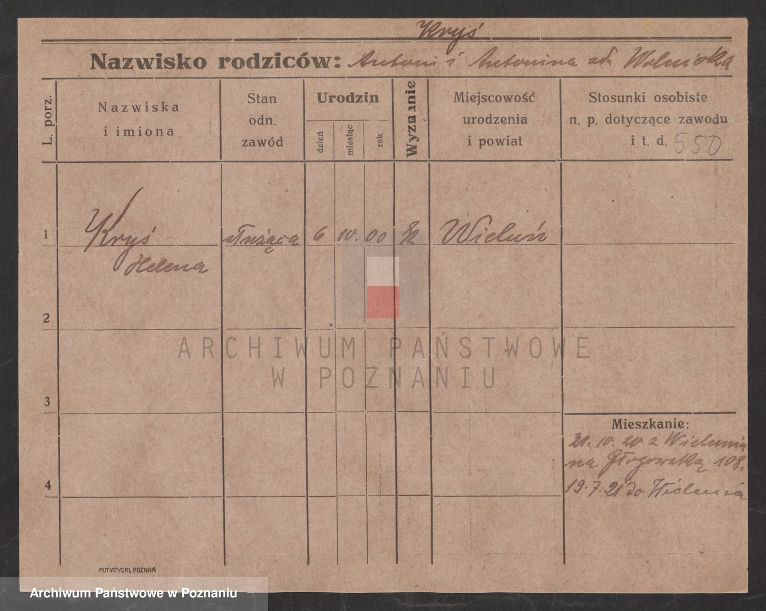Podgląd karty osobowej dostępny jest po kliknięciu na nazwisko lub ikonkę karty. Można dokonywać powiększenia (ikony na górze) lub przechodzić między kolejnymi skanami (strzałki po bokach).