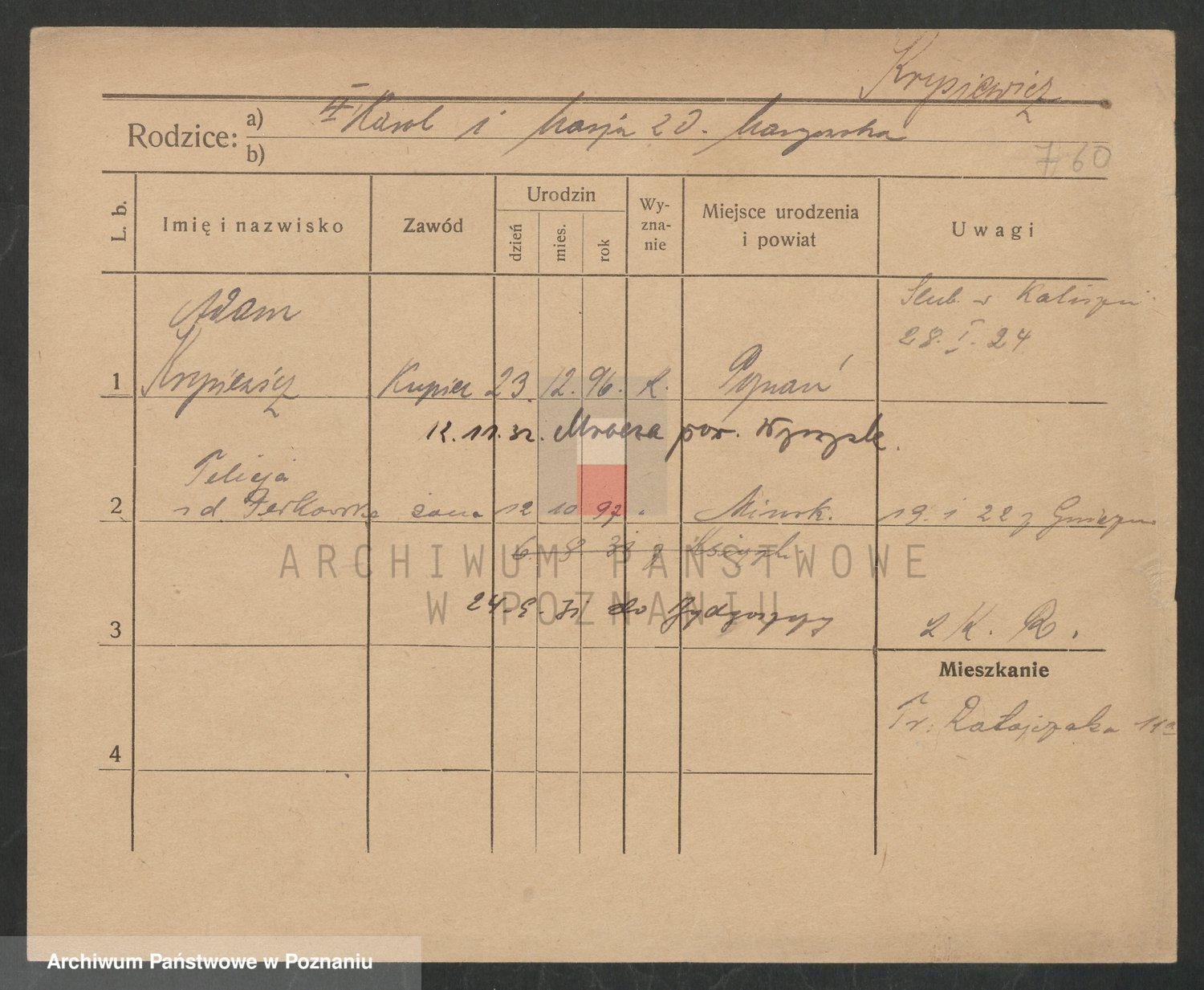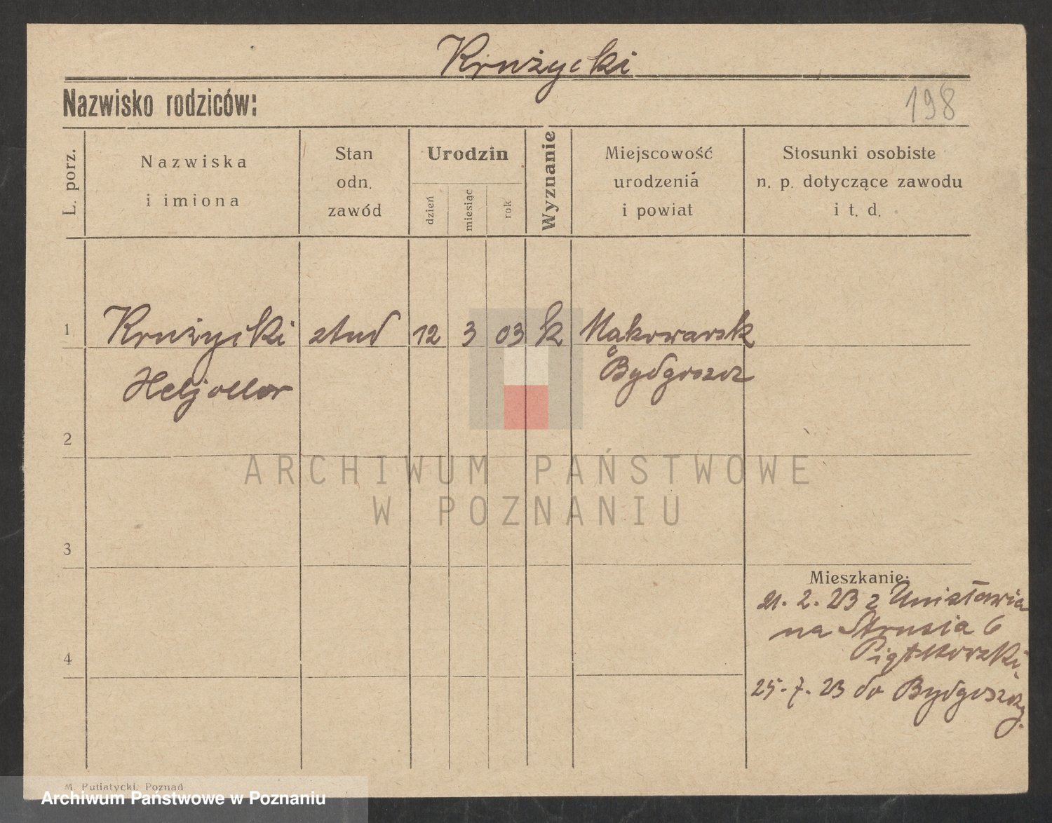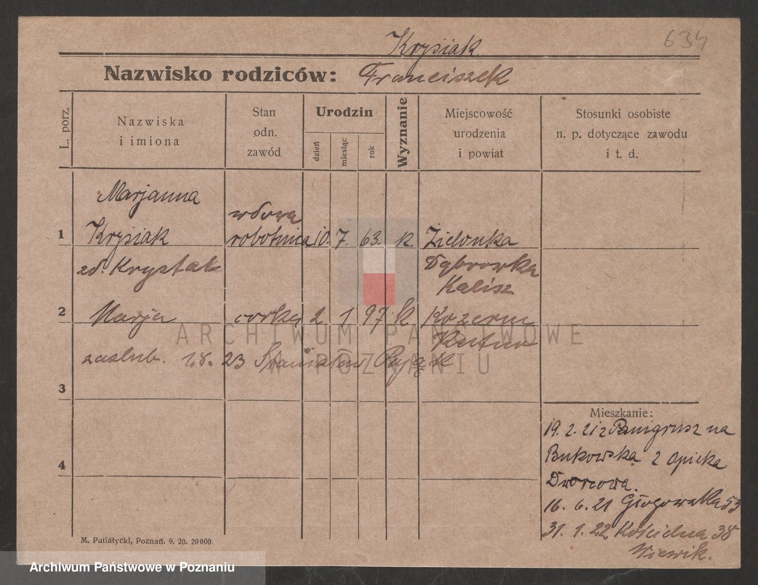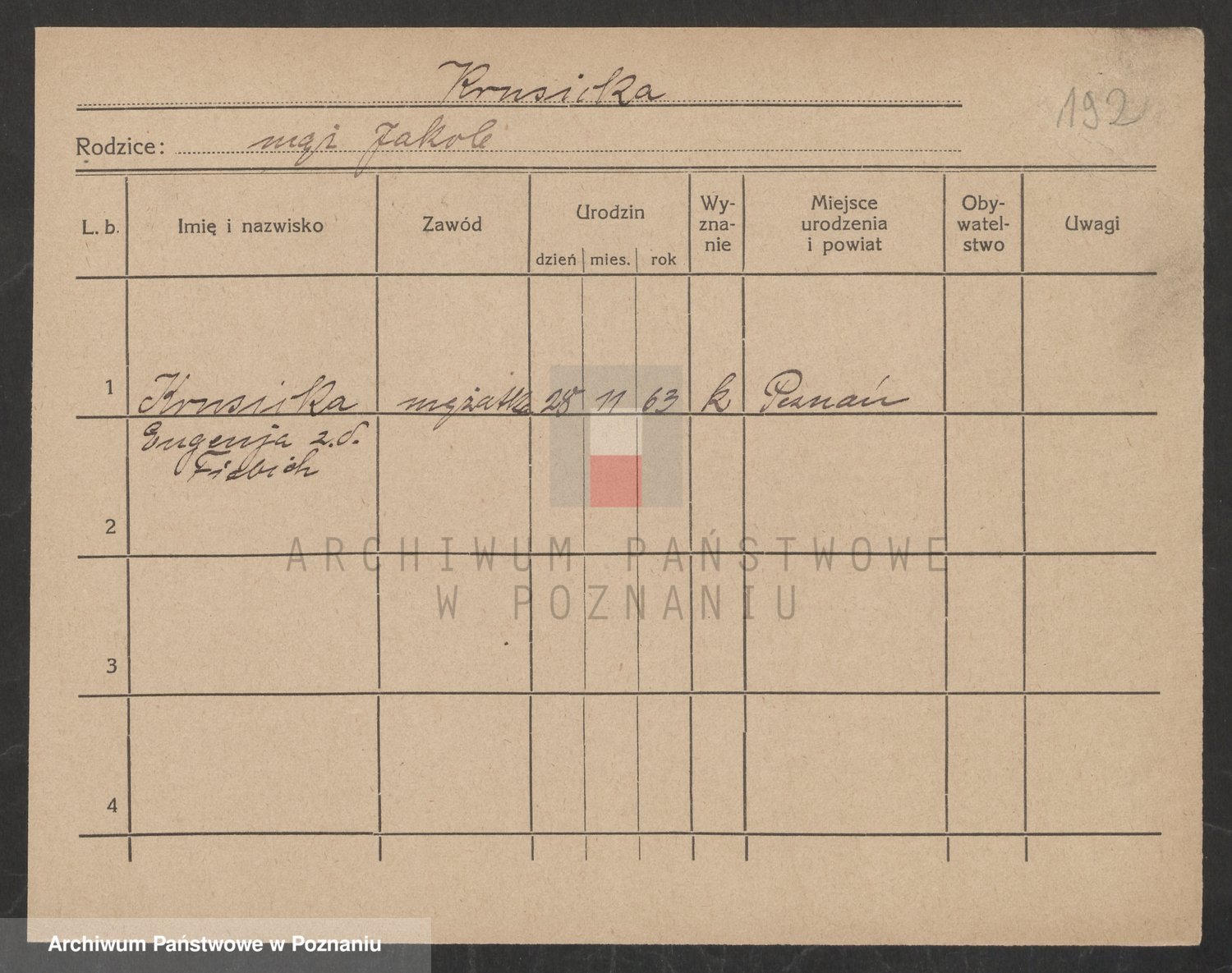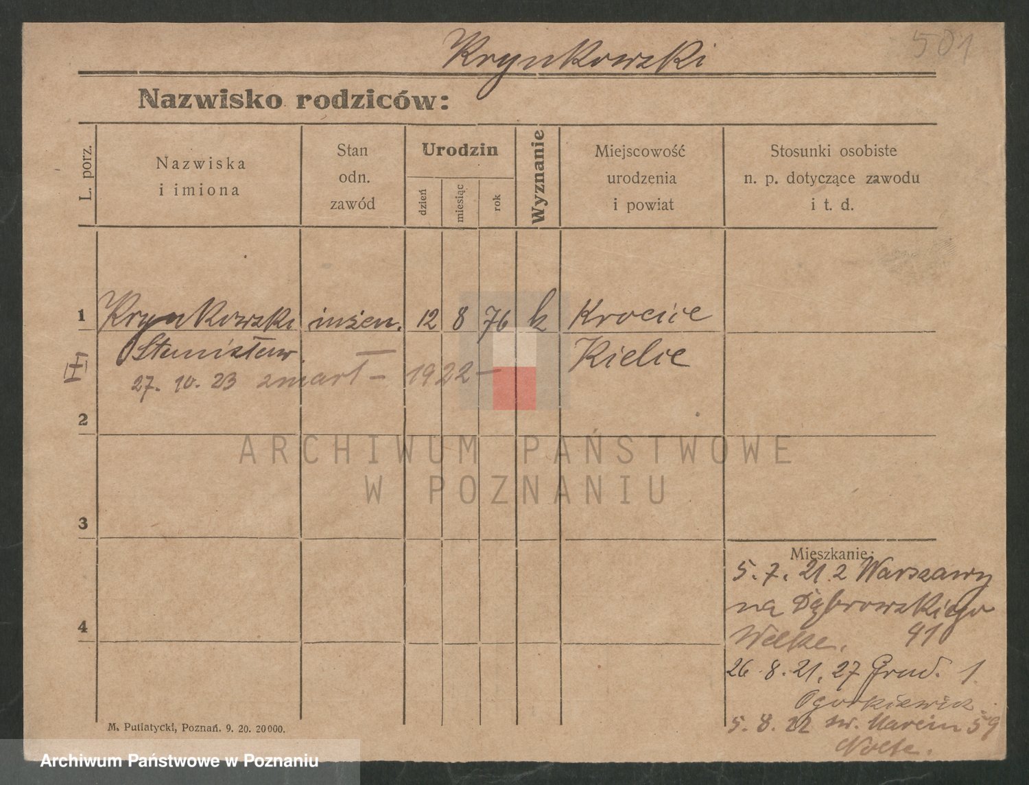 Podgląd karty osobowej dostępny jest po kliknięciu na nazwisko lub ikonkę karty. Można dokonywać powiększenia (ikony na górze) lub przechodzić między kolejnymi skanami (strzałki po bokach).