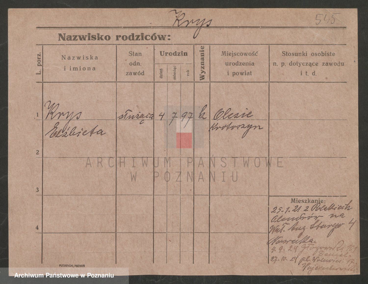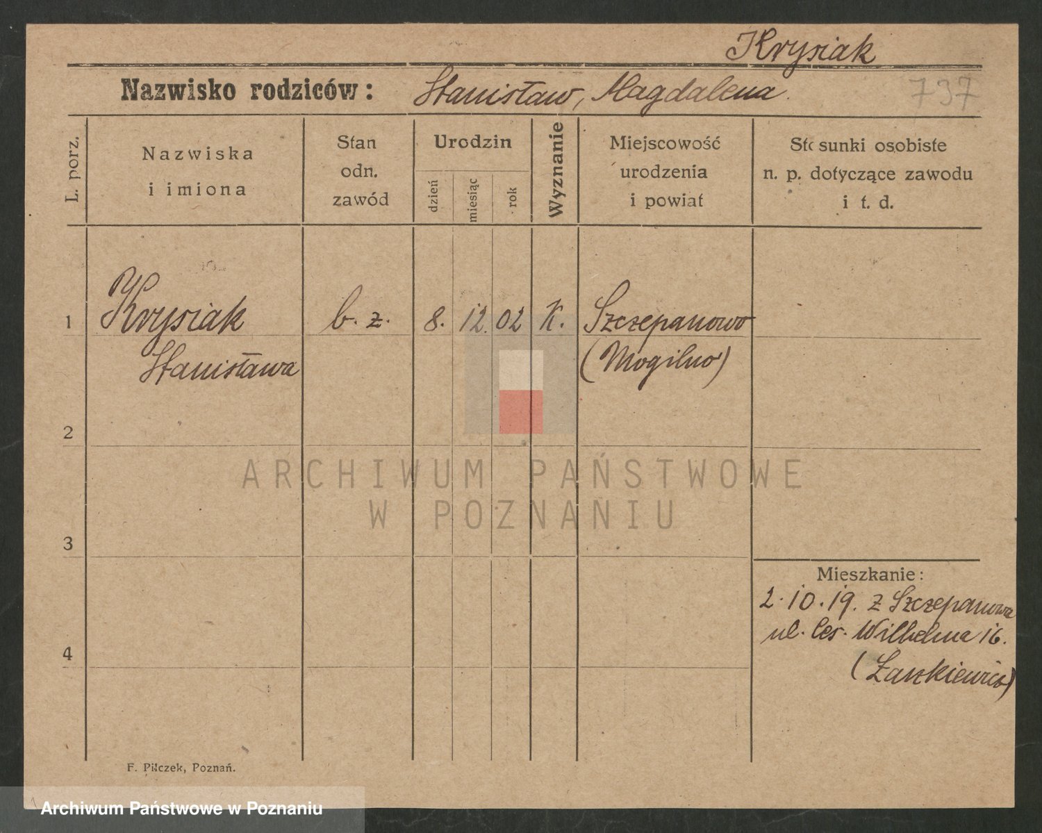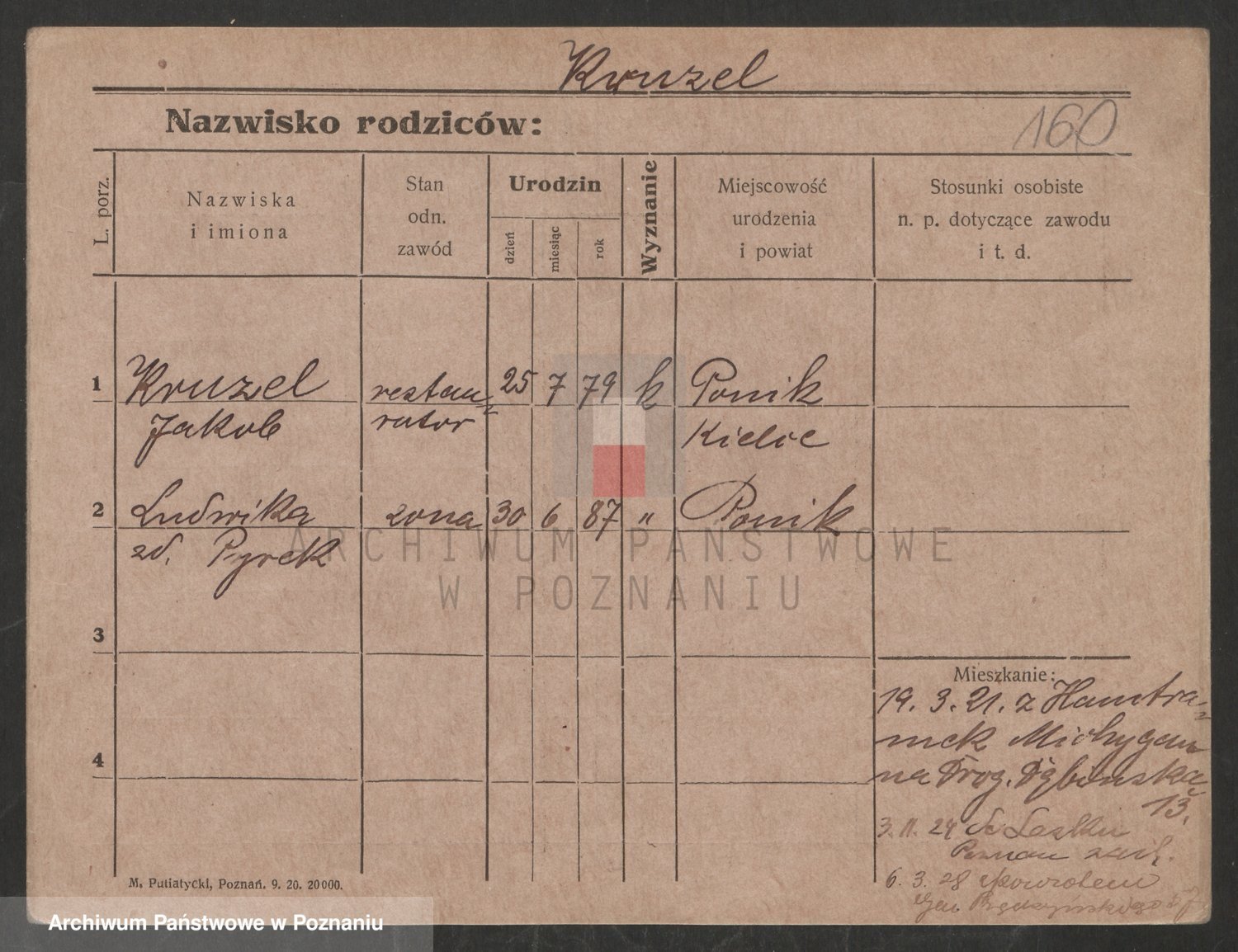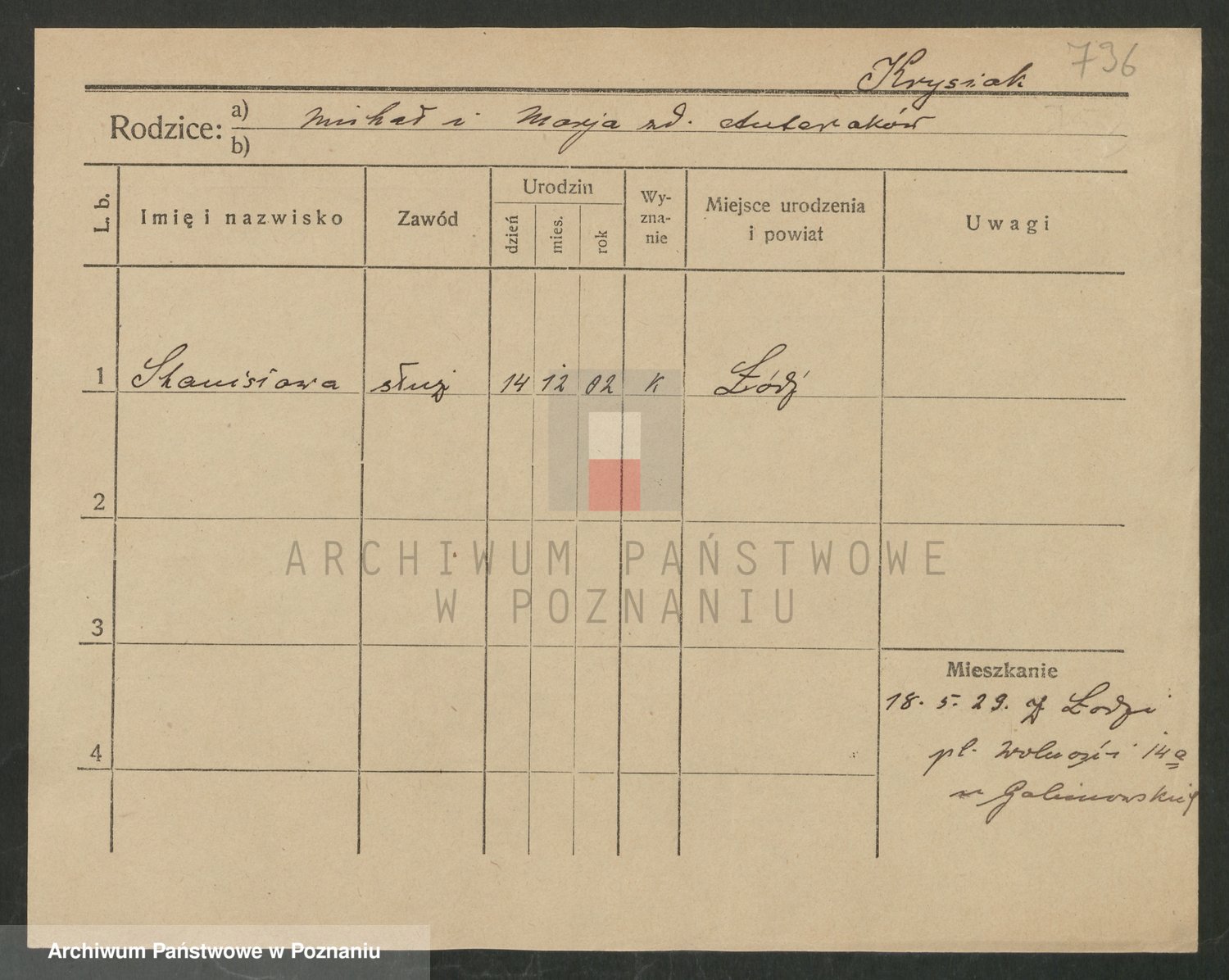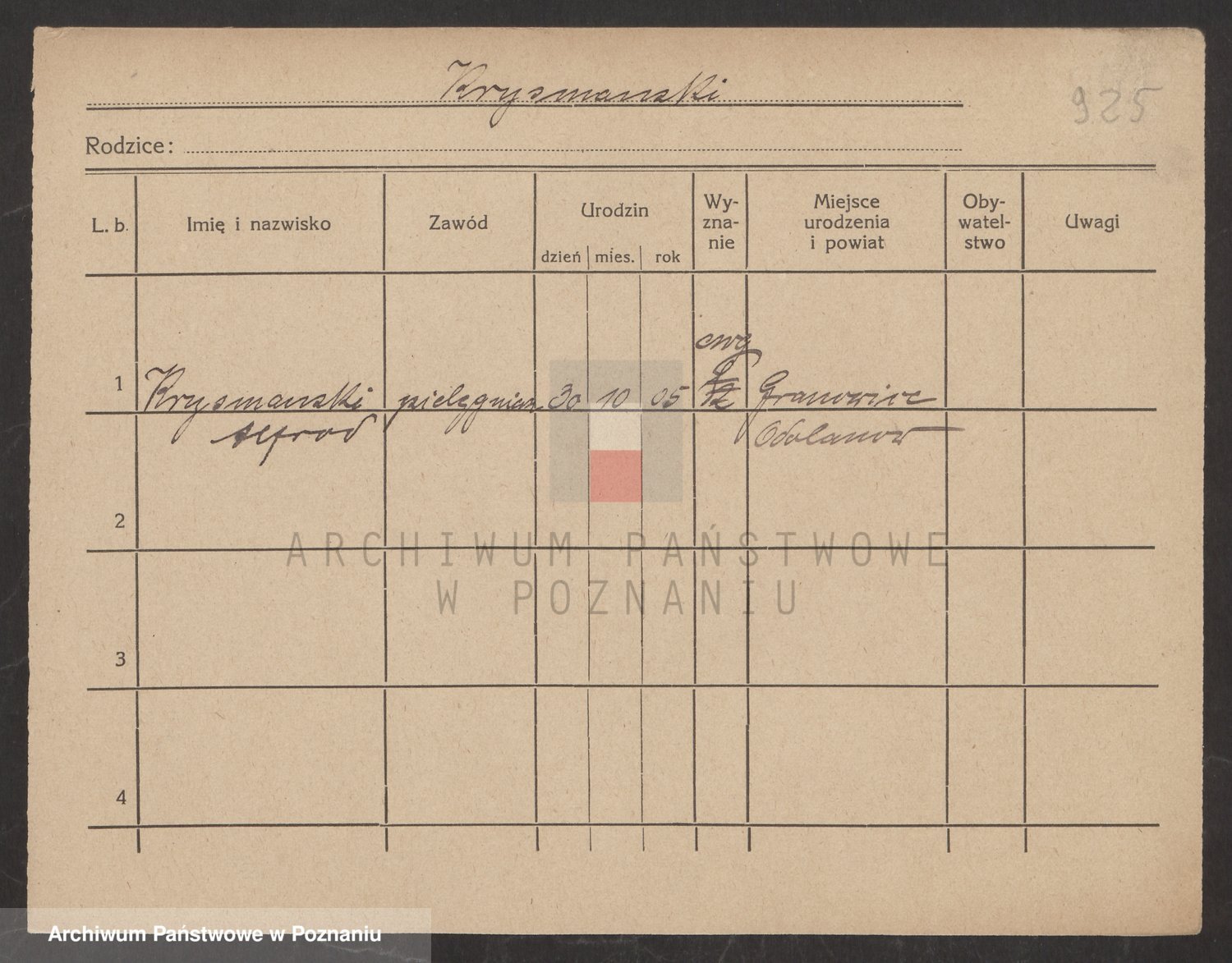 Podgląd karty osobowej dostępny jest po kliknięciu na nazwisko lub ikonkę karty. Można dokonywać powiększenia (ikony na górze) lub przechodzić między kolejnymi skanami (strzałki po bokach).