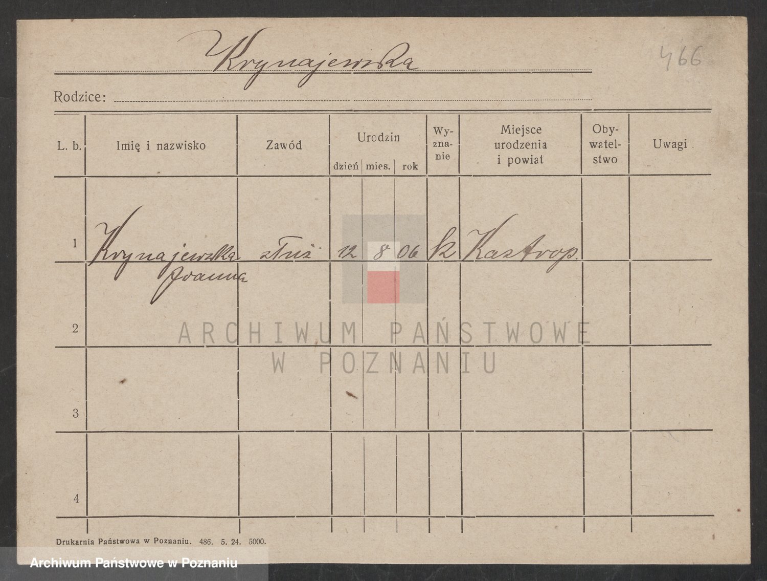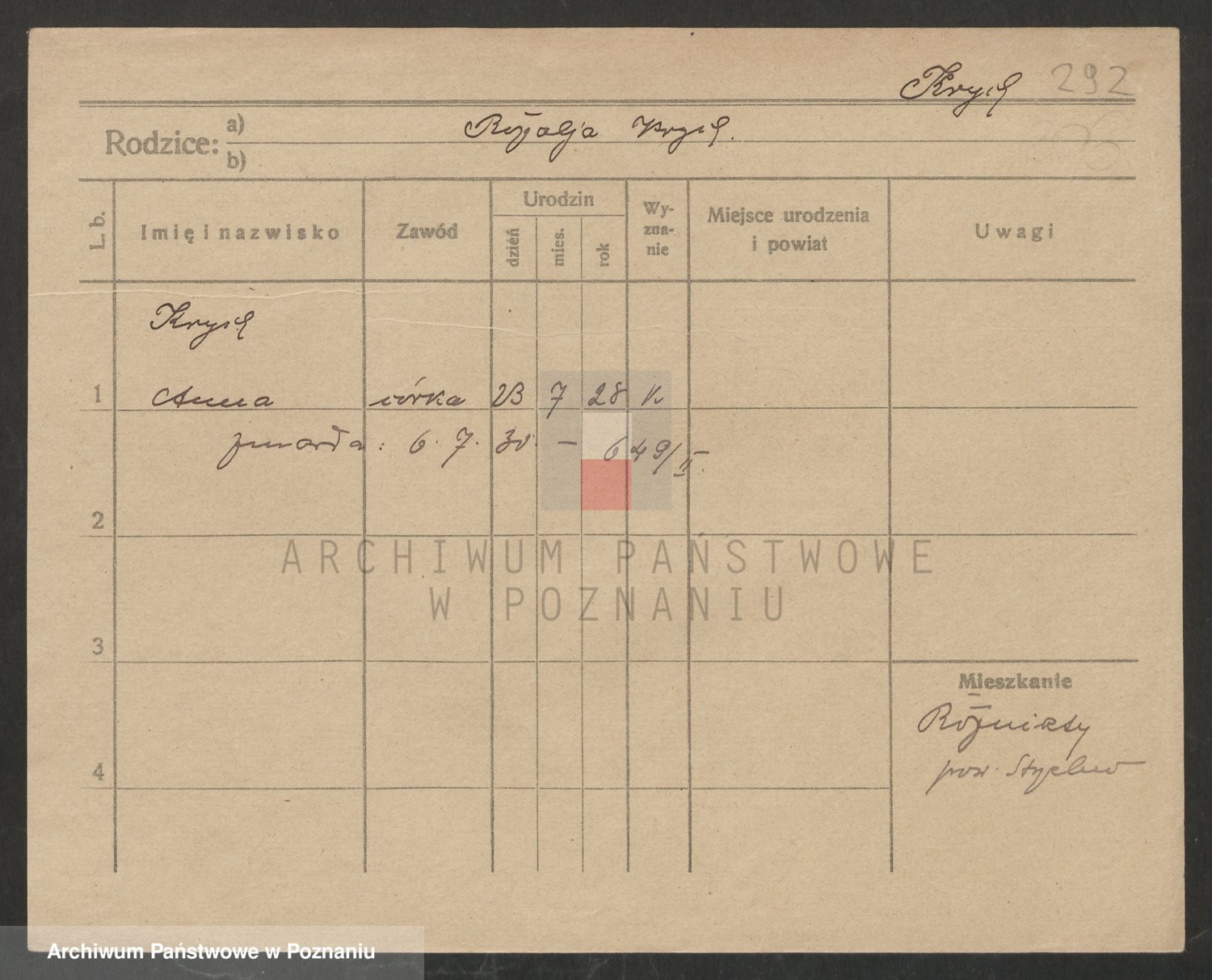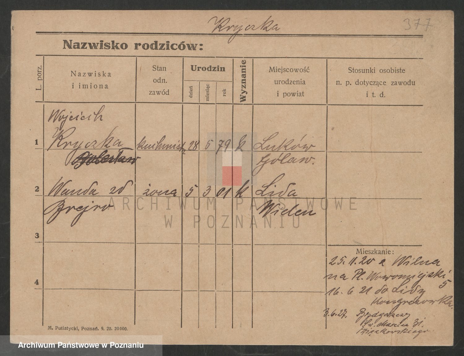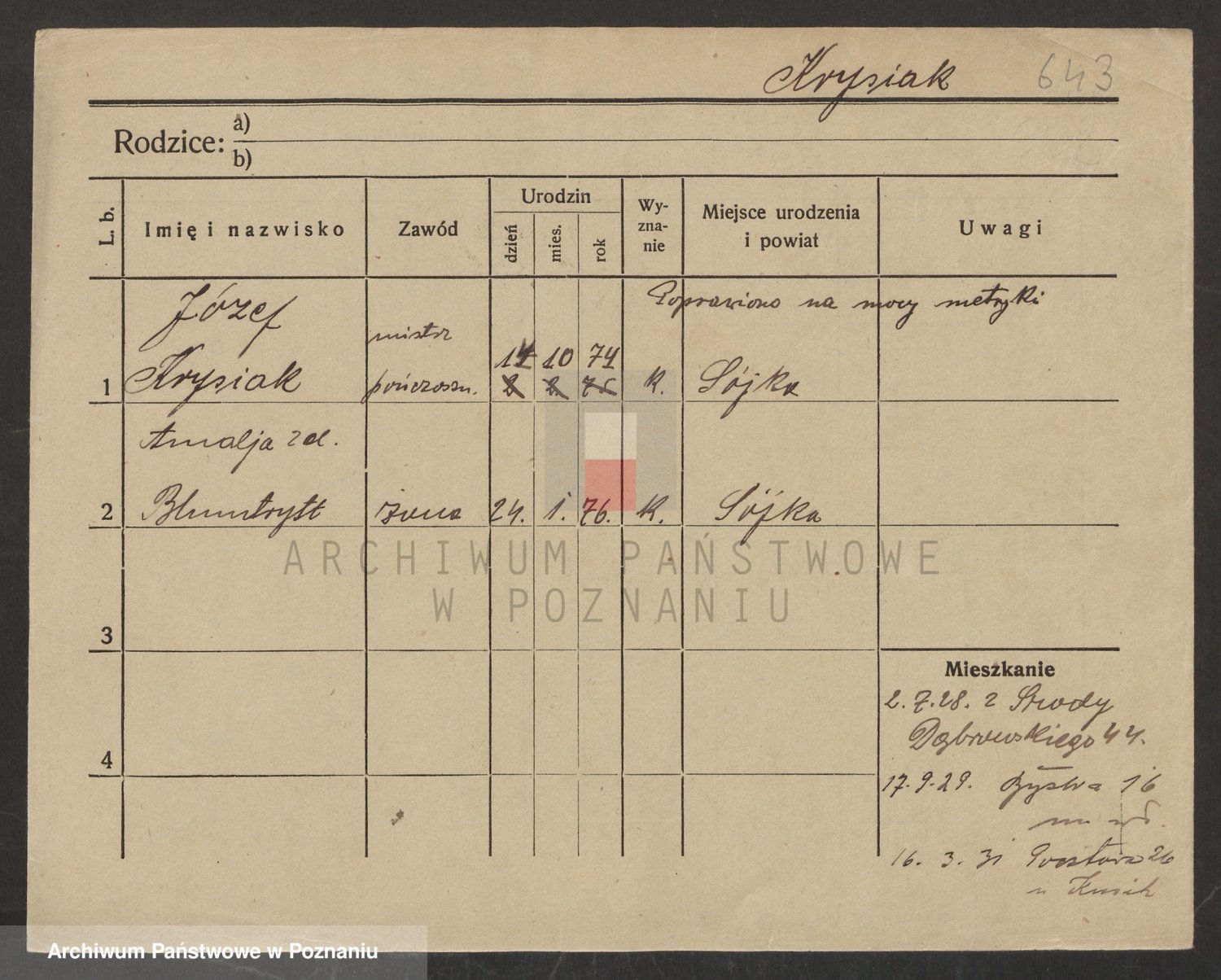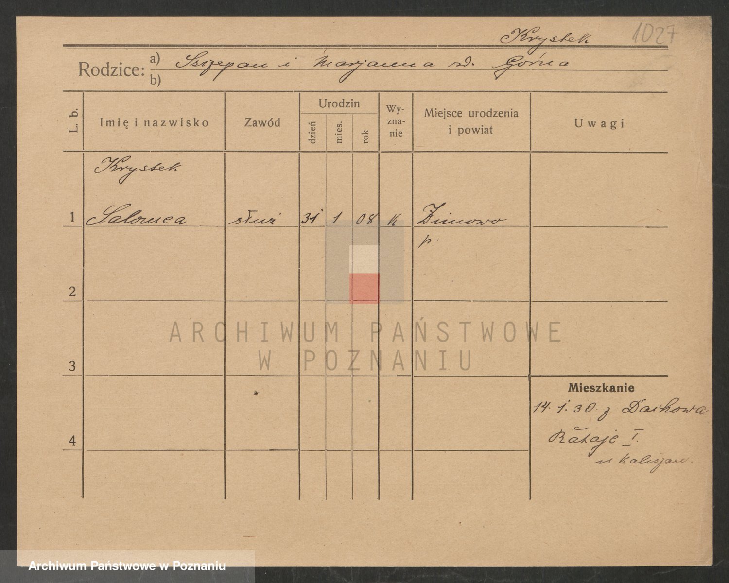 Podgląd karty osobowej dostępny jest po kliknięciu na nazwisko lub ikonkę karty. Można dokonywać powiększenia (ikony na górze) lub przechodzić między kolejnymi skanami (strzałki po bokach).