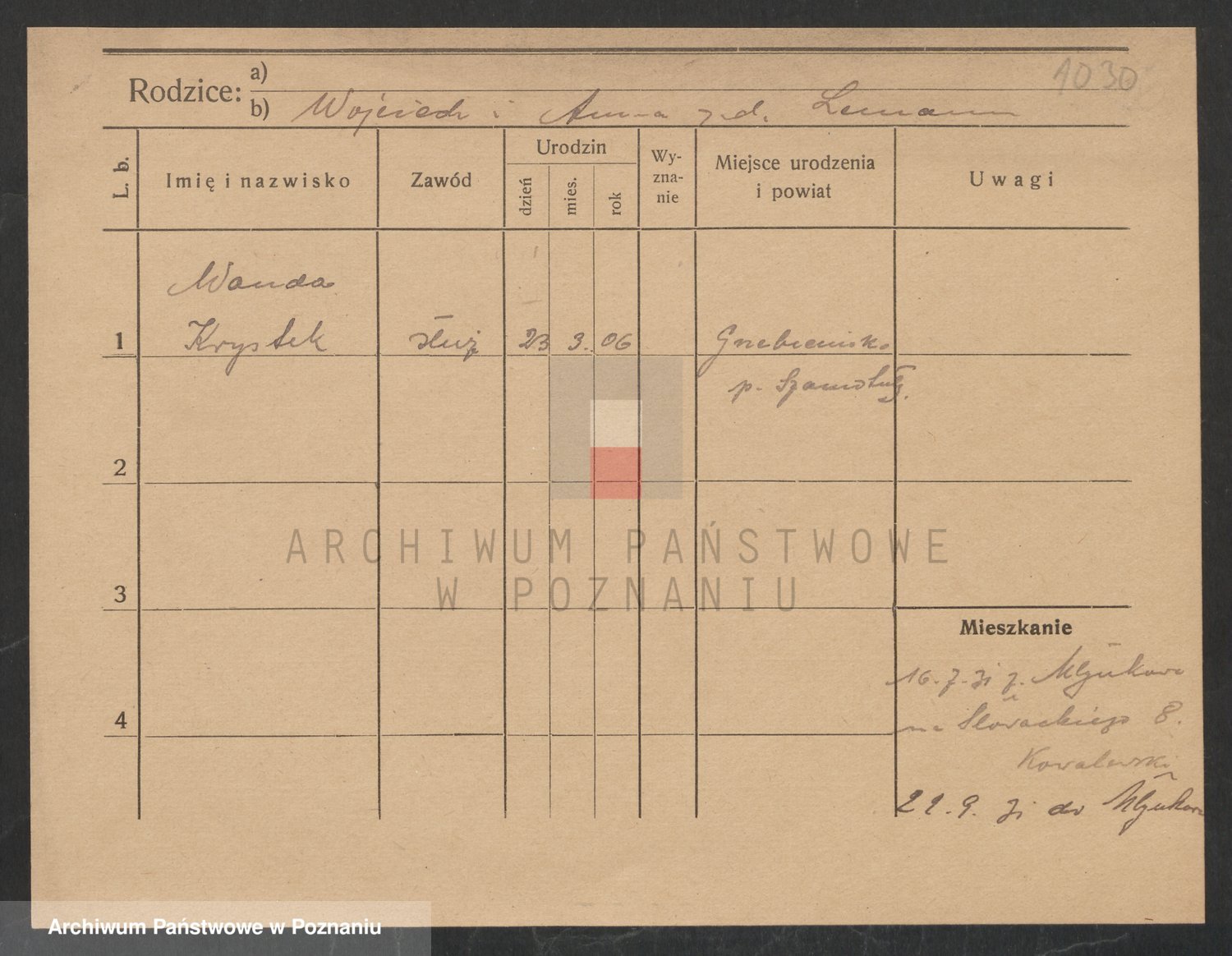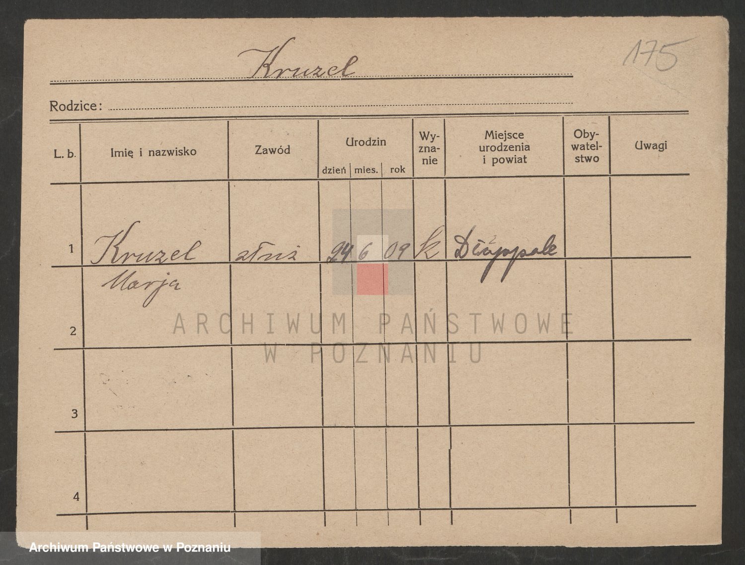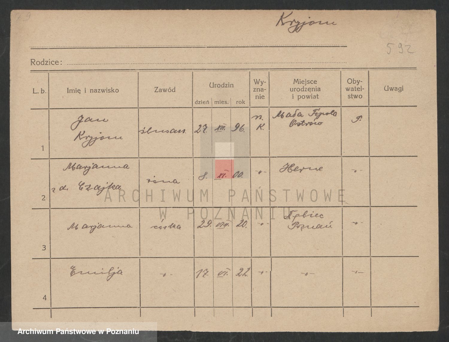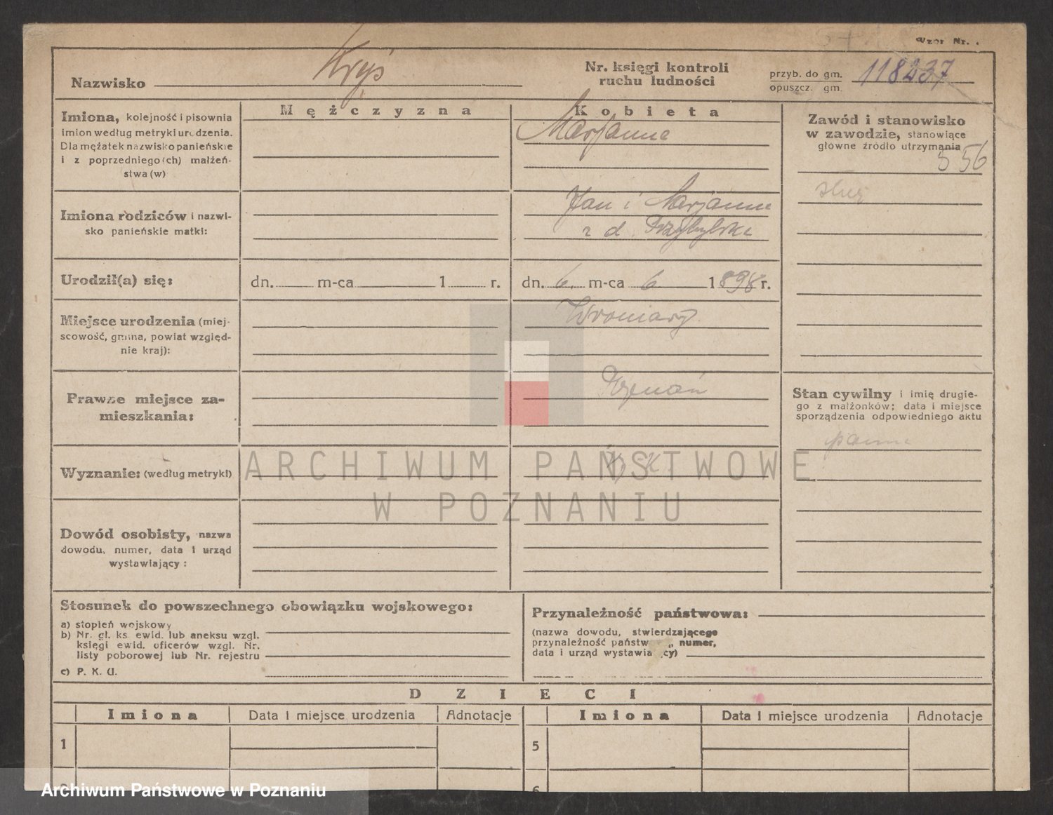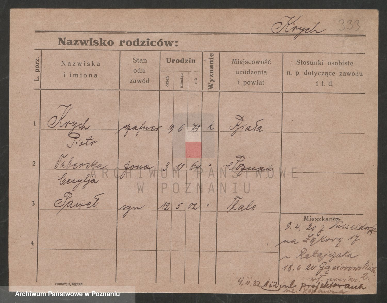 Podgląd karty osobowej dostępny jest po kliknięciu na nazwisko lub ikonkę karty. Można dokonywać powiększenia (ikony na górze) lub przechodzić między kolejnymi skanami (strzałki po bokach).