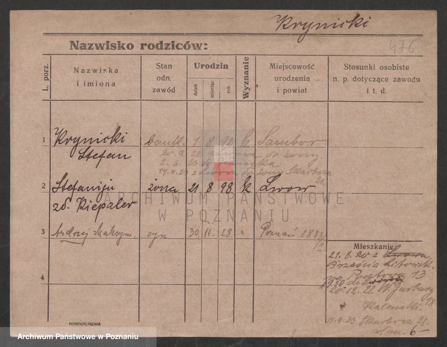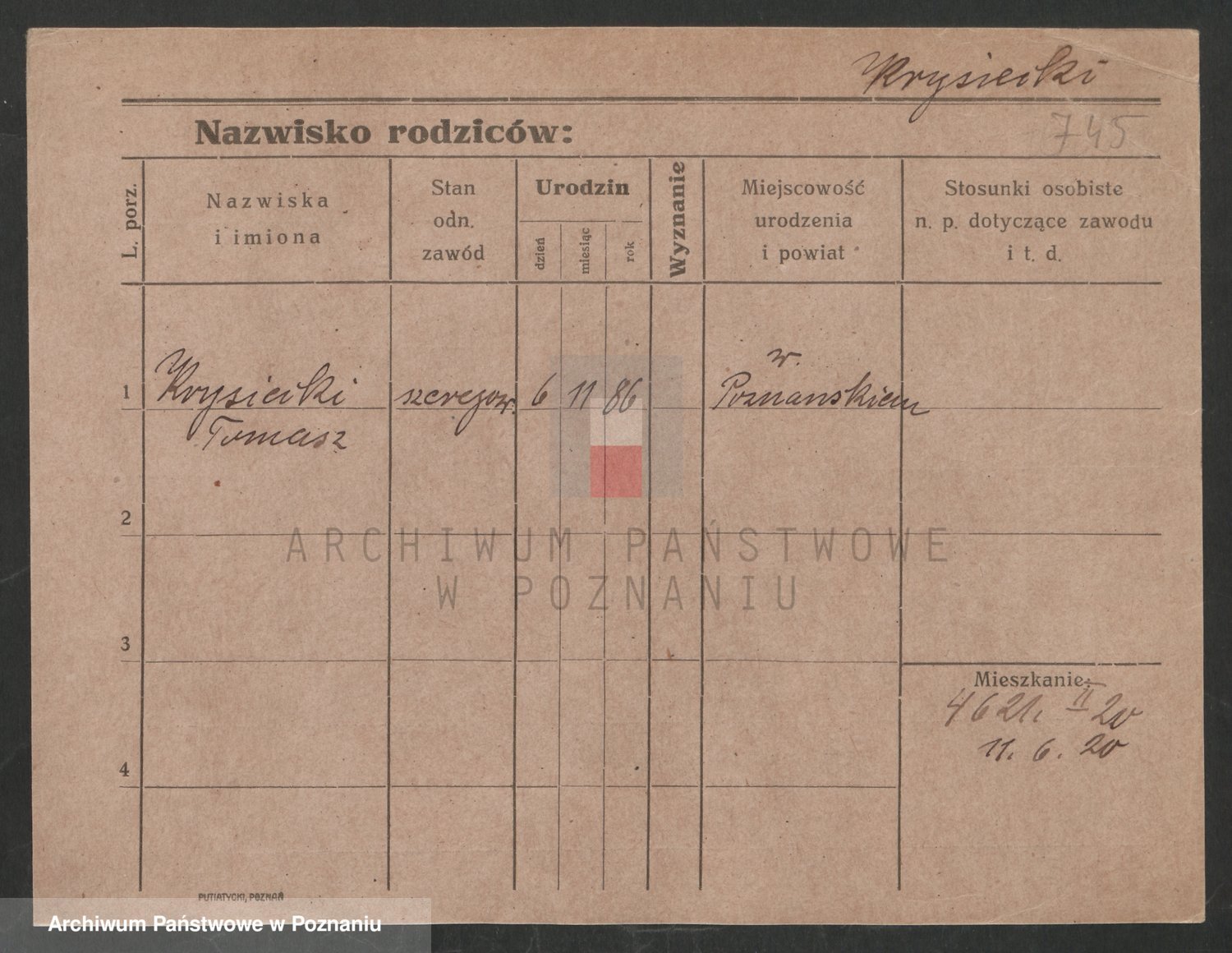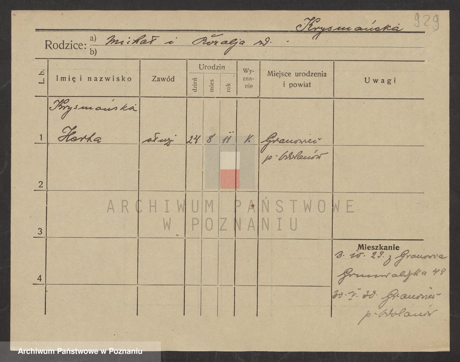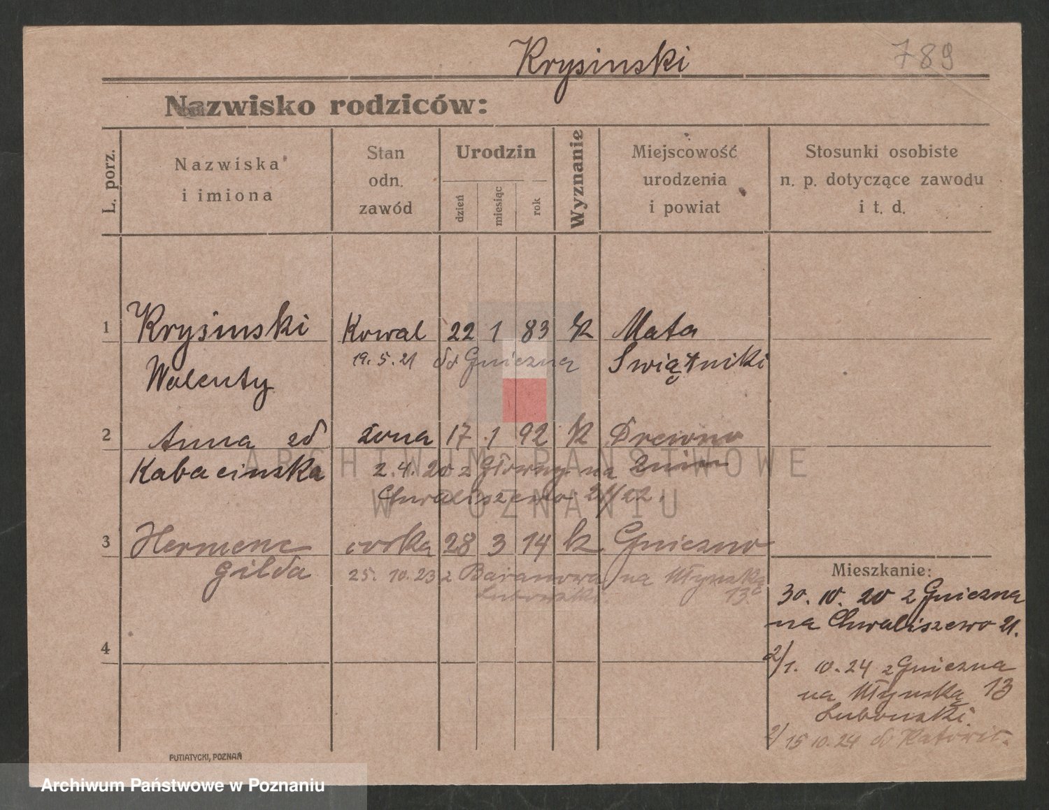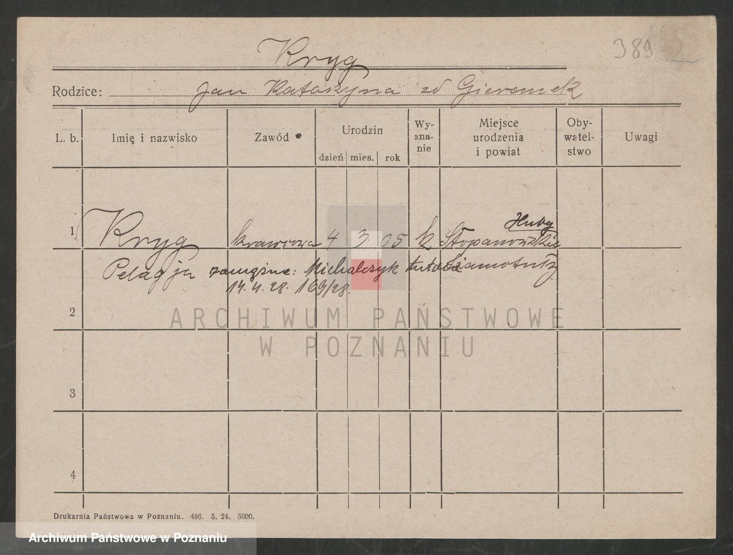 Podgląd karty osobowej dostępny jest po kliknięciu na nazwisko lub ikonkę karty. Można dokonywać powiększenia (ikony na górze) lub przechodzić między kolejnymi skanami (strzałki po bokach).