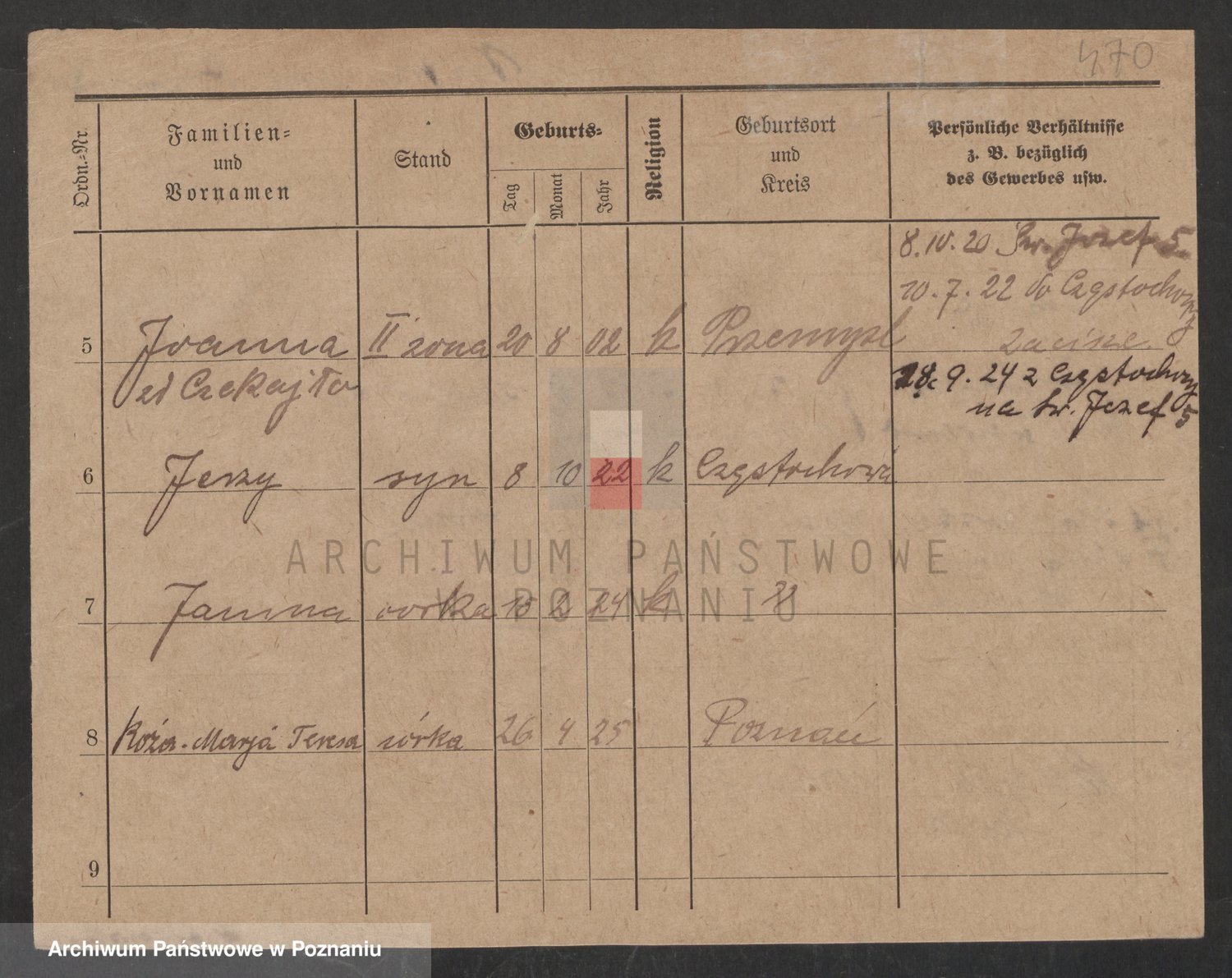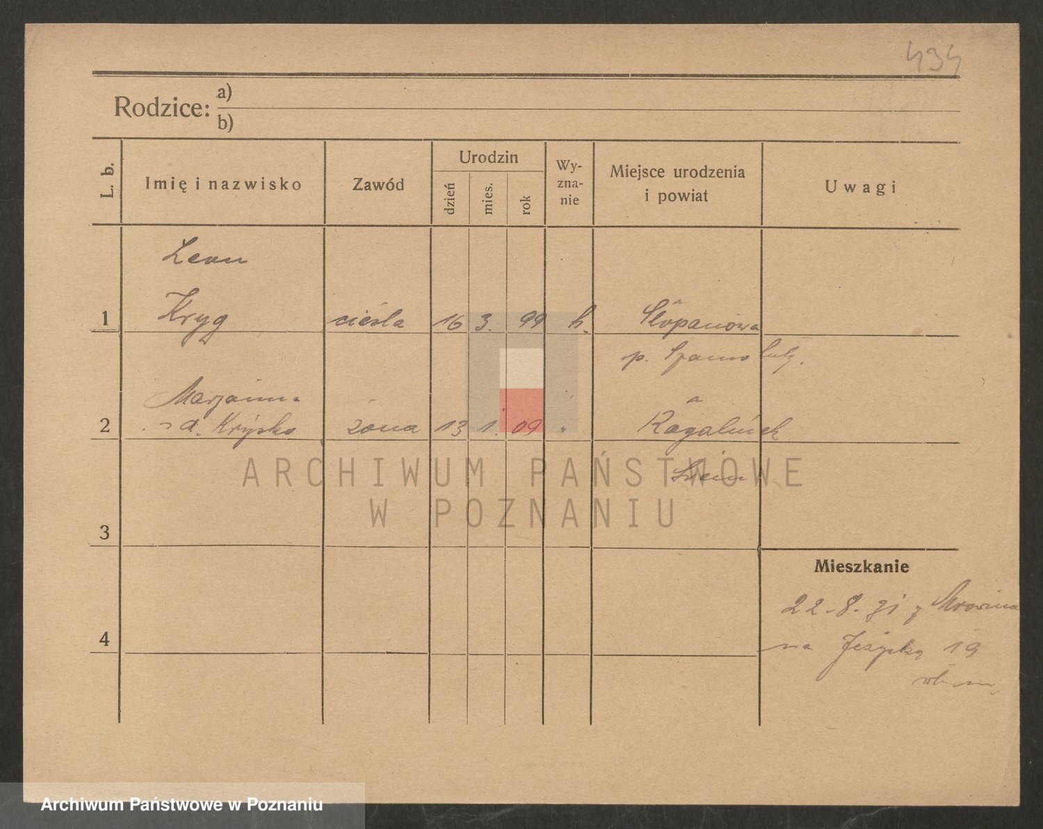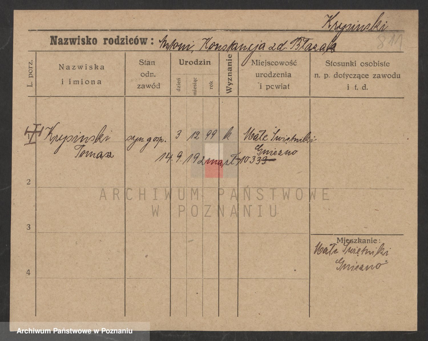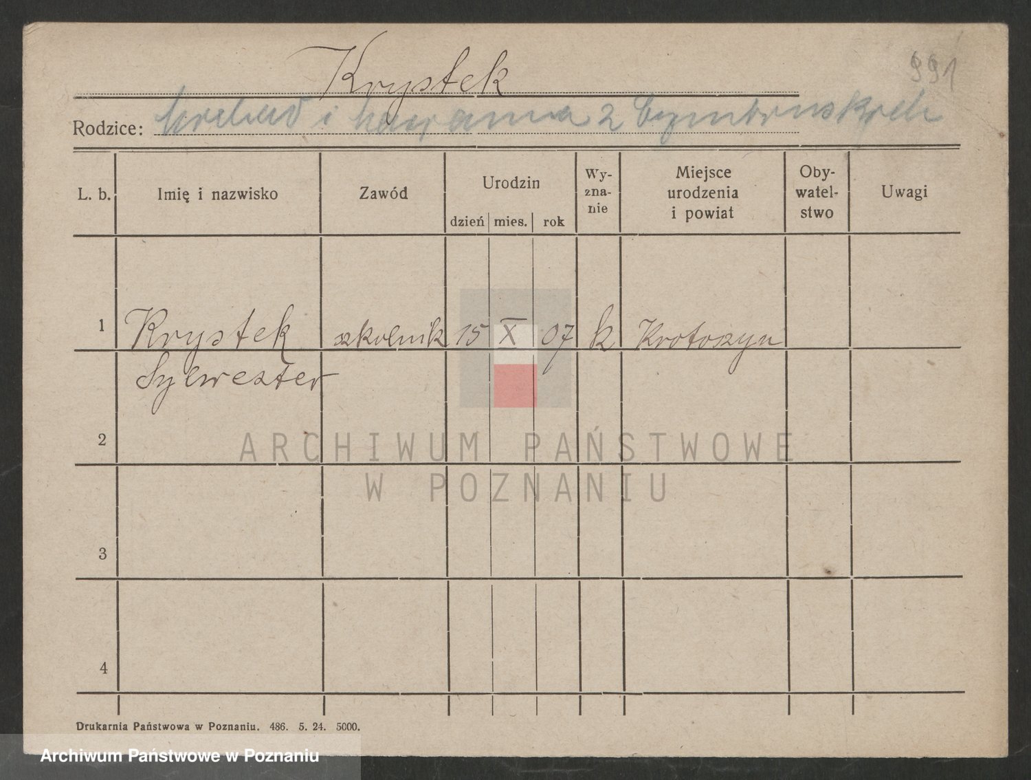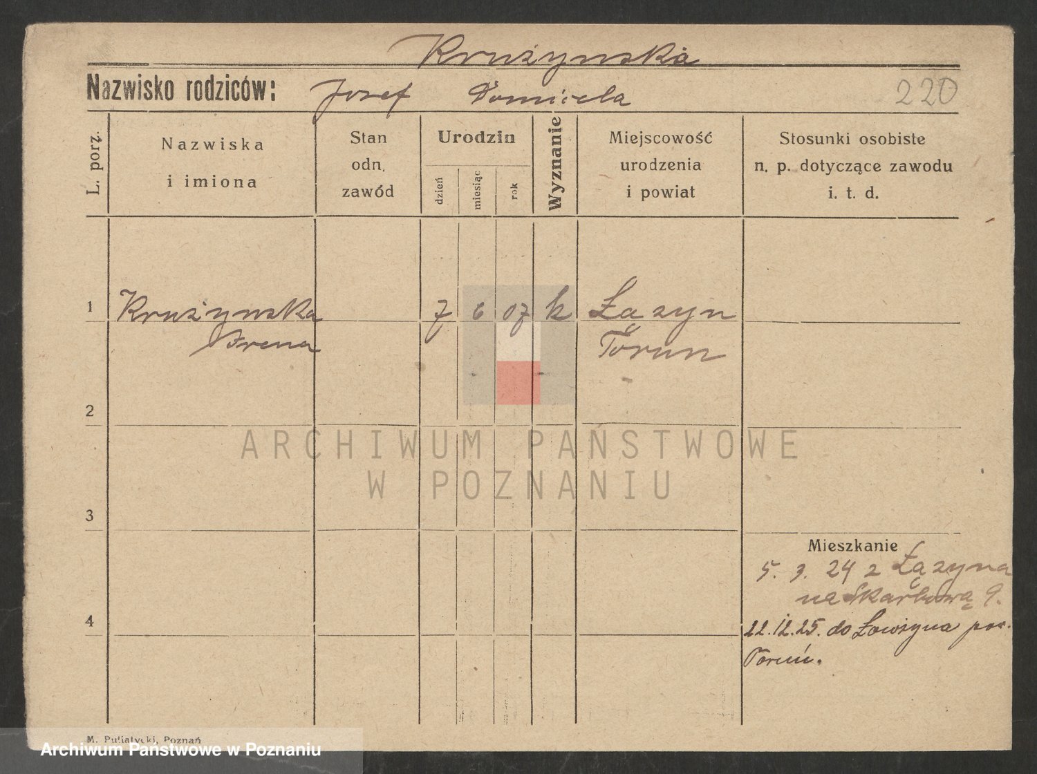 Podgląd karty osobowej dostępny jest po kliknięciu na nazwisko lub ikonkę karty. Można dokonywać powiększenia (ikony na górze) lub przechodzić między kolejnymi skanami (strzałki po bokach).