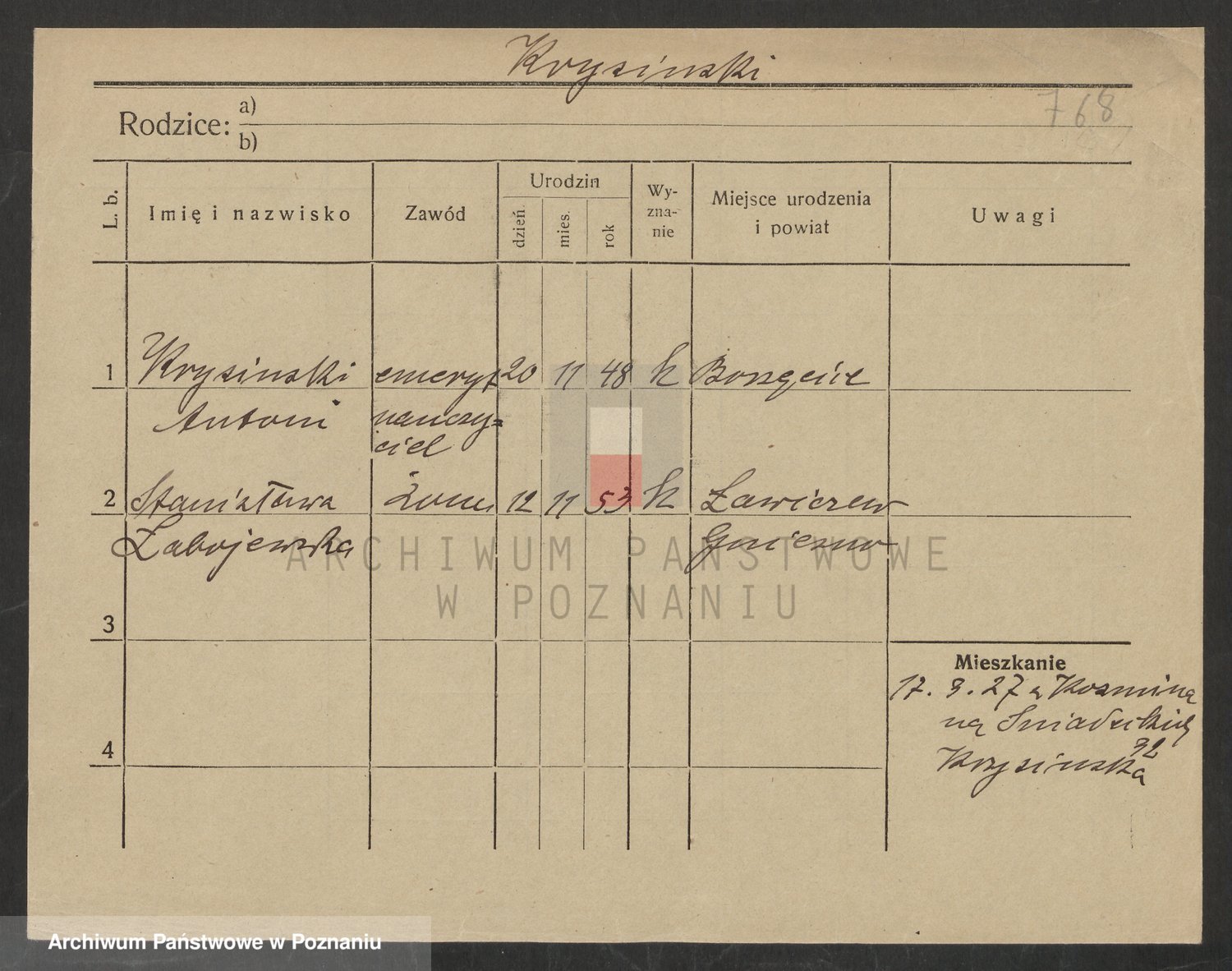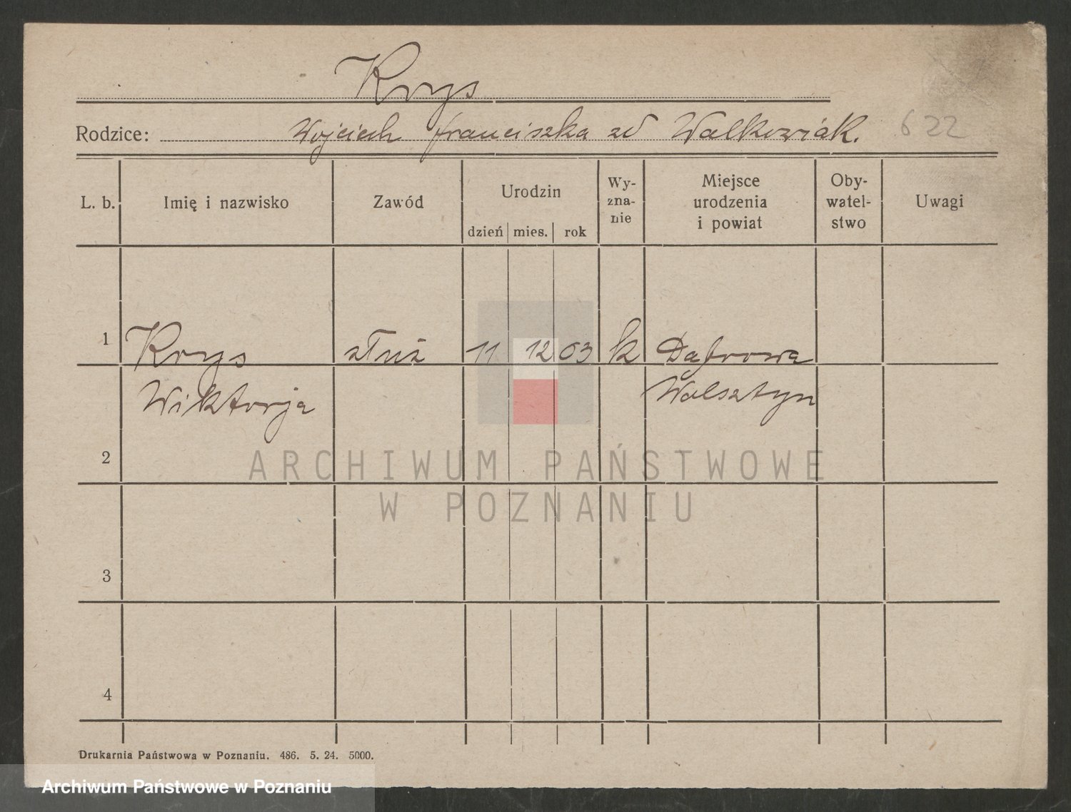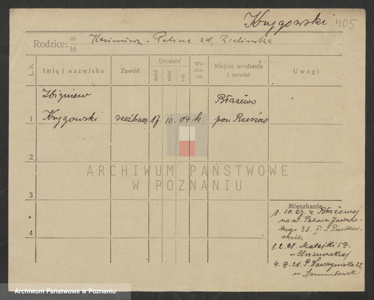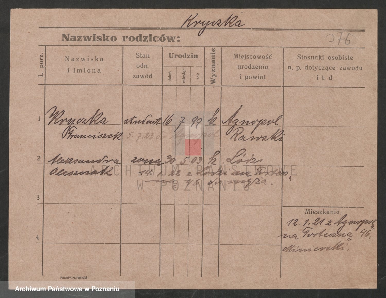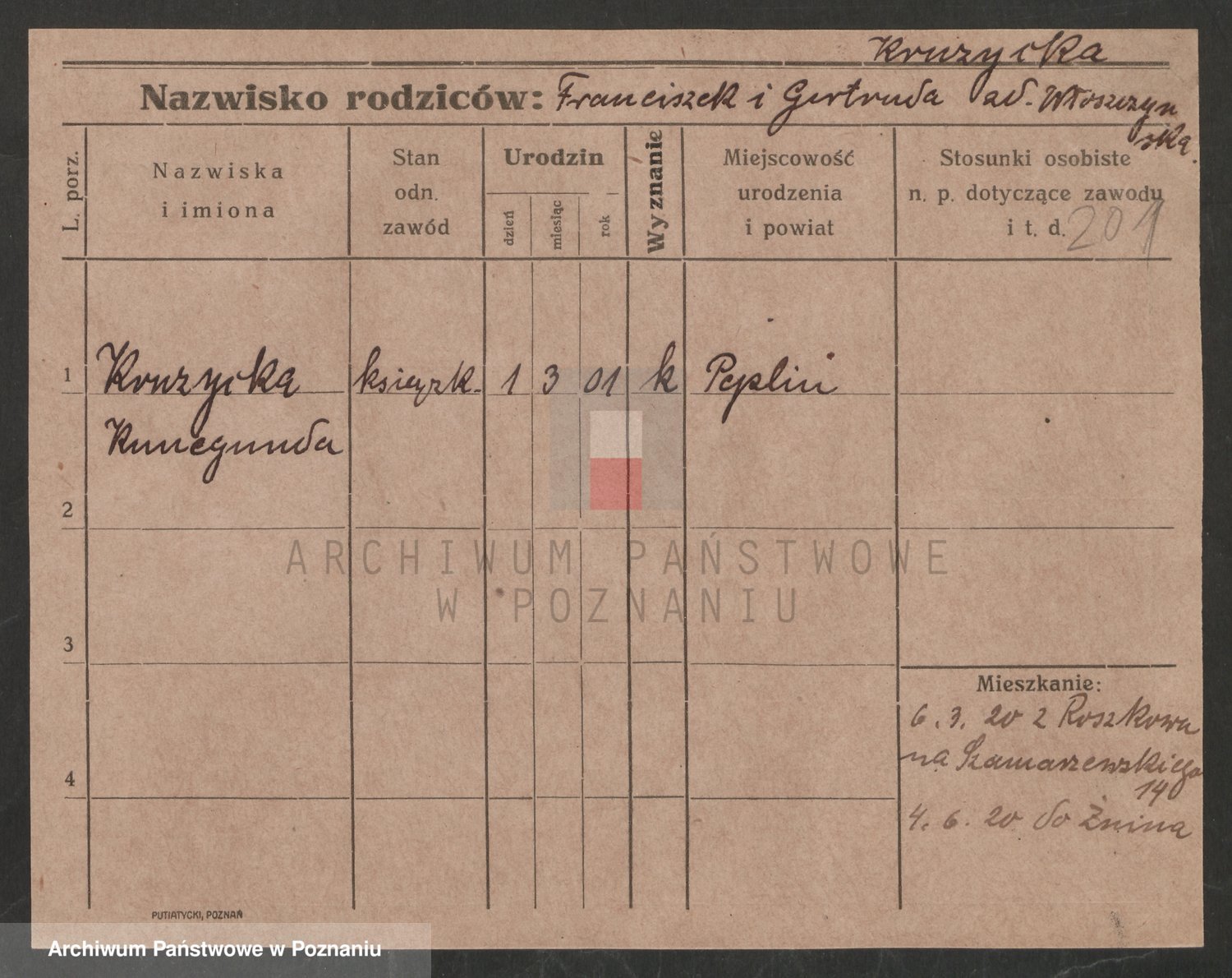 Podgląd karty osobowej dostępny jest po kliknięciu na nazwisko lub ikonkę karty. Można dokonywać powiększenia (ikony na górze) lub przechodzić między kolejnymi skanami (strzałki po bokach).