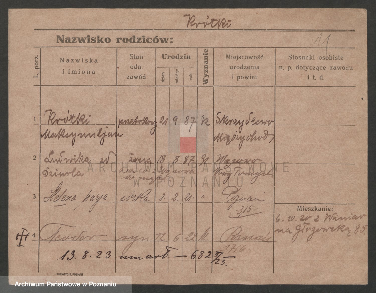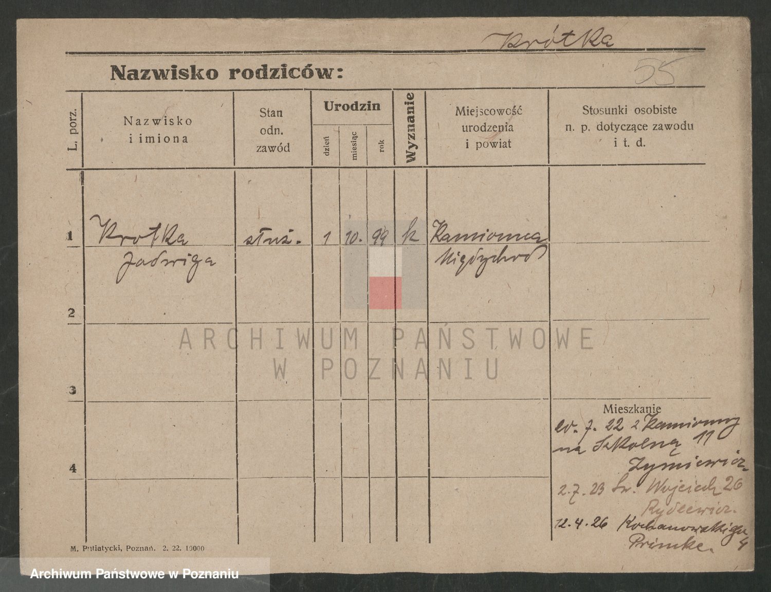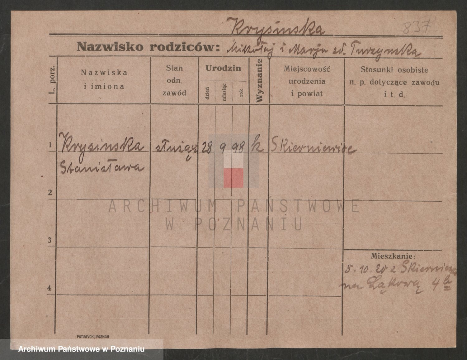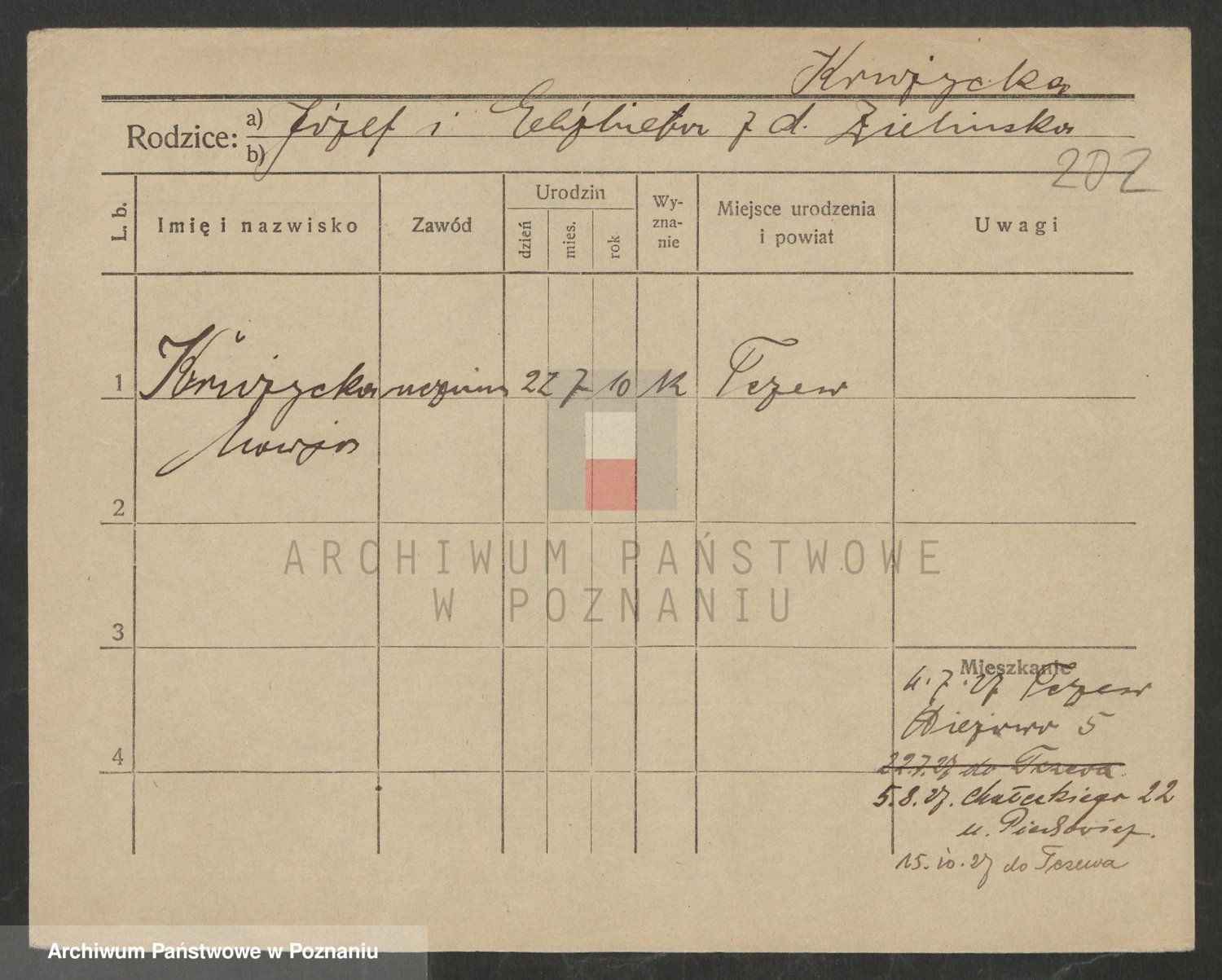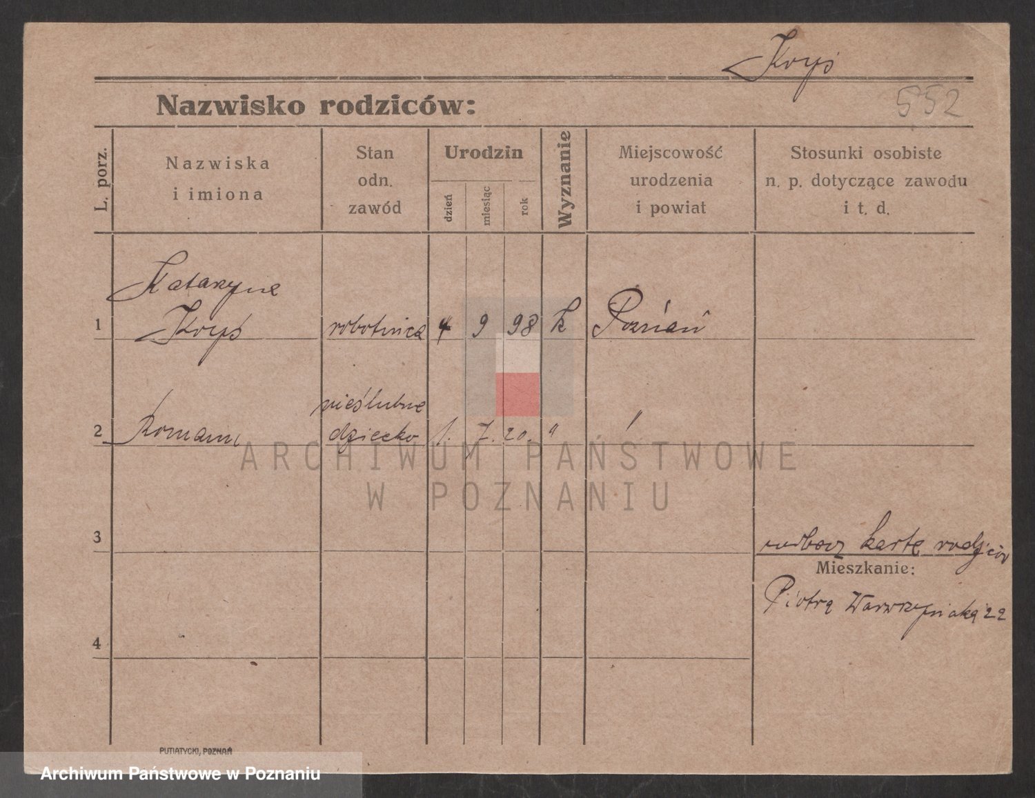 Podgląd karty osobowej dostępny jest po kliknięciu na nazwisko lub ikonkę karty. Można dokonywać powiększenia (ikony na górze) lub przechodzić między kolejnymi skanami (strzałki po bokach).