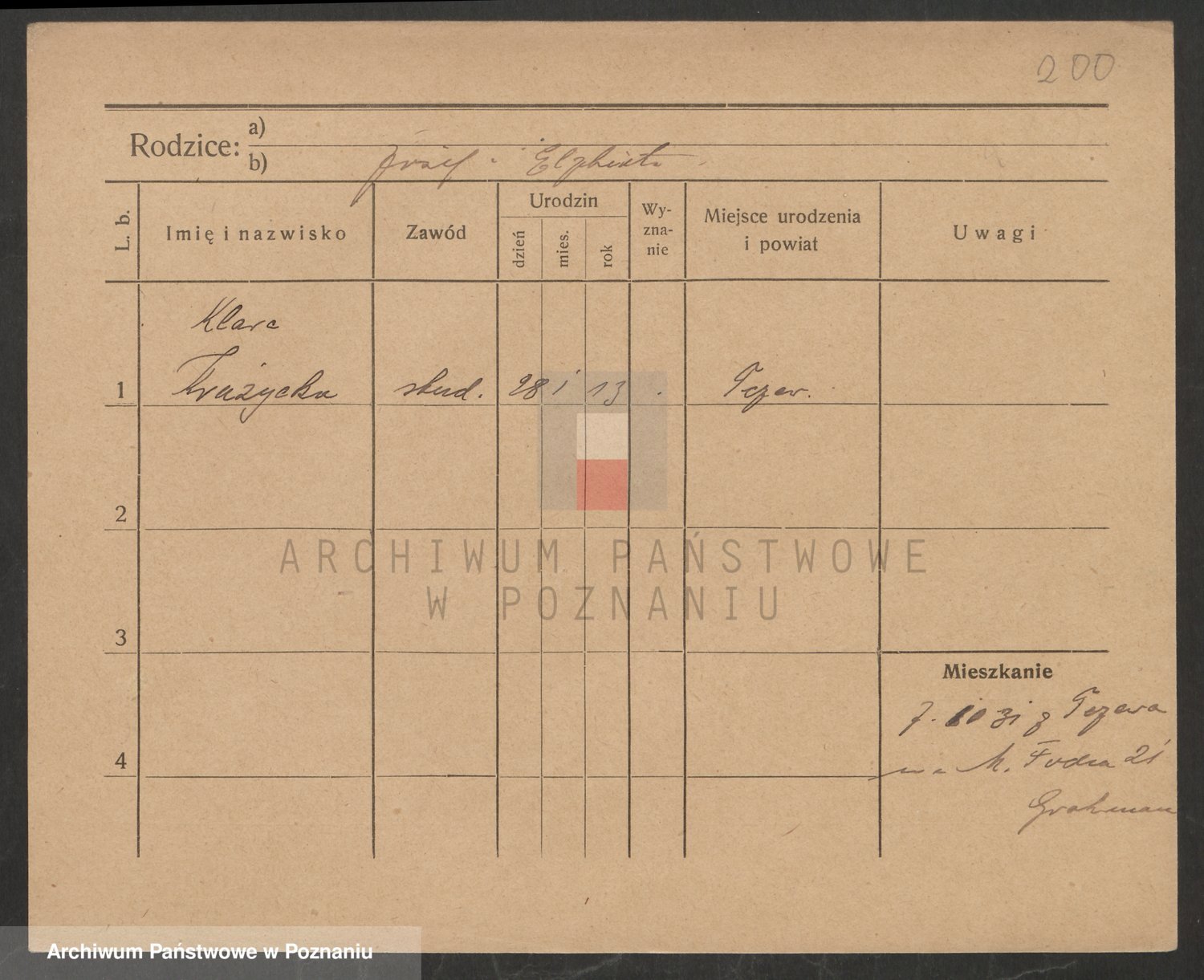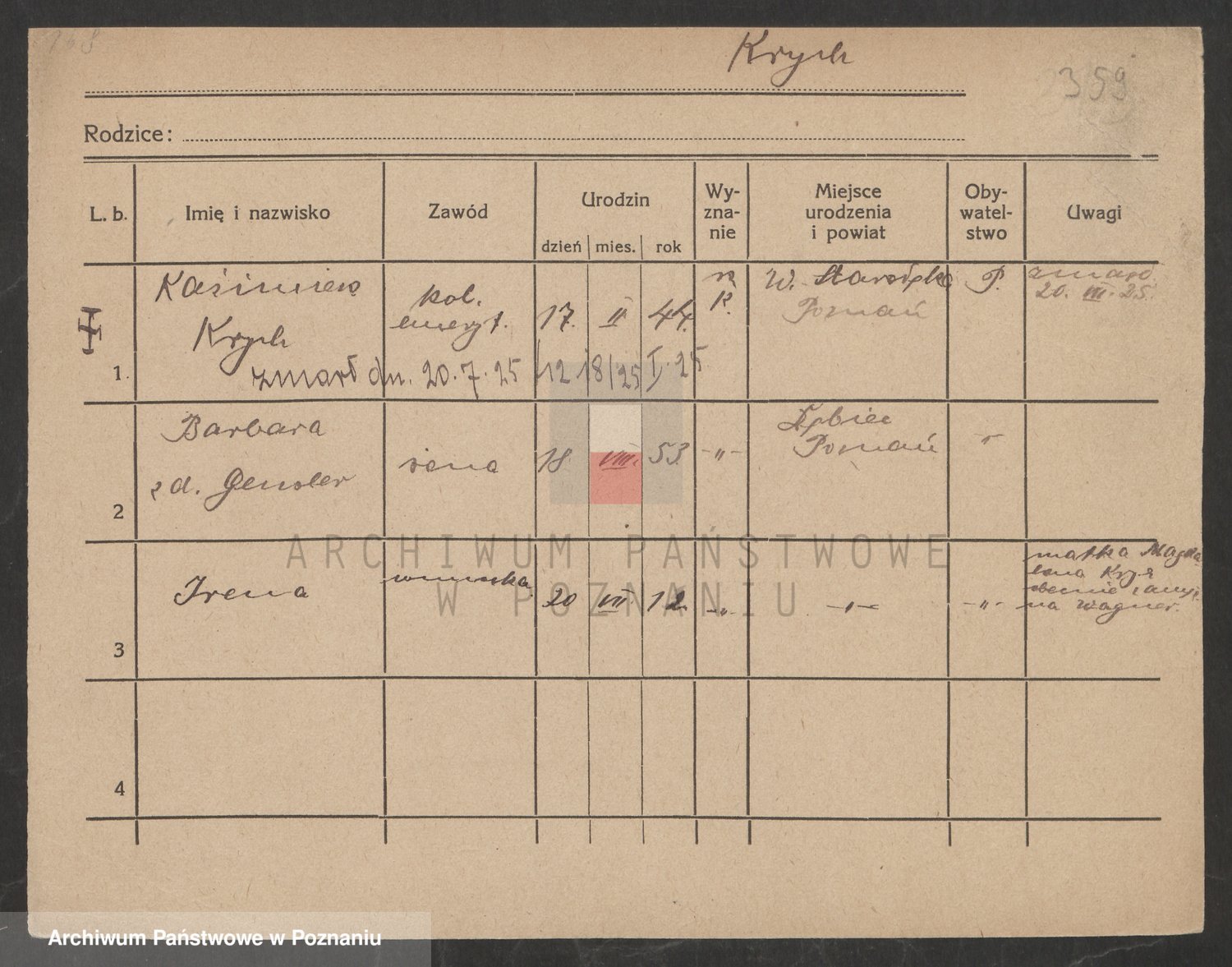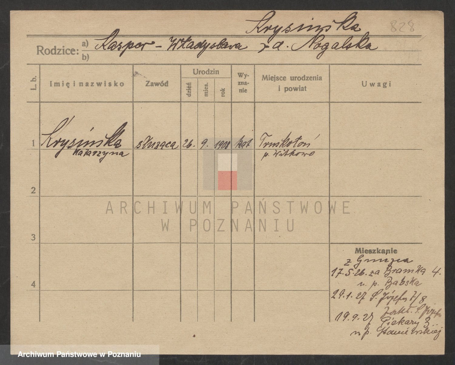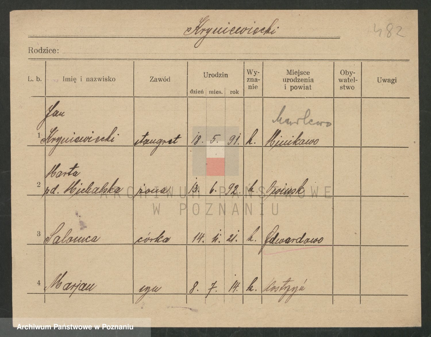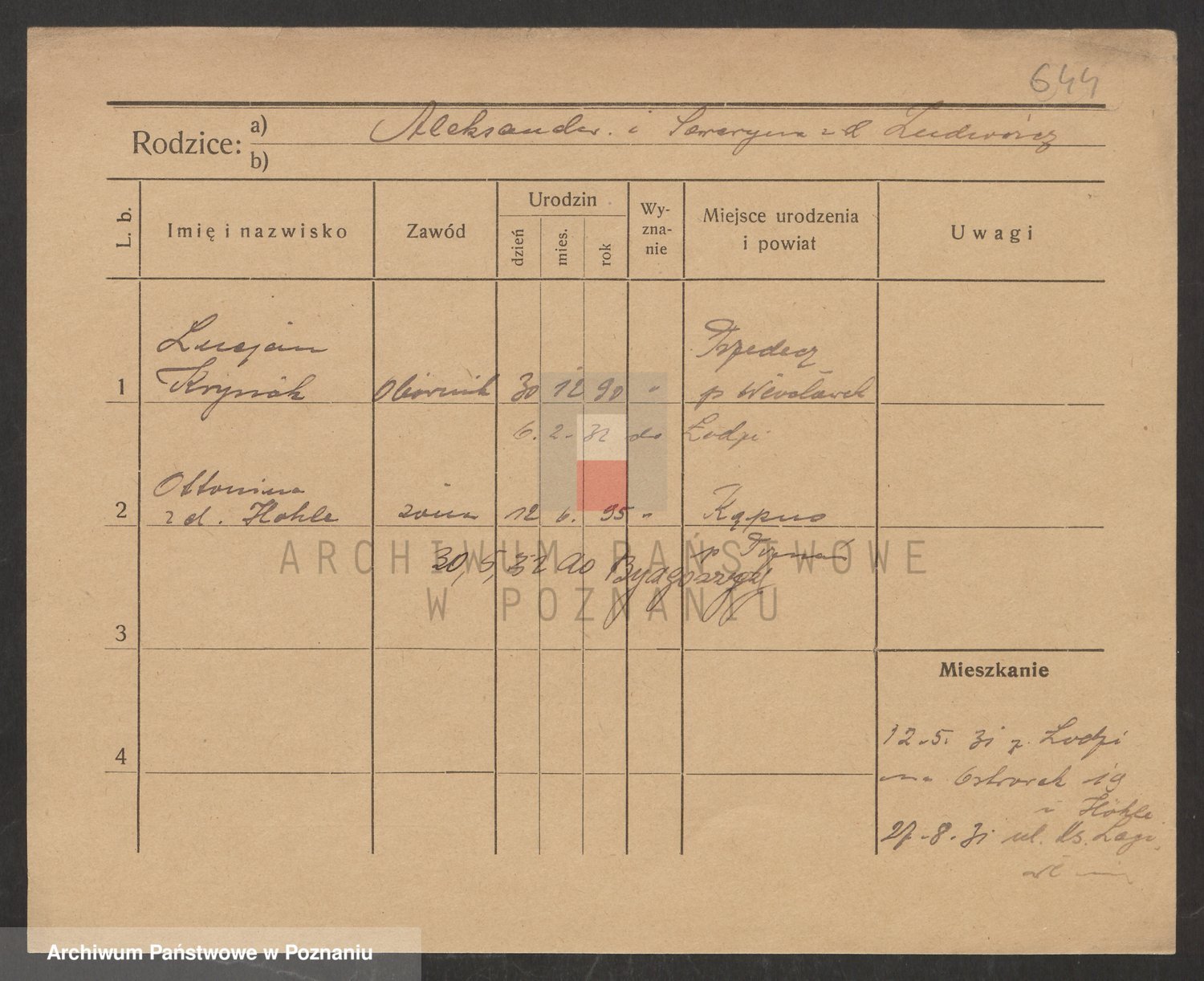 Podgląd karty osobowej dostępny jest po kliknięciu na nazwisko lub ikonkę karty. Można dokonywać powiększenia (ikony na górze) lub przechodzić między kolejnymi skanami (strzałki po bokach).