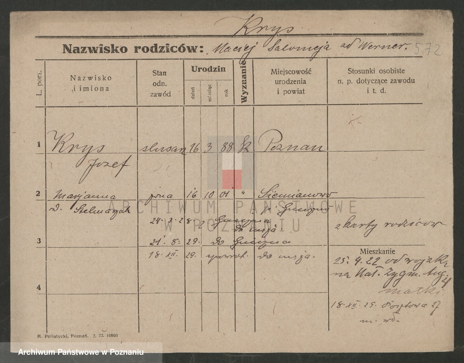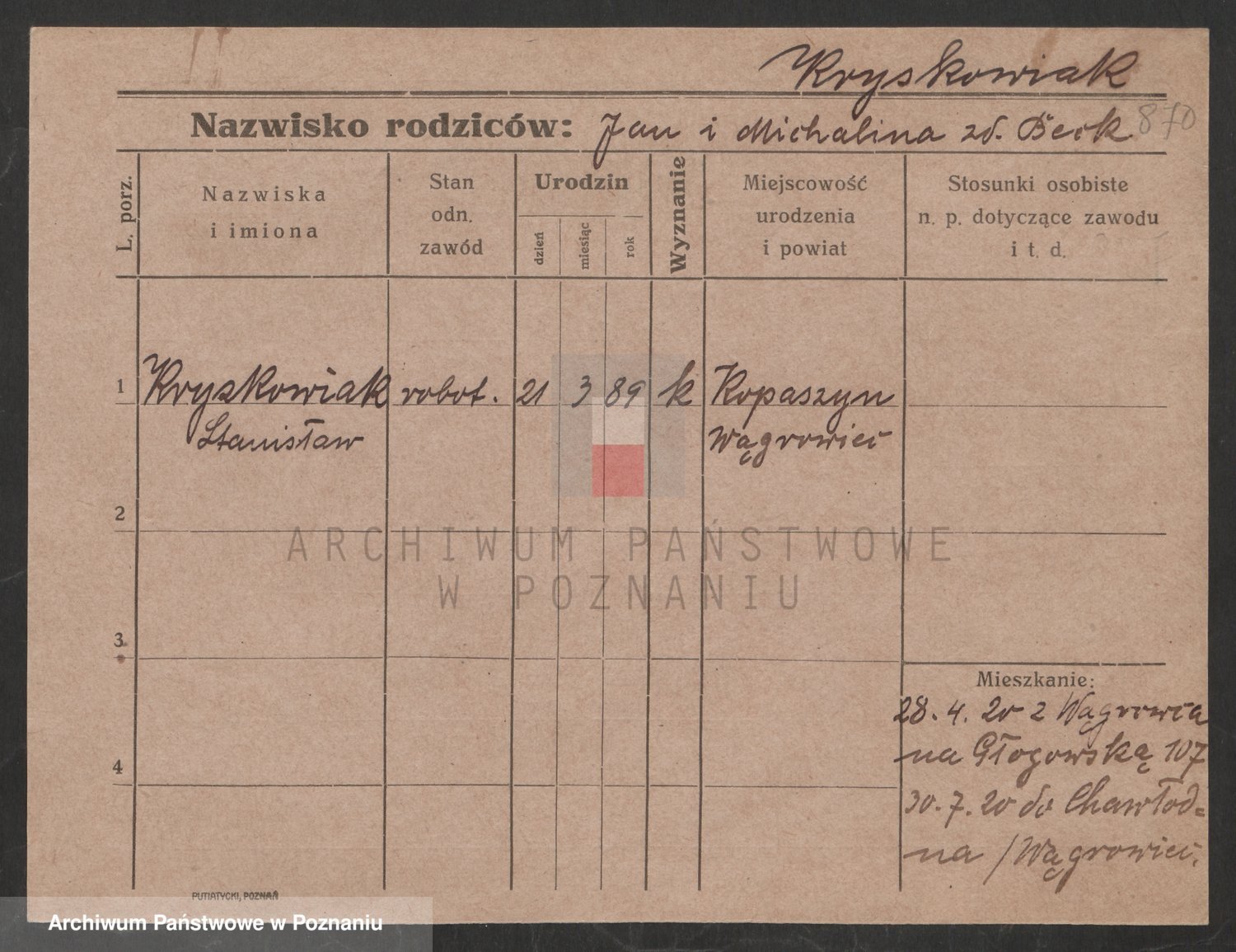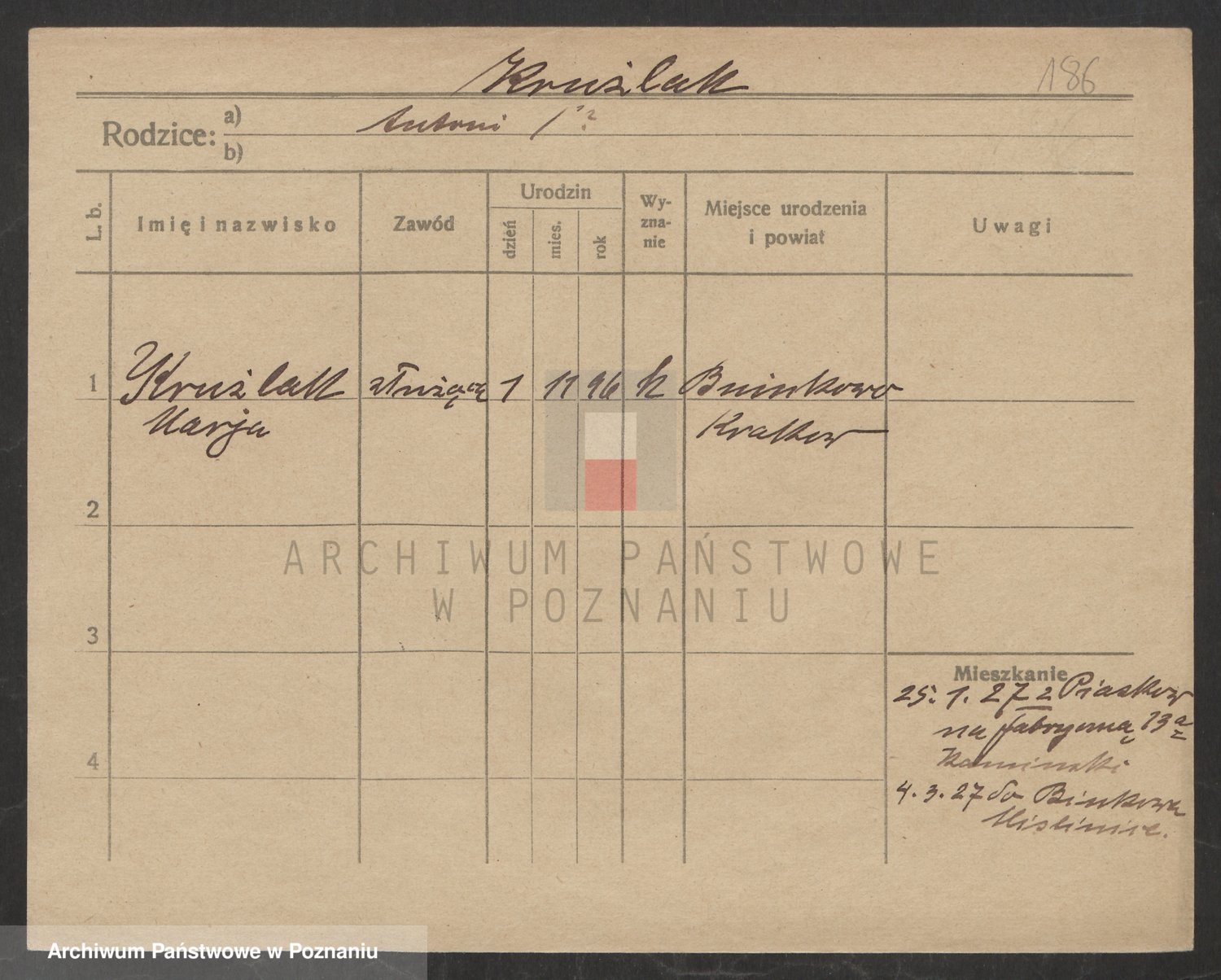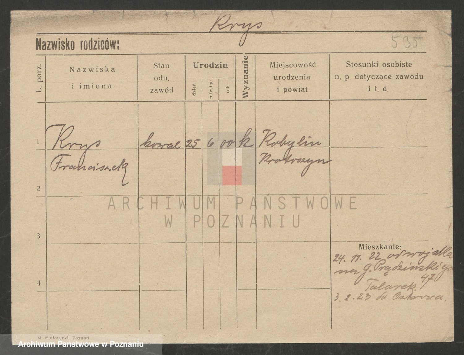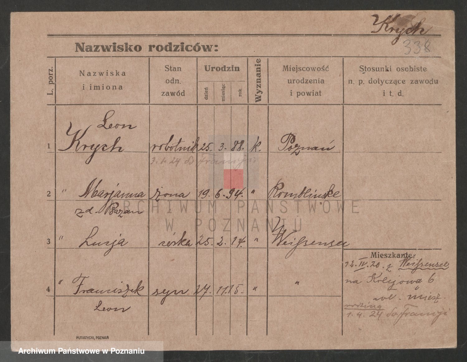 Podgląd karty osobowej dostępny jest po kliknięciu na nazwisko lub ikonkę karty. Można dokonywać powiększenia (ikony na górze) lub przechodzić między kolejnymi skanami (strzałki po bokach).