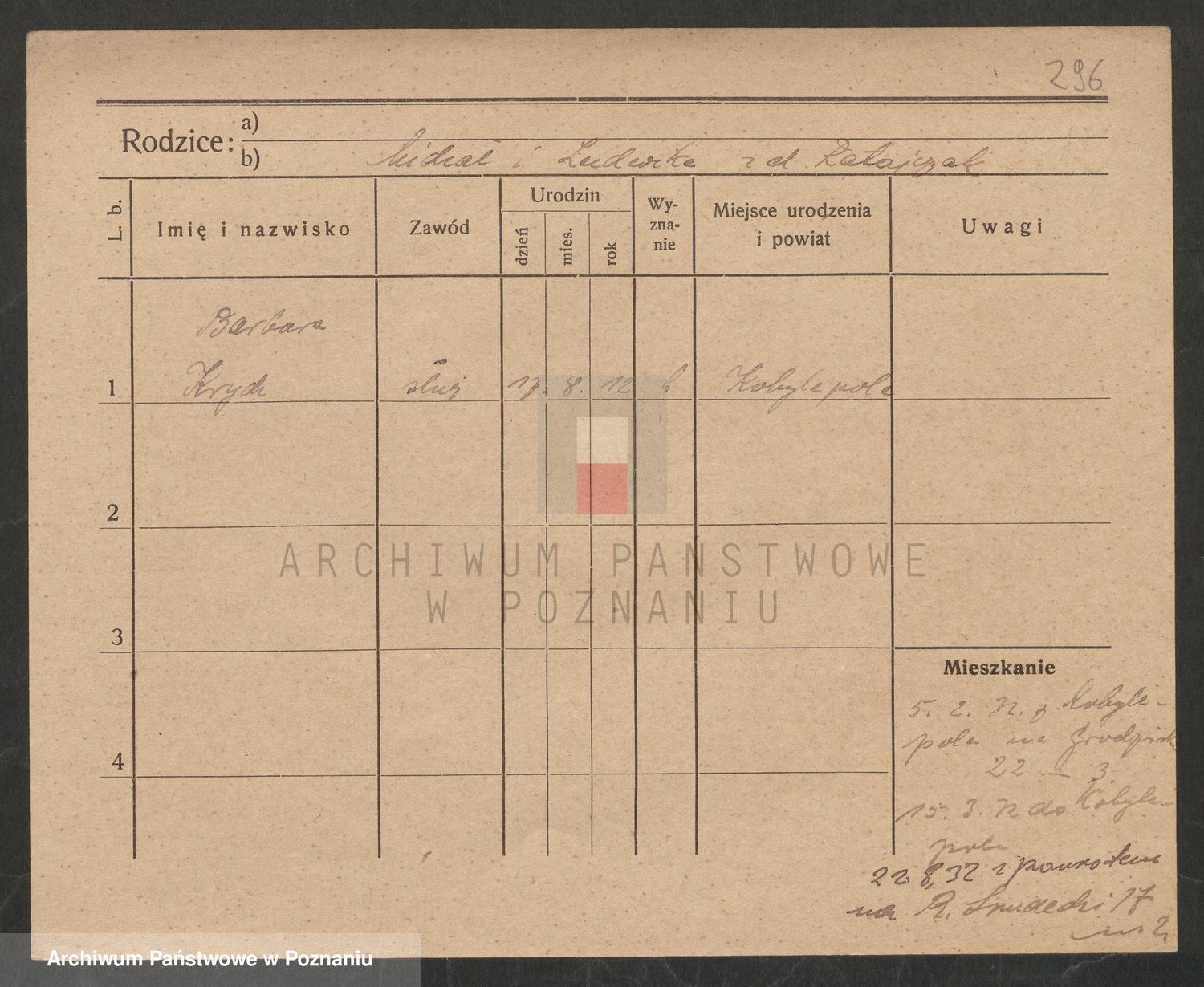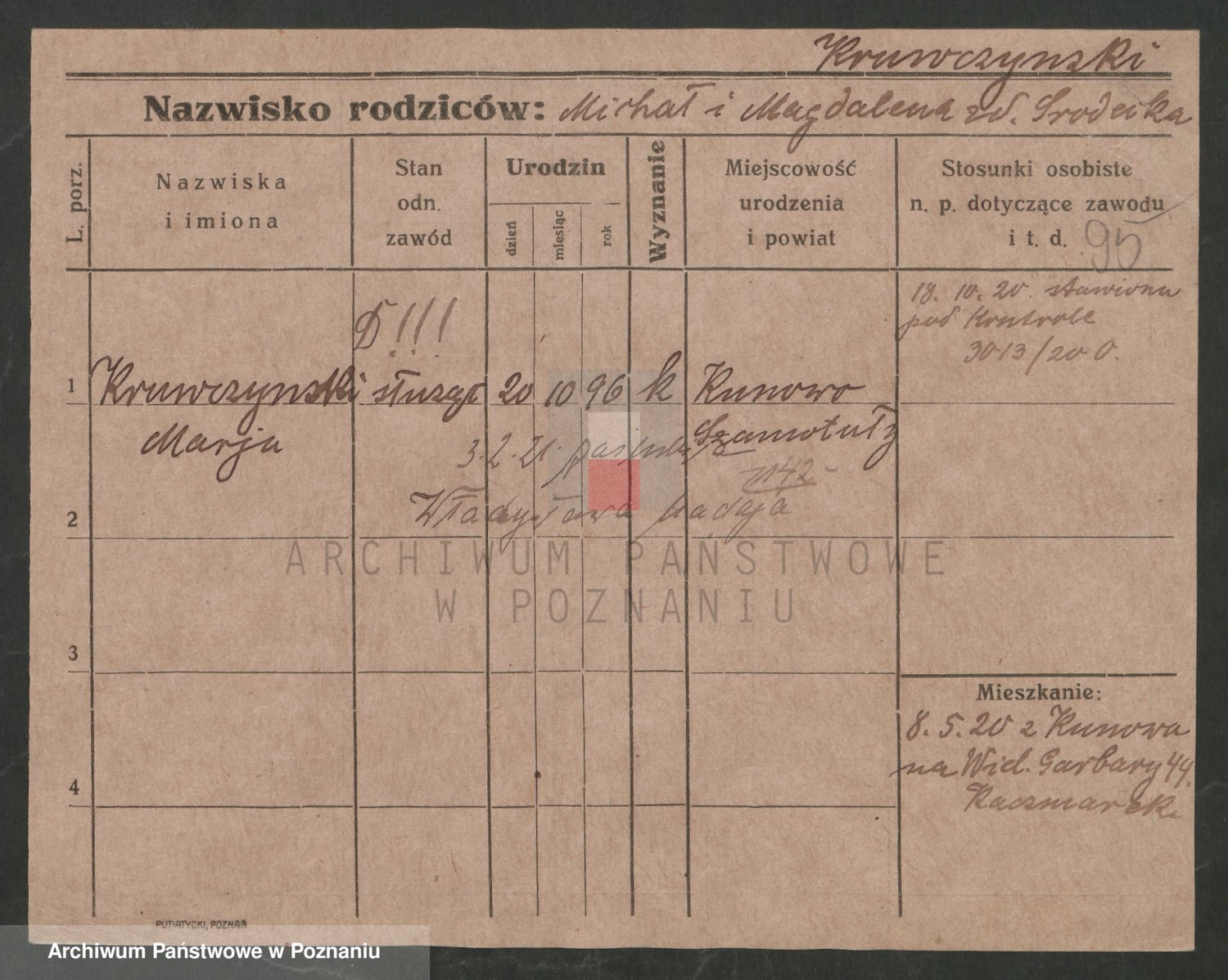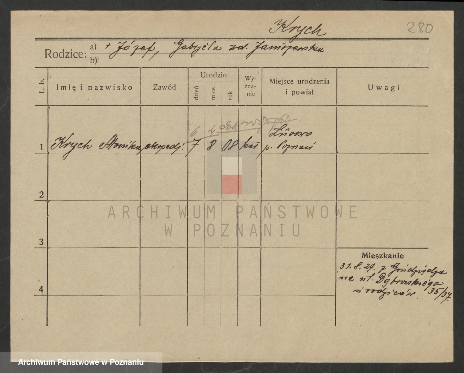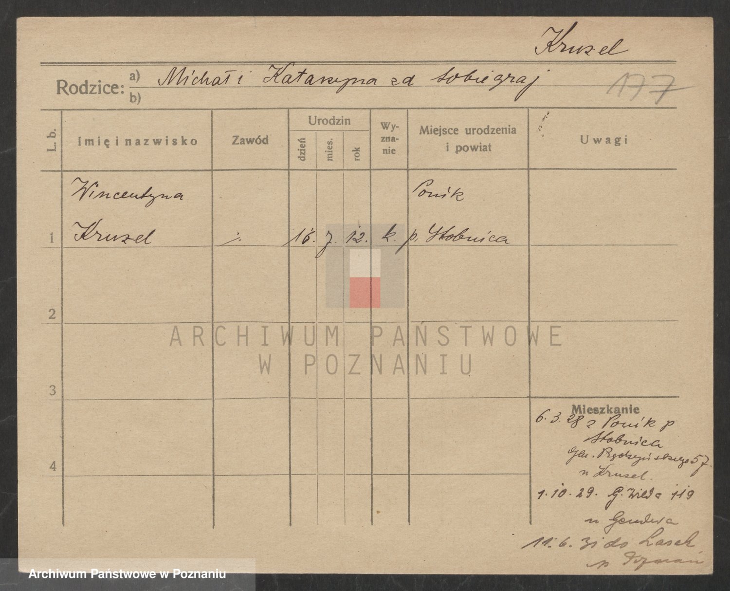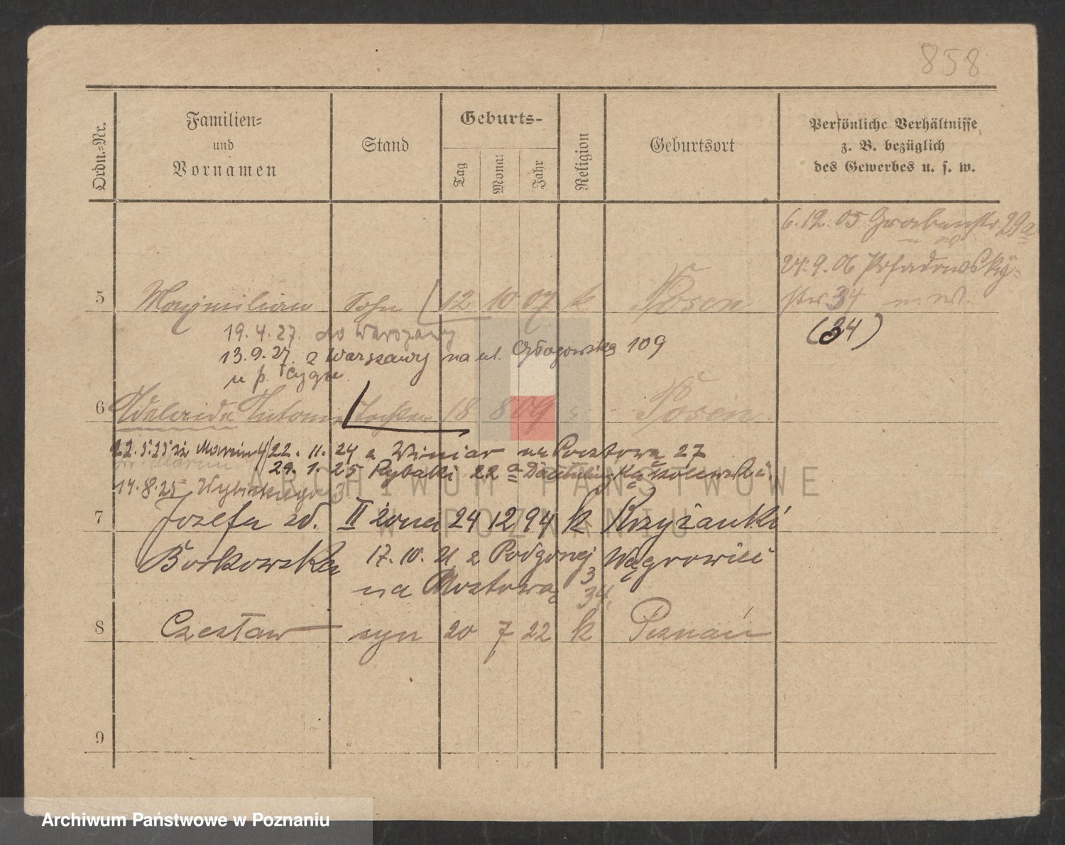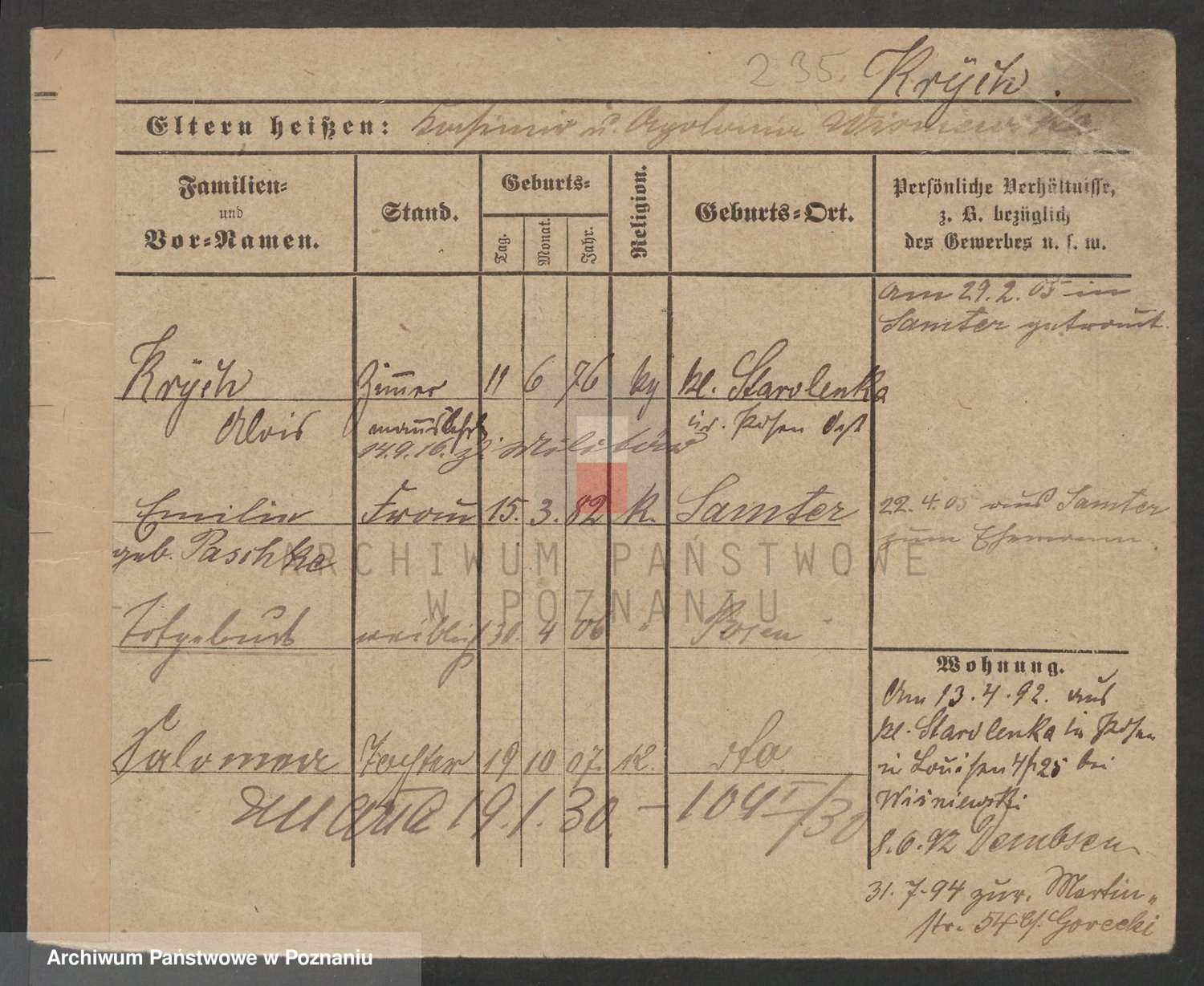 Podgląd karty osobowej dostępny jest po kliknięciu na nazwisko lub ikonkę karty. Można dokonywać powiększenia (ikony na górze) lub przechodzić między kolejnymi skanami (strzałki po bokach).