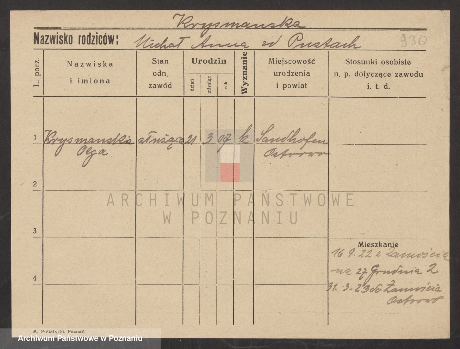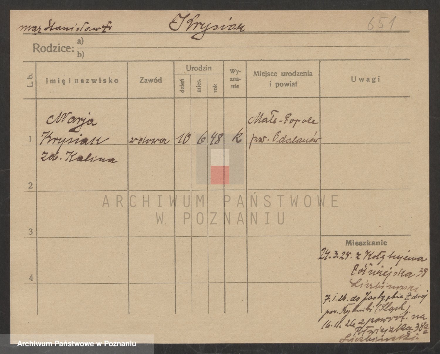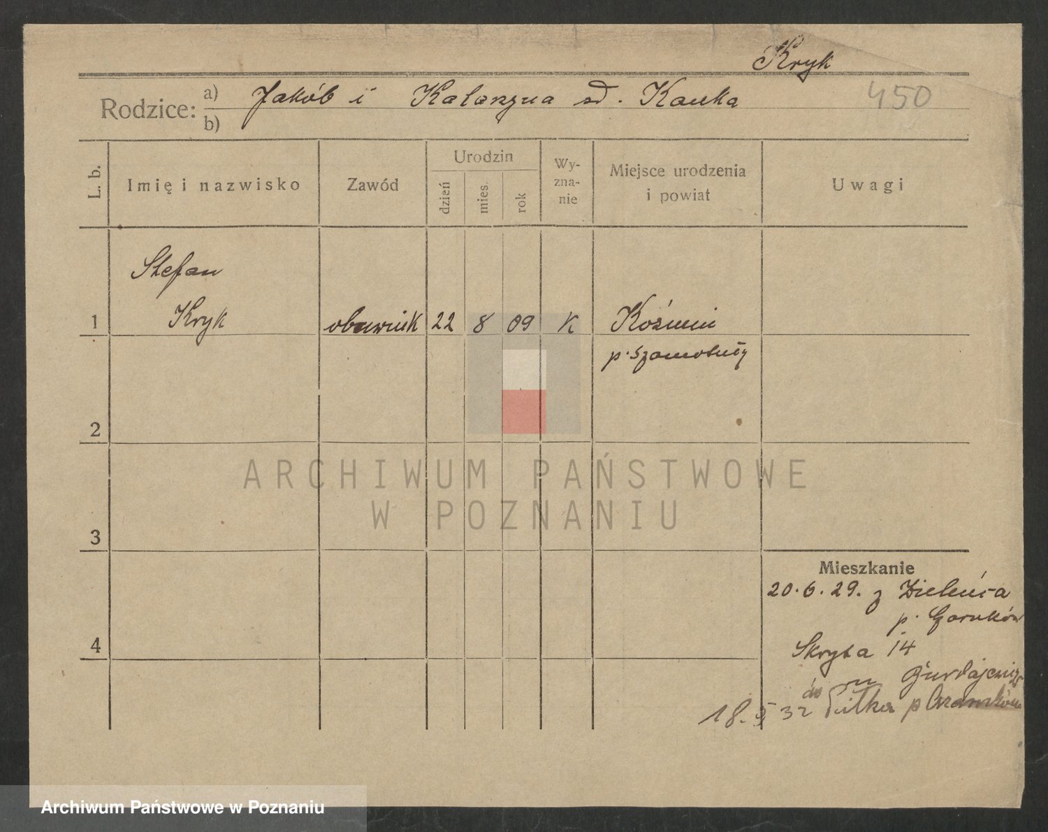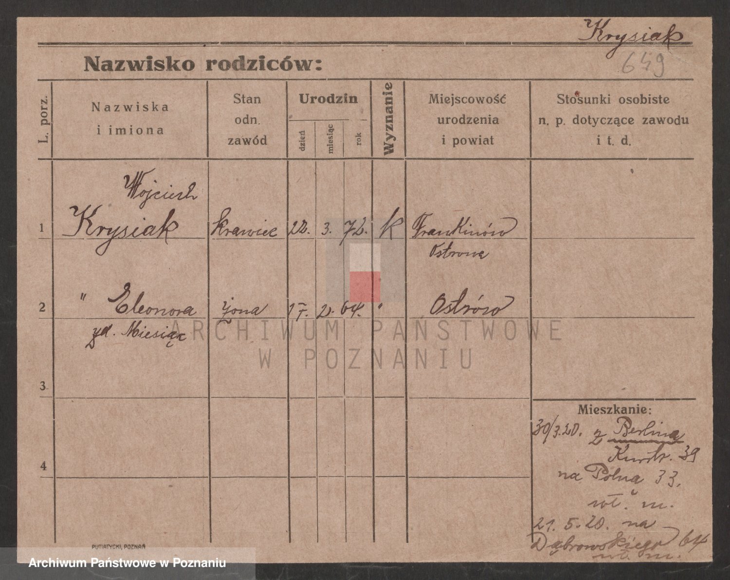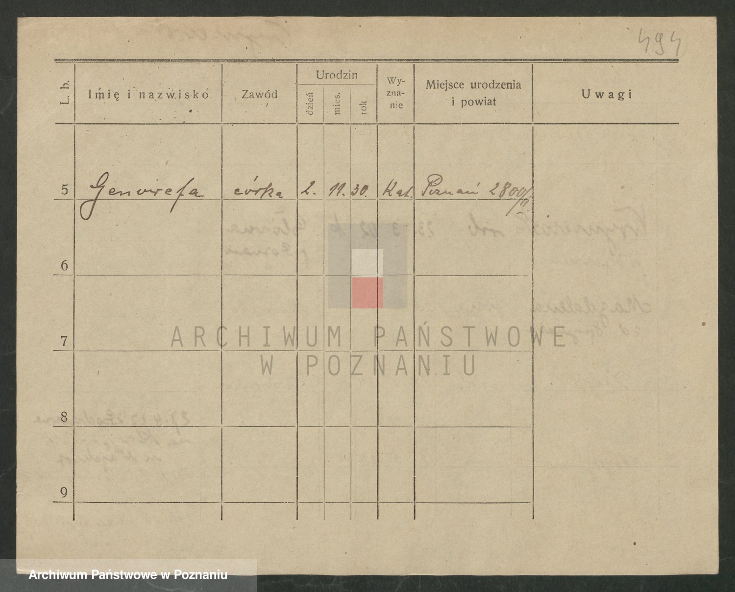 Podgląd karty osobowej dostępny jest po kliknięciu na nazwisko lub ikonkę karty. Można dokonywać powiększenia (ikony na górze) lub przechodzić między kolejnymi skanami (strzałki po bokach).