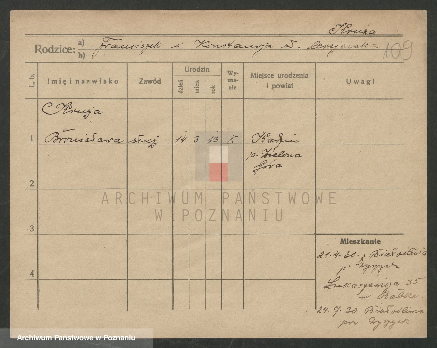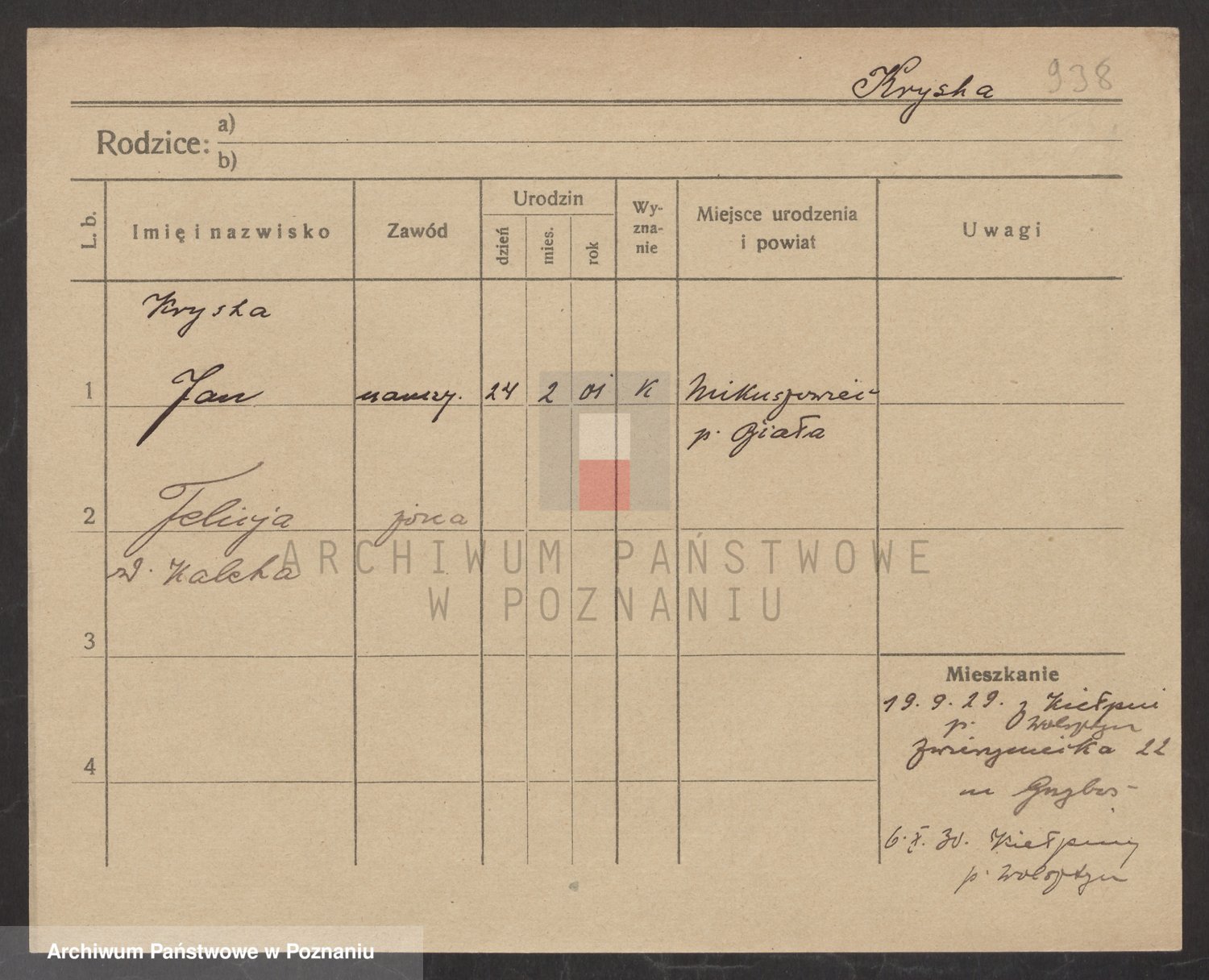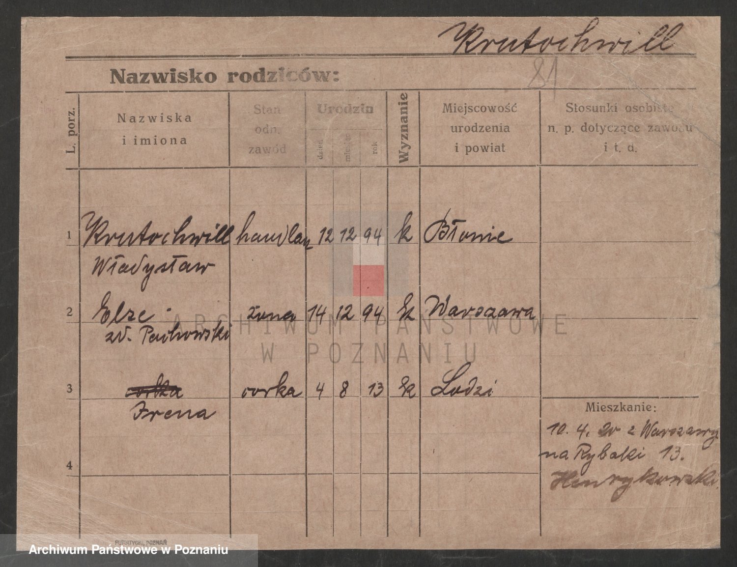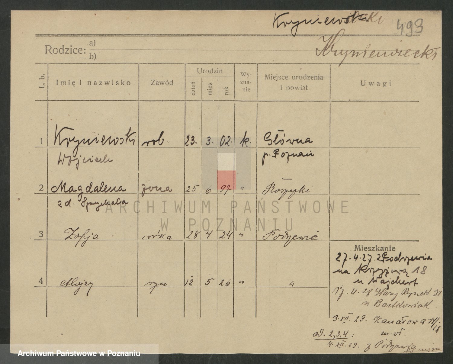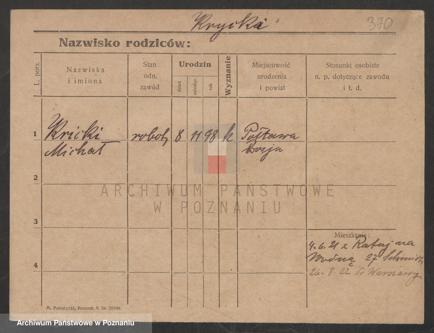Podgląd karty osobowej dostępny jest po kliknięciu na nazwisko lub ikonkę karty. Można dokonywać powiększenia (ikony na górze) lub przechodzić między kolejnymi skanami (strzałki po bokach).
