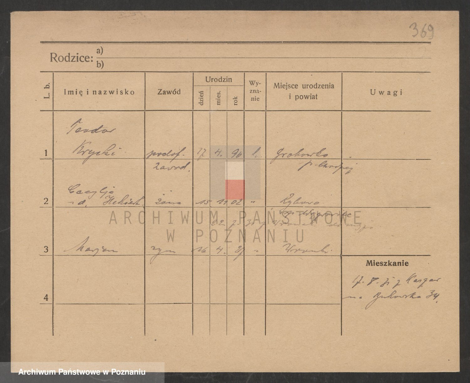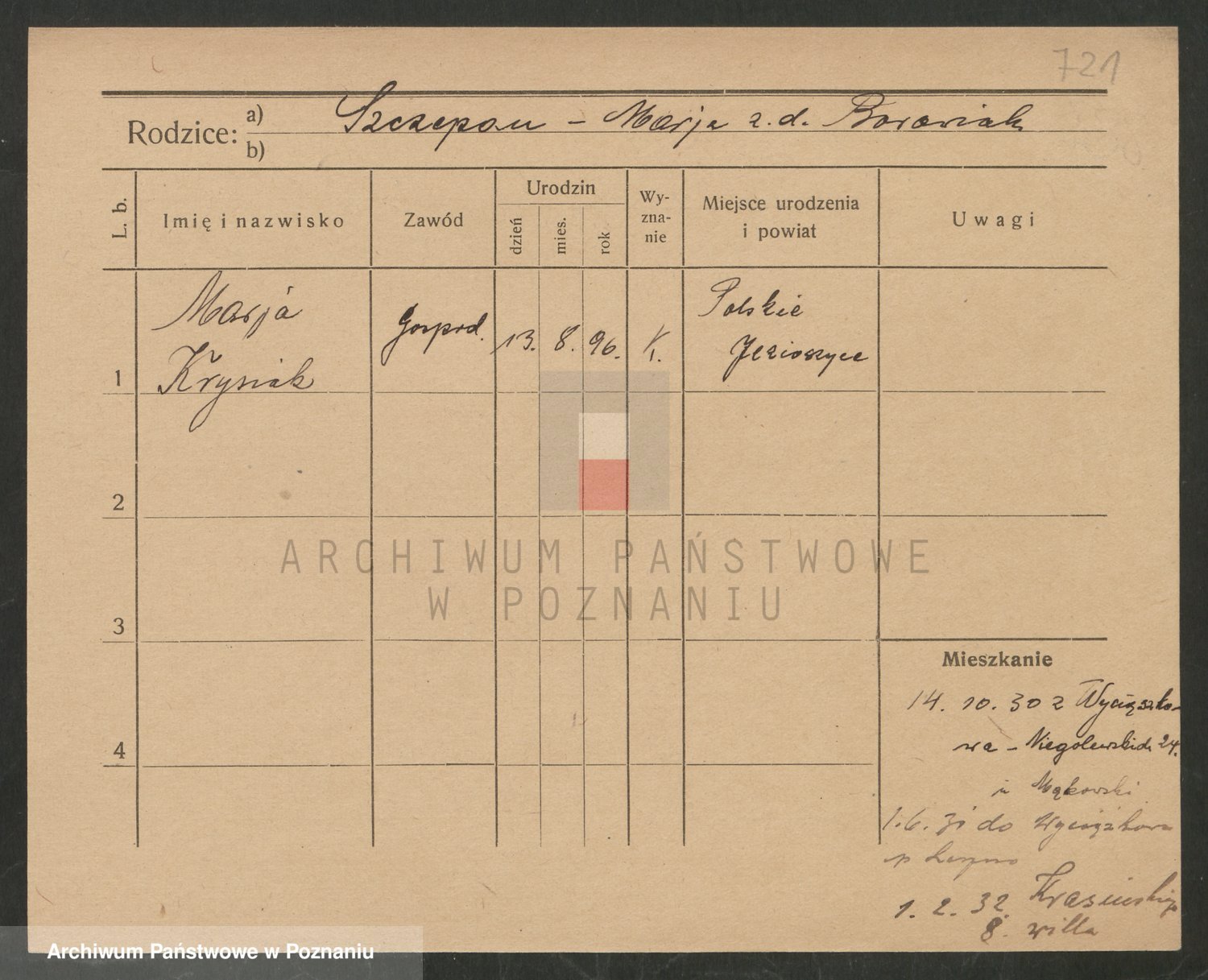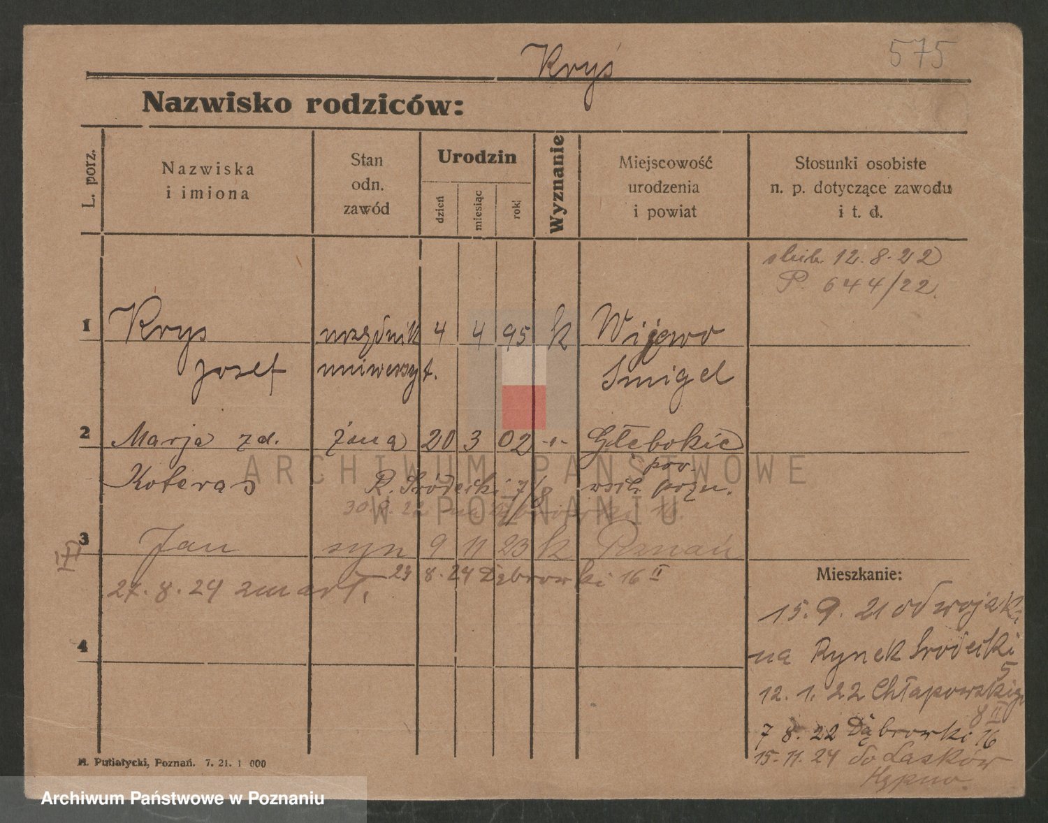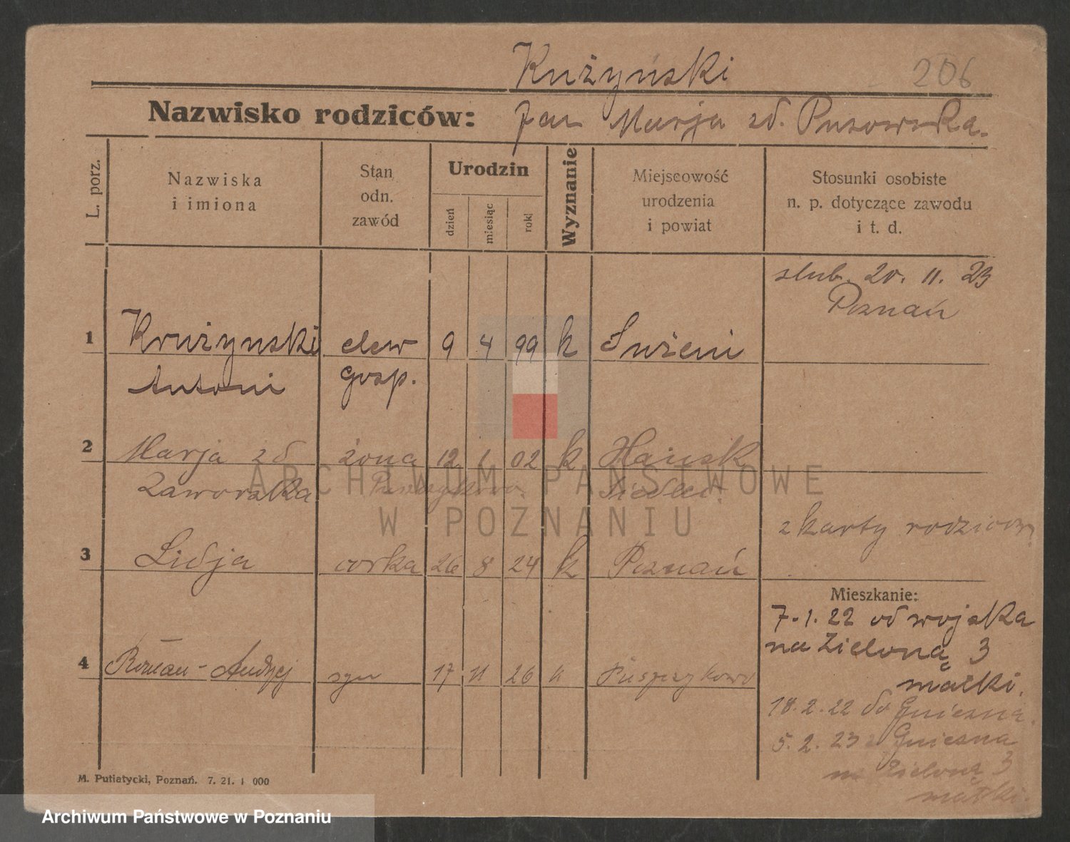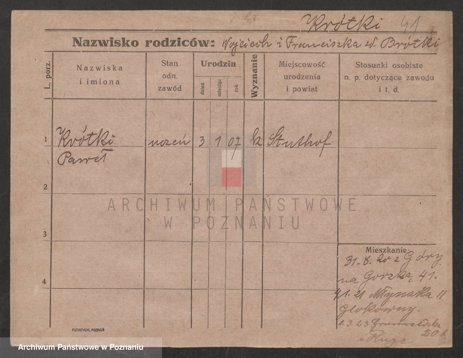 Podgląd karty osobowej dostępny jest po kliknięciu na nazwisko lub ikonkę karty. Można dokonywać powiększenia (ikony na górze) lub przechodzić między kolejnymi skanami (strzałki po bokach).