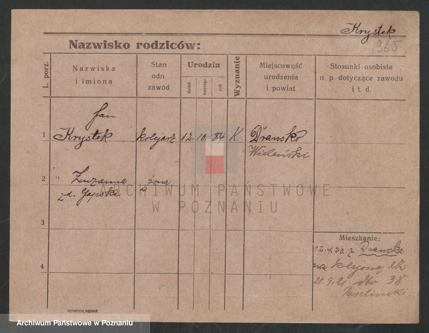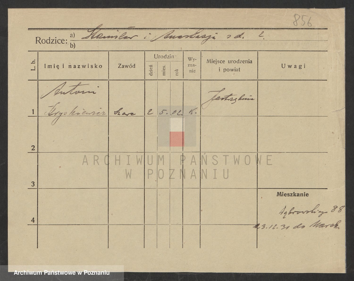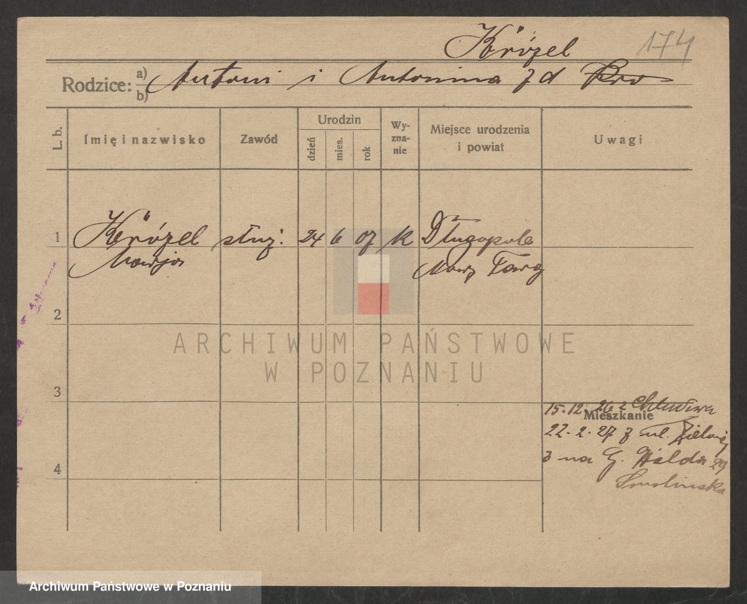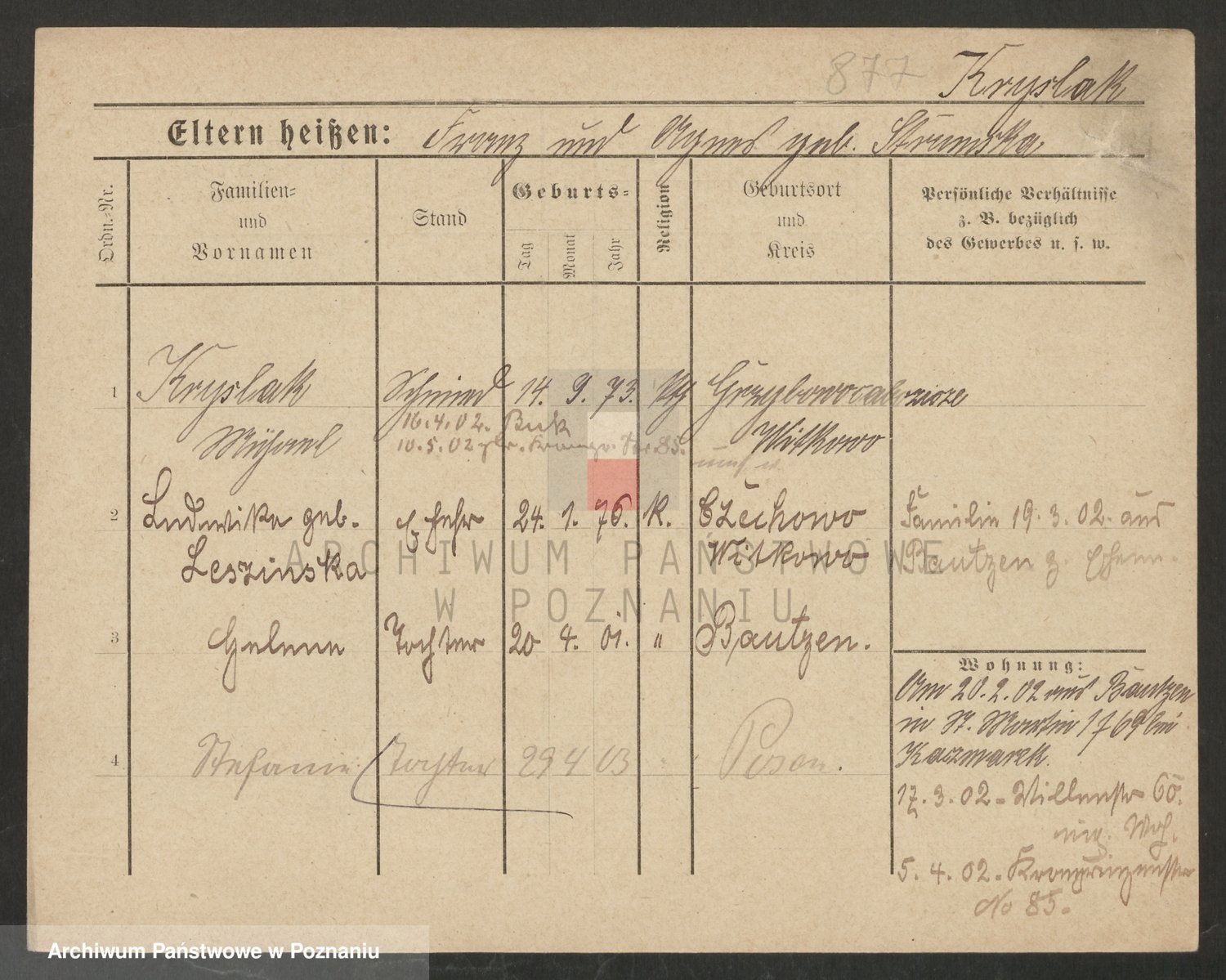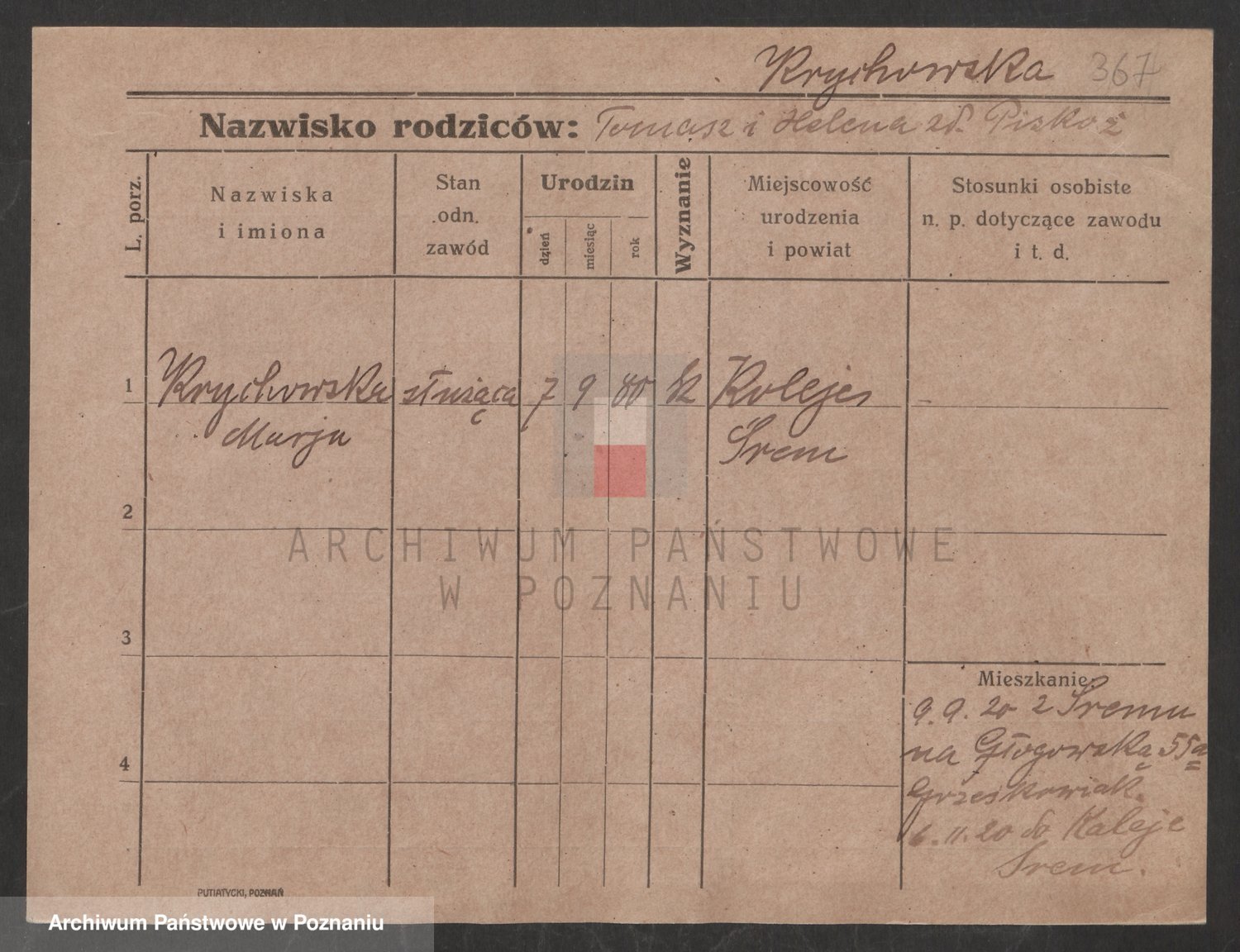 Podgląd karty osobowej dostępny jest po kliknięciu na nazwisko lub ikonkę karty. Można dokonywać powiększenia (ikony na górze) lub przechodzić między kolejnymi skanami (strzałki po bokach).