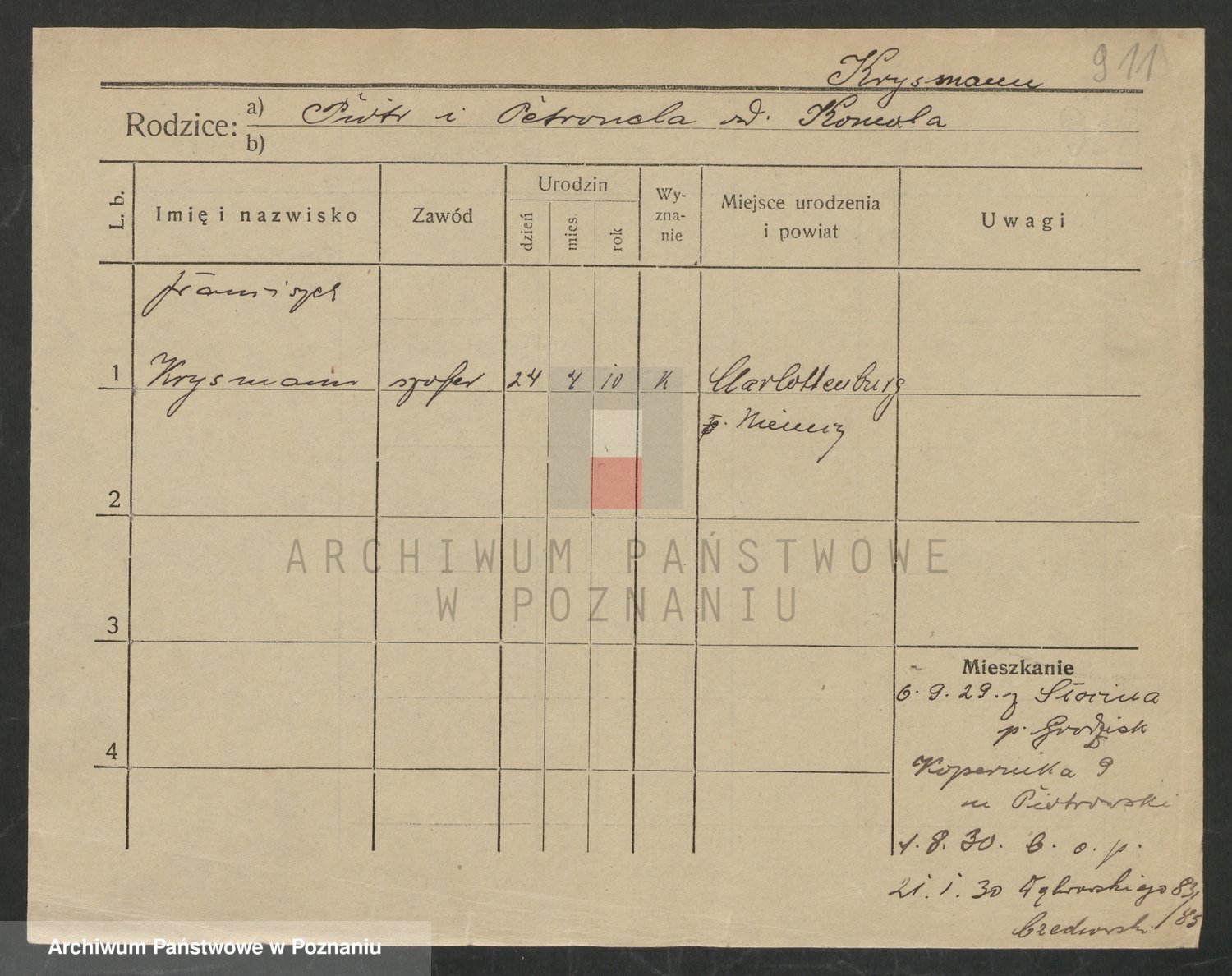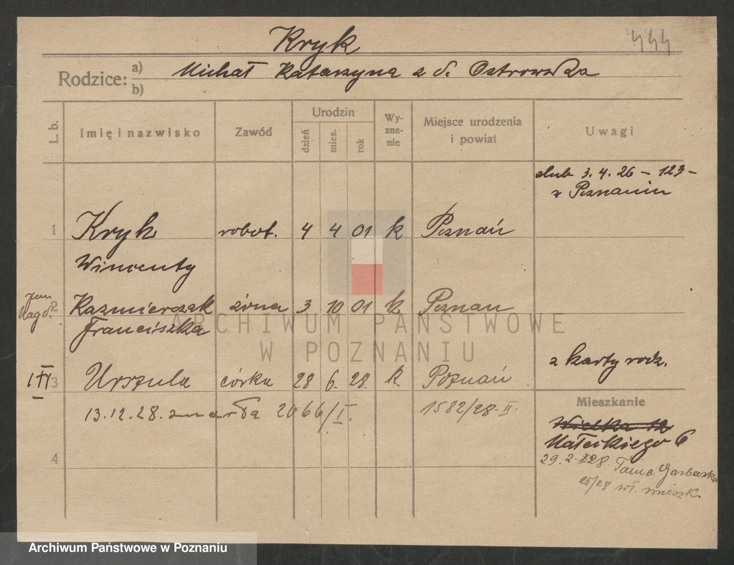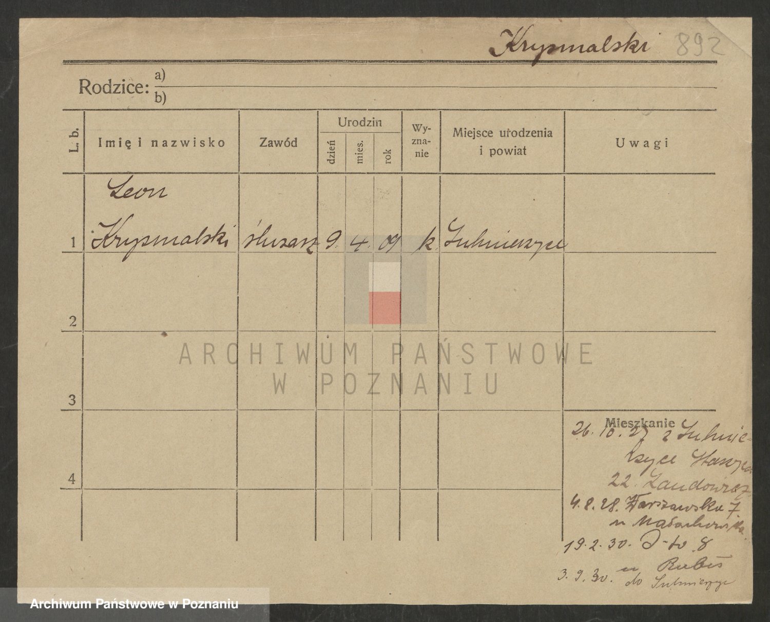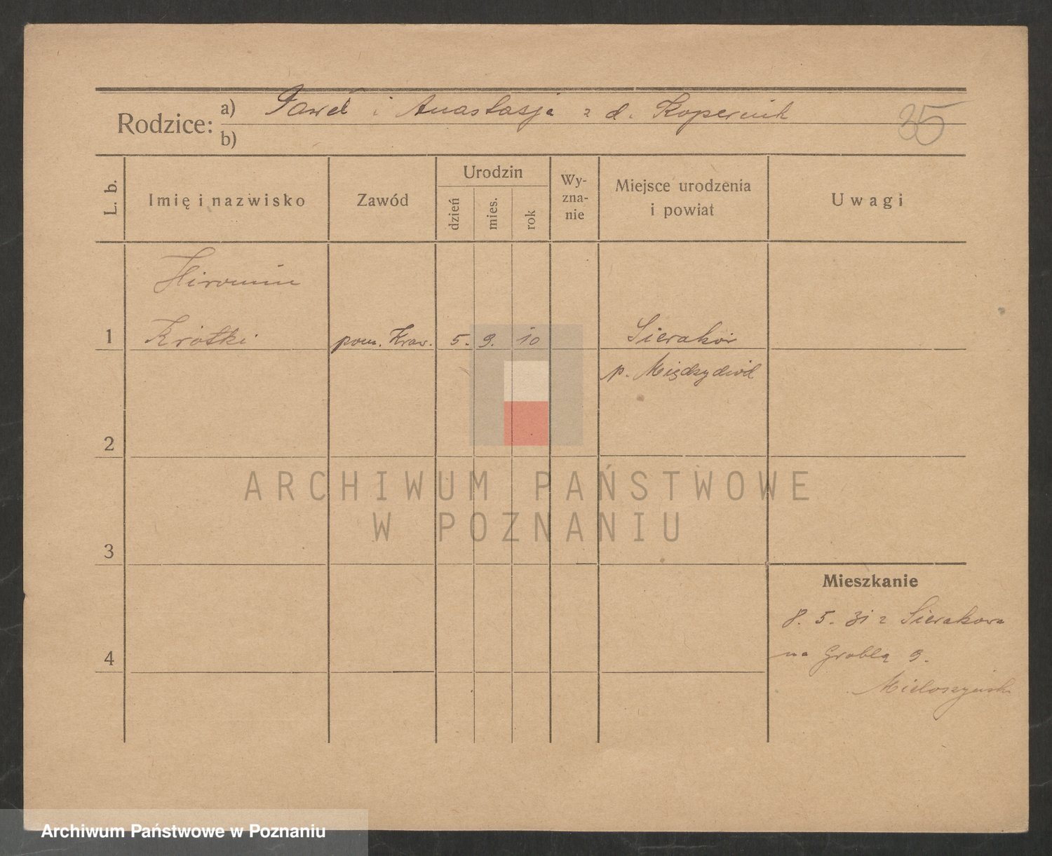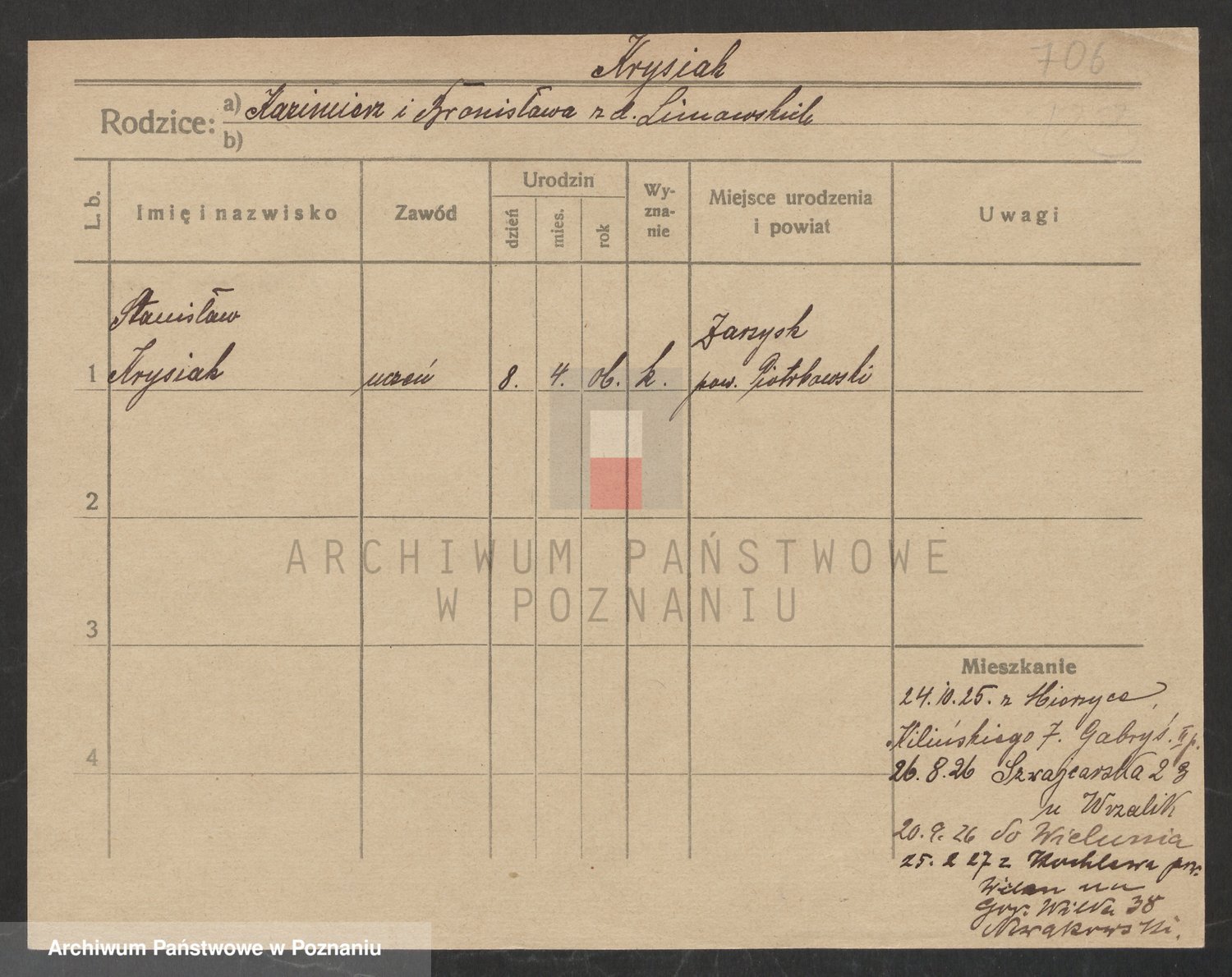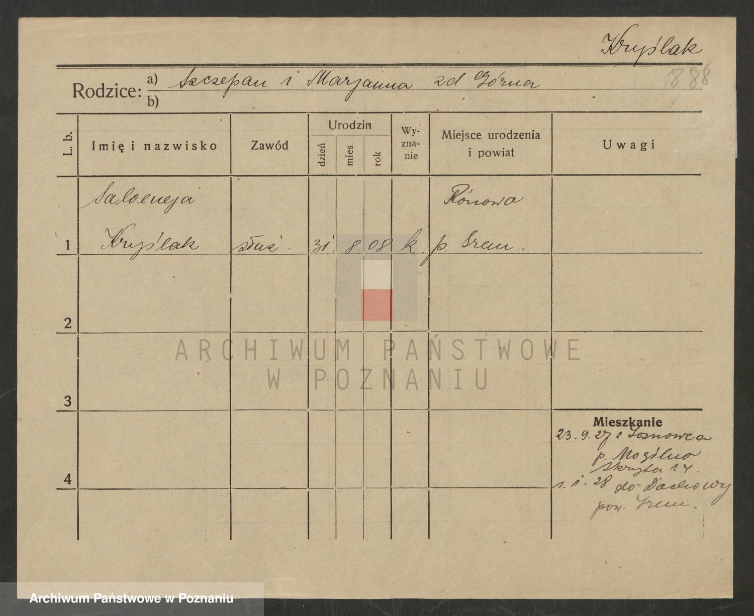 Podgląd karty osobowej dostępny jest po kliknięciu na nazwisko lub ikonkę karty. Można dokonywać powiększenia (ikony na górze) lub przechodzić między kolejnymi skanami (strzałki po bokach).
