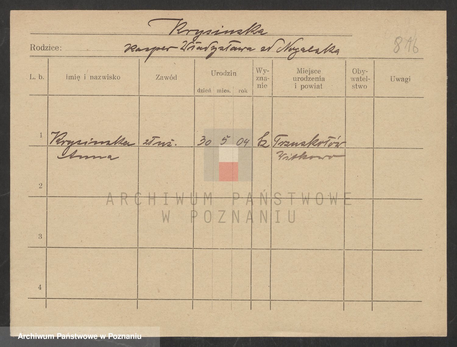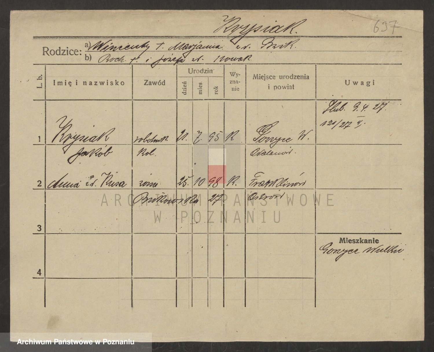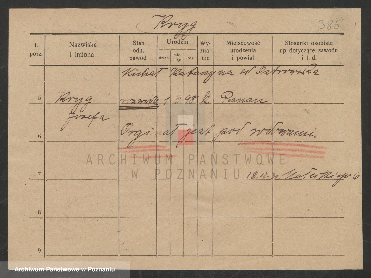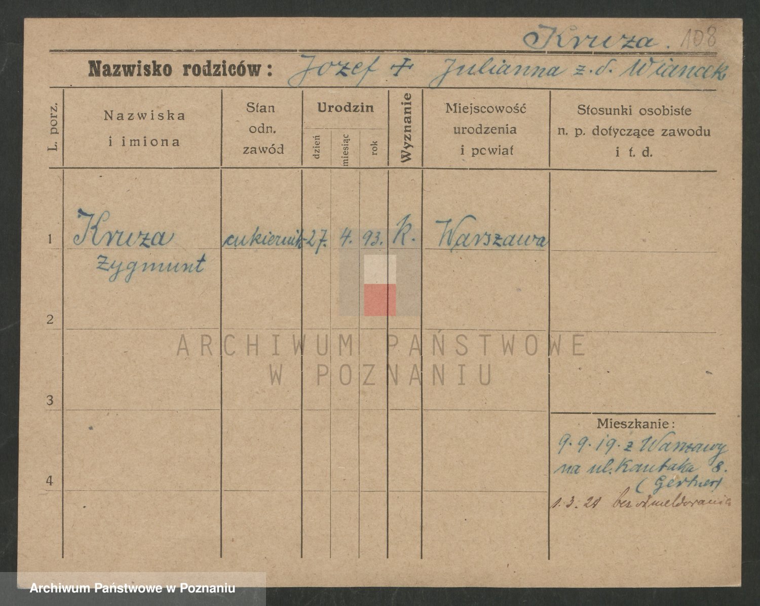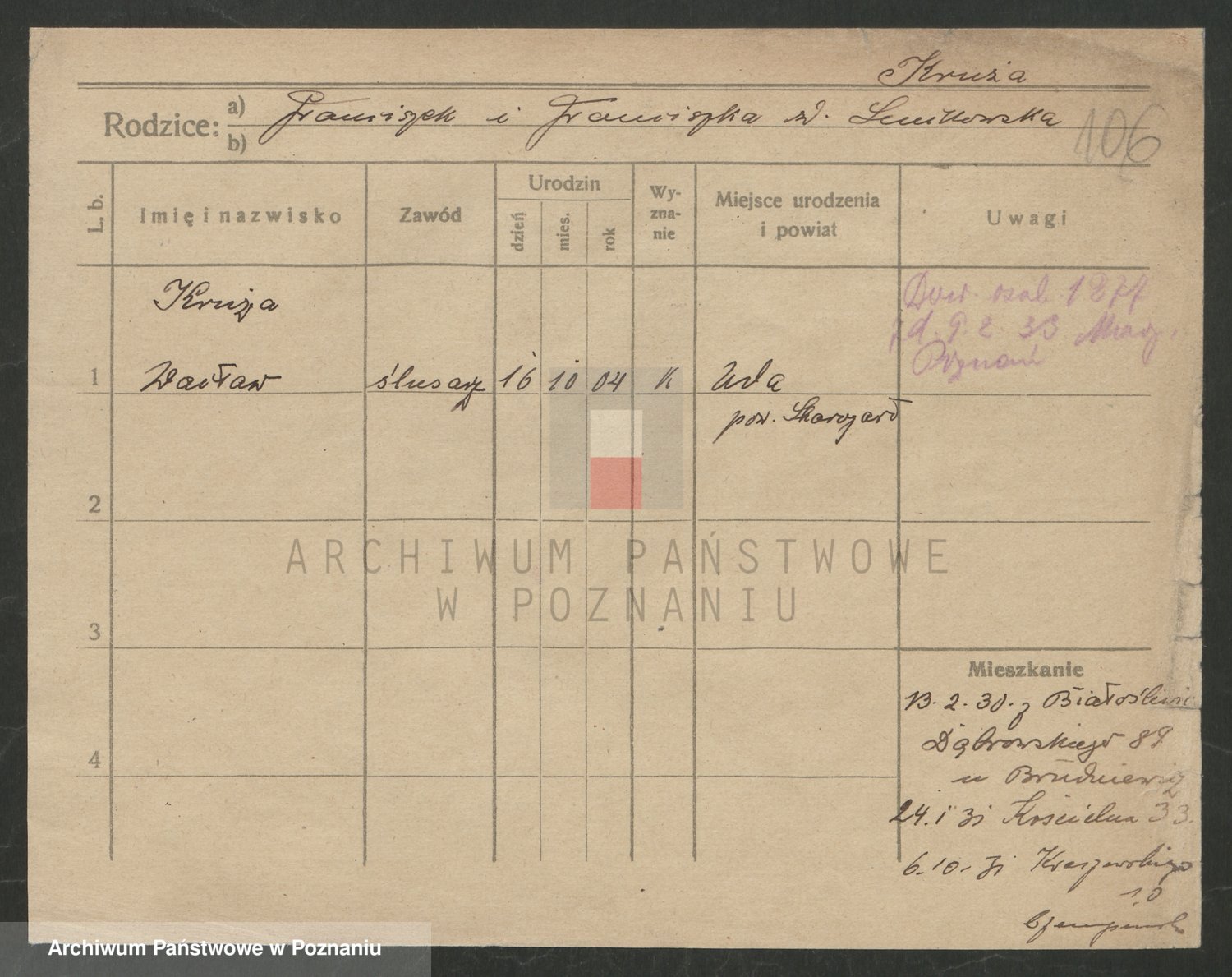 Podgląd karty osobowej dostępny jest po kliknięciu na nazwisko lub ikonkę karty. Można dokonywać powiększenia (ikony na górze) lub przechodzić między kolejnymi skanami (strzałki po bokach).